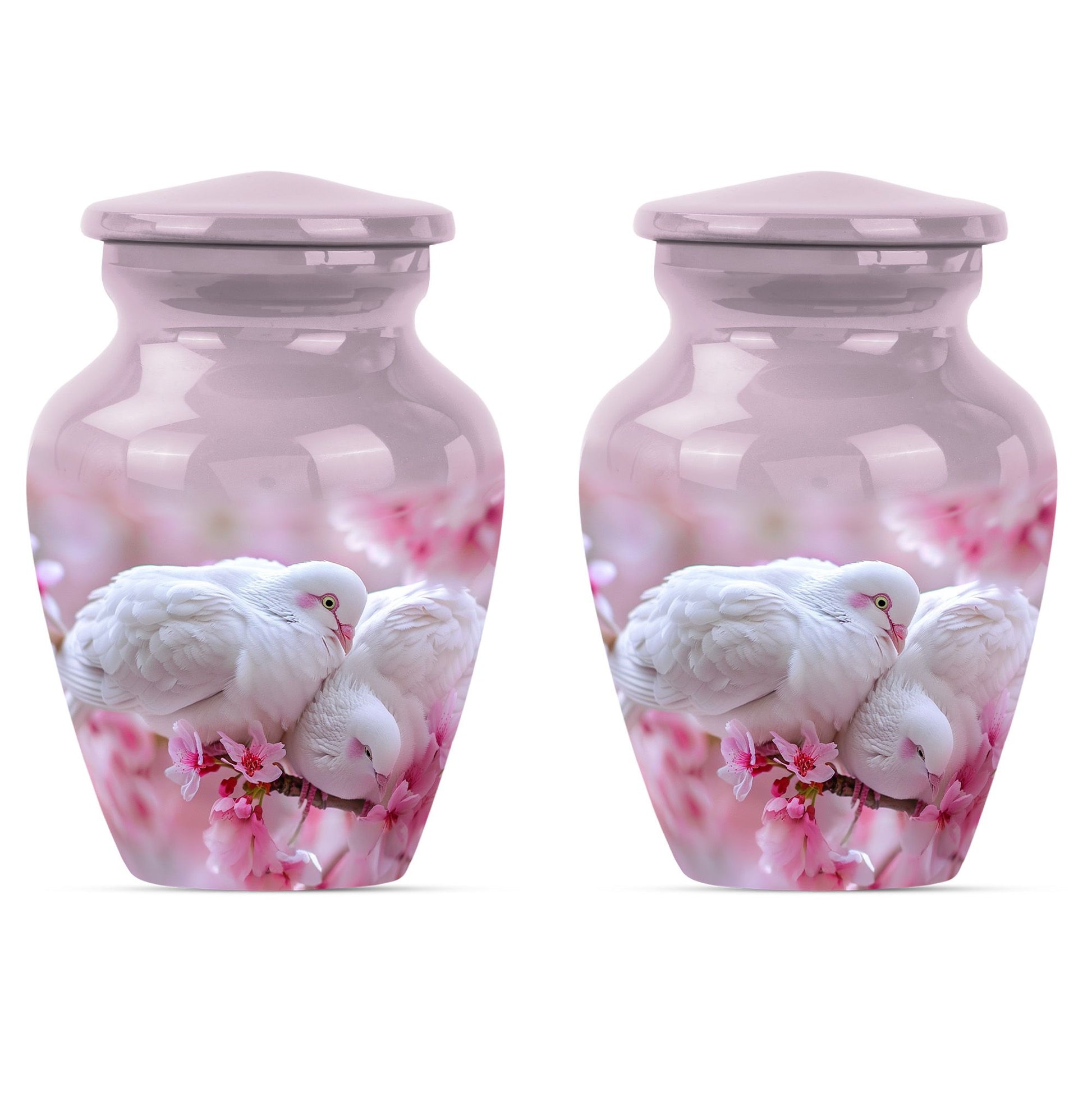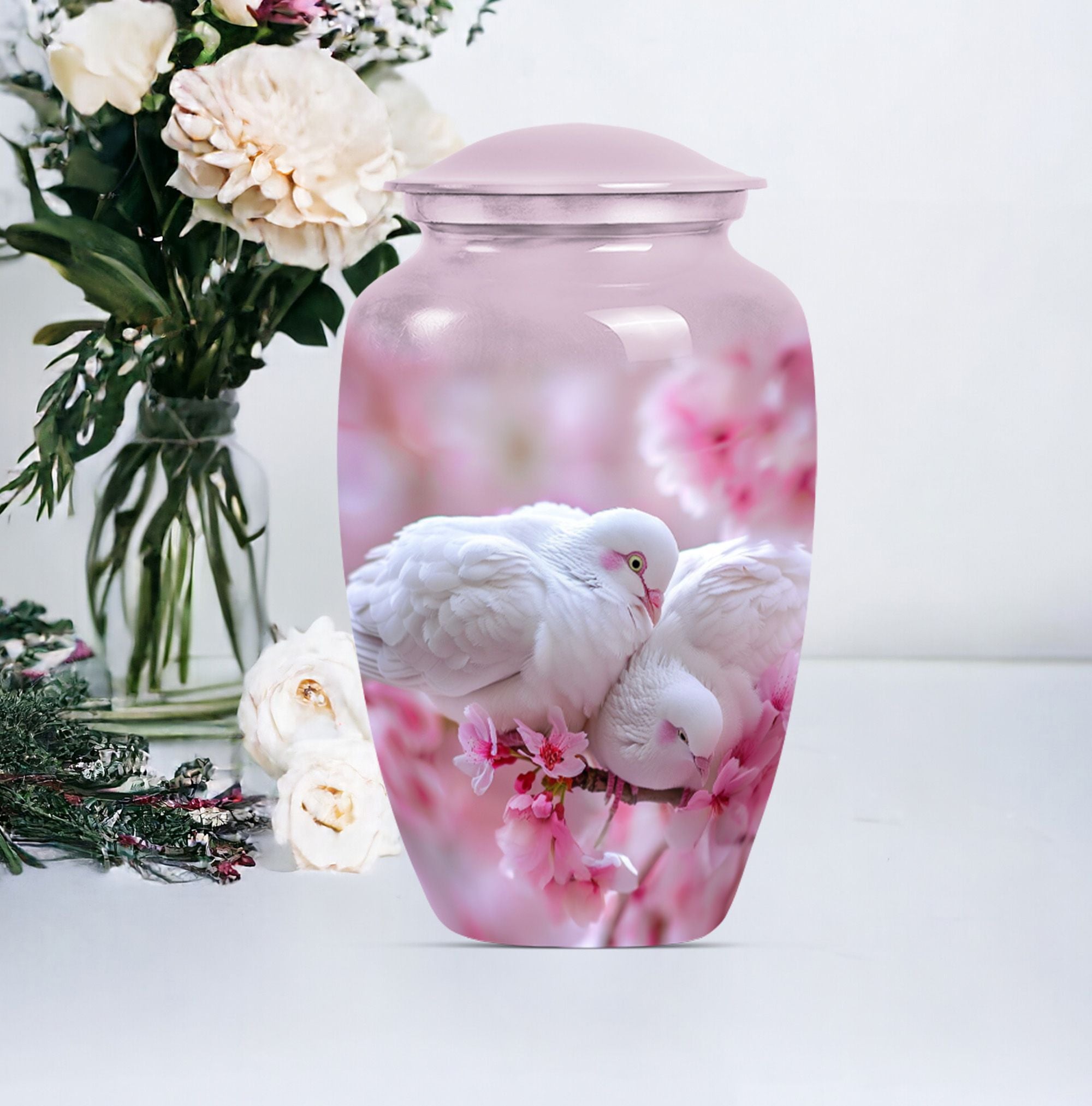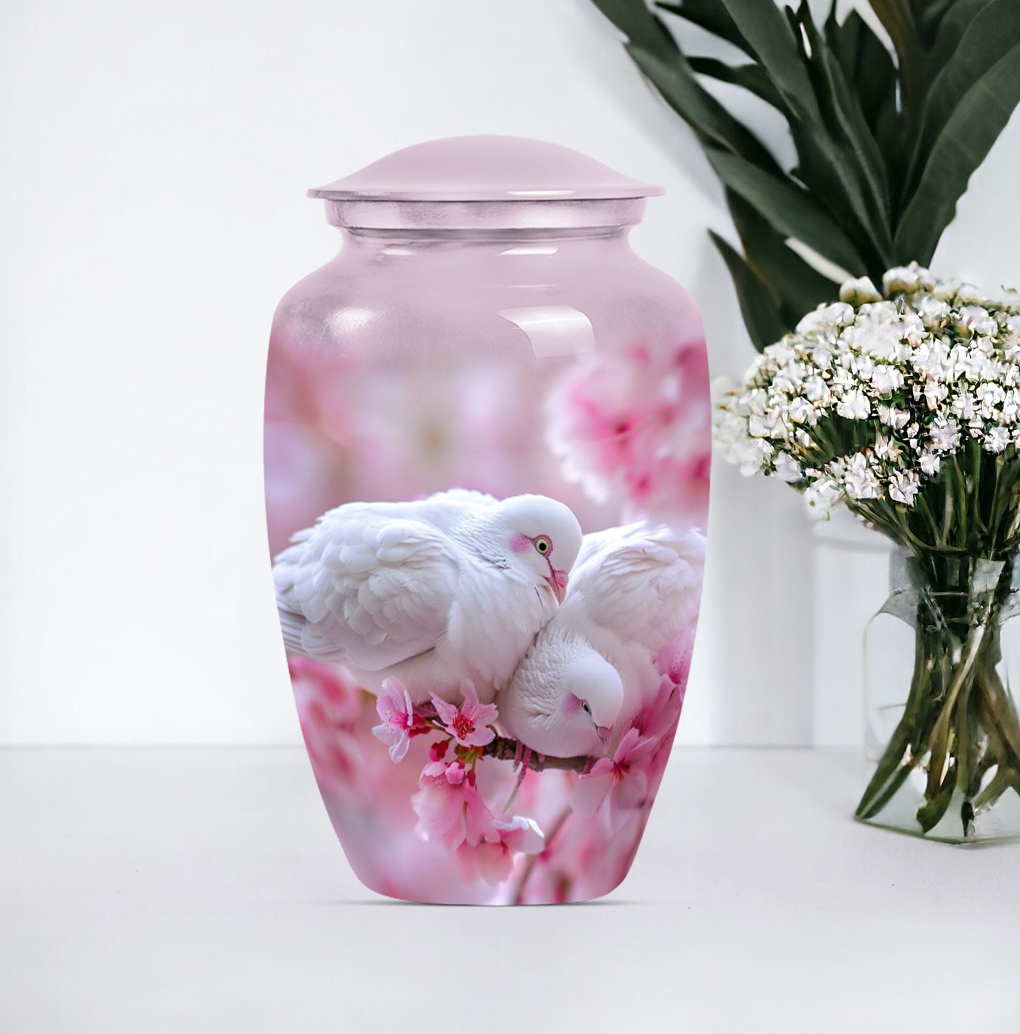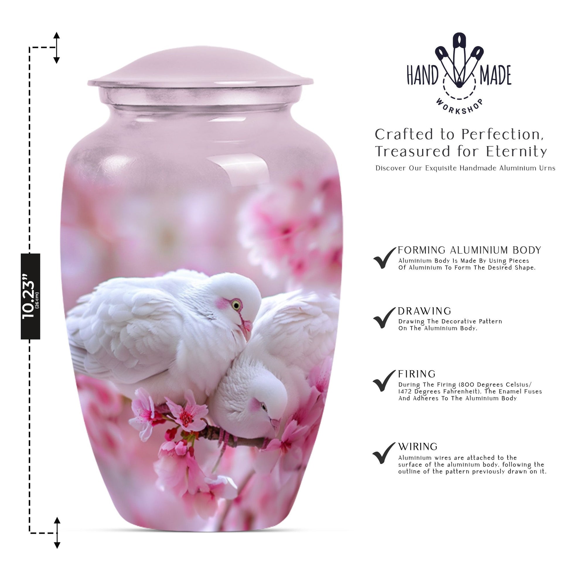 Dignified and touching, this meticulously crafted 10-inch 'Purple Meadow' Dove Urn serves as a graceful tribute for a departed loved one. Designed intentionally for adults, it's spacious with a capacity of 200 cubic inches and accommodating up to 3.3 pounds of ashes comfortably. Each Dove Urn, constructed from resilient aluminium, is a delectably sturdy and heartfelt reminder of those we hold cherished. The package includes a plush velvet pouch for safe containment of ashes. The large urn allows for personalization; add engraved names to intuitively make it your own. Moreover, the Dove Urn's exceptional 'Purple Meadow' theme caters to both men and women, making it an appealing choice among memorial urns, funeral urns, or burial urns. Stay away from overused phrases and let this product description provide comfort in those moments of remembrance.