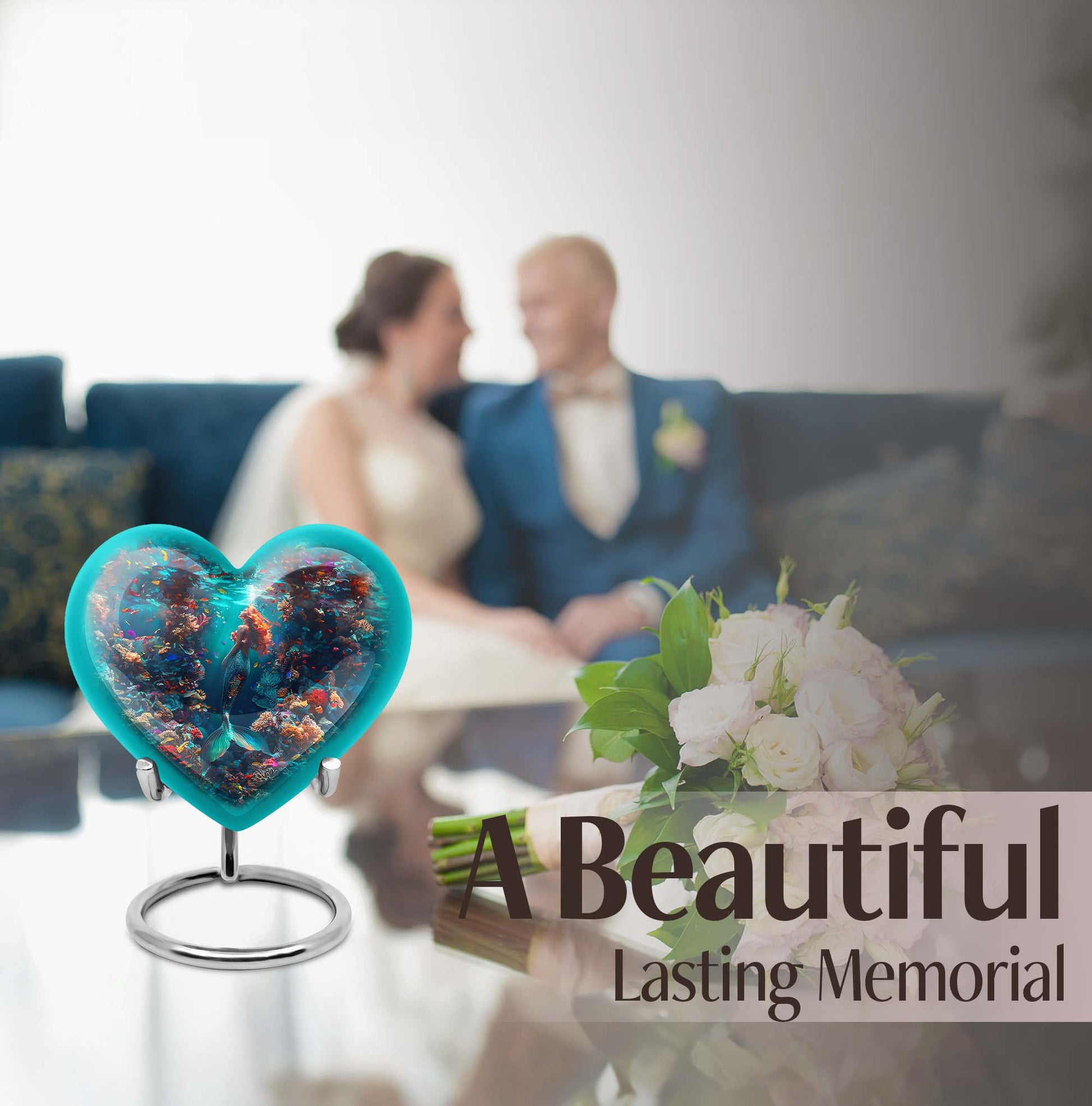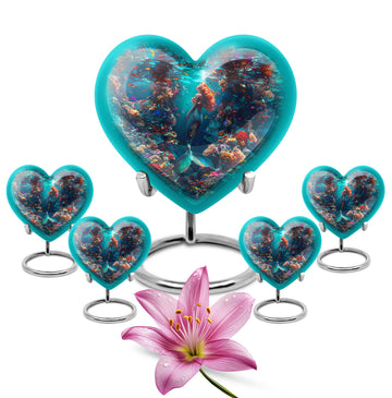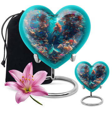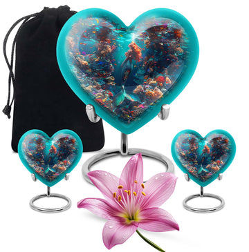 Introducing our heart-shaped Aluminium Mermaid Urn, a cherished piece designed to honor and pay tribute to your departed loved ones. It's an elegant piece from our collection of Cremation Large Urns, which stands 10 inches tall and has a hidden secure compartment with a generous capacity of 200 cubic inches for respectfully preserving ashes. The urn is meticulously crafted, robust at 3.3 pounds, and exudes a dignified aura. Reflecting its thoughtful craftsmanship is the Ocean theme, tenderly inspiring memories of ethereal beauty and transformation. The addition of personalized engravings brings a unique touch, allowing you to inscribe cherished names. Each purchase includes a velvet pouch to carefully envelop the urn, exuding both care and honor on this ordained memorial journey. Search keywords include 'cremation urn', 'human ash urn', 'funeral gifts', and 'metal urns for human ashes' for this respected token of remembrance.