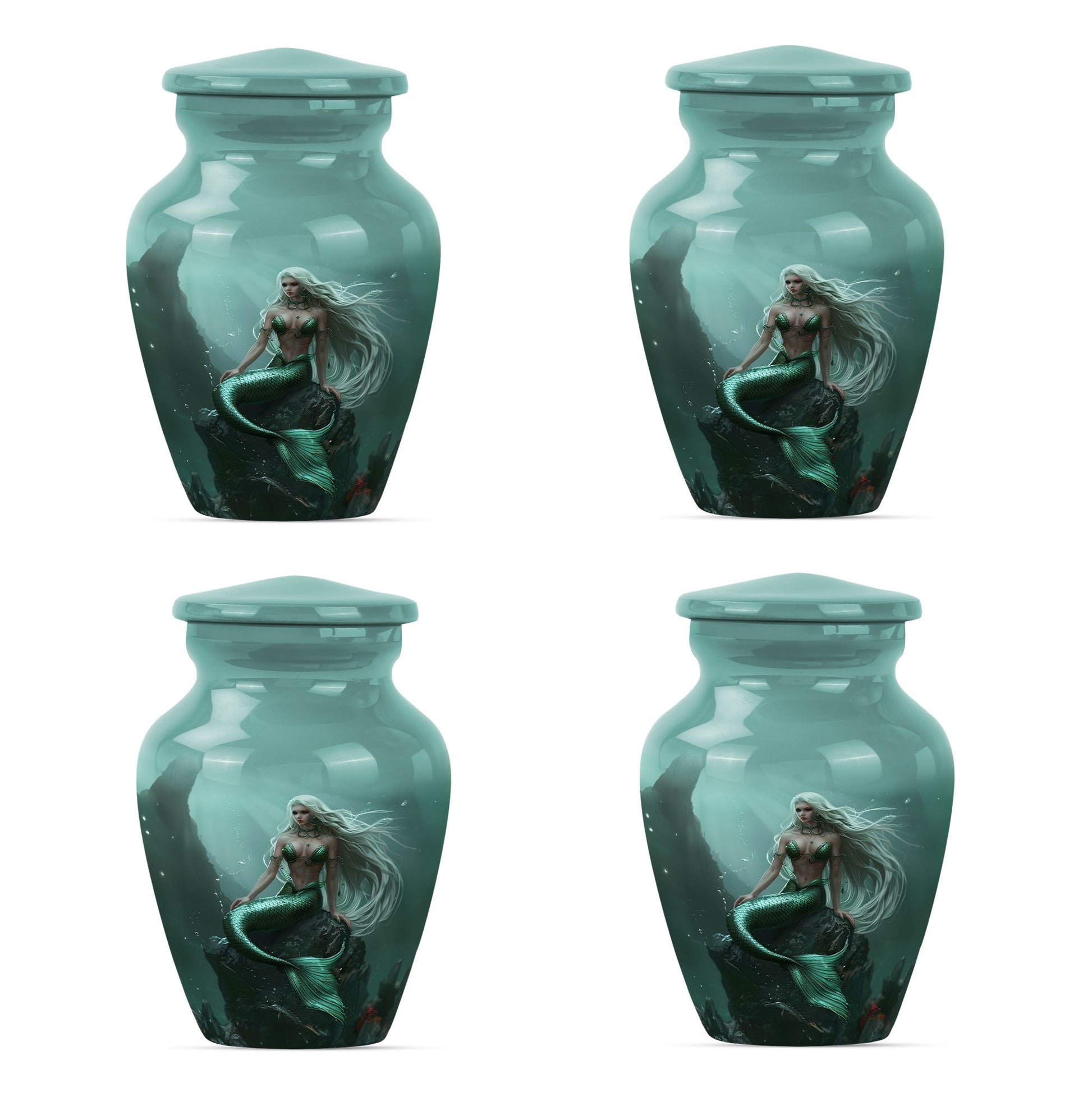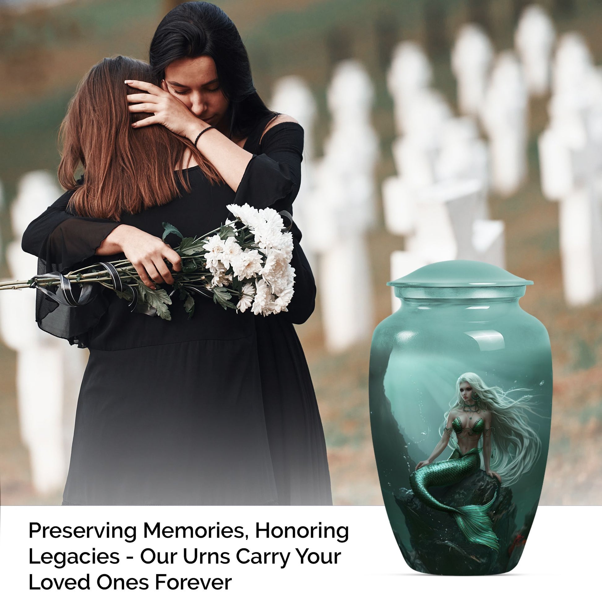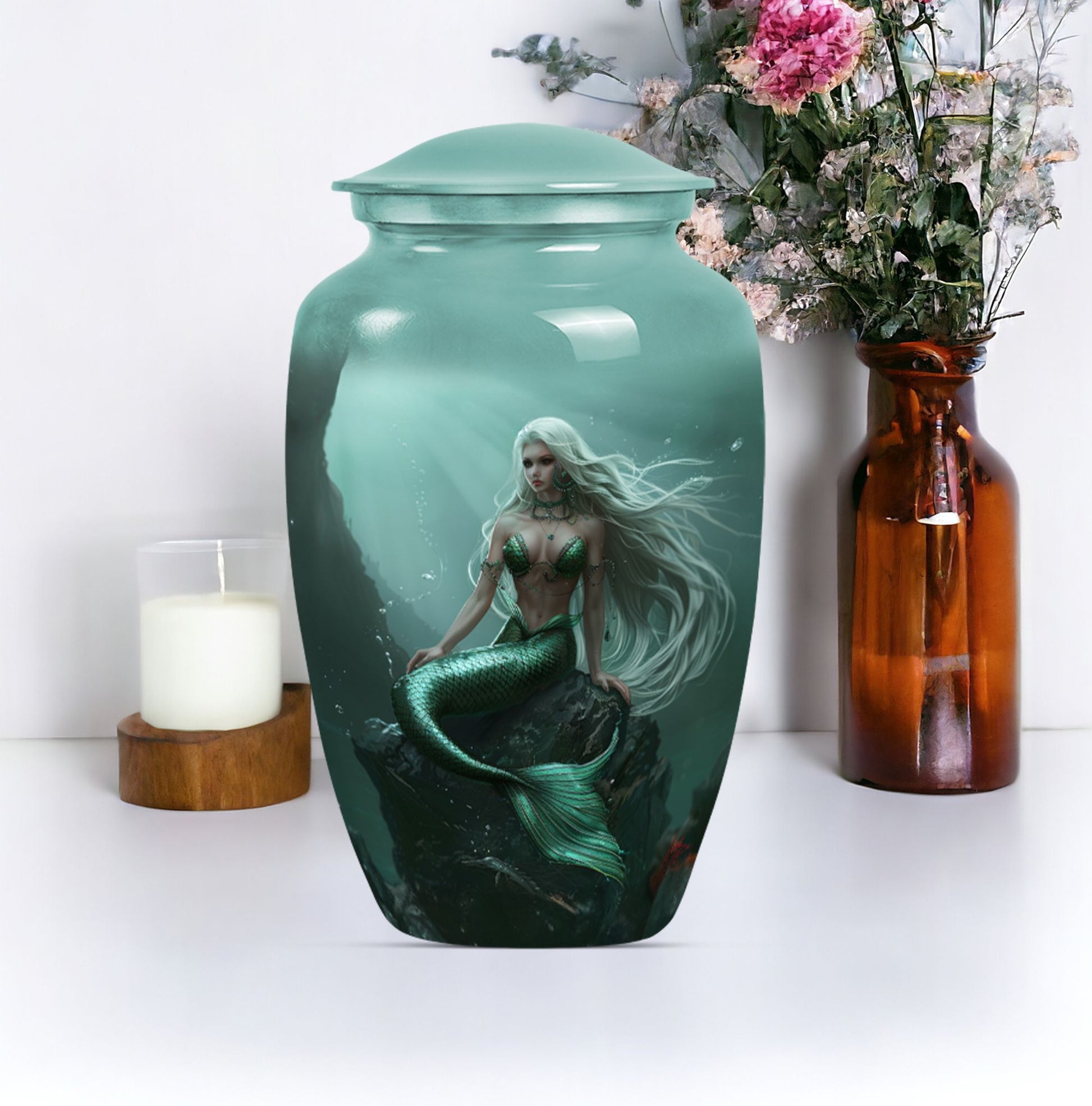 Embrace a dignified and respectful send-off for your loved ones with this exquisite 10-inch Mermaid Urn, an ideal choice among cremation urns for women, meticulously crafted from superior Aluminium. This large urn is not only a mood-enhancing centerpiece but also an expression of eternal love, weighing only 3.3 pounds. It exemplifies an unparalleled attention to detail, offering a capacity of 200 cubic inches, ensuring a secure and peaceful resting place for your beloved. The package also contains a velvet pouch for facile and safe containment of ashes. With an optional customization feature, you can personalize your urn with engraved names, making it a unique and heartfelt memory. The Butterfly theme adds a touch of serenity and hope, symbolizing the endless cycle of life. This offering caters to several search terms, such as 'burial large urn for women ashes', 'funeral urns ashes', 'unisex gifts for adults', and 'metal urns for human ashes adult female', making it a versatile funeral or memorial ceremony supply. Remember, your search for a 'cremation urn' ends here, with this elegantly designed Classic Urn.