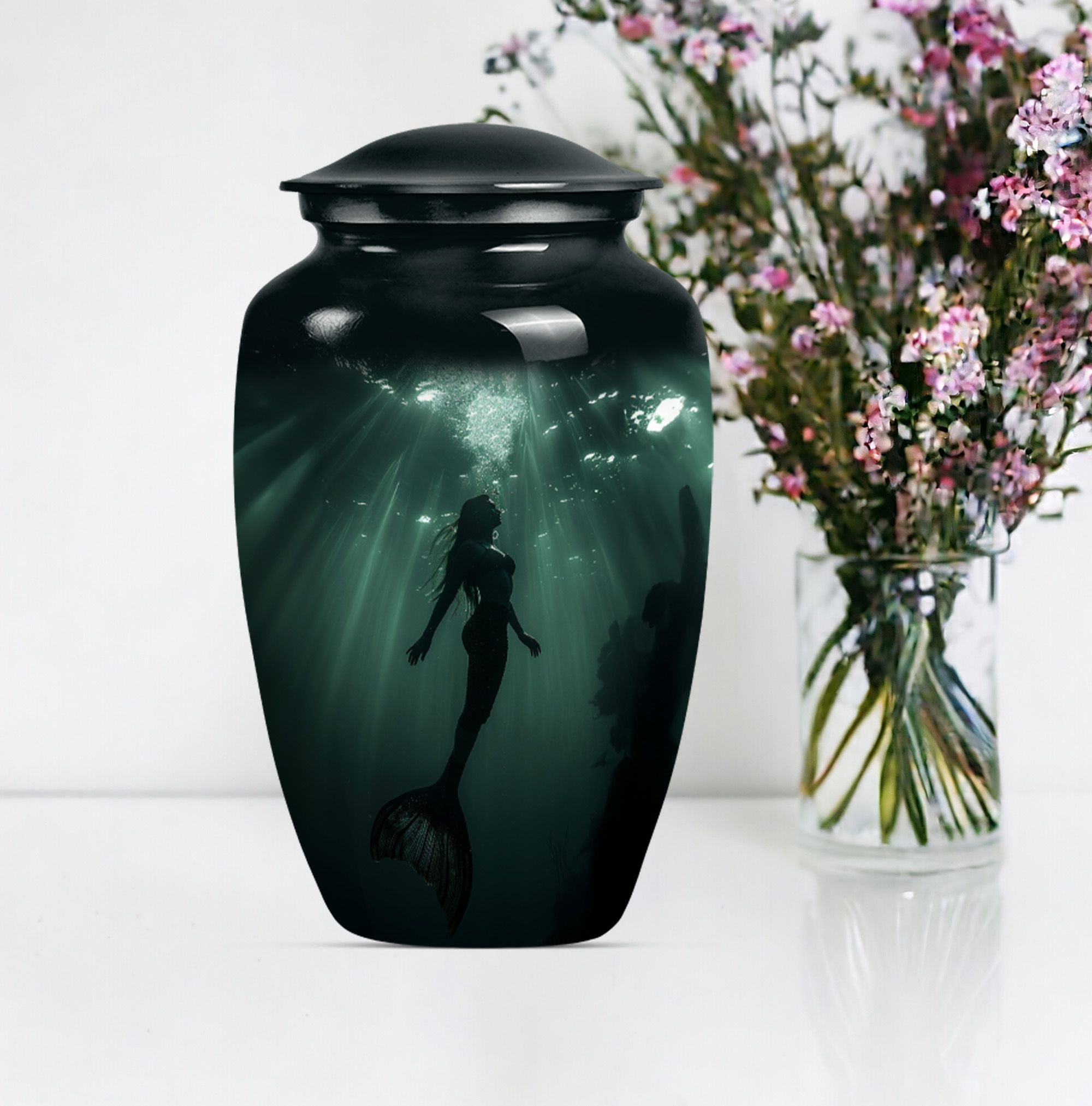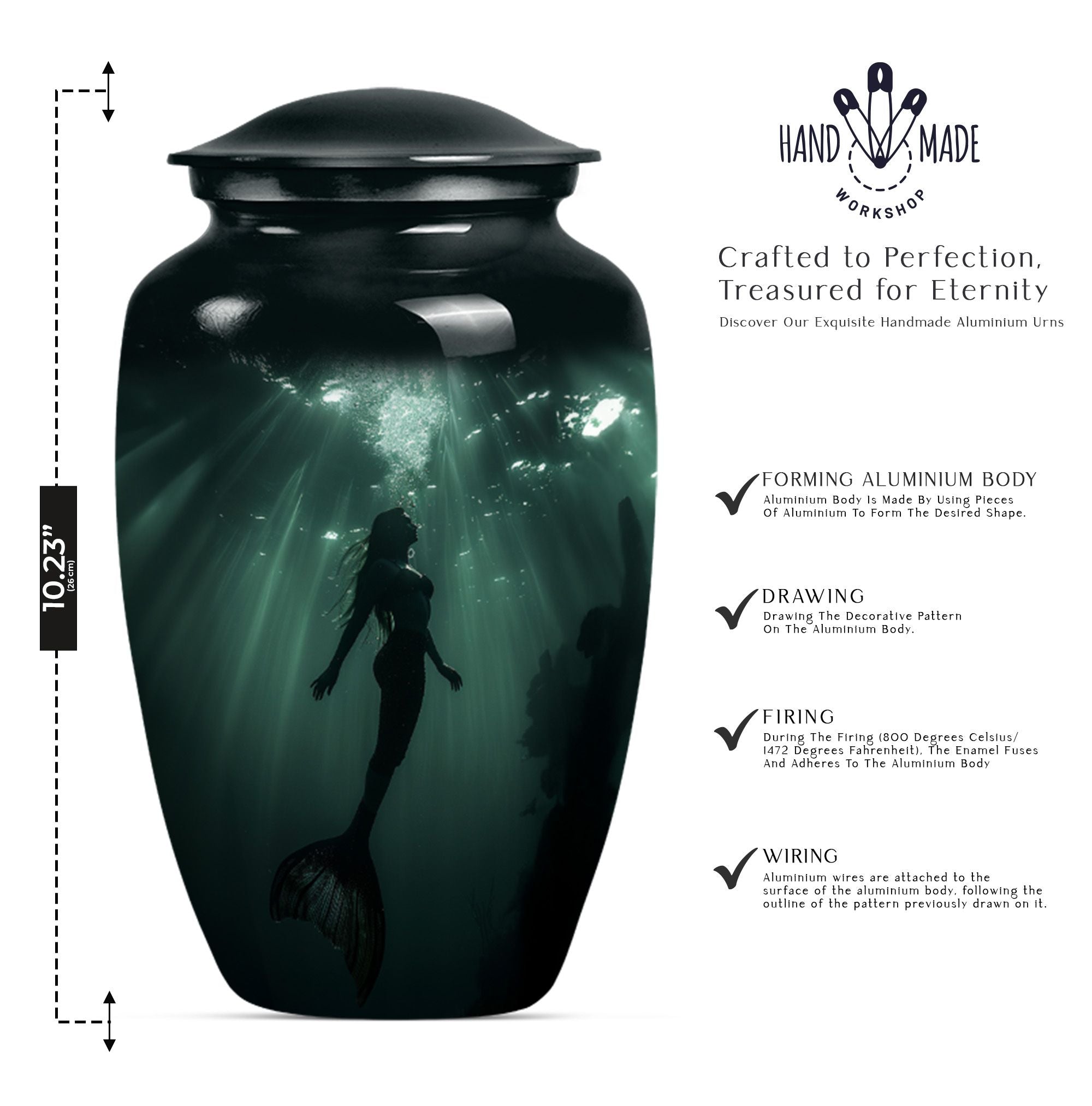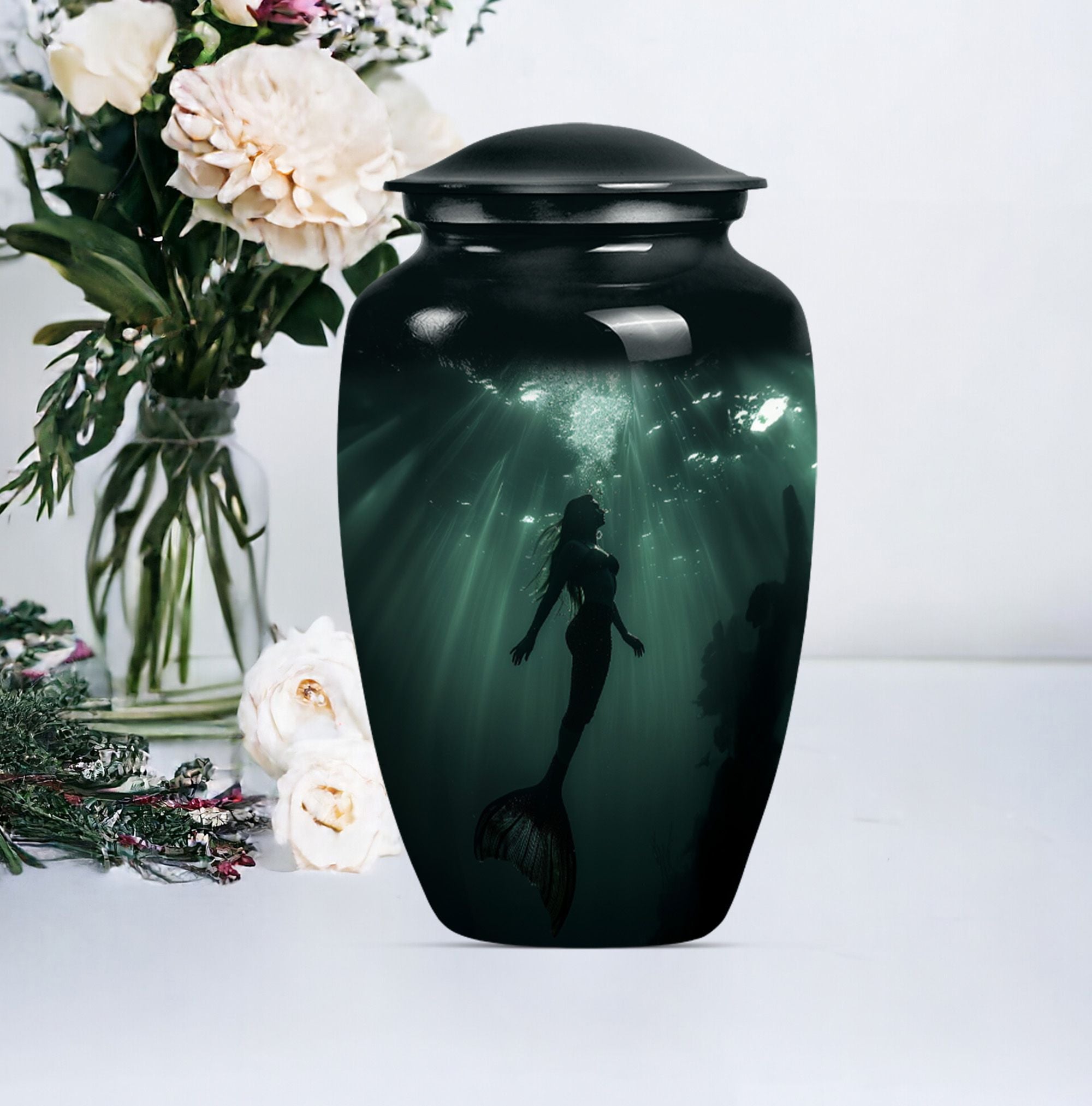 Treasure the memory of your departed loved ones with our enchanting Mermaid Urn, an emblem of timeless tranquility. Crafted from high quality aluminium, these 10-inch Large Urns, weighing 3.3 pounds, offer an ideal repository for the ashes of an adult female. The capacity of 200 cubic inches ensures ample space for your dear one's remains. The allure of this burial urn is further enhanced by its captivating Butterfly theme. An added beauty is that you can make it even more special by personalizing it with engraved names. Notably, our cremation urn is accompanied by a velvet pouch, designed for containment of ashes, bestowing an added layer of respect and refinement. This product harmoniously merges elements of memorial tribute and art, making it more than just an urn, but a precious memorial gift. Invoke your search for 'burial funeral urns for adult women' or 'metal urn for ashes adult male' and you would be led to this classic showpiece. For decisions as sensitive as these, rely on us for dignity and grace.