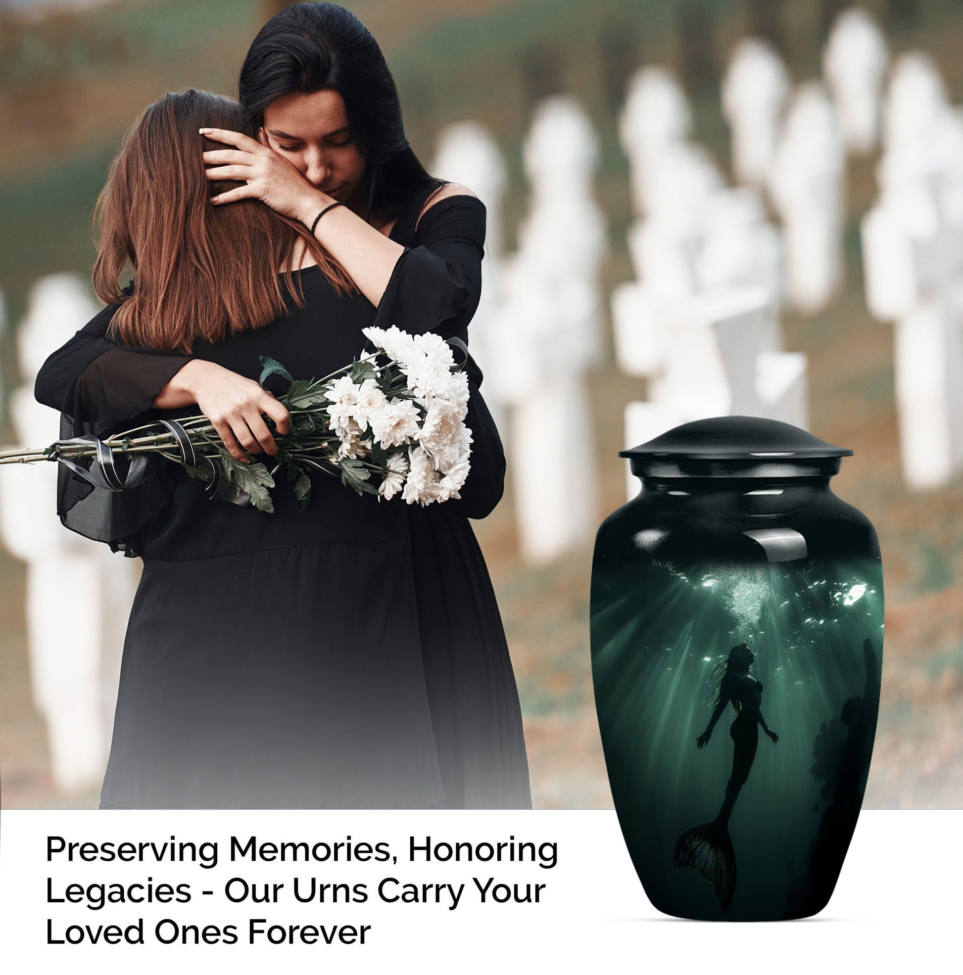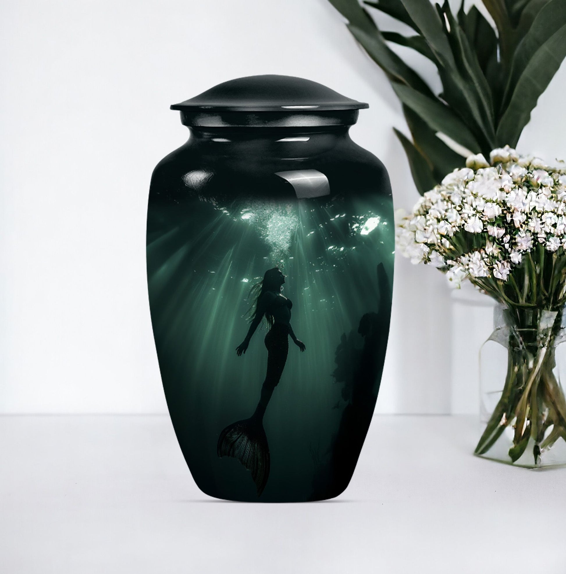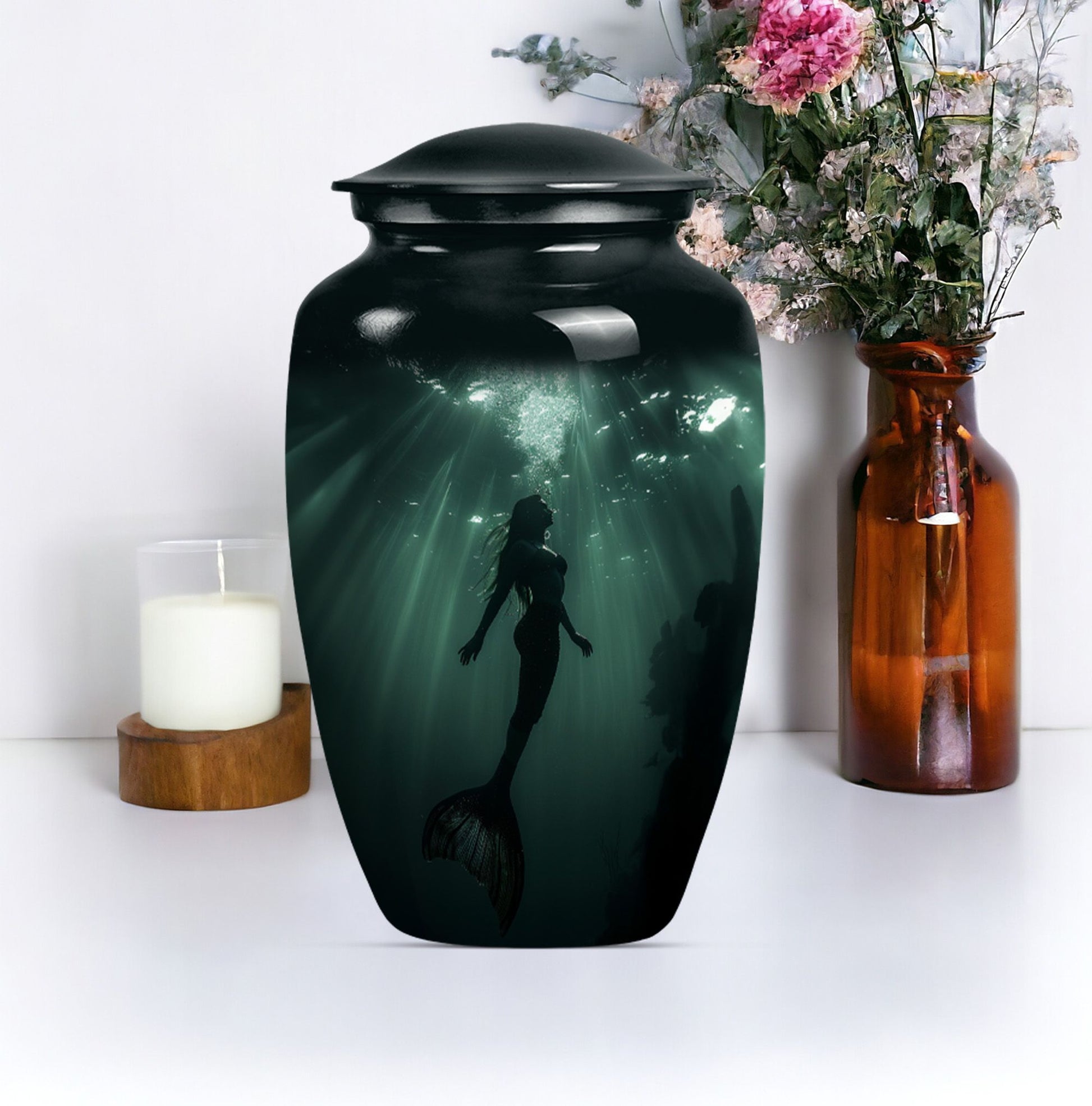 Treasure the memory of your departed loved ones with our enchanting Mermaid Urn, an emblem of timeless tranquility. Crafted from high quality aluminium, these 10-inch Large Urns, weighing 3.3 pounds, offer an ideal repository for the ashes of an adult female. The capacity of 200 cubic inches ensures ample space for your dear one's remains. The allure of this burial urn is further enhanced by its captivating Butterfly theme. An added beauty is that you can make it even more special by personalizing it with engraved names. Notably, our cremation urn is accompanied by a velvet pouch, designed for containment of ashes, bestowing an added layer of respect and refinement. This product harmoniously merges elements of memorial tribute and art, making it more than just an urn, but a precious memorial gift. Invoke your search for 'burial funeral urns for adult women' or 'metal urn for ashes adult male' and you would be led to this classic showpiece. For decisions as sensitive as these, rely on us for dignity and grace.