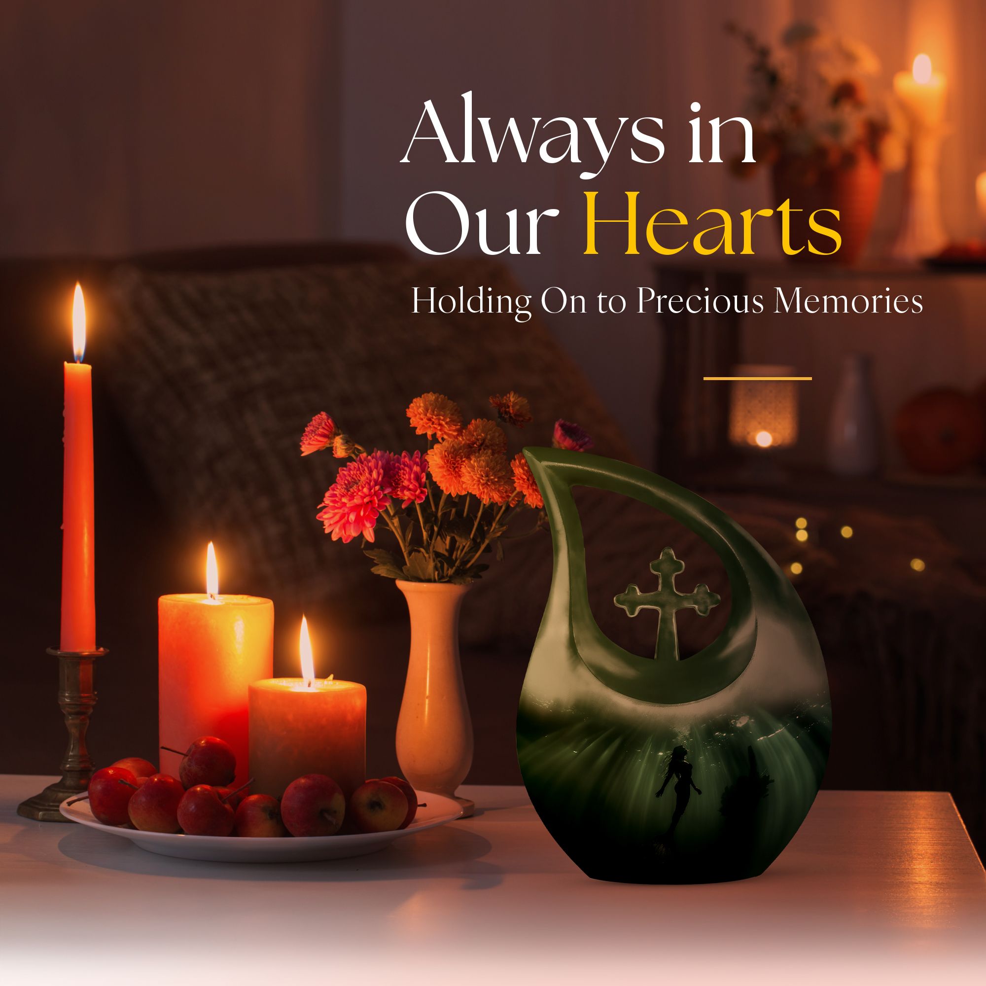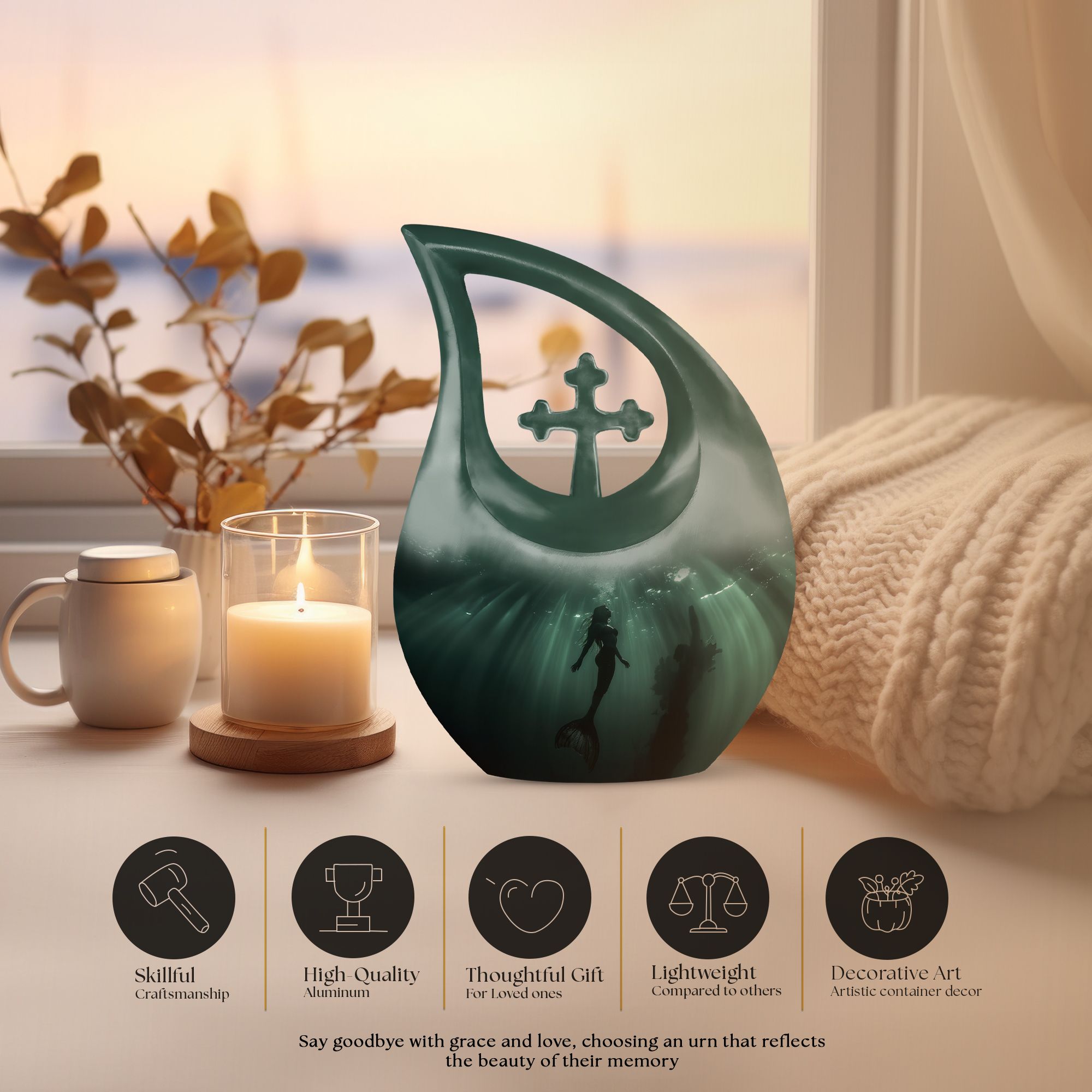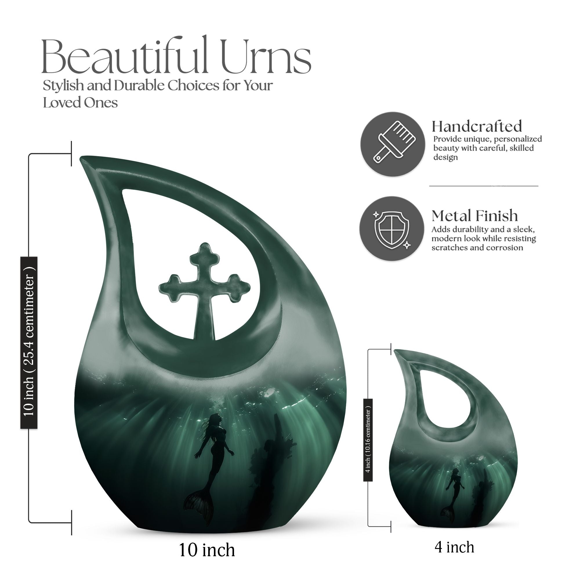 Honor your departed beloved with this sublime 10-inch Mermaid Urn. Fashioned from high-quality Aluminium, this commemorative piece weighs 3.3 pounds and has an exquisite 'Cross Drop' design. This Large Urn boasts a capacity of 200 cubic inches, making it suitable as a fitting final resting place for a cherished one. It comes complete with a sophisticated velvet pouch, providing an elegant, safe haven for the preserved ashes. What makes this item unique? We offer the opportunity to add a personal touch with engraved names, turning the urn into a heartfelt tribute. It's not just an urn; it's a beautifully curated memorial piece resonating love and therefore recommended for those searching for 'Urns for Mom' or 'Urns with Love.' Looking out for eco-friendly cremation alternatives? Our Mermaid Urn rightly suits those keyword phrases such as 'Cremation Vaults,' and 'Cremation Urns For Human Ashes.' Pay your respects in a unforgettable way with this distinguished Mermaid Urn.