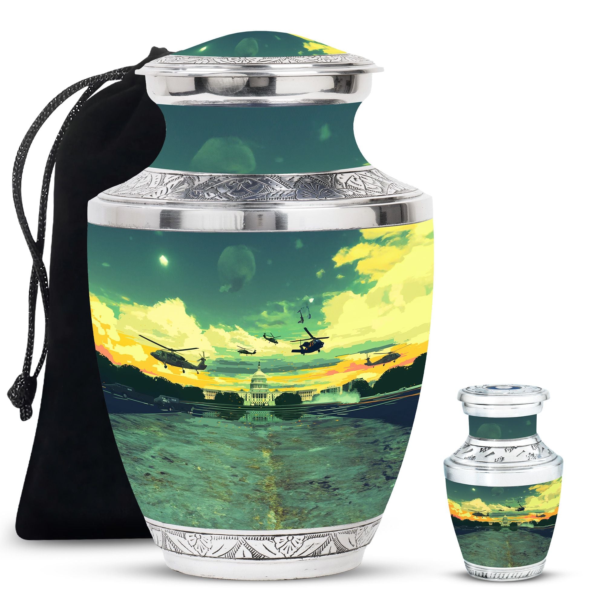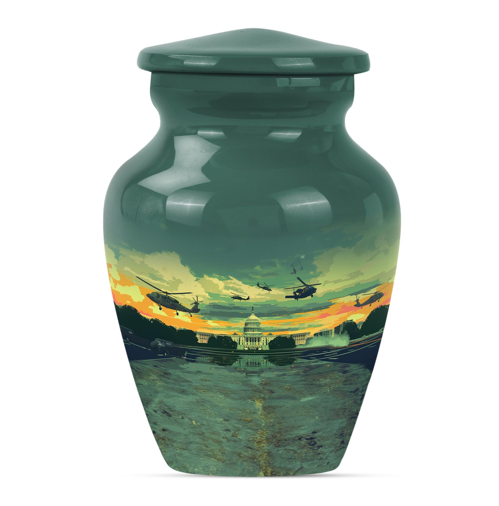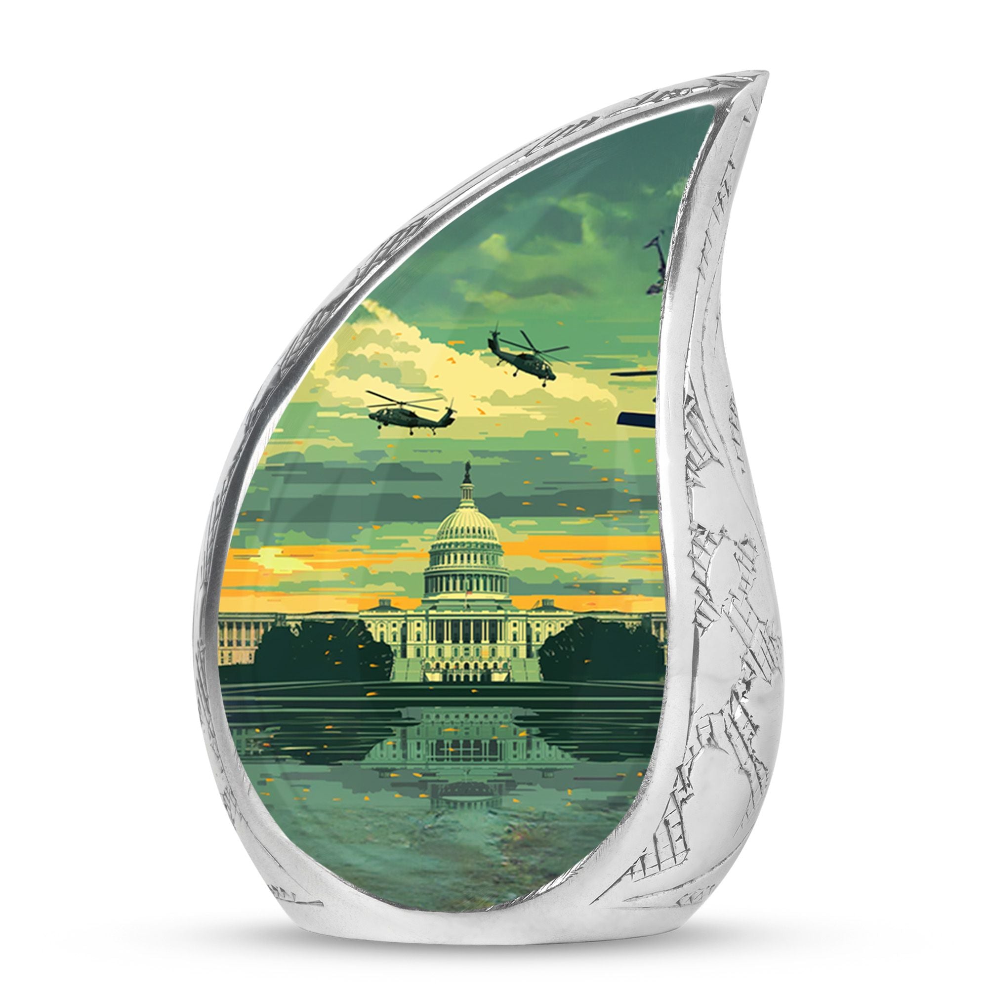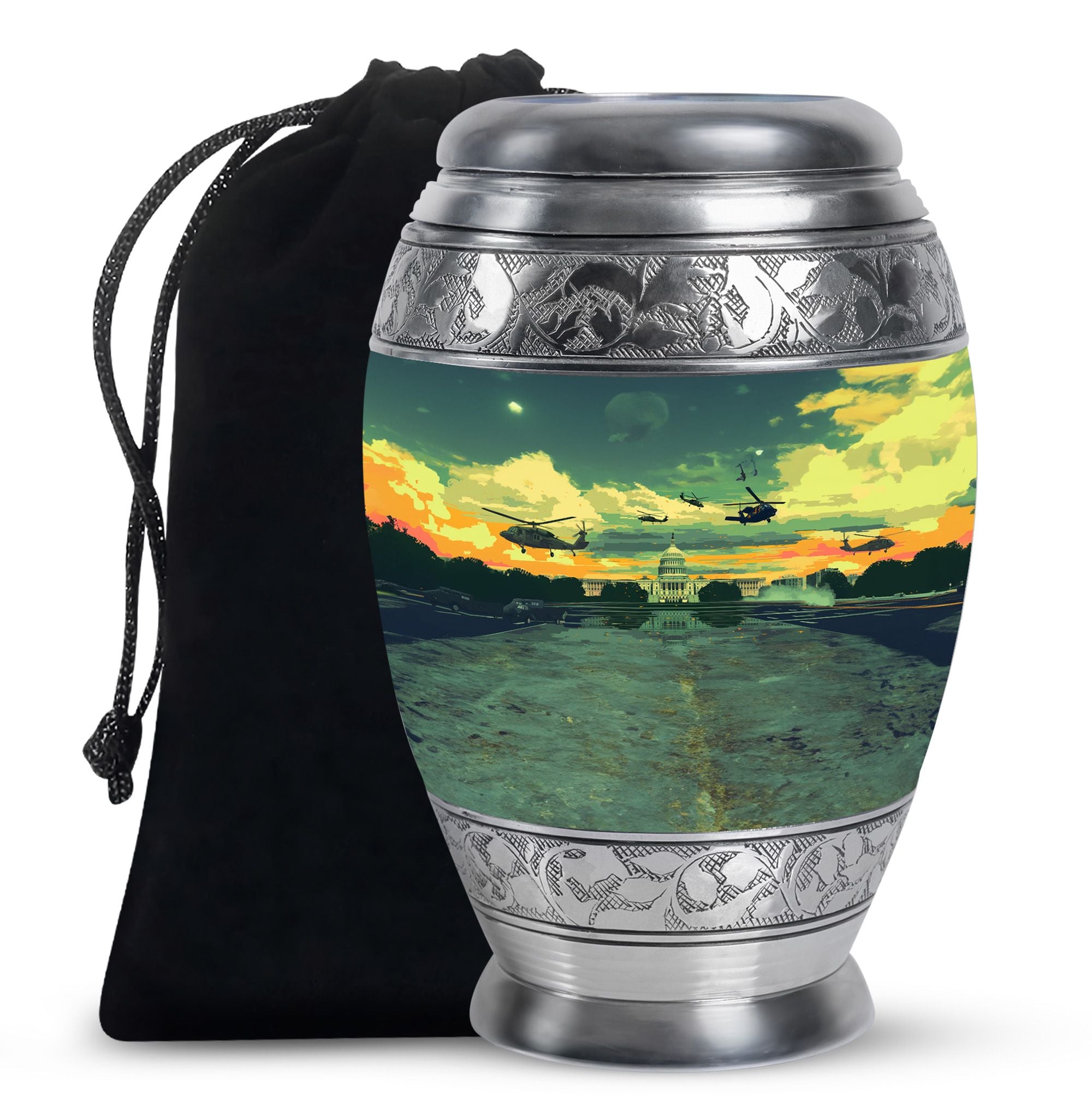 This **cremation urn for human ashes** **represents the bravery, sacrifice, and dedication of those who served their country**.