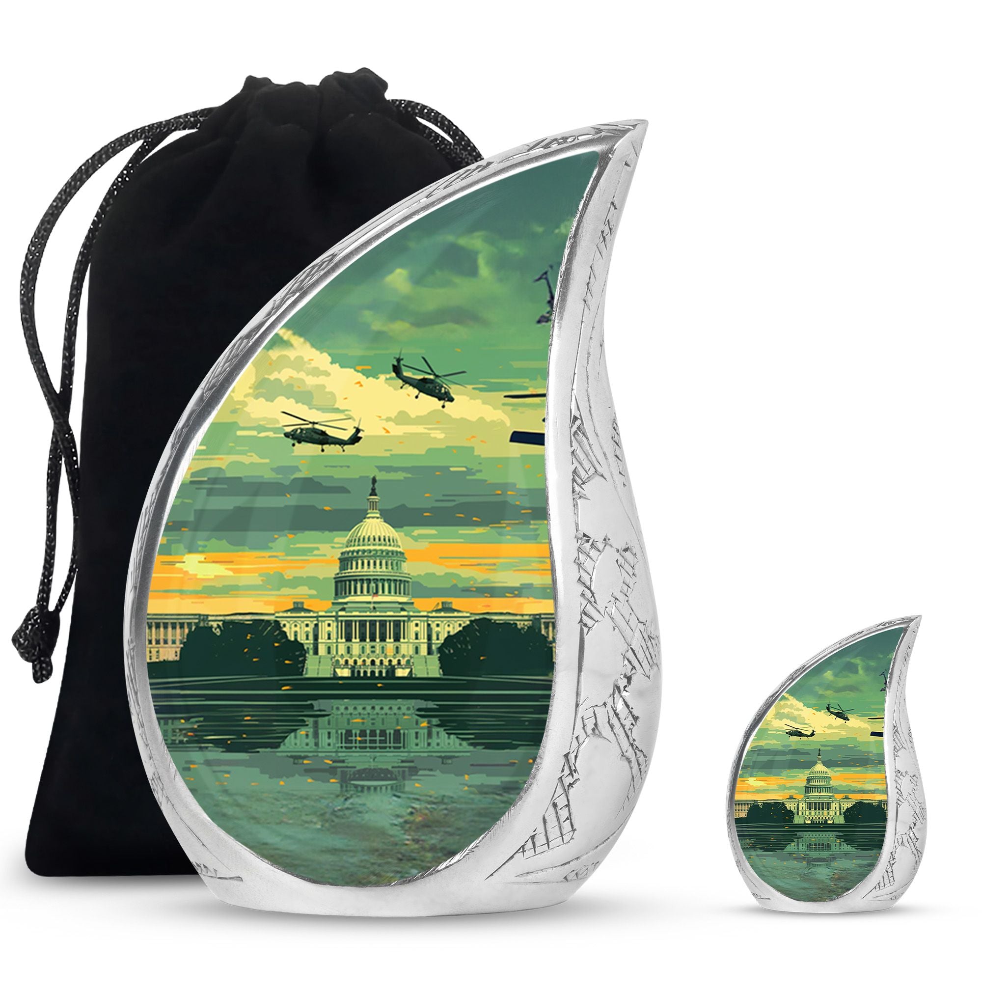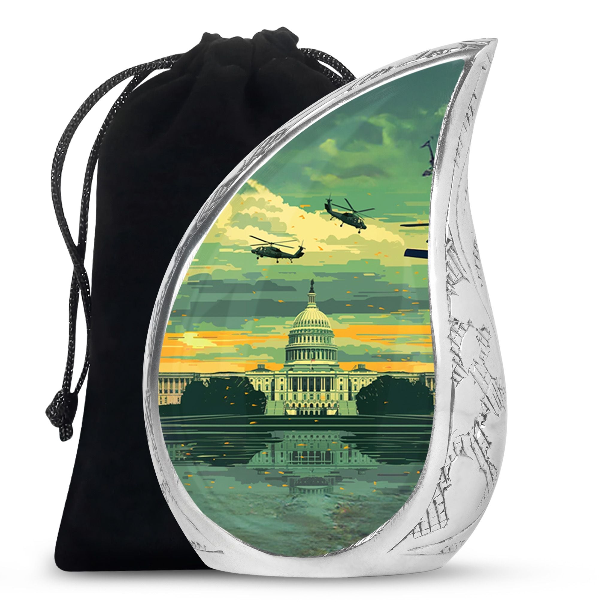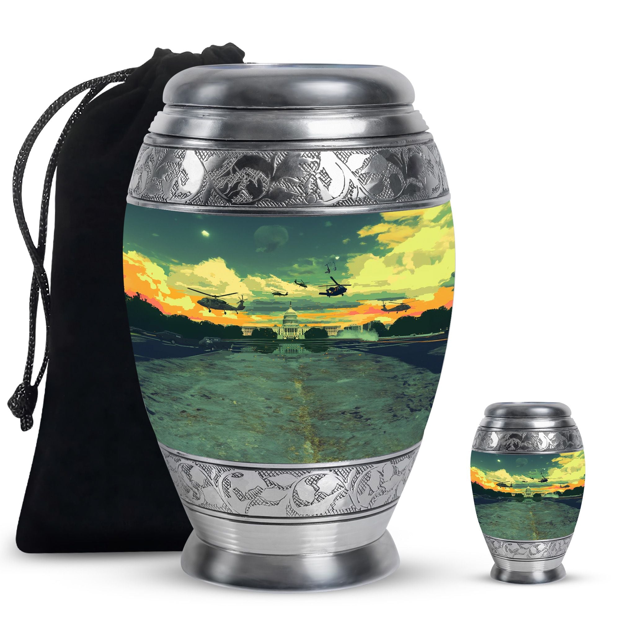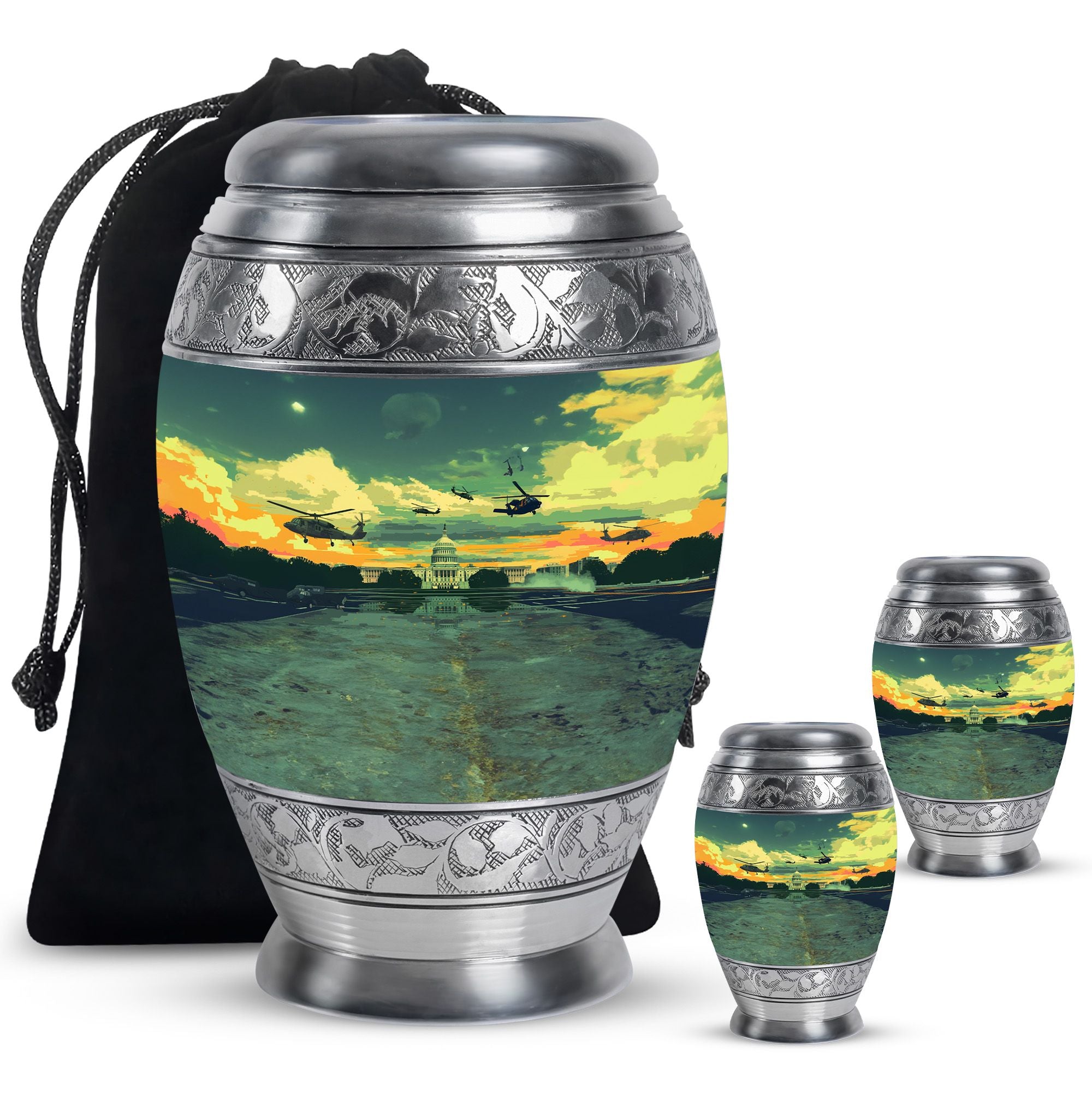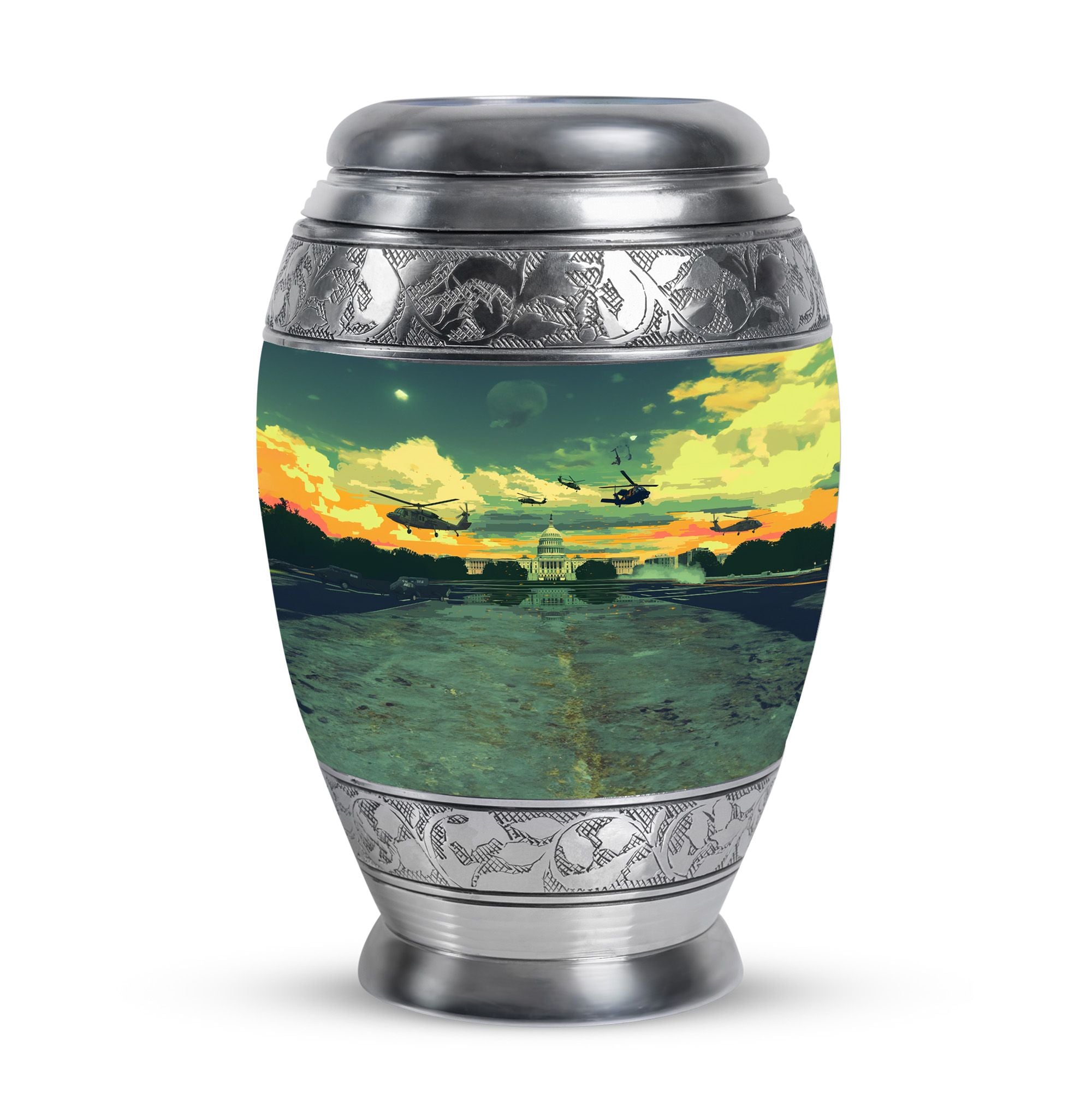 This **cremation urn for human ashes** **represents the bravery, sacrifice, and dedication of those who served their country**.