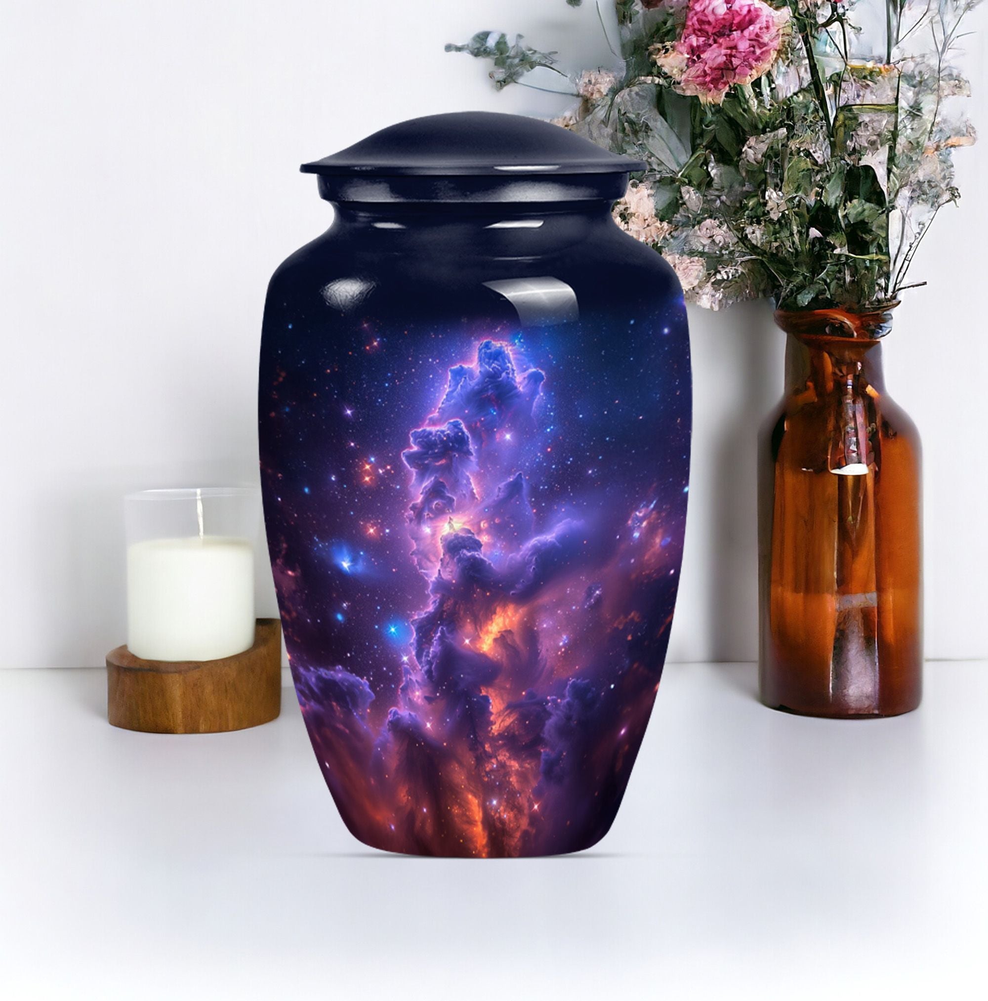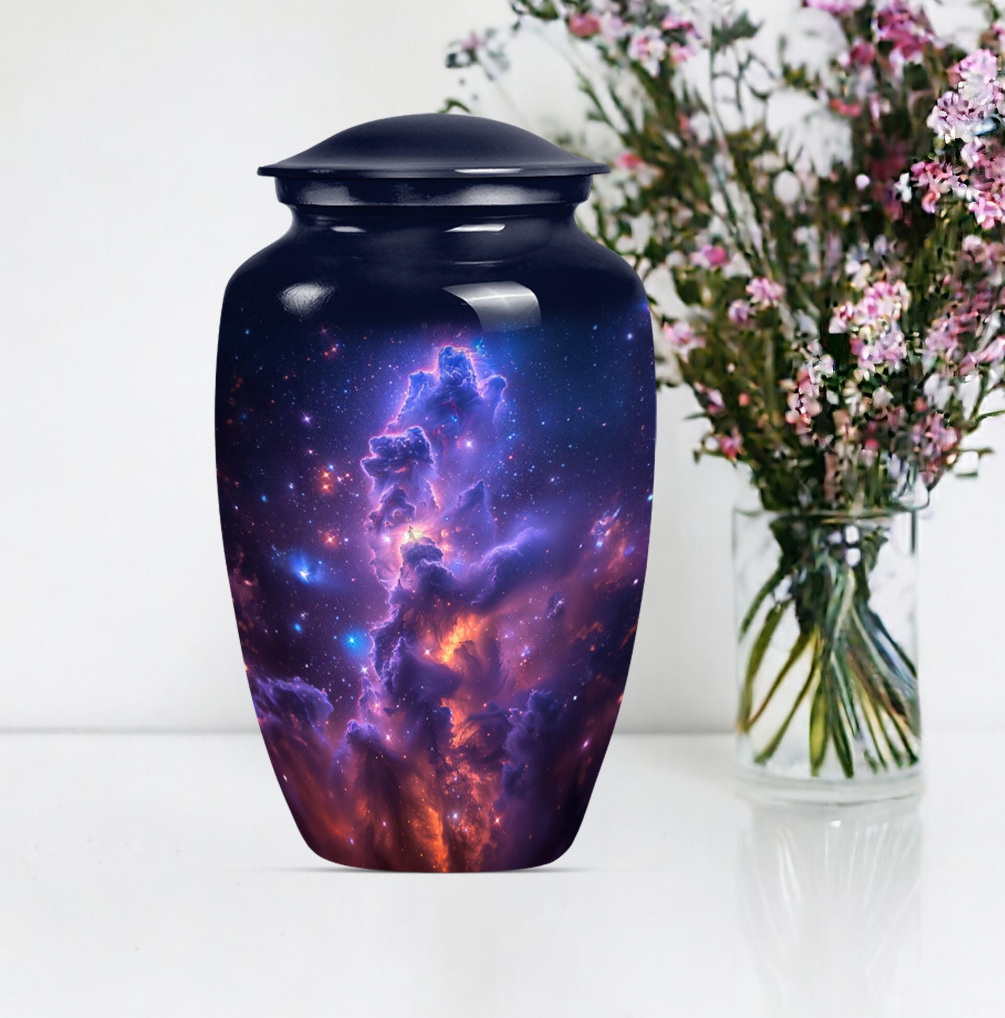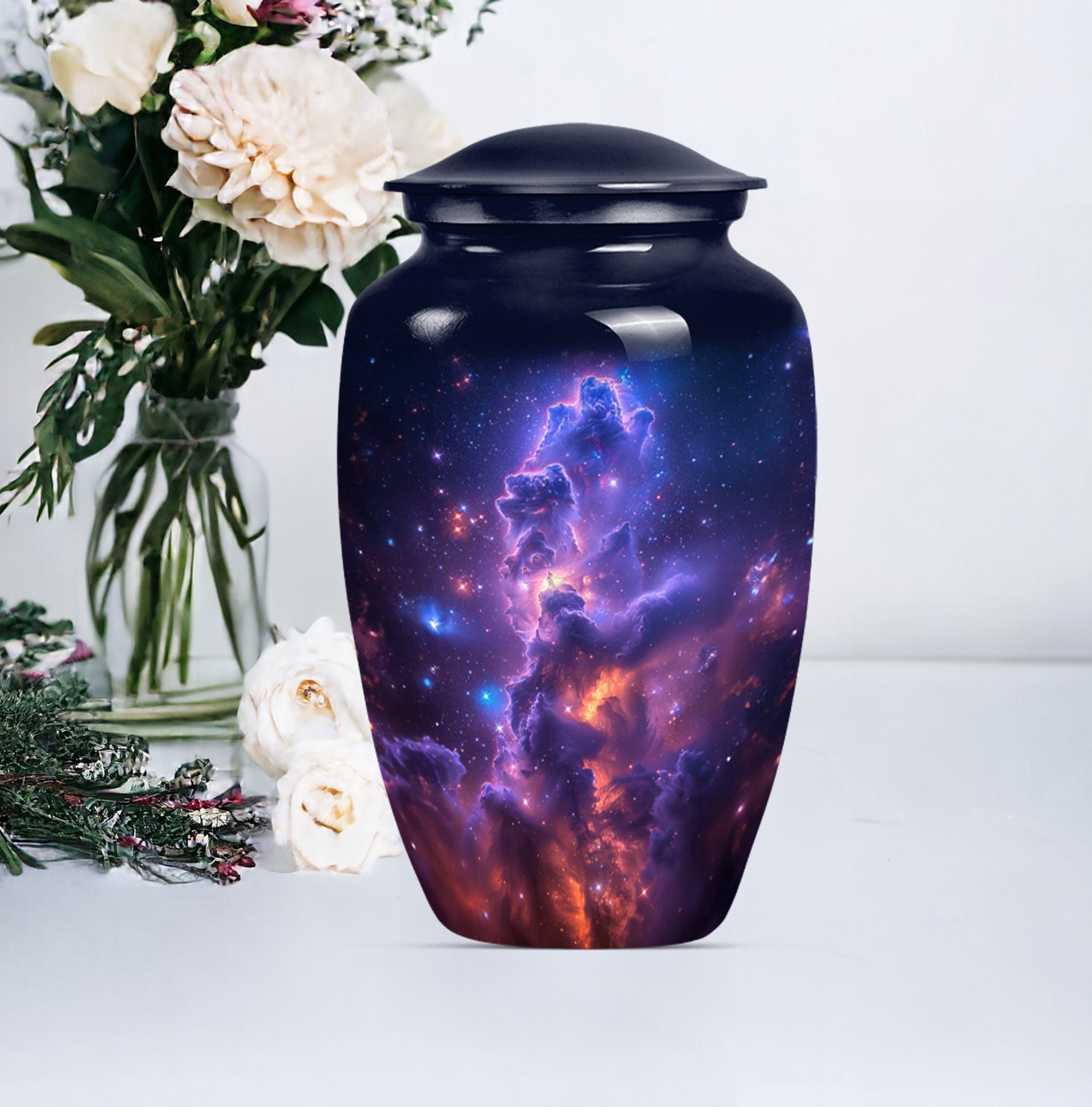 This large cremation urn is made from durable aluminium with a radiant milkyway-inspired finish, symbolizing eternity and peace. The graceful pattern blends modern design with traditional craftsmanship, making it ideal for display in the home or for burial. With a generous capacity, it serves as a large human ashes urn suitable for honoring the memory of an adult. Its secure screw-top lid ensures the ashes remain safely protected. Whether chosen as a large urn for human ashes or as part of a memorial display, it embodies both elegance and security.