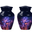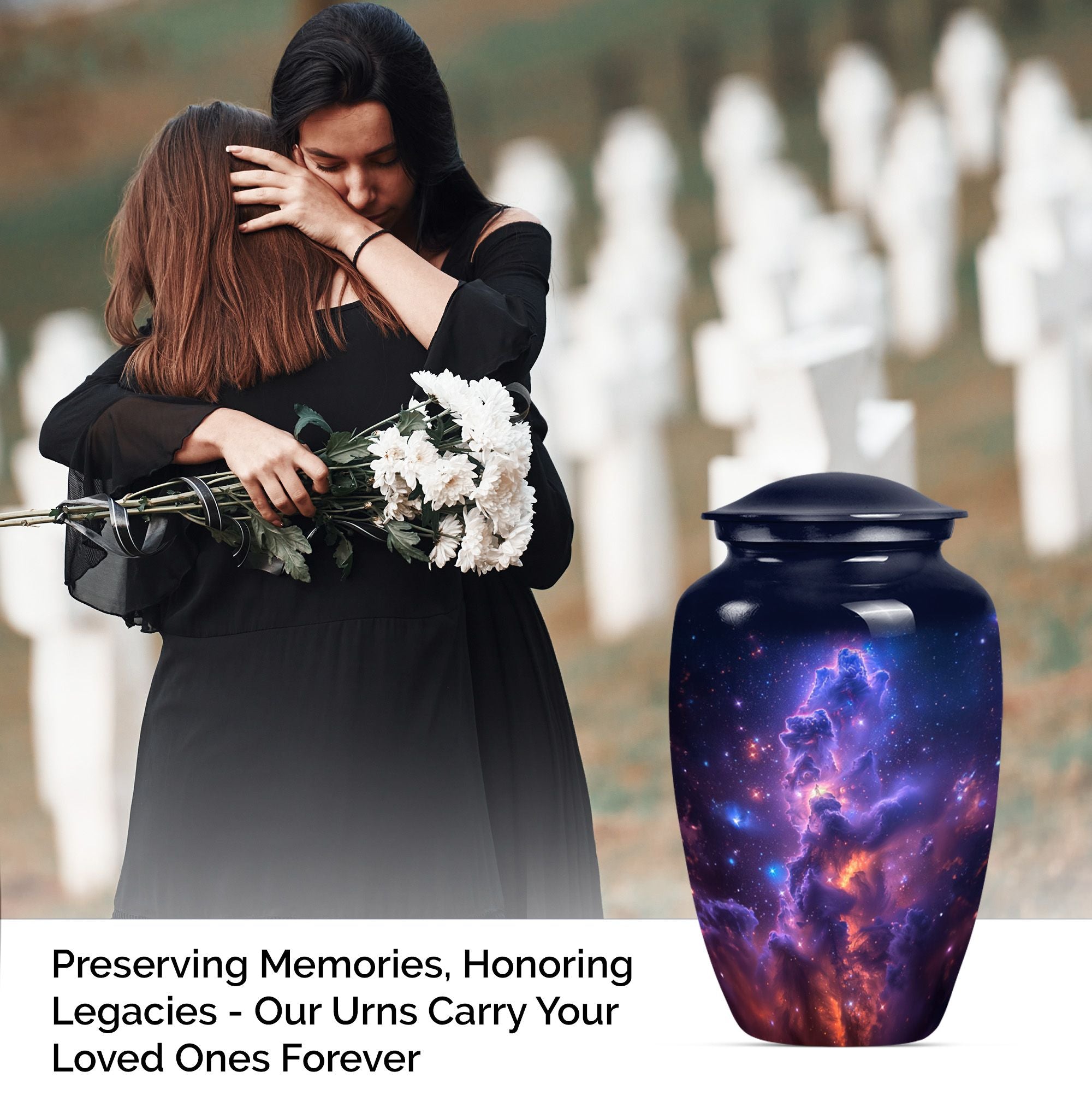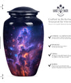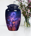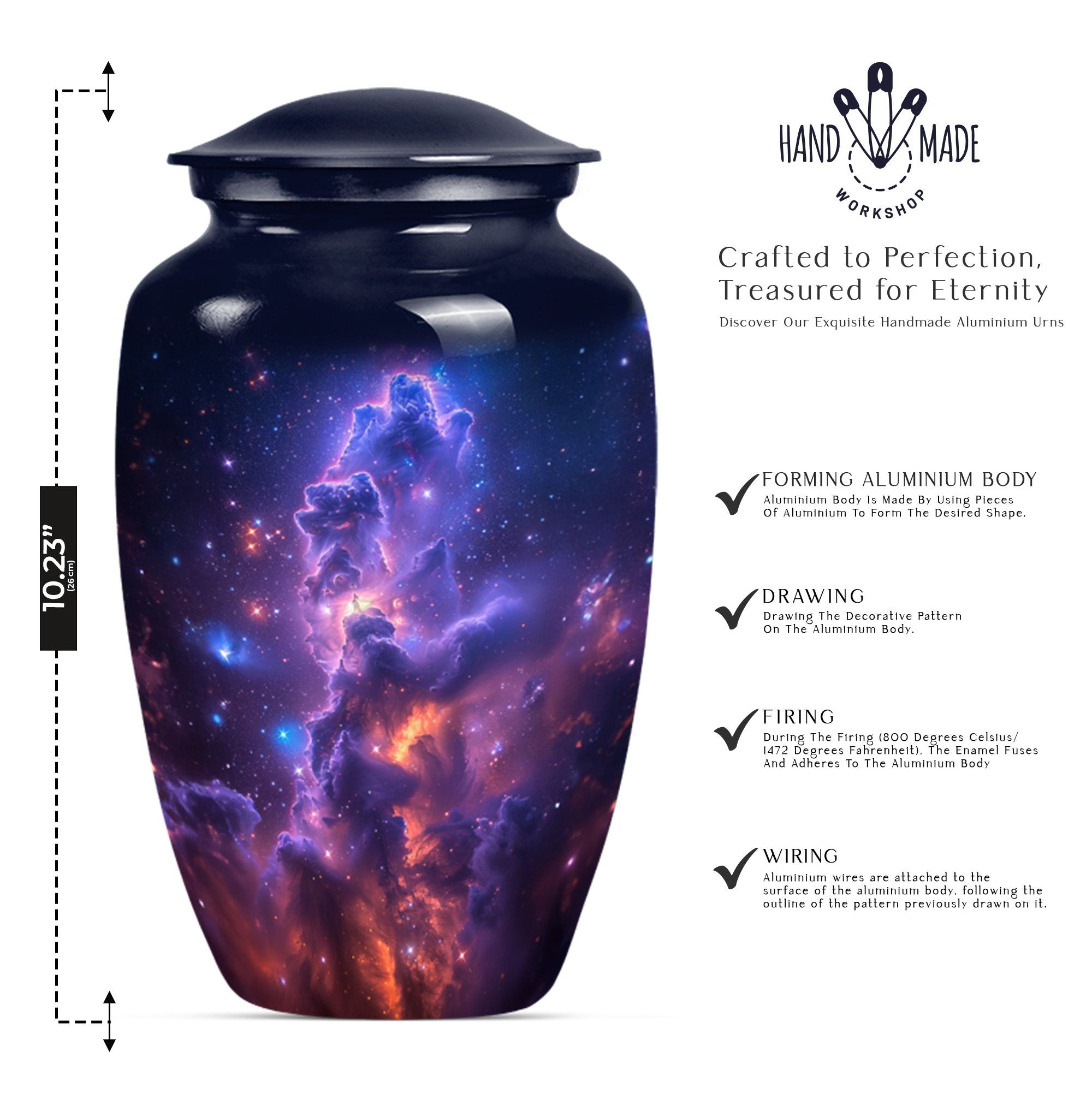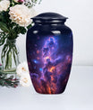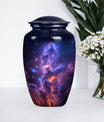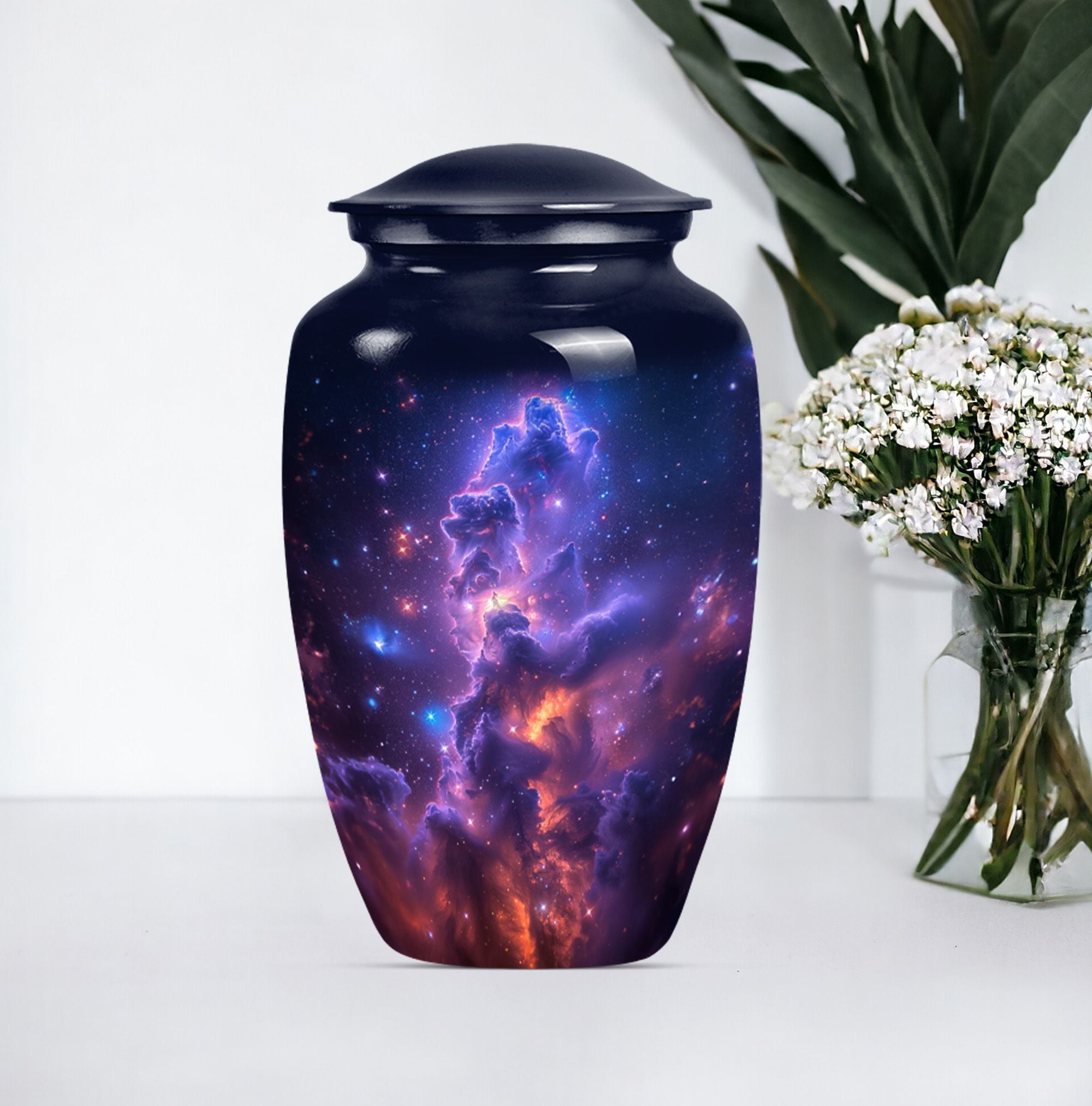 This large cremation urn is made from durable aluminium with a radiant milkyway-inspired finish, symbolizing eternity and peace. The graceful pattern blends modern design with traditional craftsmanship, making it ideal for display in the home or for burial. With a generous capacity, it serves as a large human ashes urn suitable for honoring the memory of an adult. Its secure screw-top lid ensures the ashes remain safely protected. Whether chosen as a large urn for human ashes or as part of a memorial display, it embodies both elegance and security.