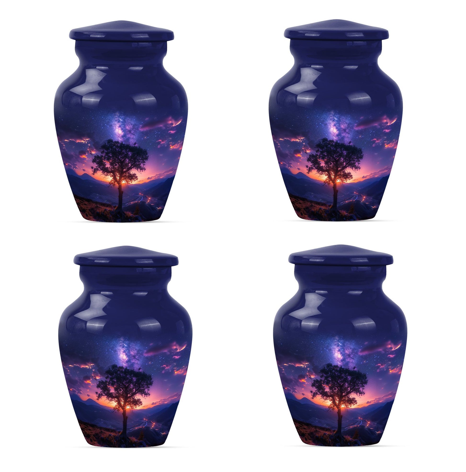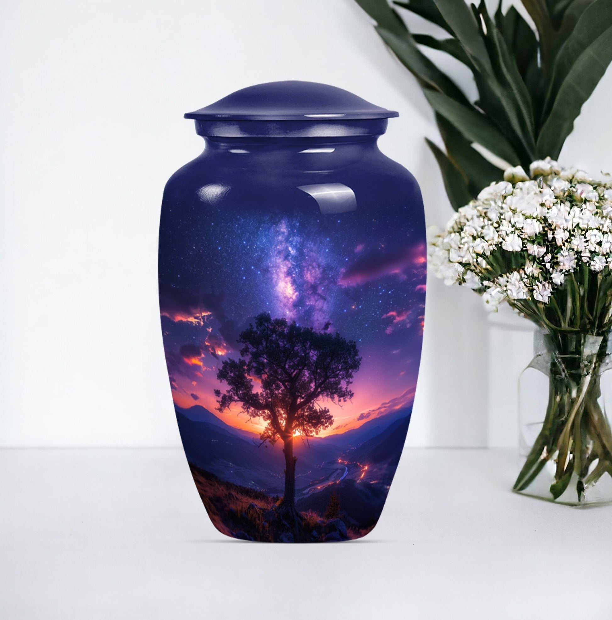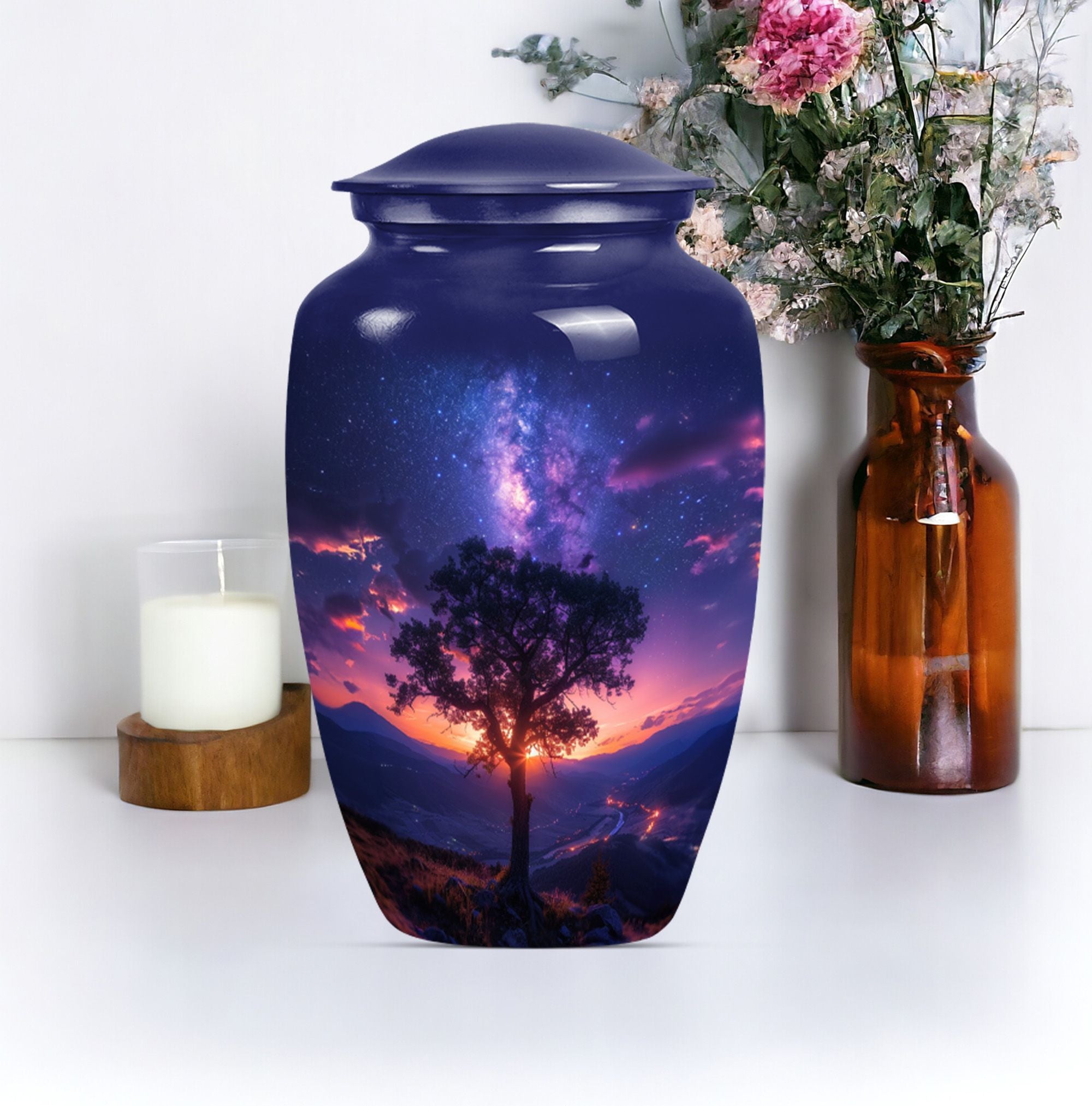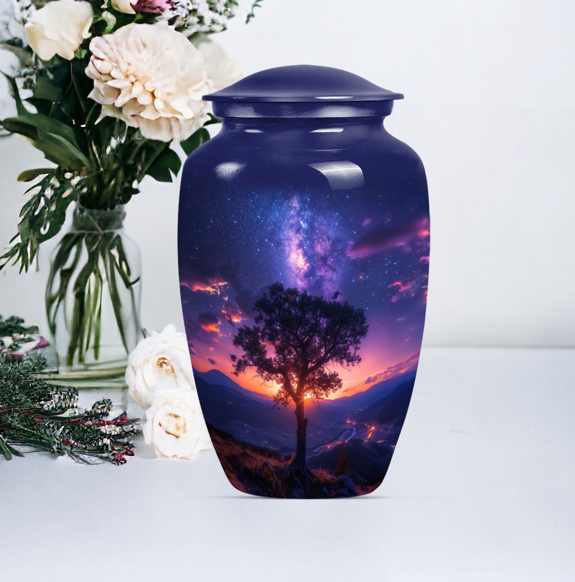 This large cremation urn showcases a stunning galaxy-inspired design that symbolizes eternity, peace, and the infinite universe. Made from durable aluminium, it ensures strength and longevity, making it a reliable resting place. Designed as one of the most elegant cremation urns large, it offers secure placement with a screw-top lid, while its decorative style makes it suitable for display in the home or for ceremonial use. This piece is not only a vessel but also a beautiful statement of remembrance, perfect among urns for human ashes large.