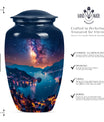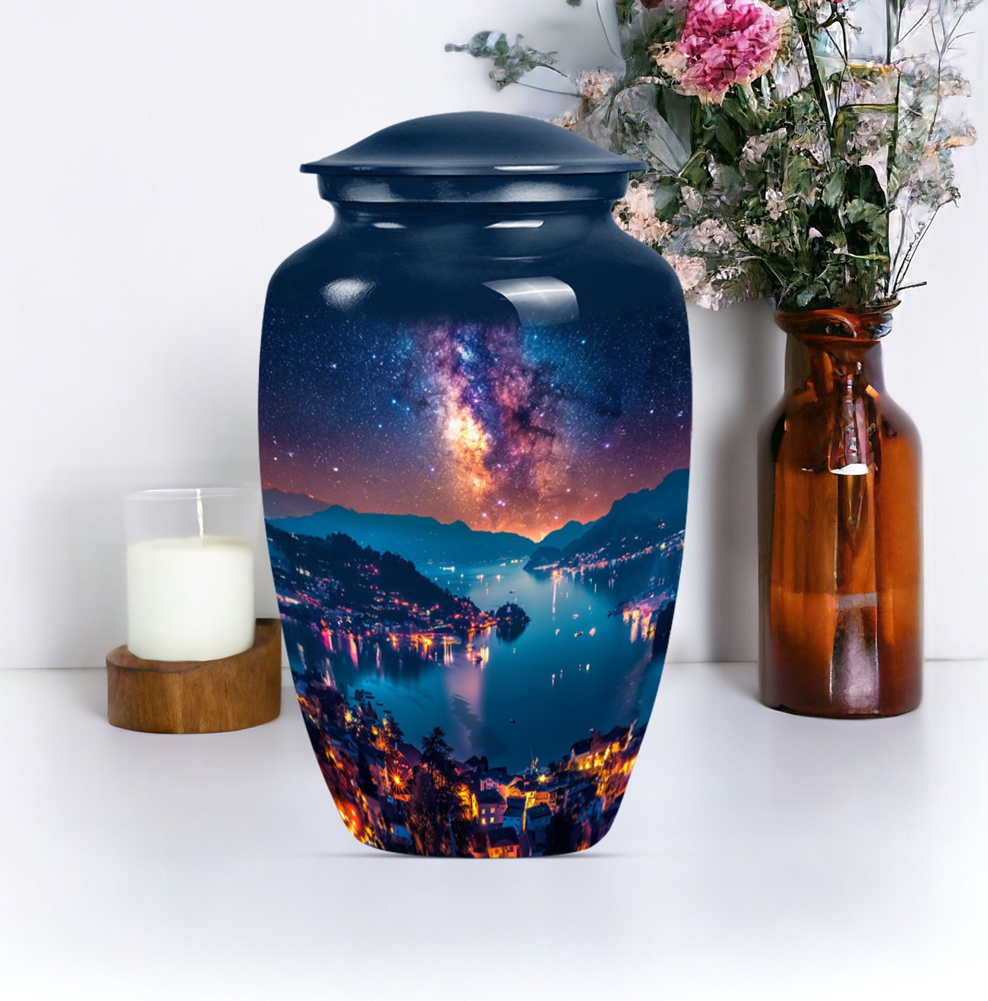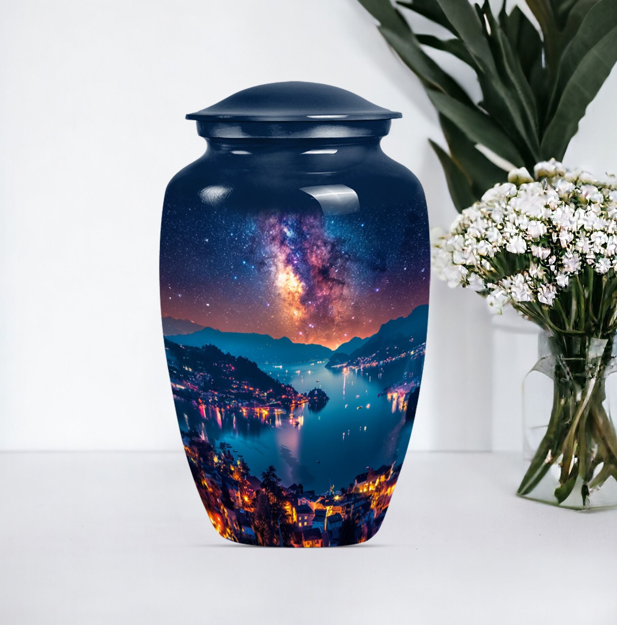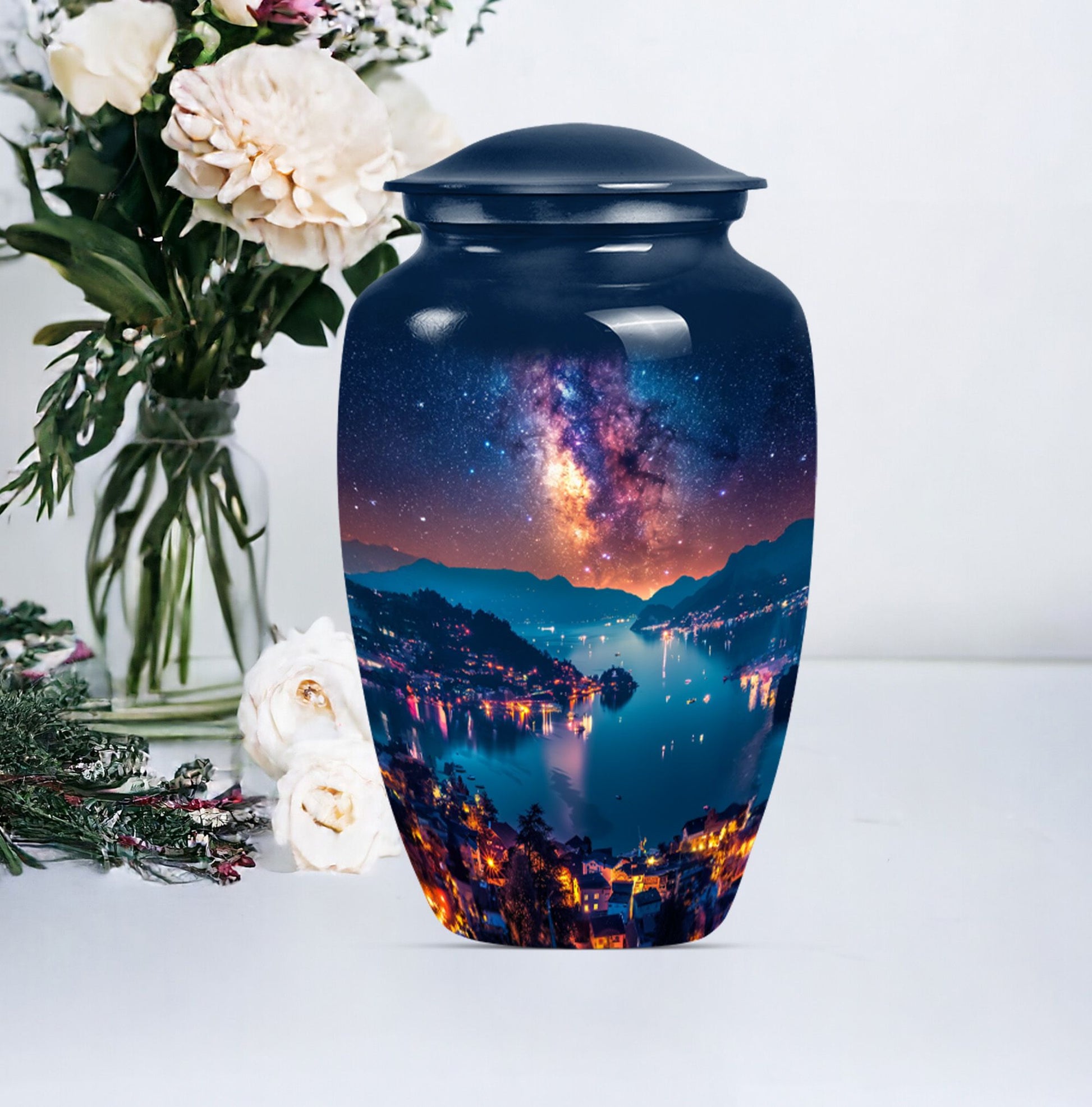 The 'Milkyway Urn' is an exquisite addition to our memorial urns collection. This large-sized cremation urn is perfect for commemorating the life of a loved one, with a capacity of 200 cubic inches, it is able to hold the ashes of an adult weighing up to 200 lbs. At 10 inches tall, this tastefully crafted item is made from lightweight aluminium, weighing a steady 3.3 pounds. Not just functional, this urn is a work of art with an abstract theme that can be appreciated by all. The package also comes with a complimentary velvet pouch, providing a dignified containment solution for the ashes of your dear one. As a personalized touch, each urn can be engraved with the name of your lost loved one. Avoid the commonplace; opt for our 'Milkyway Urn', a cremation solution for women that stands apart from the rest. This item is a reverential and unisex gift option for adults and is much sought after in the funeral earns ashes category. A lasting tribute to ensure that memories never fade.