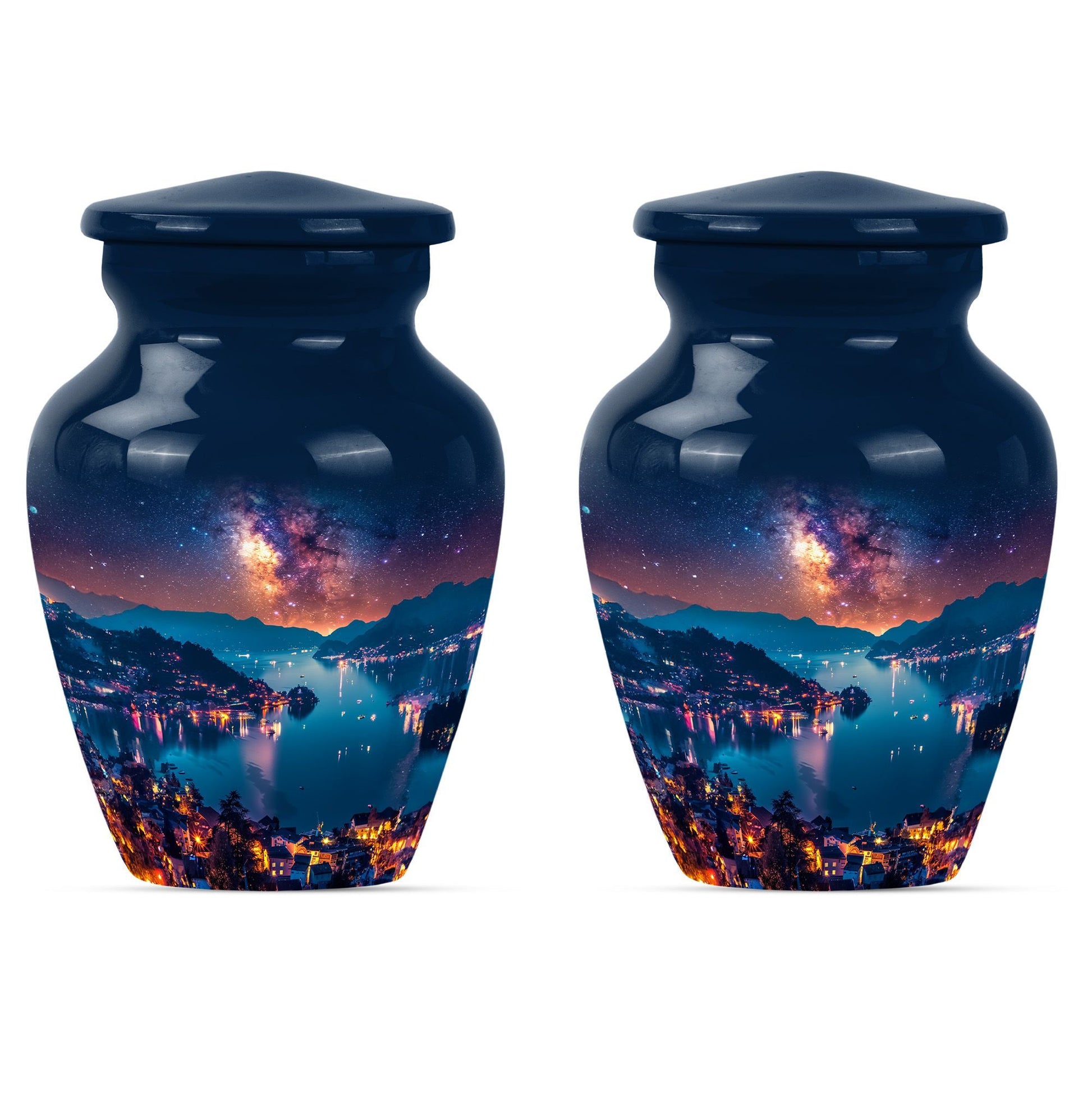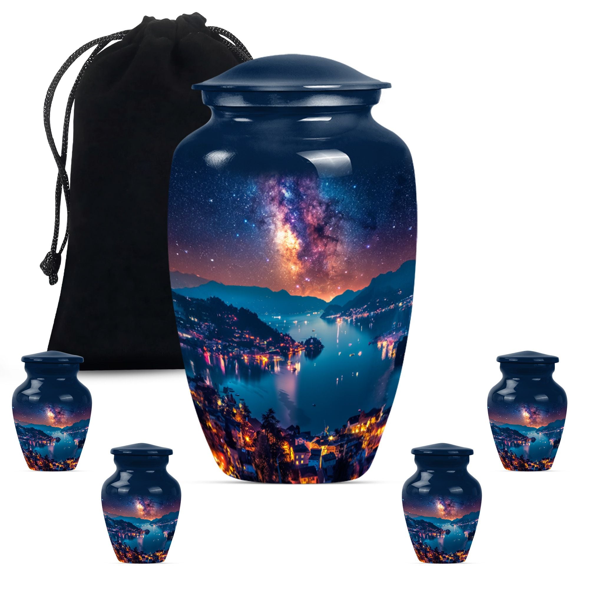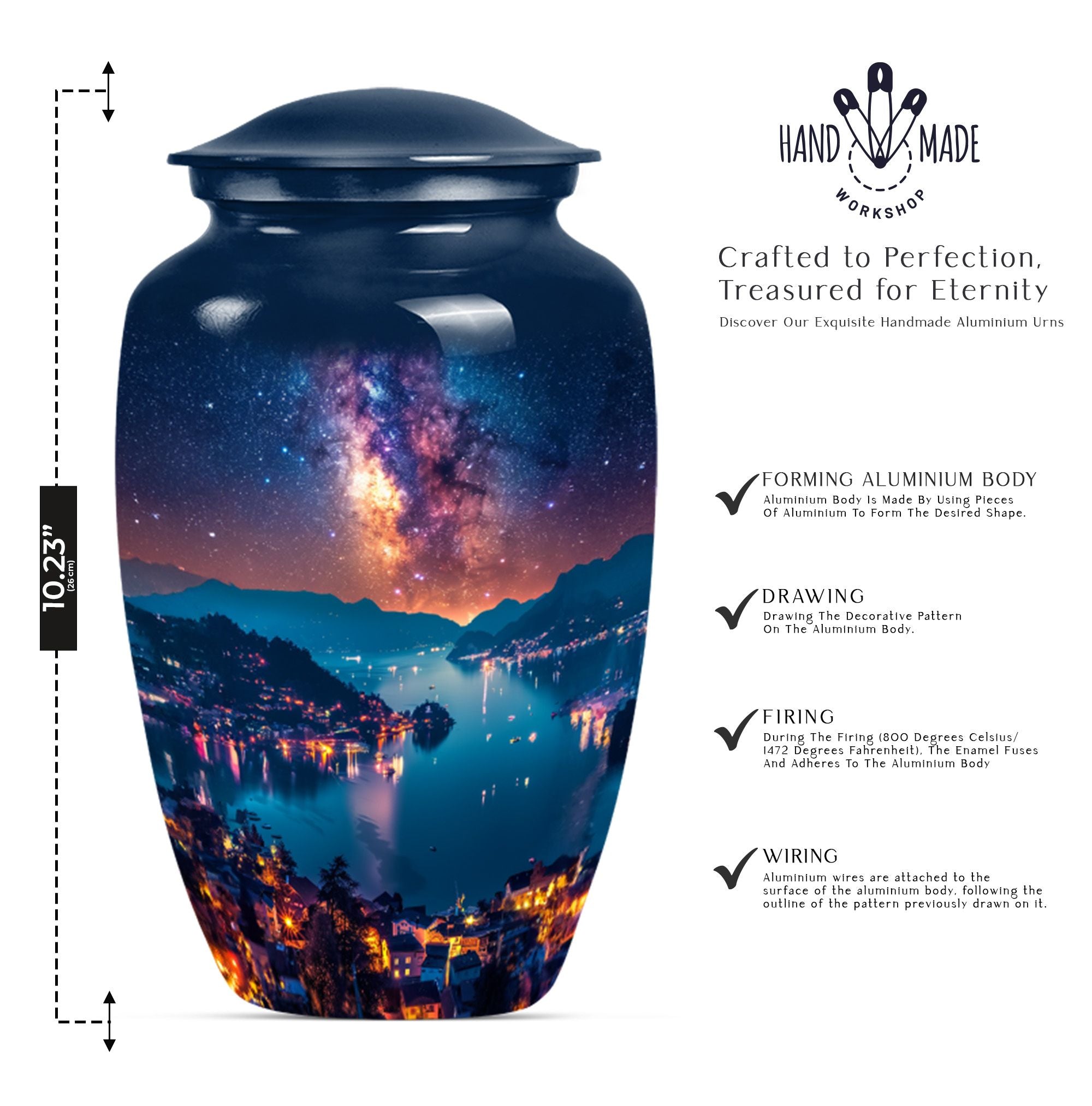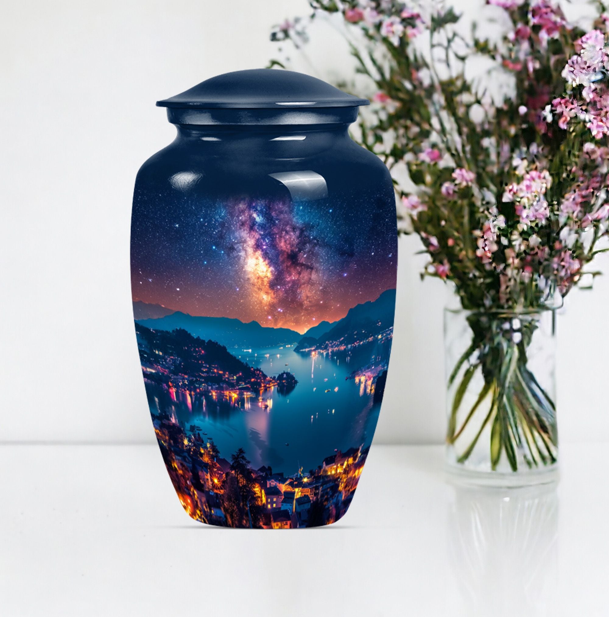 The 'Milkyway Urn' is an exquisite addition to our memorial urns collection. This large-sized cremation urn is perfect for commemorating the life of a loved one, with a capacity of 200 cubic inches, it is able to hold the ashes of an adult weighing up to 200 lbs. At 10 inches tall, this tastefully crafted item is made from lightweight aluminium, weighing a steady 3.3 pounds. Not just functional, this urn is a work of art with an abstract theme that can be appreciated by all. The package also comes with a complimentary velvet pouch, providing a dignified containment solution for the ashes of your dear one. As a personalized touch, each urn can be engraved with the name of your lost loved one. Avoid the commonplace; opt for our 'Milkyway Urn', a cremation solution for women that stands apart from the rest. This item is a reverential and unisex gift option for adults and is much sought after in the funeral earns ashes category. A lasting tribute to ensure that memories never fade.