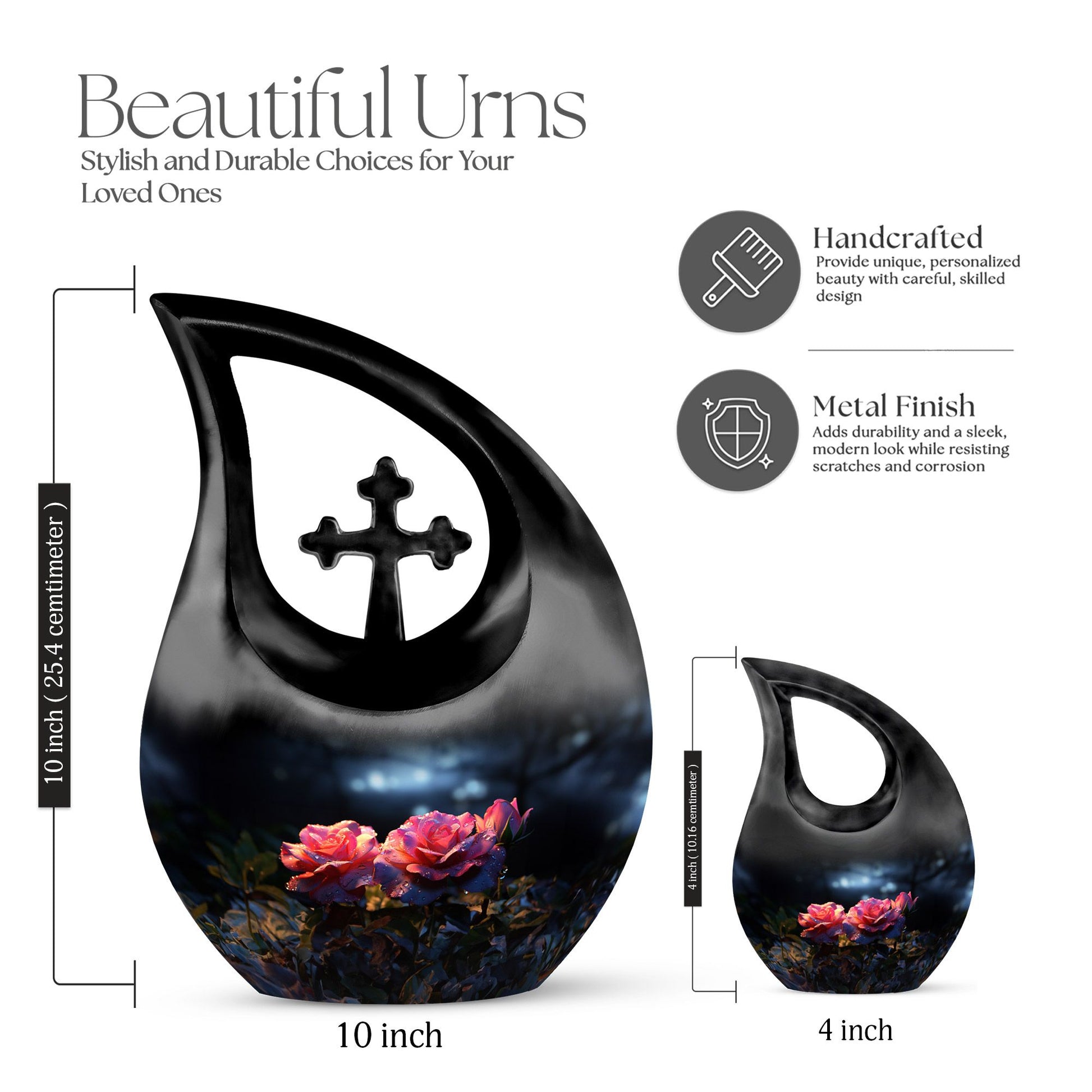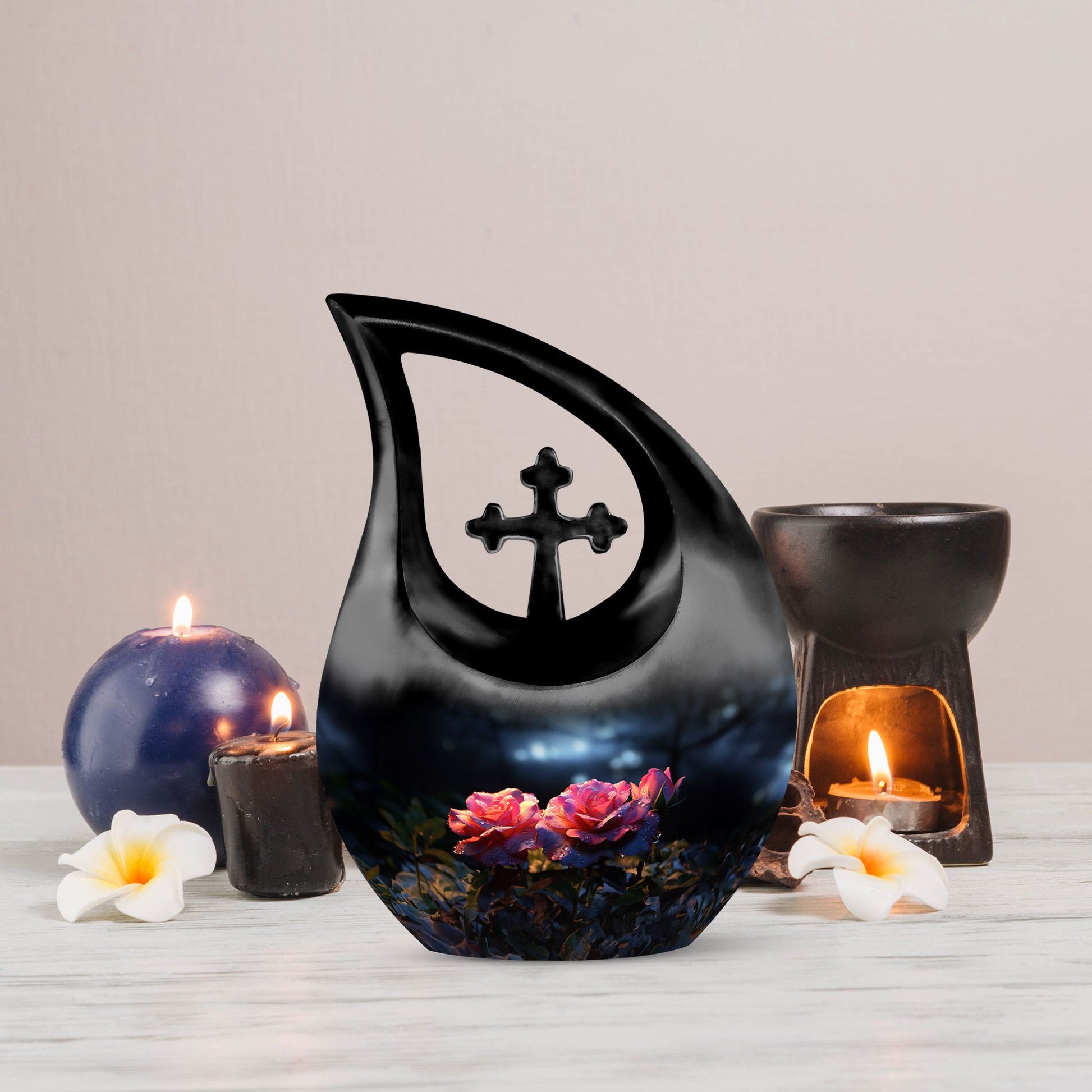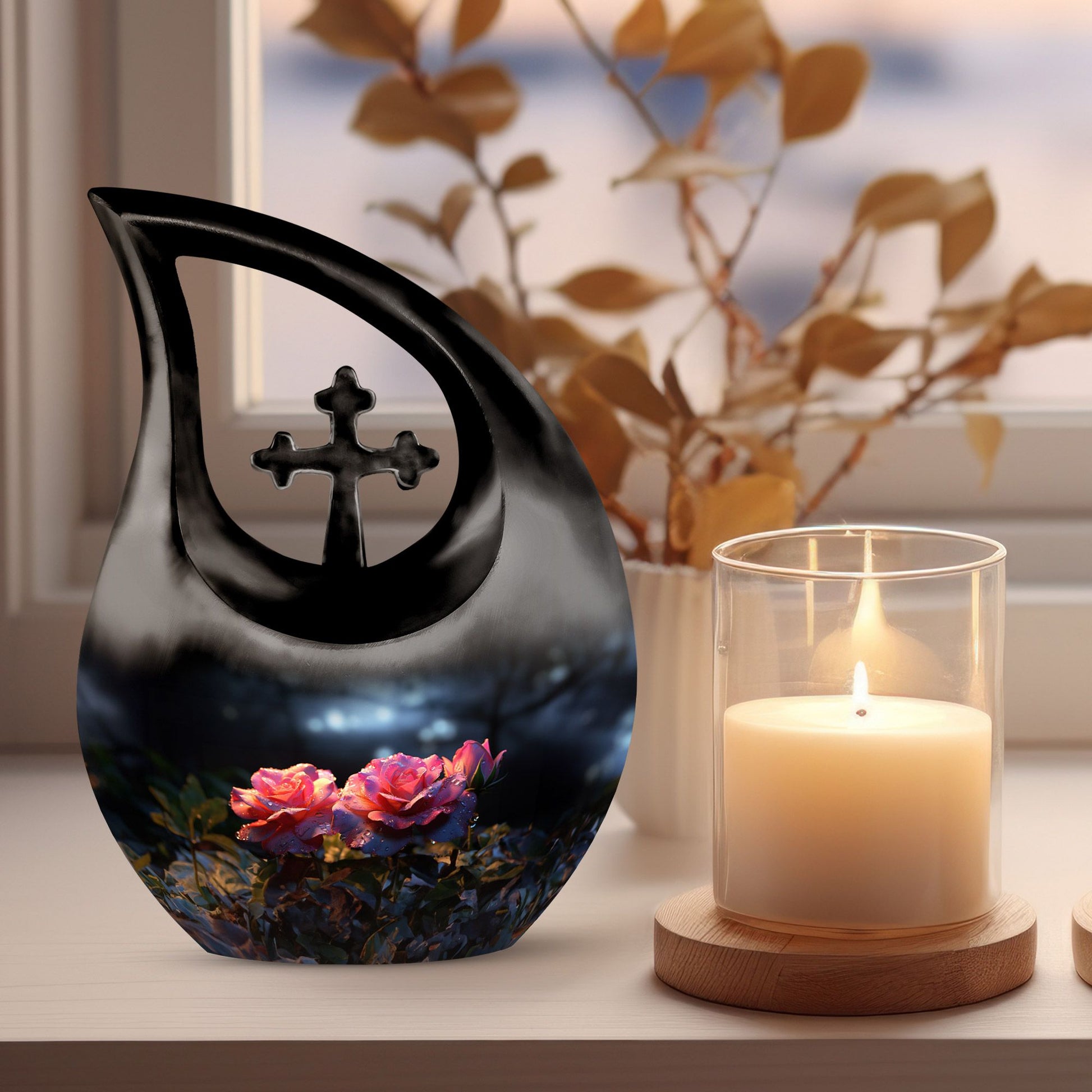 Celebrate a life filled with faith and love with our Black Cremation Urn for Human Ashes featuring a dual rose and cross design. This elegant piece serves as a timeless tribute for both men and women, symbolizing devotion, beauty, and eternal rest. Whether chosen as a cremation urn women cherish or as a burial urn men find dignified, it offers a heartfelt way to preserve precious memories.