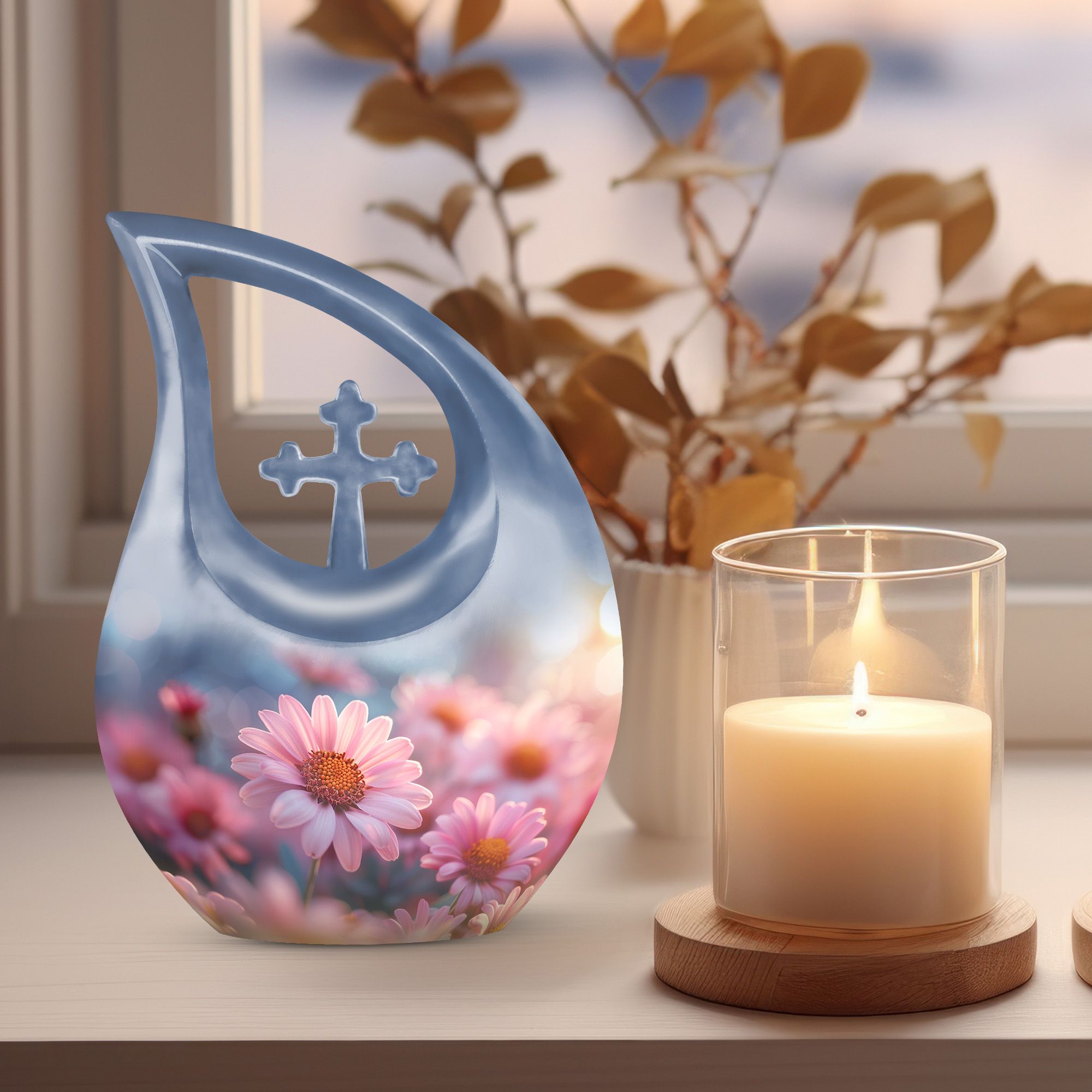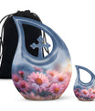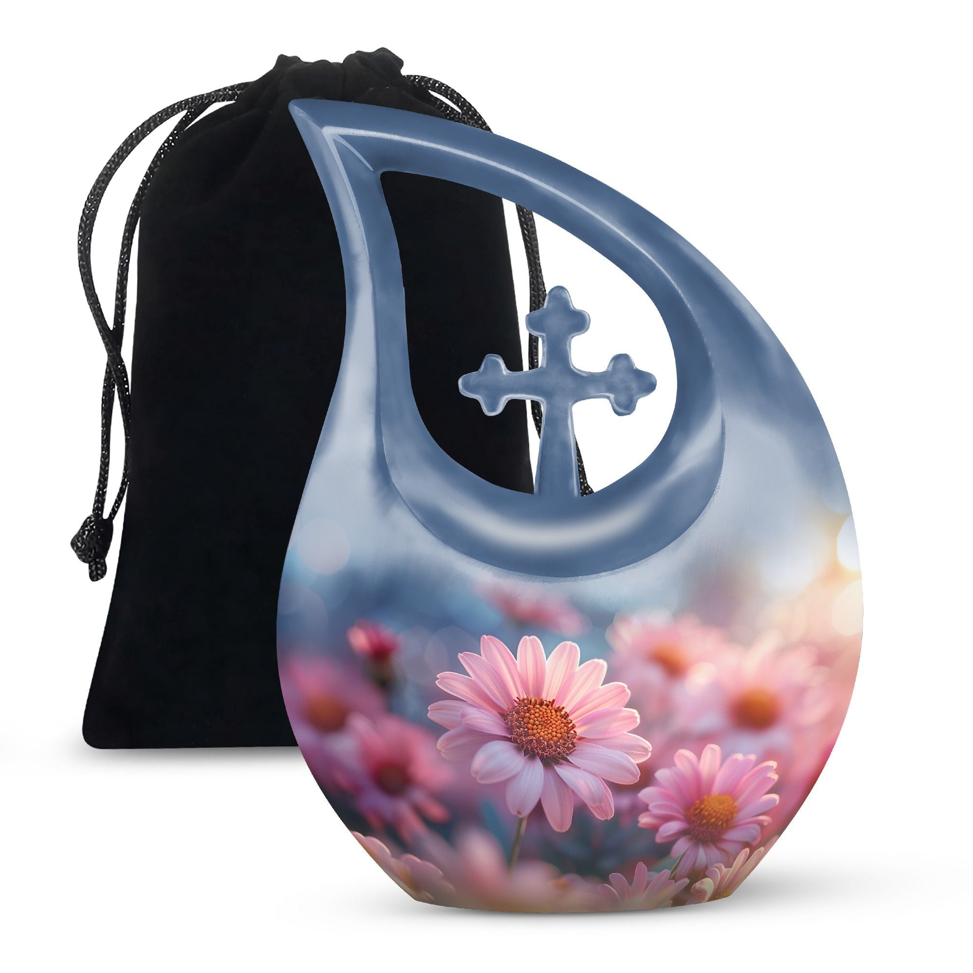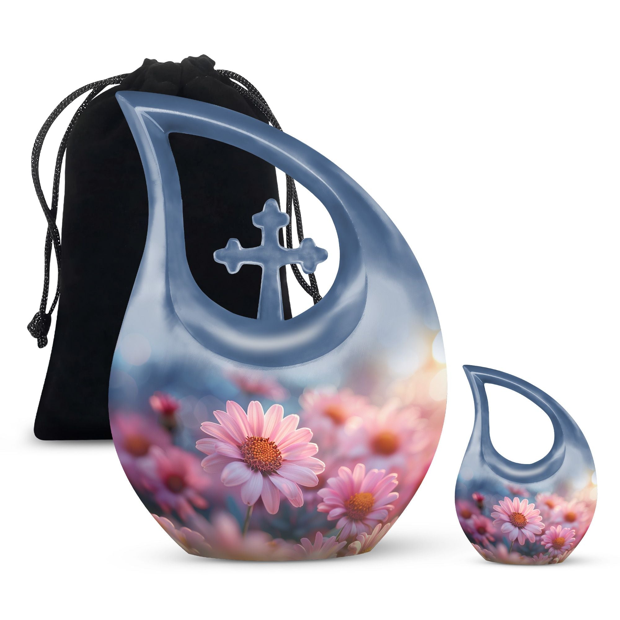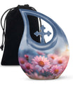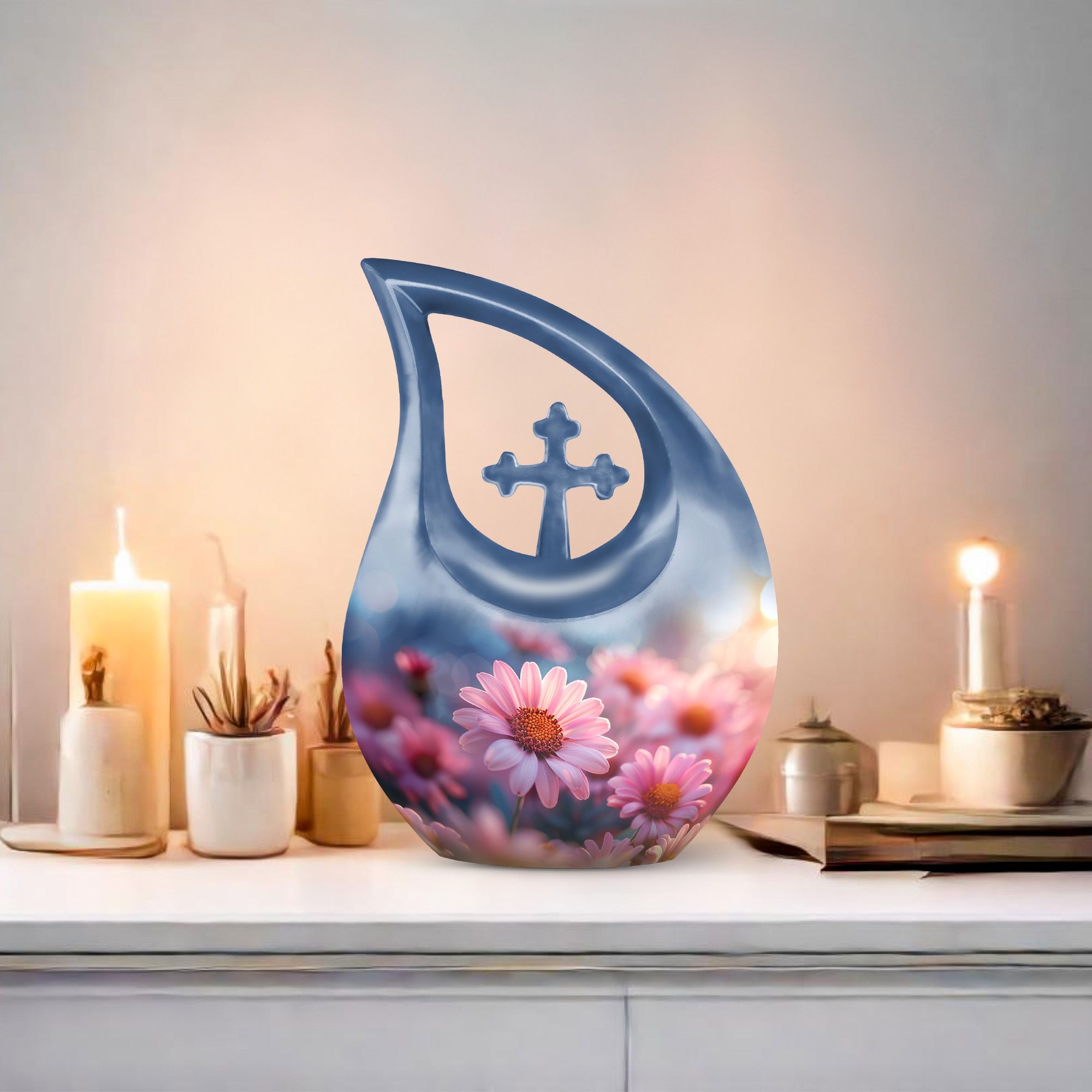 Cherish and honor your loved one's memory with 'The Blush Of Urn', a modern urn of thoughtful design. This 10-inch large urn is elegantly crafted from aluminium, offering both durability and grace. A touching memorial urn, it is adorned with the spiritual symbol, the Cross Drop, as its core theme. Its 200 cubic inch capacity ensures enough space for ashes while keeping the urn lightweight at only 3.3 pounds. Included in your package is a velvet pouch for respectful and discrete containment of the ashes. The product allows for customization; engrave your loved one's name to create an everlasting bond. Introducing this urn into your memorial ceremonies aids the healing process and allows for a serene and dignified tribute. Highly searched phrases such as 'Ashes Holders For Cremation', 'Burial Urns For Human Ashes', 'Small Urns For Ashes' and 'Urn For Father'S Ashes' are what makes the 'The Blush of Urn' the ideal choice when seeking modern urns.