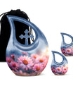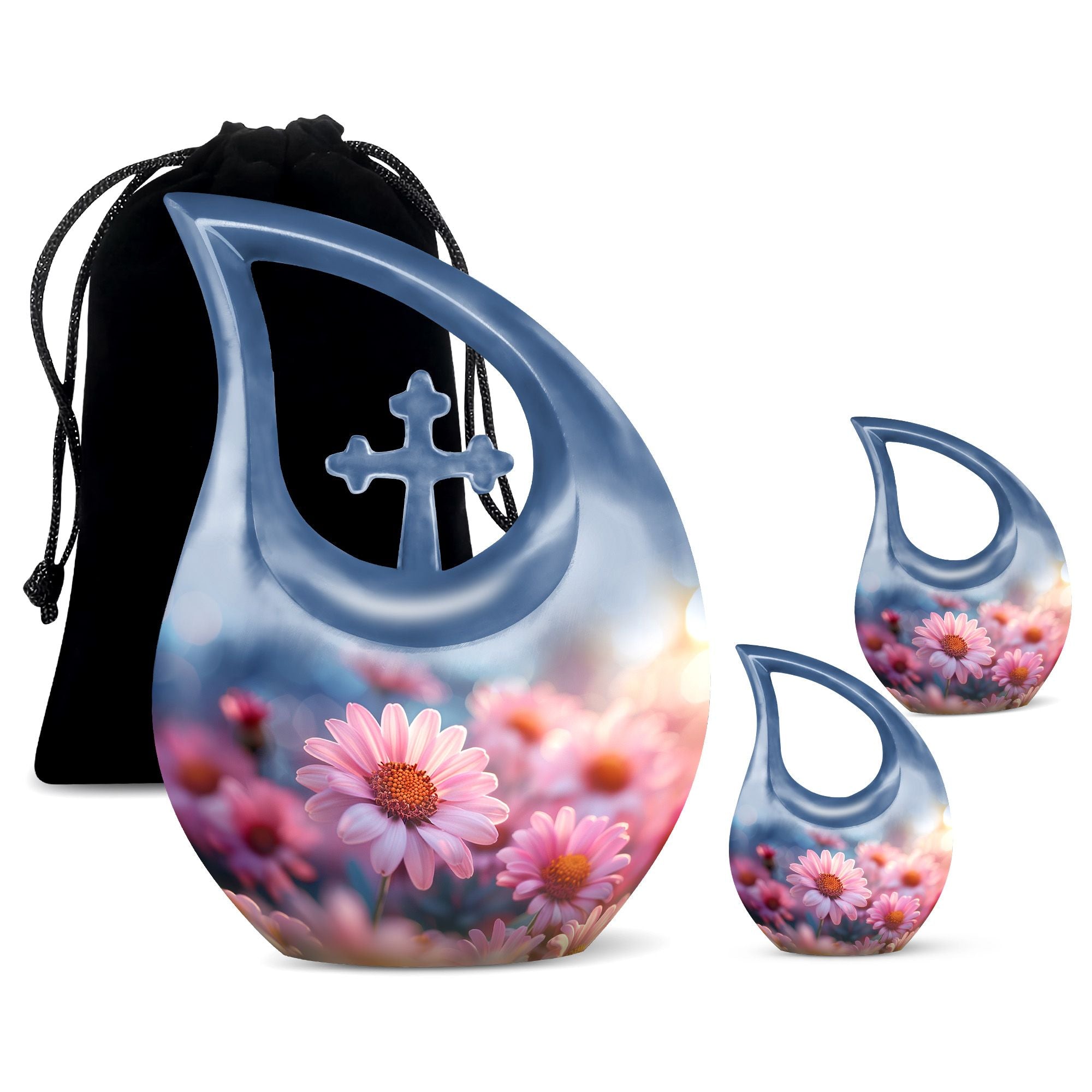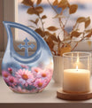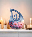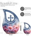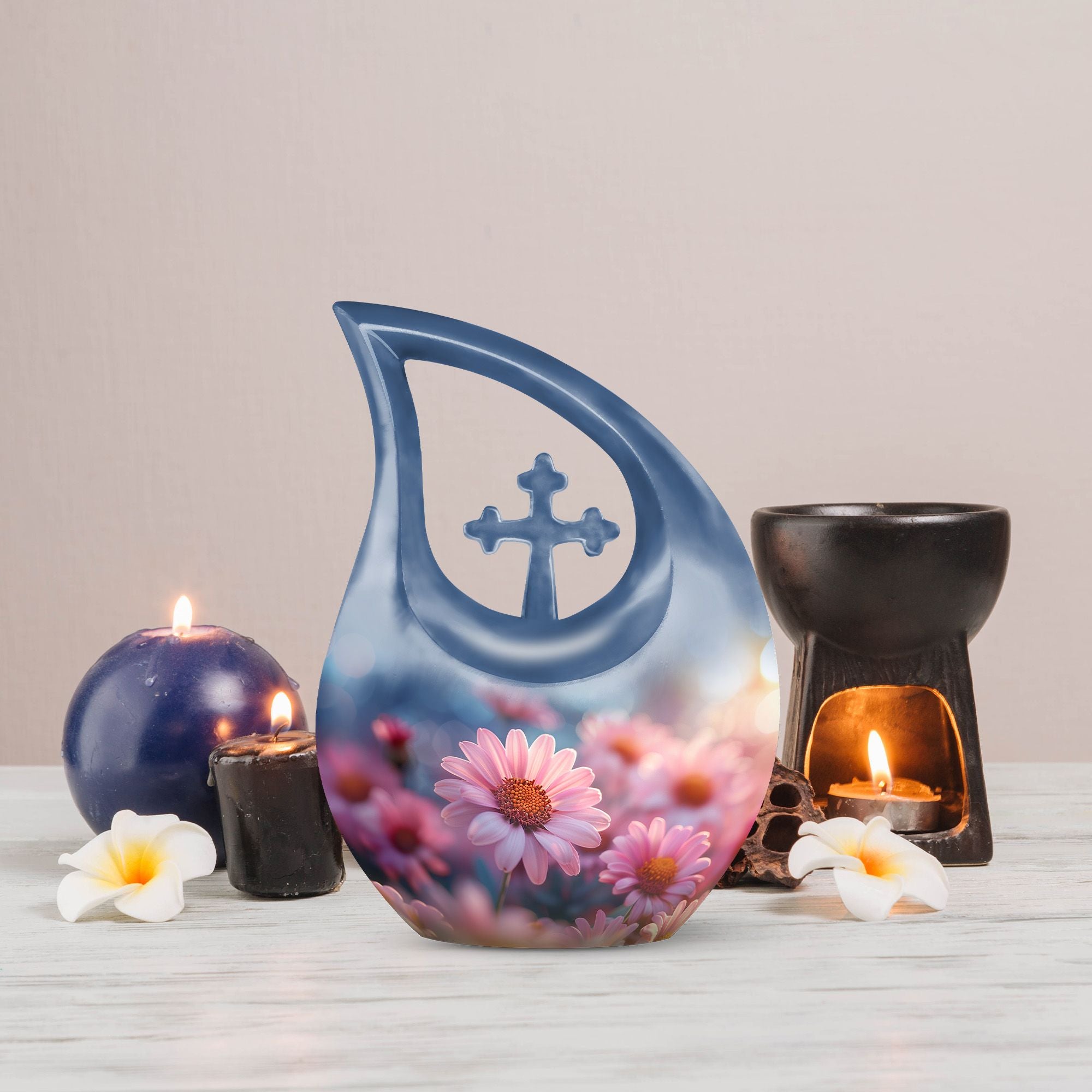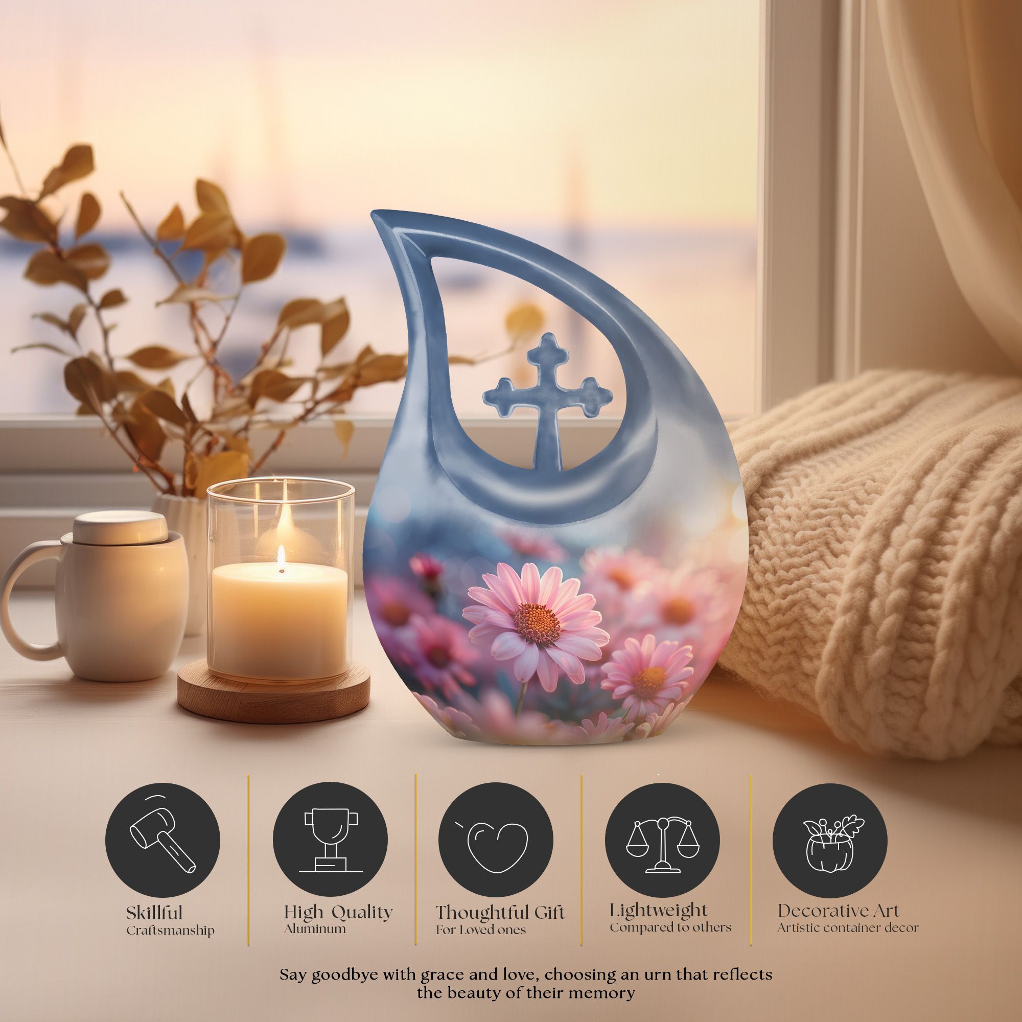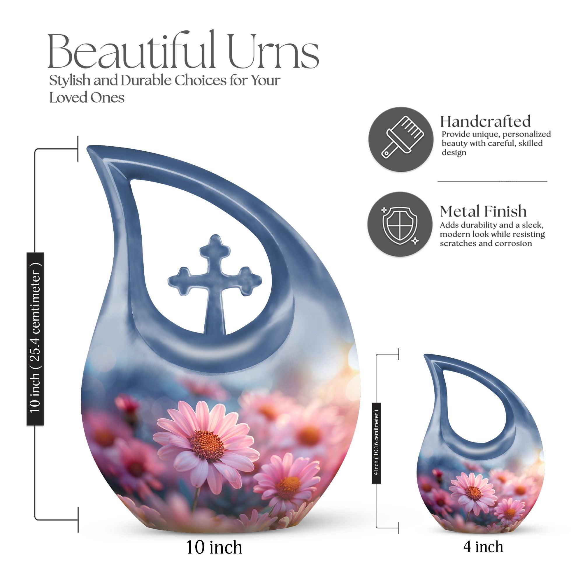 Cherish and honor your loved one's memory with 'The Blush Of Urn', a modern urn of thoughtful design. This 10-inch large urn is elegantly crafted from aluminium, offering both durability and grace. A touching memorial urn, it is adorned with the spiritual symbol, the Cross Drop, as its core theme. Its 200 cubic inch capacity ensures enough space for ashes while keeping the urn lightweight at only 3.3 pounds. Included in your package is a velvet pouch for respectful and discrete containment of the ashes. The product allows for customization; engrave your loved one's name to create an everlasting bond. Introducing this urn into your memorial ceremonies aids the healing process and allows for a serene and dignified tribute. Highly searched phrases such as 'Ashes Holders For Cremation', 'Burial Urns For Human Ashes', 'Small Urns For Ashes' and 'Urn For Father'S Ashes' are what makes the 'The Blush of Urn' the ideal choice when seeking modern urns.