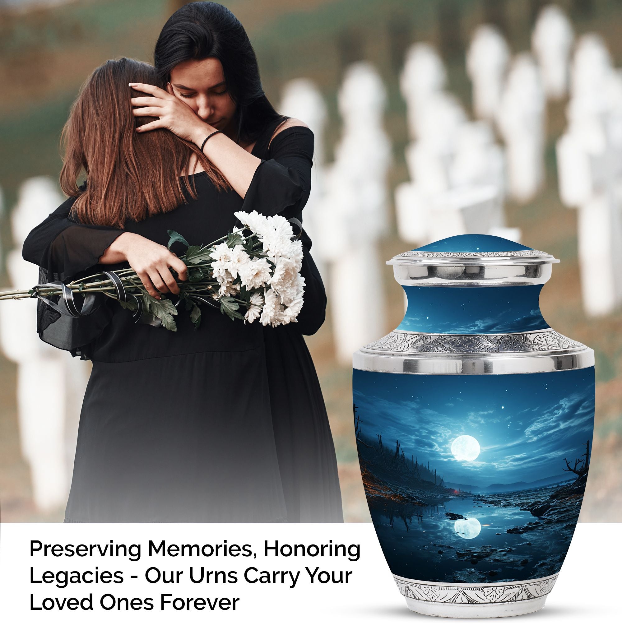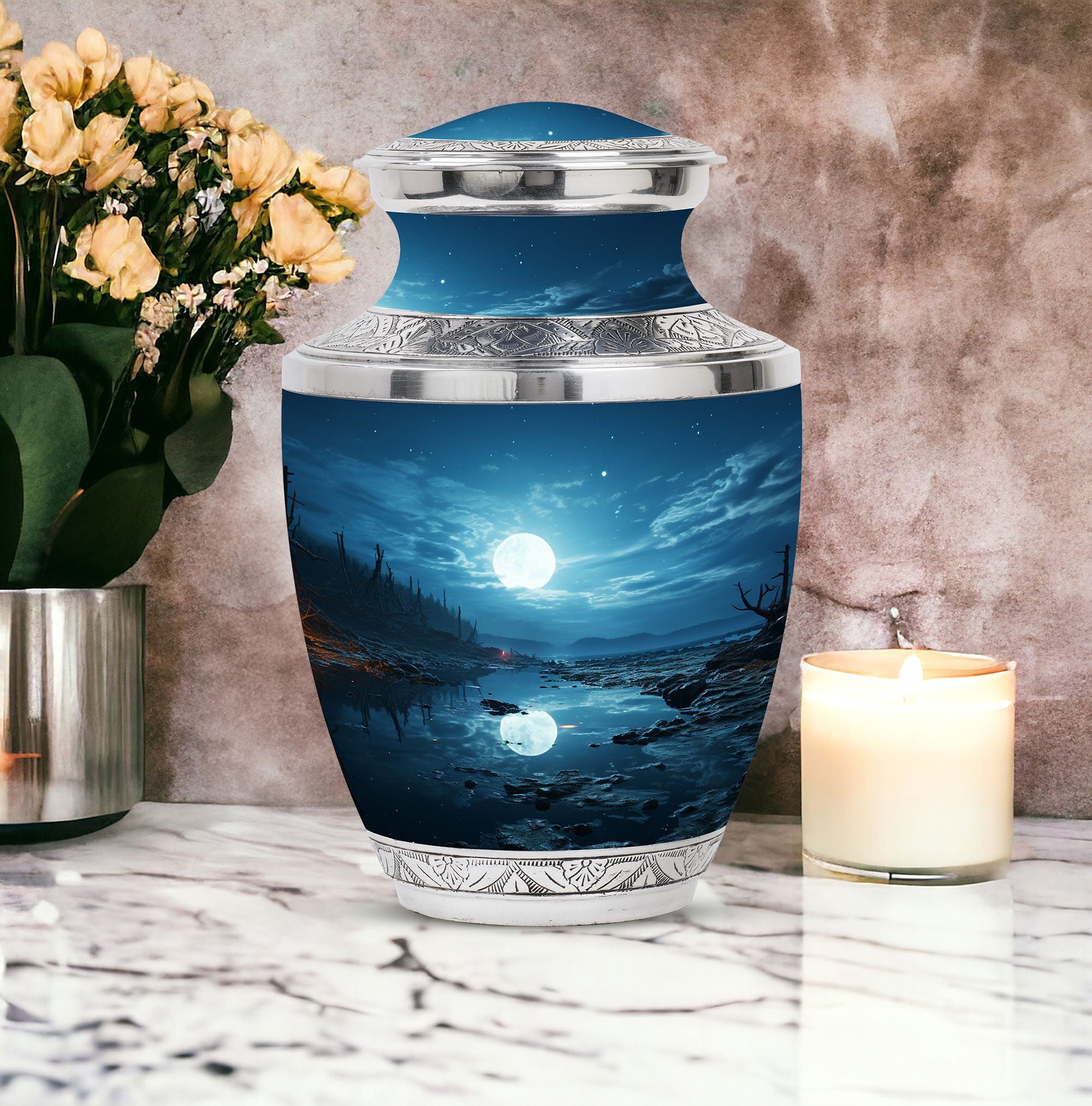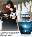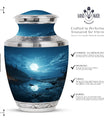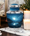Illuminate the memory of a loved one with our majestic Moon Urn, a sublime choice for those seeking blue urns for human ashes adorned with celestial mystique. Immaculately constructed to honor and remember beloved adult females, this resting piece offers more than just solace. It's a touch of grace, mirroring the eternal sky. With distinctive aesthetics and robust build, it also answers your need for medium urns for human ashes. Our Moon Urns are unique paeans to all personalities and resonate exceptionally well as cremation urns for men. Each urn is designed to pacify your longing and exemplify your love for those who are now unseen but forever felt. If your heart is on the search for burial urns for adult human ashes or specifically urns for cremation ashes of a mother, our Moon Urn offers a tender solace, a sanctum where love never fades but remains eternally vibrant.