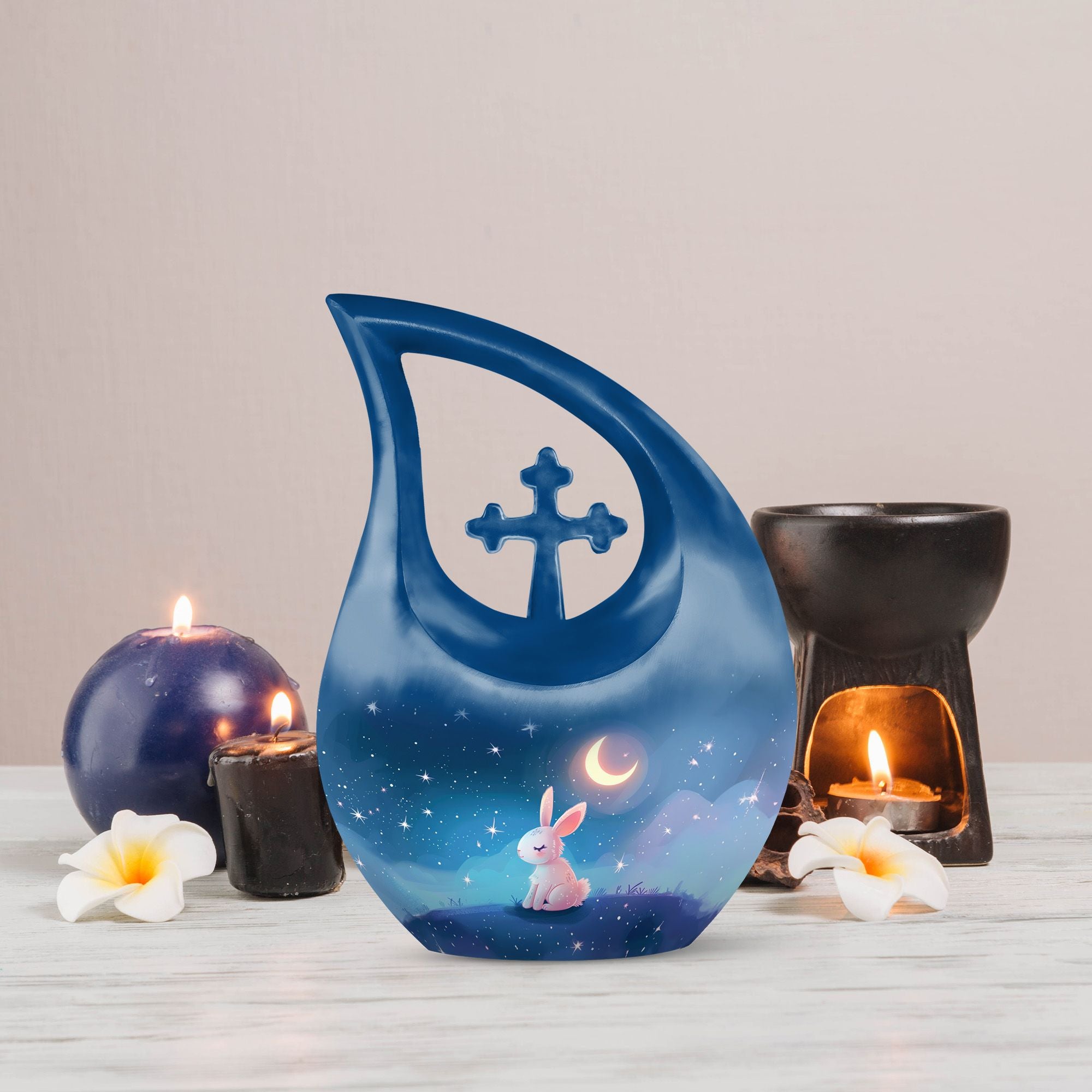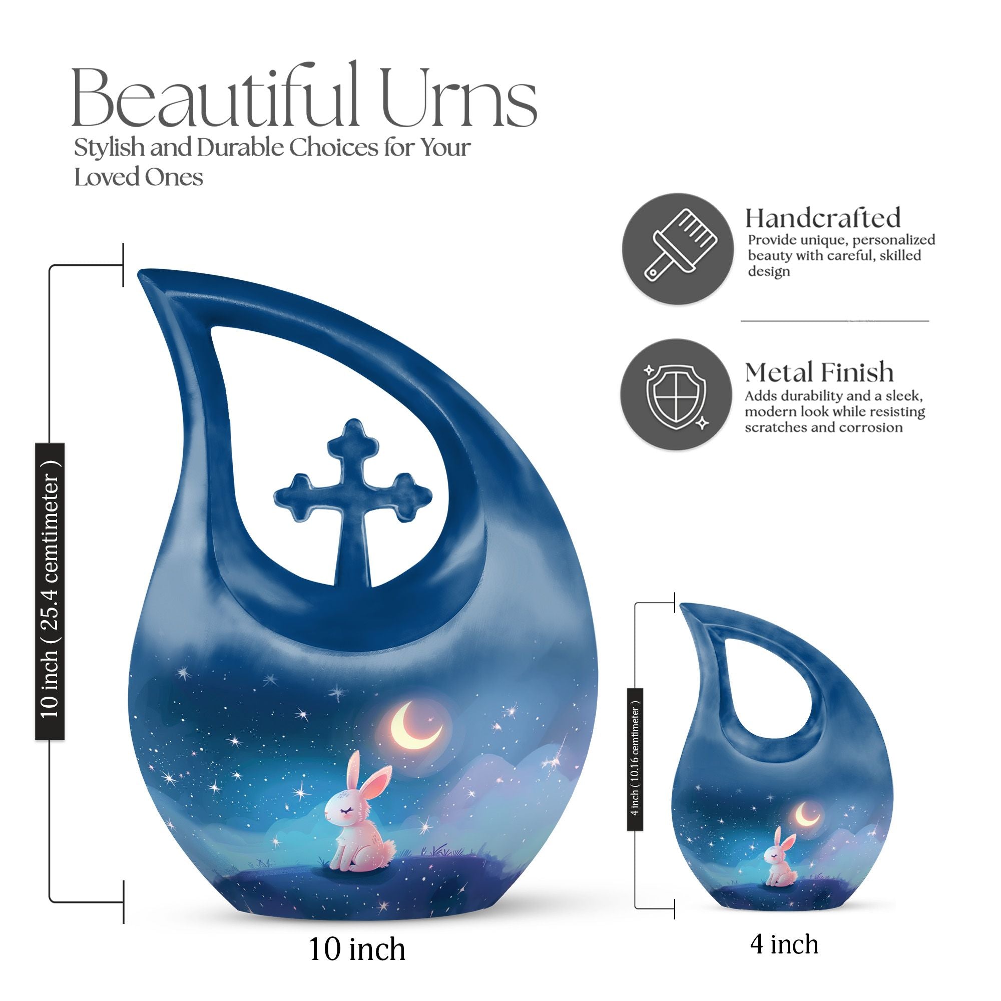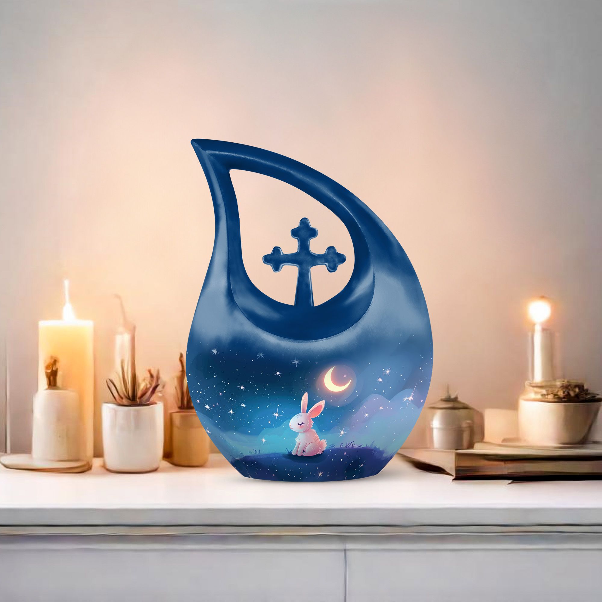 Step into the serene realm of a Moonlit Bunny Dreamscape with this beautifully rendered urn, designed exclusively for memorial ceremonies. Our Large Urn, standing at an impressive 10 inches tall, is a touching remembrance piece created to house the ashes of treasured loved ones. Crafted from distinguished Aluminium, this urn weighs 3.3 pounds and exhibits an elegant 'Cross Drop' theme, reflecting upon the tranquillity of moonlit nights and peaceful dreams. It can hold up to 200 cubic inches of ashes, easily contained and preserved in a complimentary velvet pouch included in the package. For an affectionately personalized touch, our urn allows for engraved names, further commemorating the memories that bind us to our dear departed. A tastefully decorative and intimate container for ashes, this cremation vase is an ideal choice for those seeking memorial urns that are both poetically designed and functionally superior. With elements such as the 'Moonlit Bunny Dreamscape' and 'Cross Drop', our urn personifies tranquillity, resilience and the eternal bond of love. Ideal for adult and senior individuals searching for personalized, beautifully themed urns.