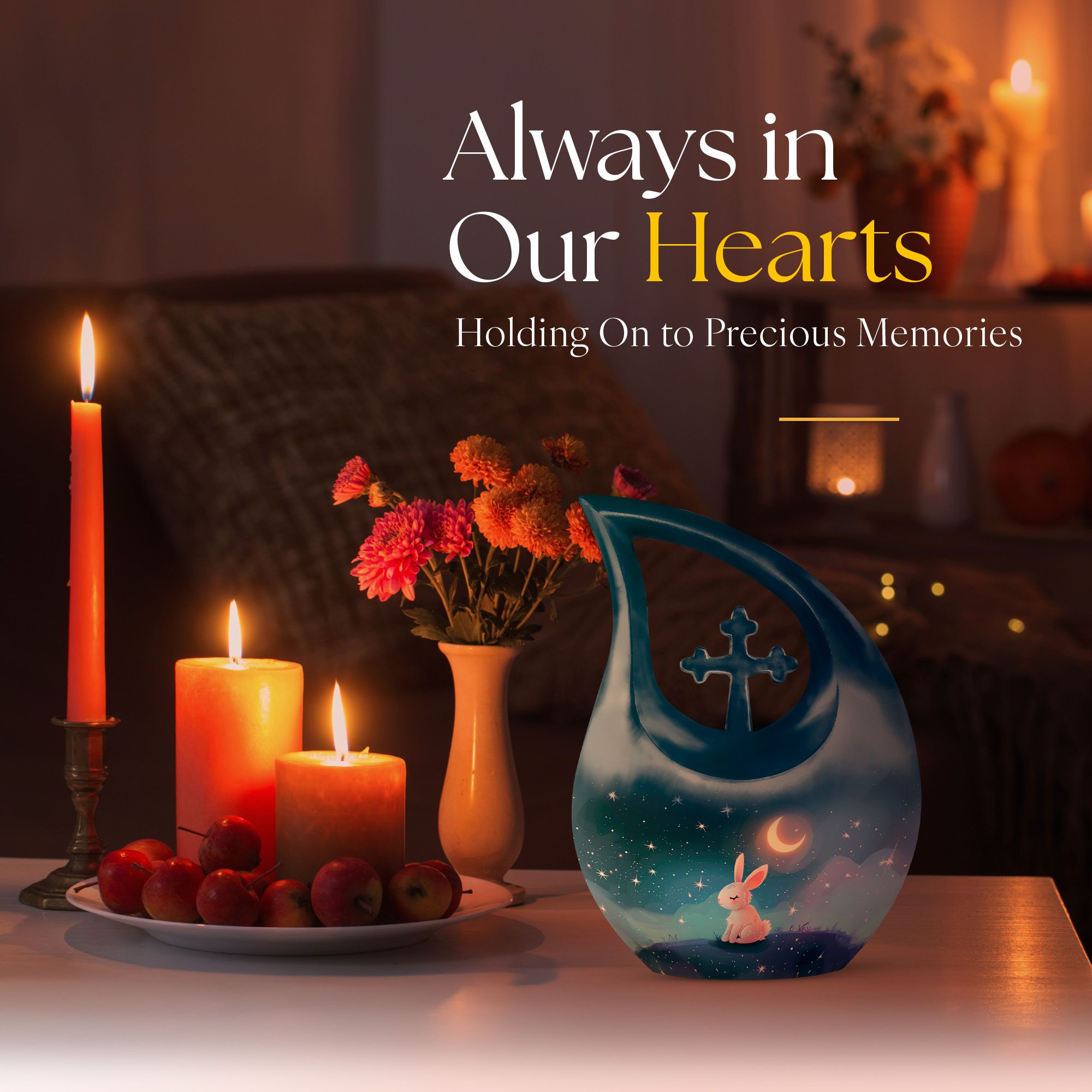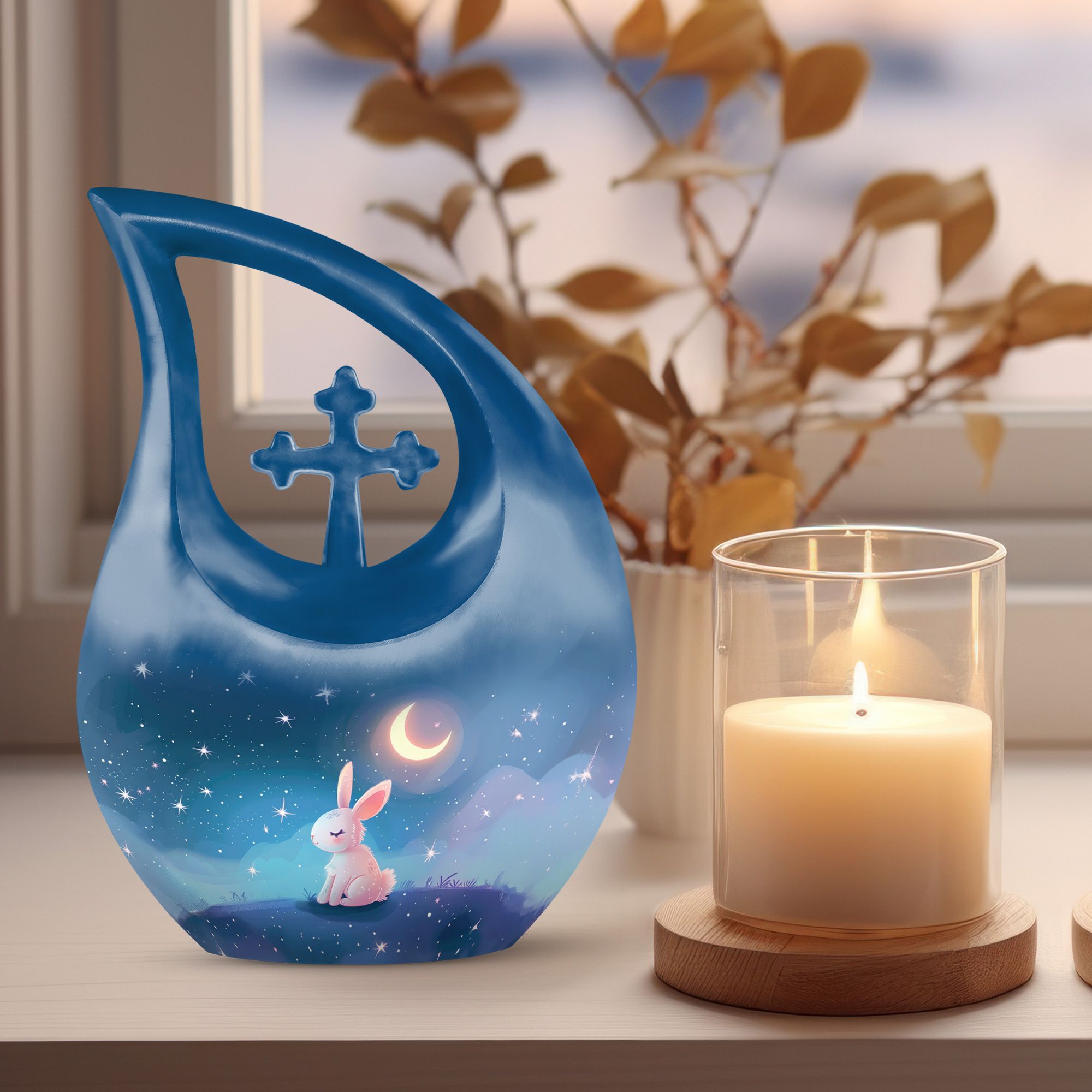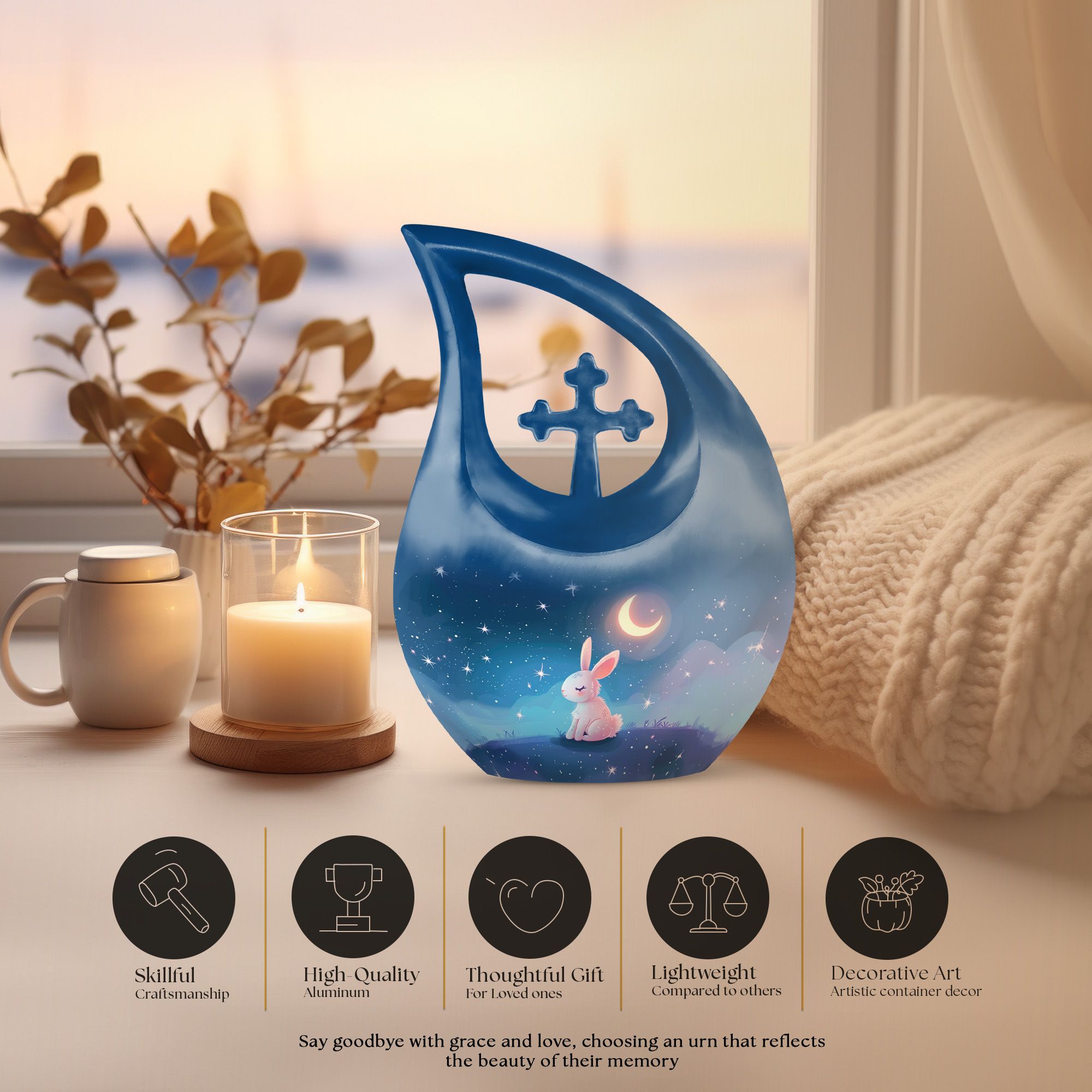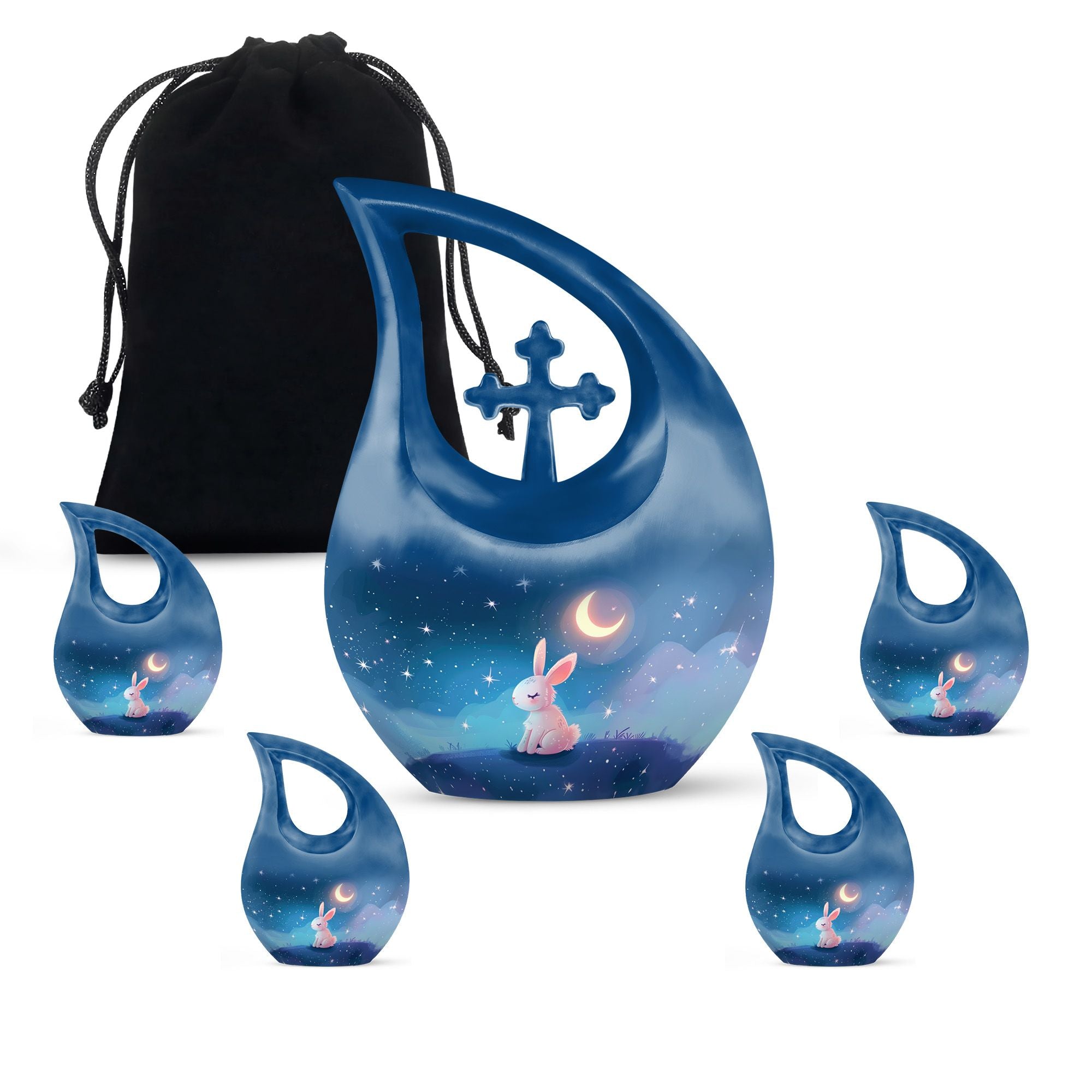 Step into the serene realm of a Moonlit Bunny Dreamscape with this beautifully rendered urn, designed exclusively for memorial ceremonies. Our Large Urn, standing at an impressive 10 inches tall, is a touching remembrance piece created to house the ashes of treasured loved ones. Crafted from distinguished Aluminium, this urn weighs 3.3 pounds and exhibits an elegant 'Cross Drop' theme, reflecting upon the tranquillity of moonlit nights and peaceful dreams. It can hold up to 200 cubic inches of ashes, easily contained and preserved in a complimentary velvet pouch included in the package. For an affectionately personalized touch, our urn allows for engraved names, further commemorating the memories that bind us to our dear departed. A tastefully decorative and intimate container for ashes, this cremation vase is an ideal choice for those seeking memorial urns that are both poetically designed and functionally superior. With elements such as the 'Moonlit Bunny Dreamscape' and 'Cross Drop', our urn personifies tranquillity, resilience and the eternal bond of love. Ideal for adult and senior individuals searching for personalized, beautifully themed urns.