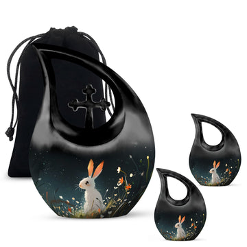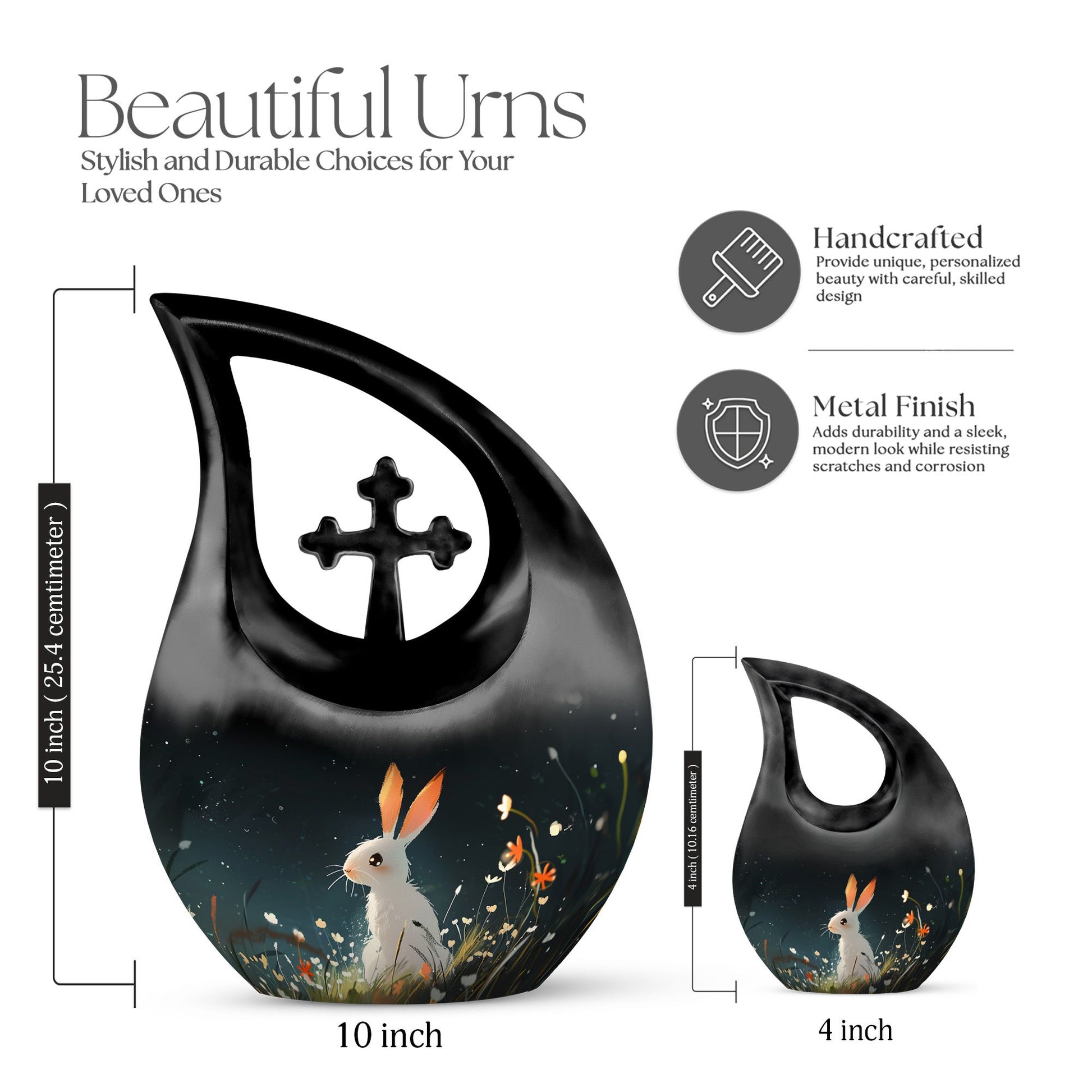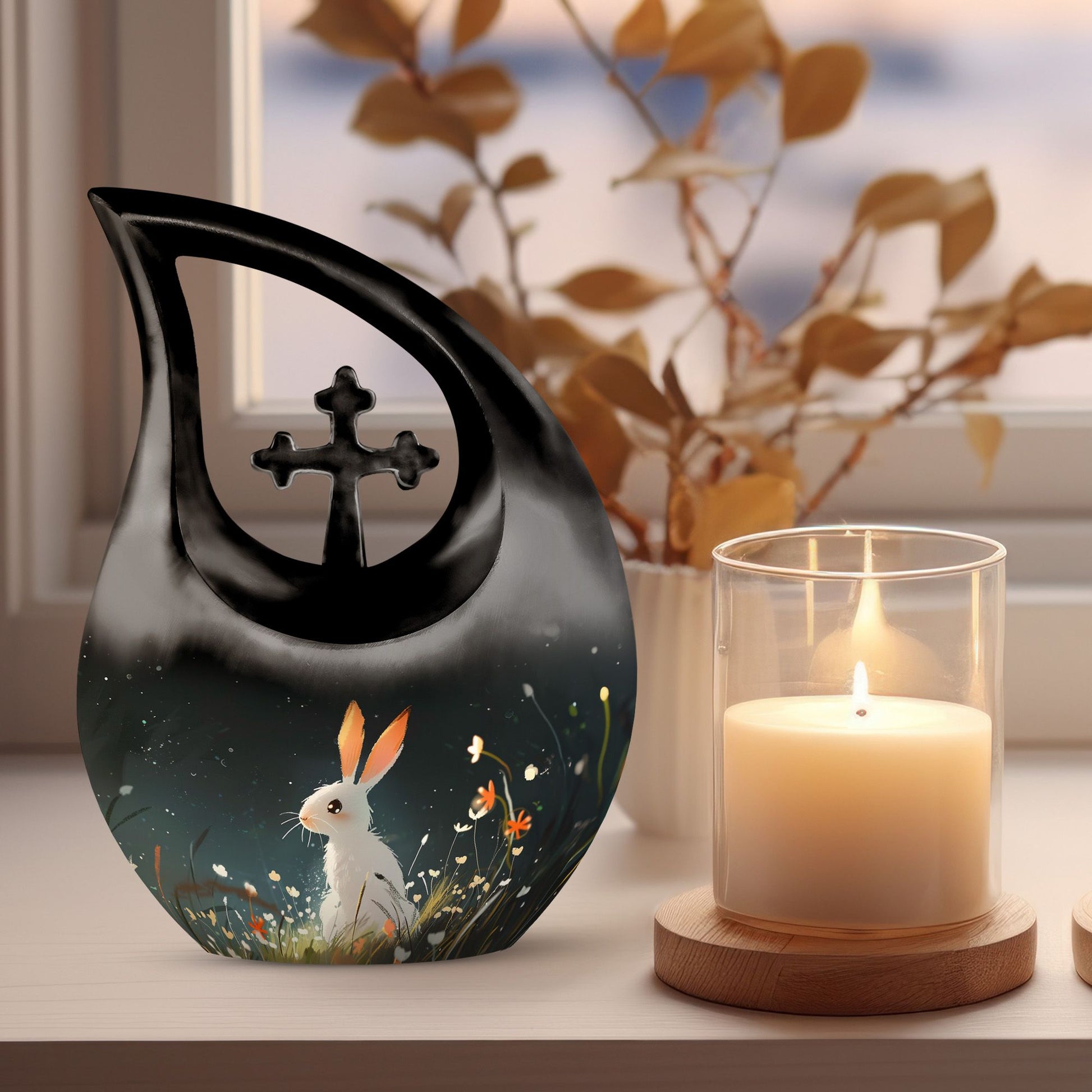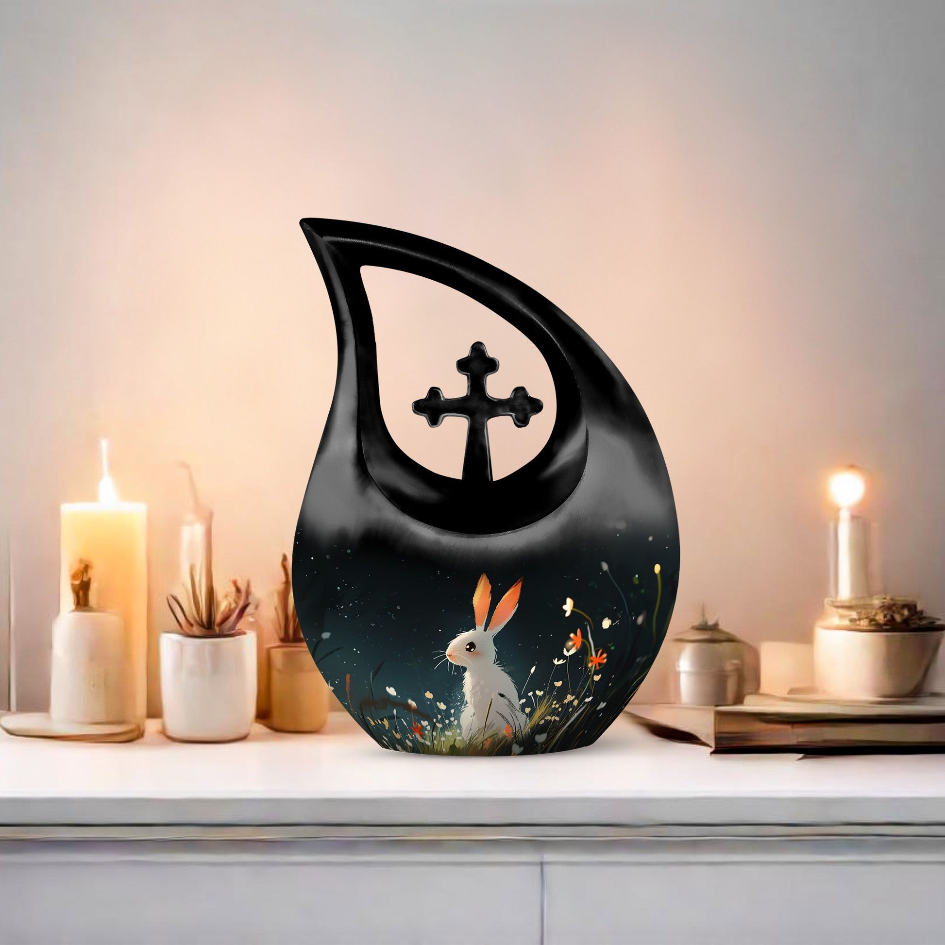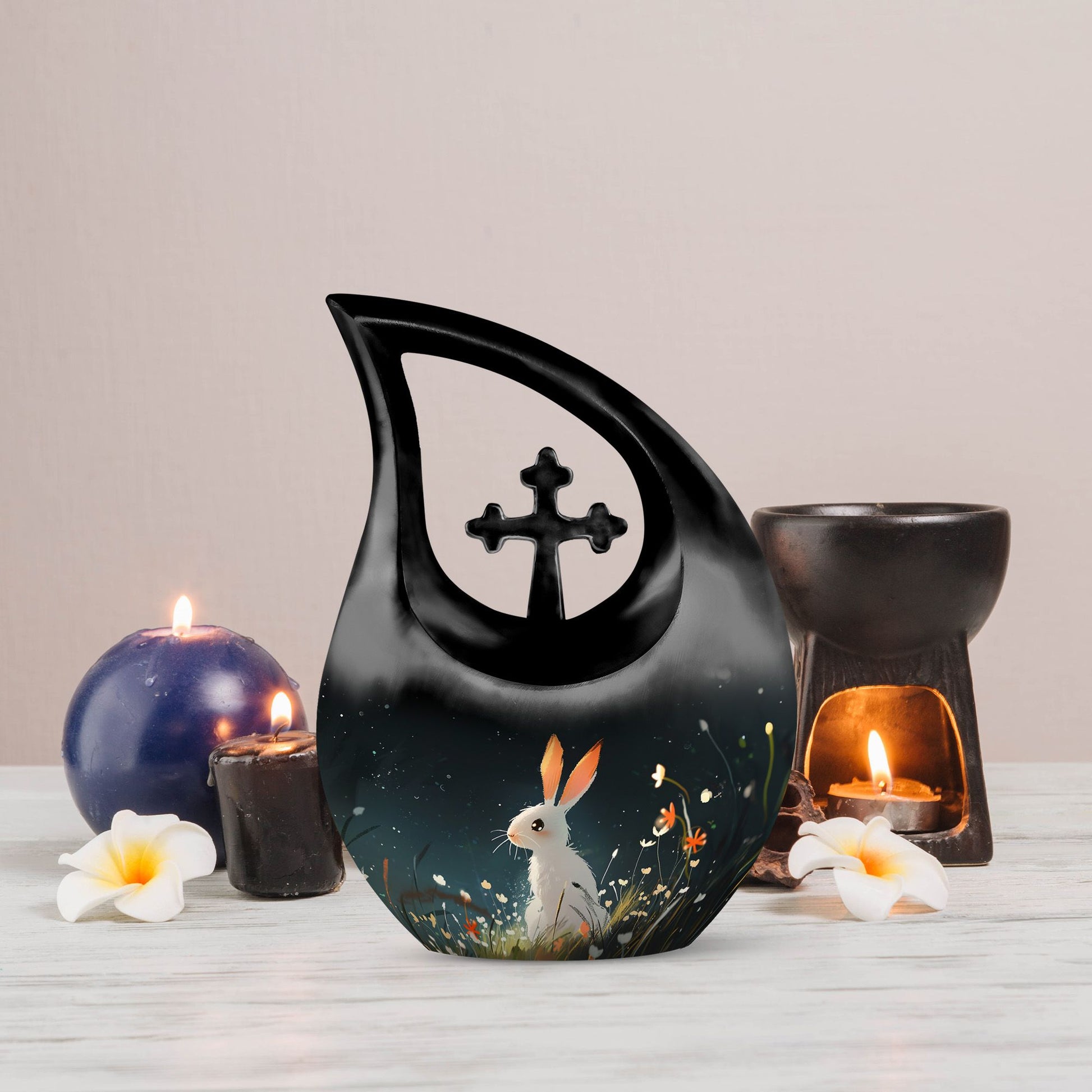 Preserve the memory of your beloved husband with our Moonlit Meadow Bunny Urn. This thoughtful piece, acting as a peaceful resting place, transcends the ordinary. Crafted meticulously from high-quality Aluminium, the urn can hold up to 200 cubic inches of ashes, ideal for large urn requirements. Standing at a stately height of 10 inches and lovingly weighing 3.3 pounds, this urn's design originates from a visually touching 'Cross Drop' theme; offering a timeless representation of love and devotion. Personalize this unique memorial urn to give an intimate touch; engrave a name or a significant date. This urn comes secured with a velvet pouch to comfortably contain the ashes. Serving as a gentle reminder of the eternal bond shared, it is a heartfelt combination of comfort and class, suited for memorial ceremonies. Ring as a poignant beacon of cherished memories and immense love. Not your ordinary Cremation Urns, or those small urns found around; step into sophistication and honor your loved one's memory.