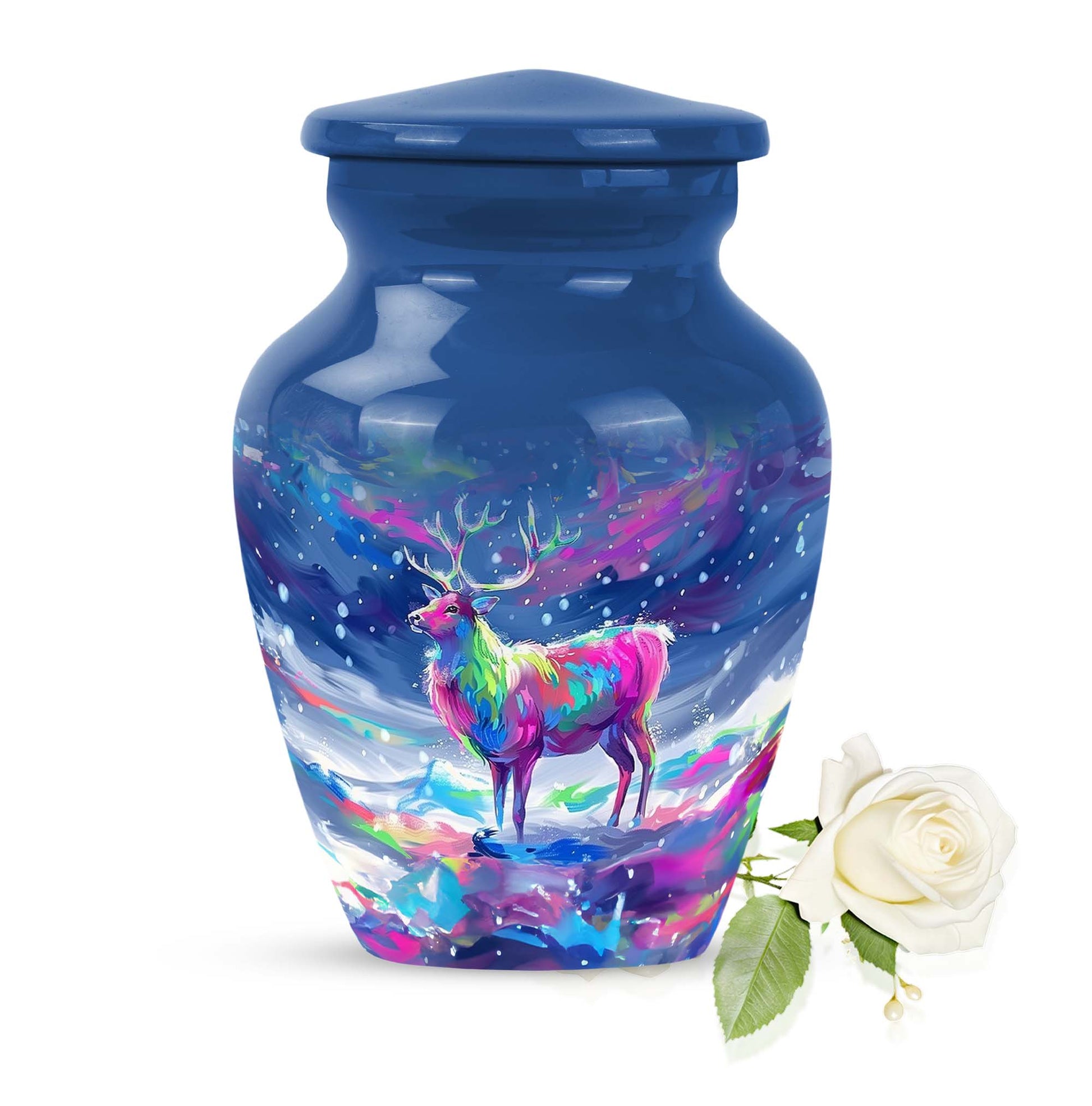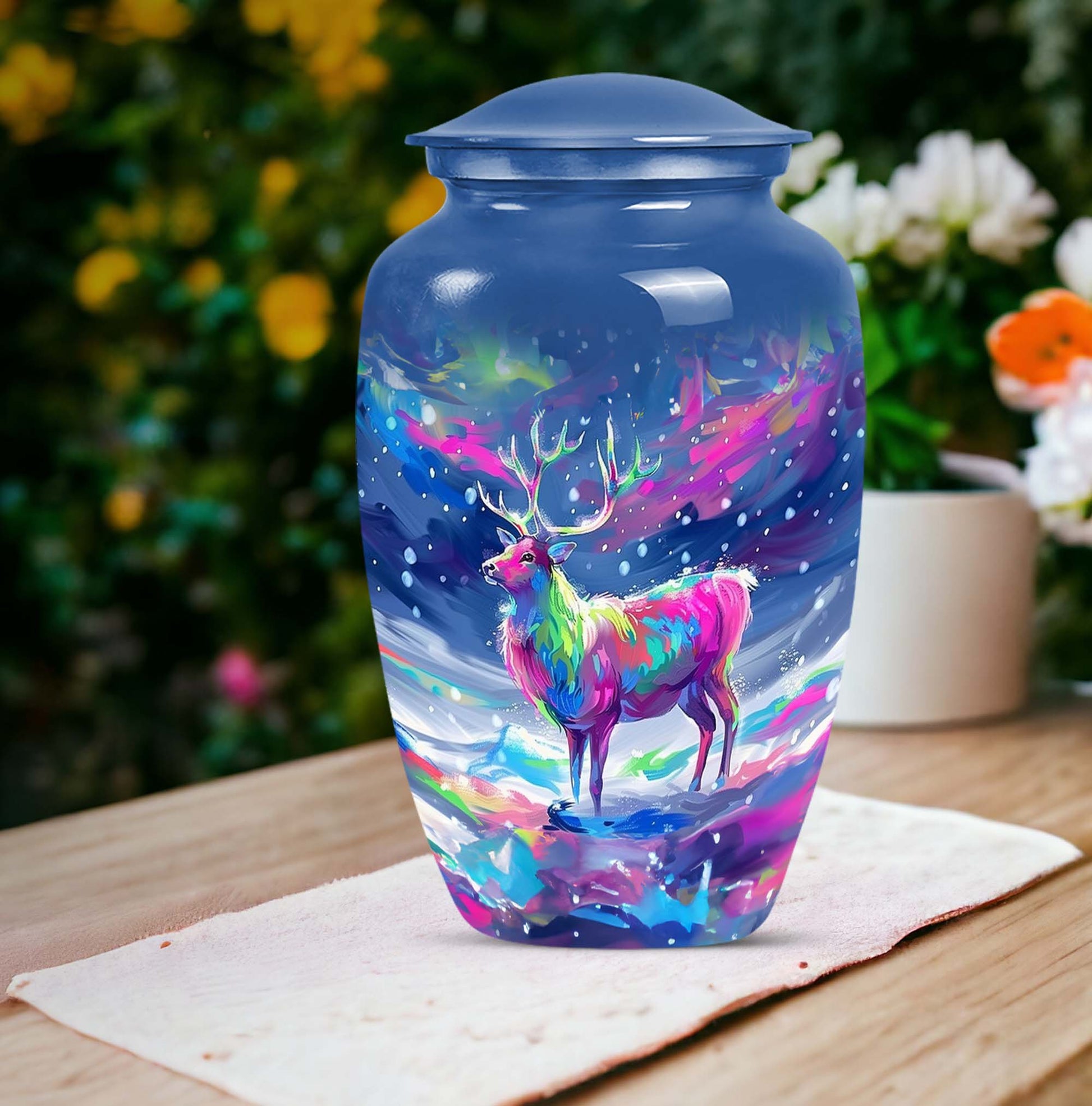 Meet our remarkable moose walking urn, exuding a timeless and abstract theme. This unique piece serves as a memorial funeral urn, a perfect resting place for your loved ones. With a size of 10 inches, this large urn adds an unprecedented depth of emotion and respect to a memorial ceremony. It's made from premium quality aluminium, ensuring durability and a lasting legacy. The urn weighs a substantial 3.3 pounds and carries a capacity of 200 cubic inches, adequately accommodating the ashes. Adding to its uniqueness, the urn allows for personalization; engraved names can be added for that personalized touch. Each purchase includes a velvet pouch for dignified containment of ashes. Designed with meticulous detail, this urn is not just a receptacle but a symbol of love and memory. You would be hard-pressed to find a cremation urn that combines style, function, and sentiment as compellingly as this. Notably, these funeral urns for burial, and urns for human ashes make a fitting tribute to anyone’s final disposition journey, and especially befitting for a mom cremation urn.