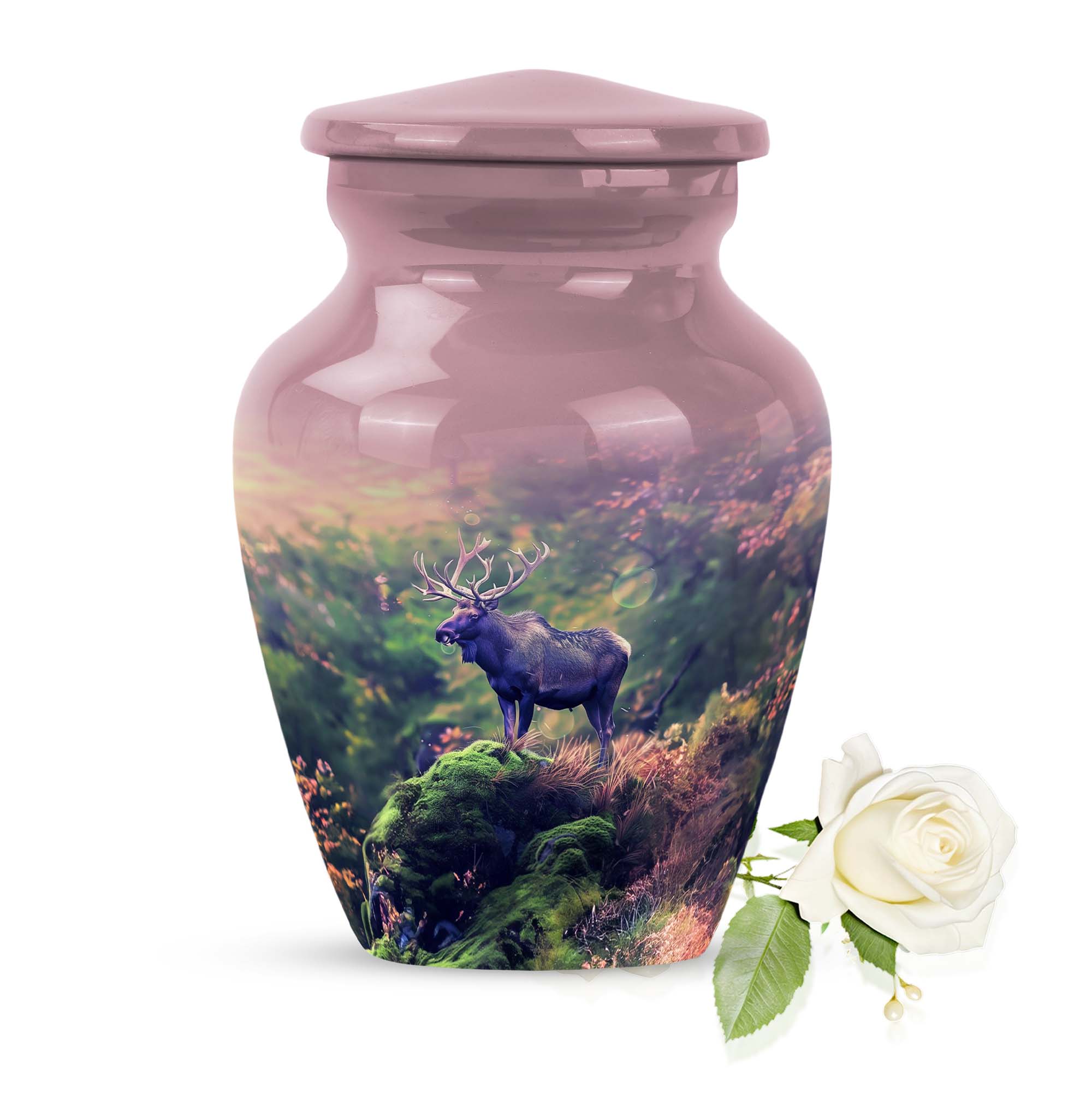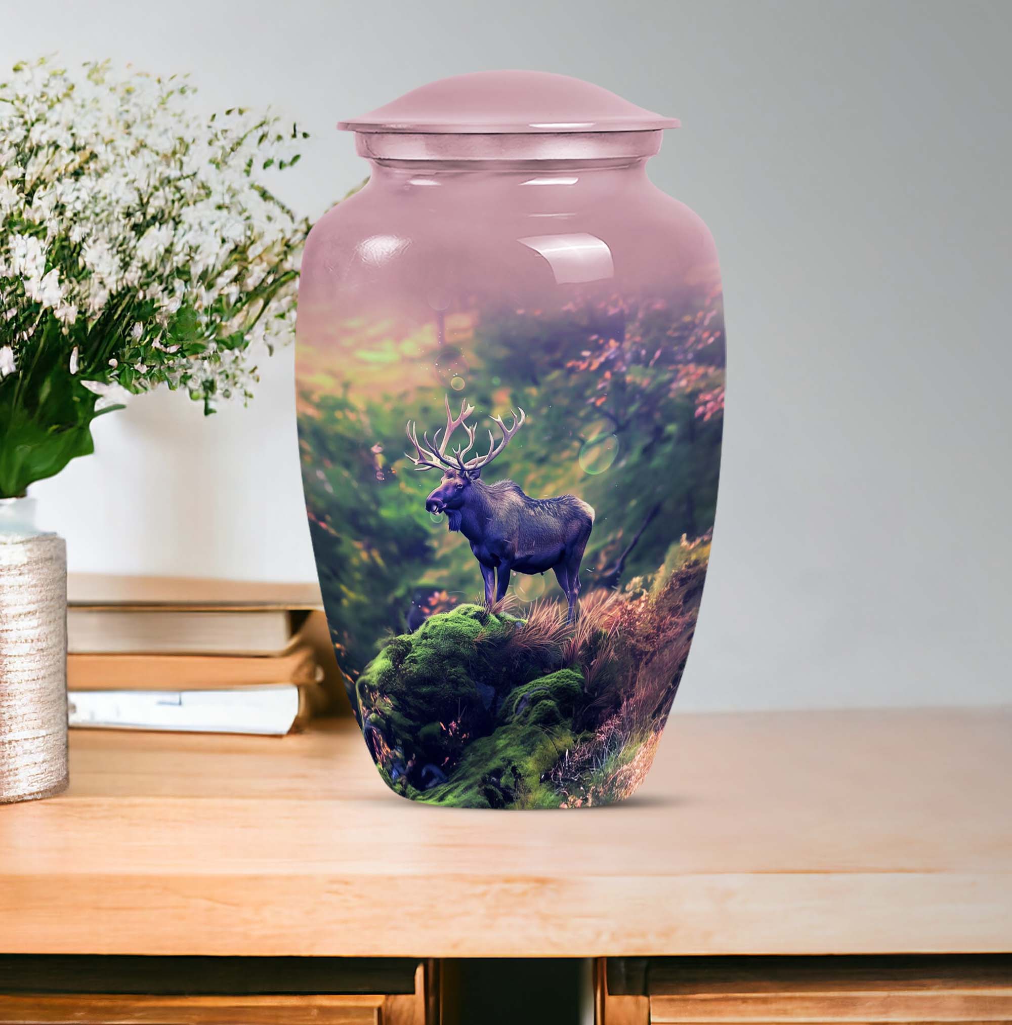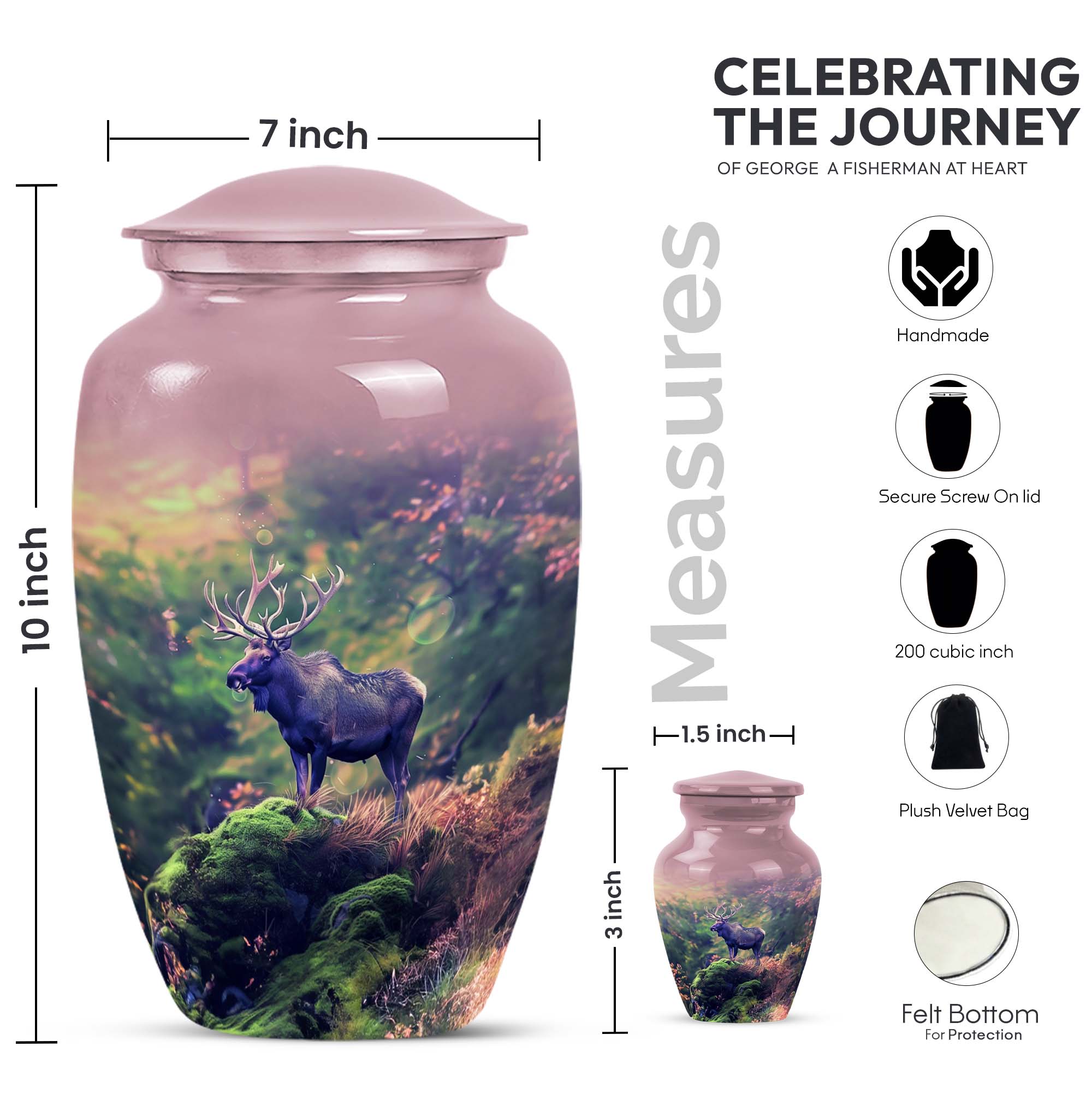 Uplift your space while cherishing the memories of a loved one with our Moose Walking Urn. This cremation memorial urn for human ashes is not just a container, but a symbol of reverence and love. Crafted from premium aluminium, this urn exhibits timeless elegance with its Classic Urn structure. It weighs a modest 3.3 pounds with dimensions comfortably measuring 10 inches in height. The urn is spacious with a capacity to securely hold 200 cubic inches of ashes. It comes as a complete package with a specially designed velvet pouch to store the ashes. The urn's abstract theme infuses an artistic appeal into its design. Further, it offers a personal touch with its customizable feature. You can engrave names on it, making it even more unique and meaningful. This large urn caters to men and women alike, and is an ideal selection for those seeking sophisticated memorial urns or cremation urns. This urn rise above the commonplace options and is a symbol of distinctive taste. Remember your loved ones in style and peace with our Moose Walking Urn.