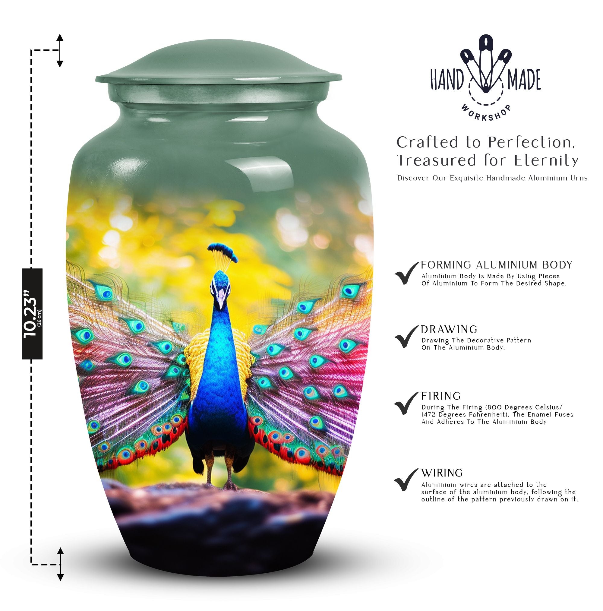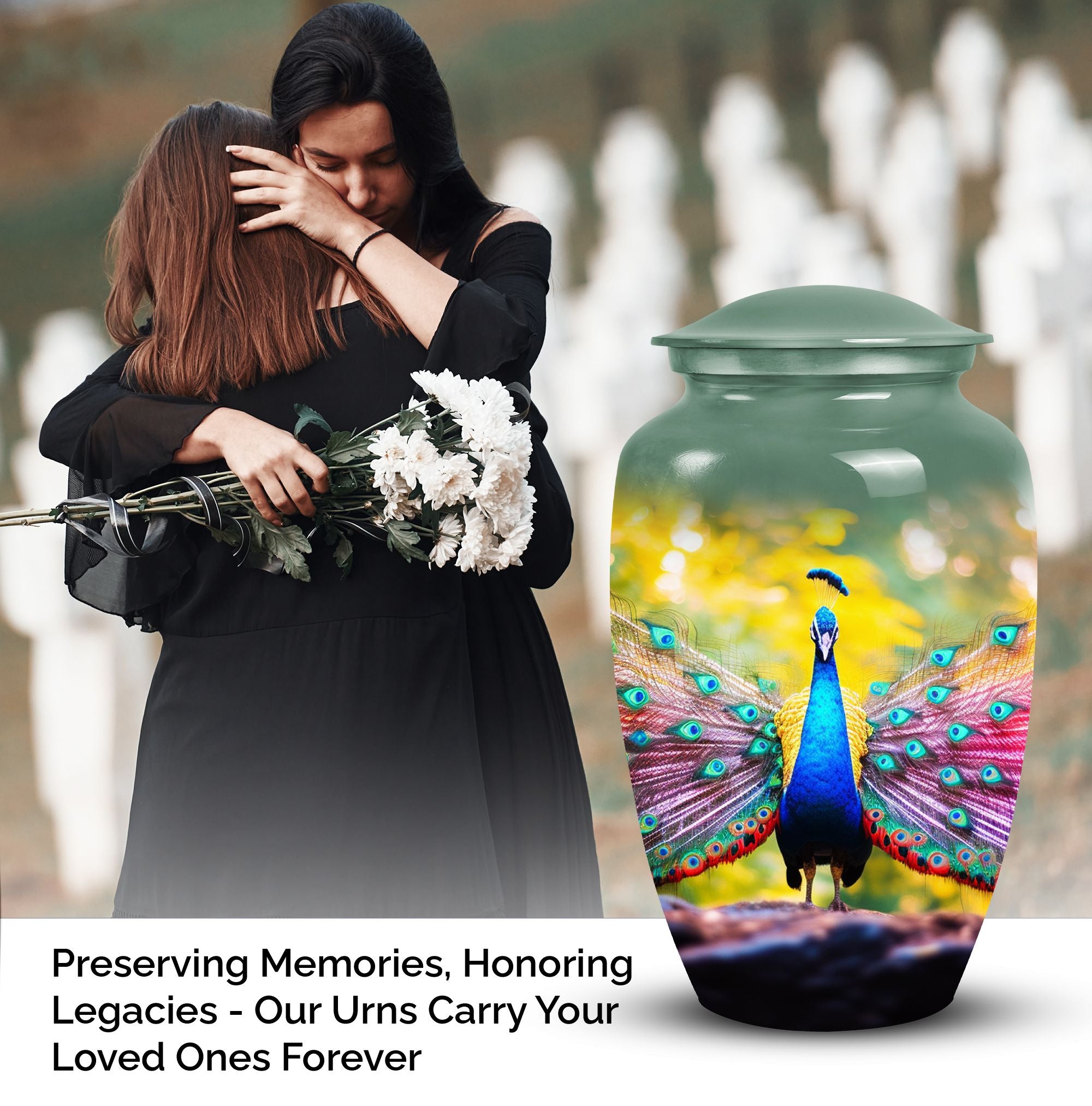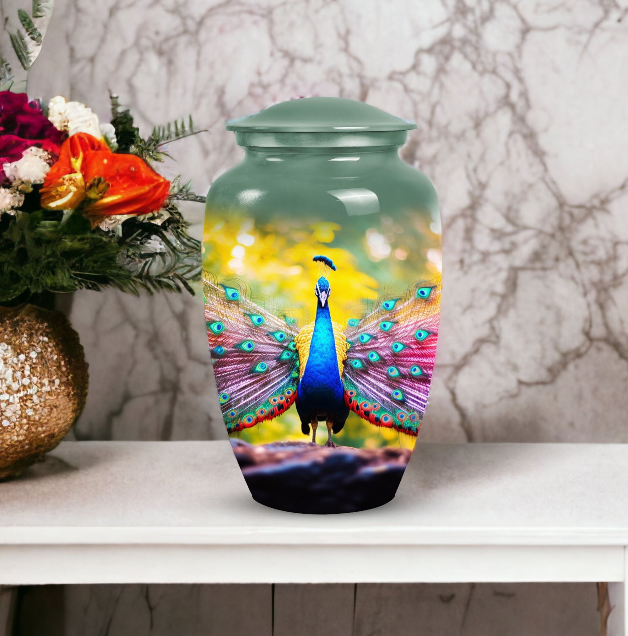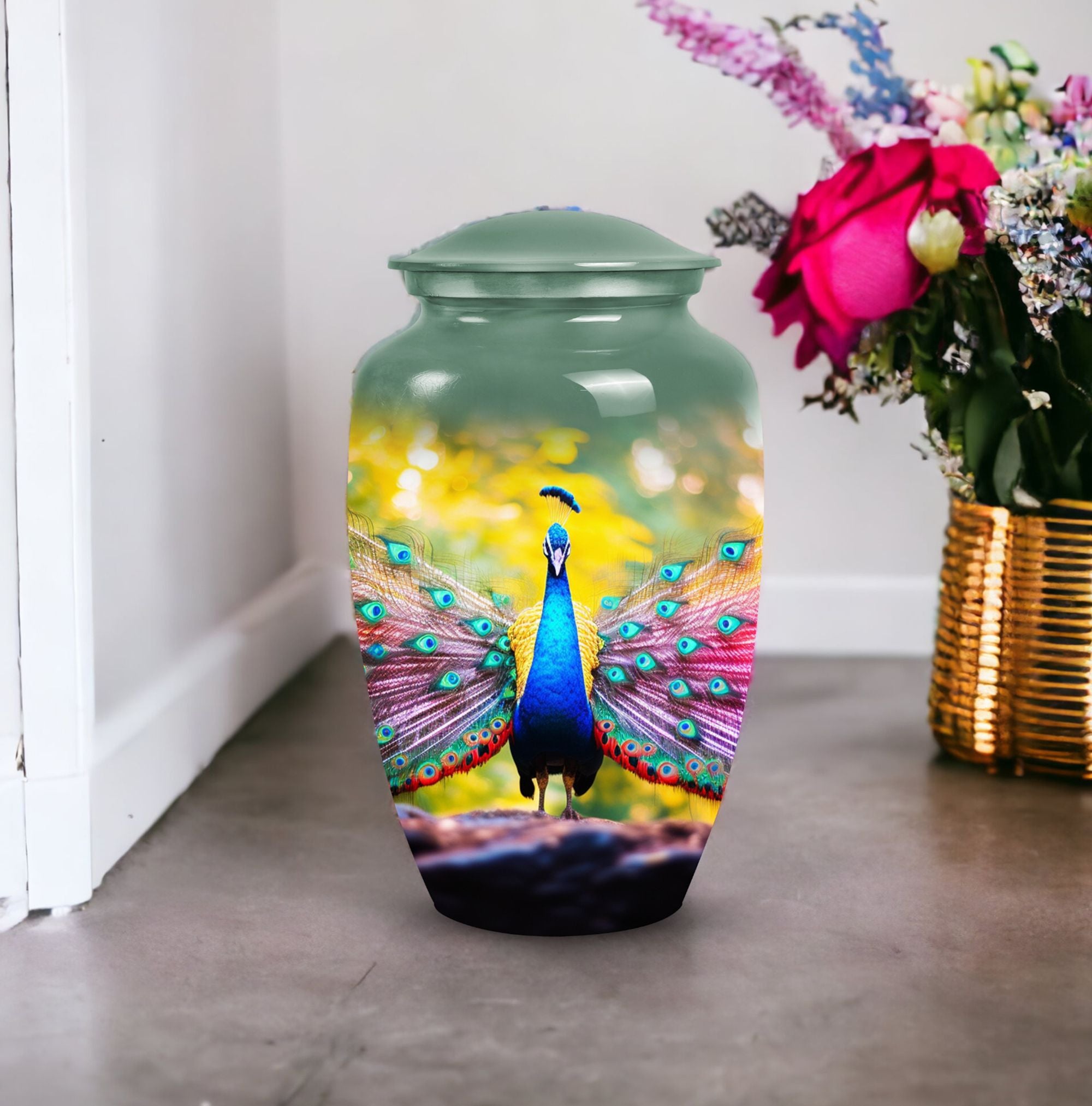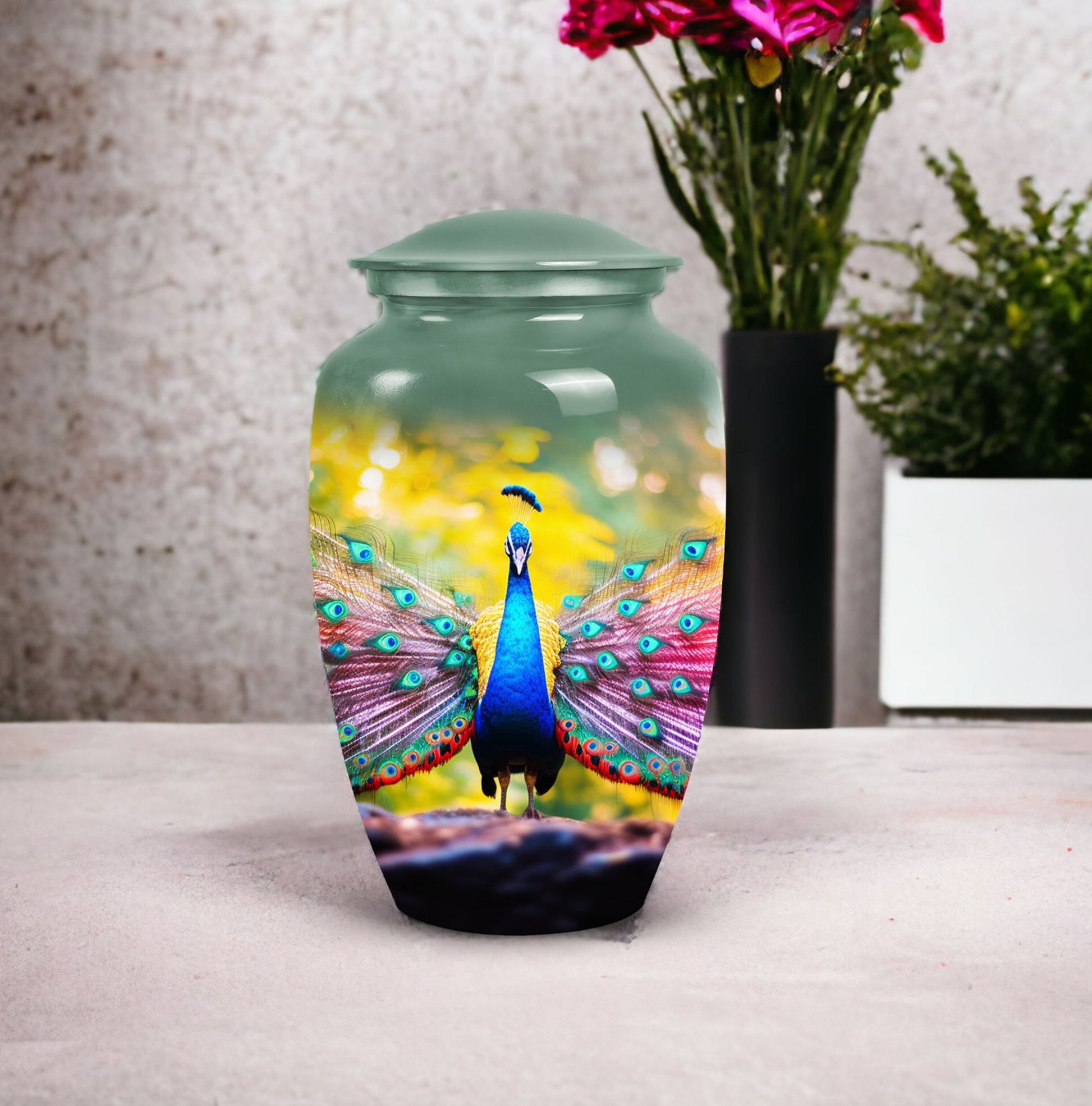 Discover the exquisite craftsmanship of our peacock cremation urns - a beautiful and poignant way to commemorate a treasured life. Perfect for both men and women, these urnas para cenizas humanas adultos are a testament to the enduring nature of memory. A sterling expression of love, these memorial urns cradle the earthly remains of your loved ones, secure within their silken embrace. Featuring a vibrant mosaic motif that echoes the iridescence of a peacock's plumage, these urns radiate the individuality and spirit of the departed. These urns for human ashes, designed for adults, fuse elegance with practicality, providing a fitting tribute to a cherished life. Designed for those seeking something different than traditional cremation urns, these mosaic urns have a strikingly distinctive character that appeals both for their beauty and symbolic significances. The urns offer a meaningful way to remember and honor your loved ones. Cherish the memory of those departed with our specialized urns for women human ashes. Rest assured, this cherished artefact matches the dignity of the occasion it represents as these urns are designed with the utmost respect for the ceremonial proceedings.