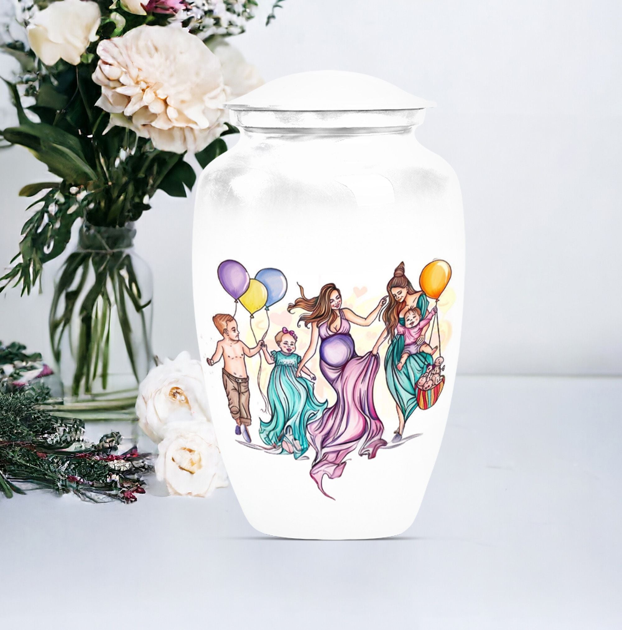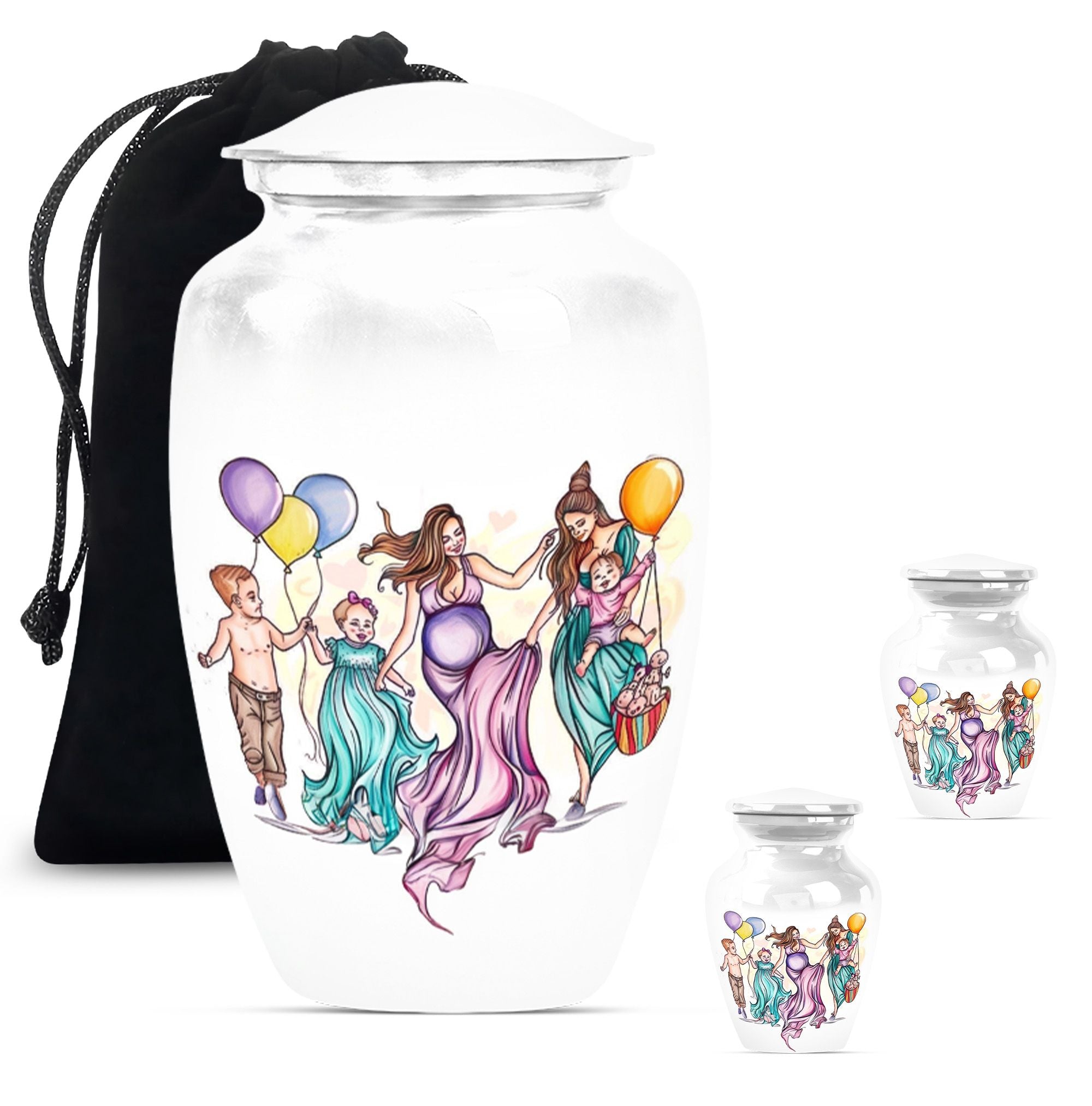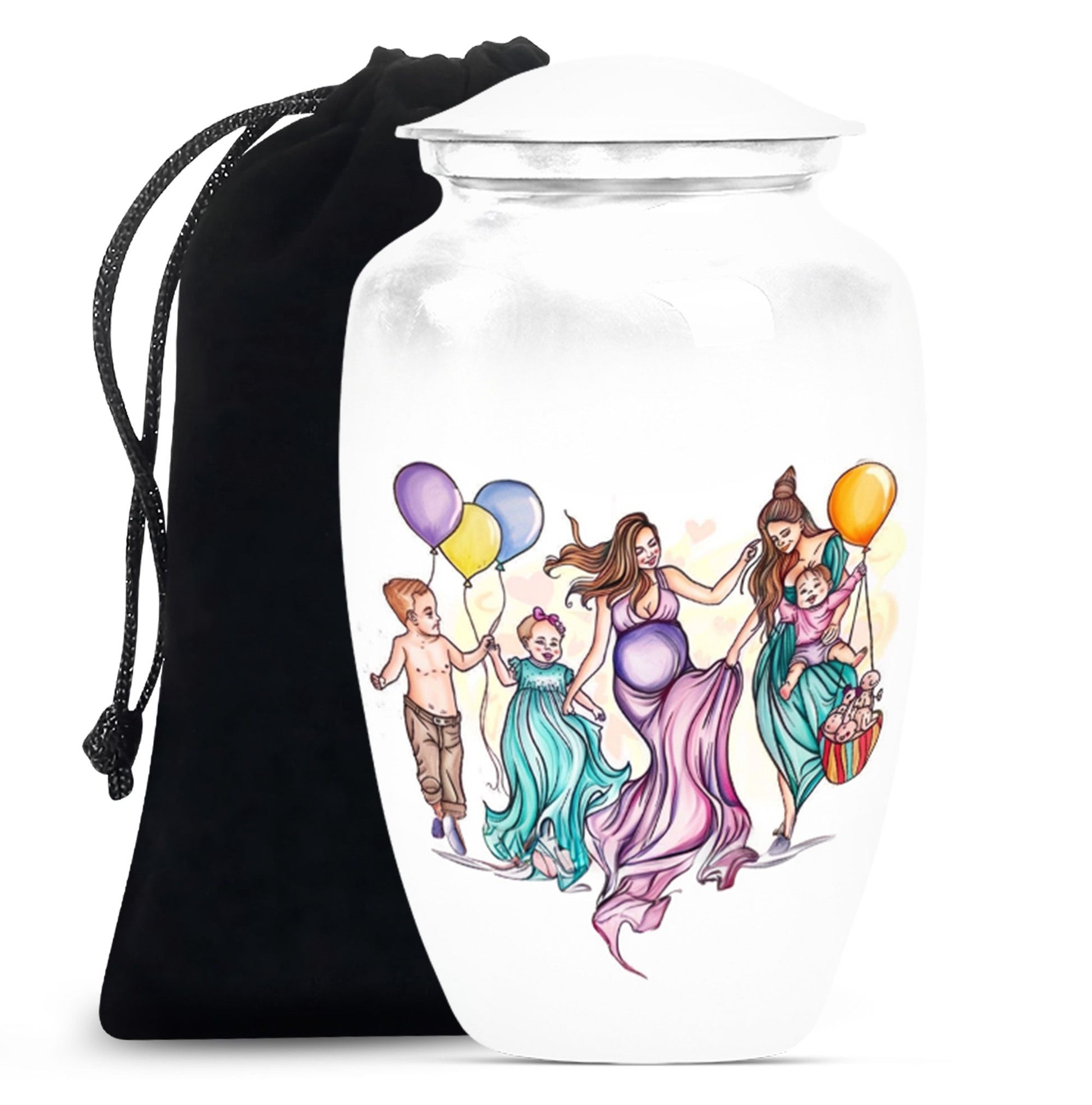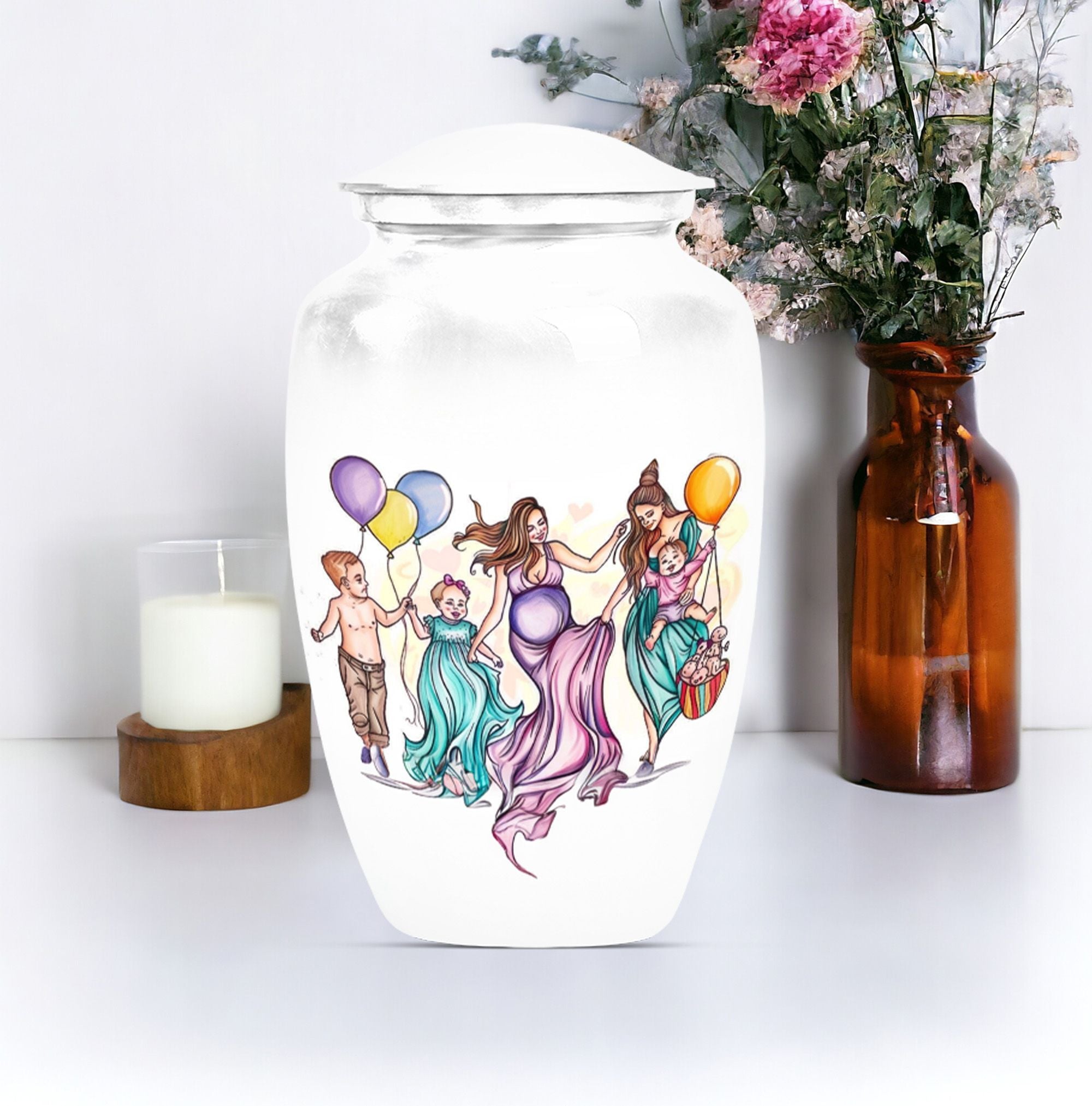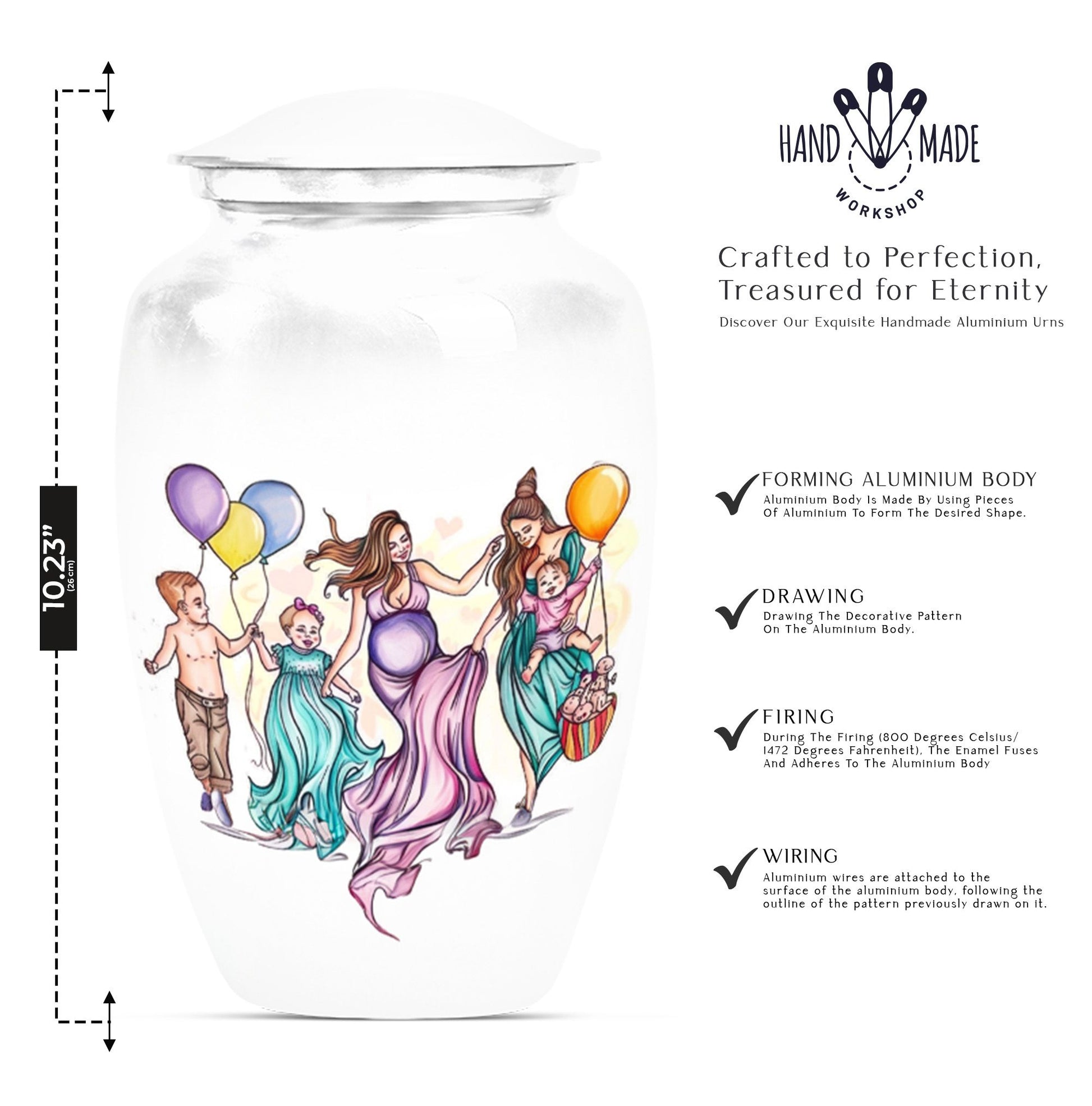 Honor the memory of a cherished one with this substantial, 10-inch Aluminium urn, a dignified resting place for your loved one's ashes. This large urn has a capacity of 200 cubic inches, which makes it ideal for adult burial. This burial urn for ashes adult emphasizes abstract themes, representing the complexities of life and the mysterious journey beyond. Our cremation urn, weighing a modest 3.3 pounds, underscores the solemnity of its purpose - a timeless testament to love and remembrance. The urn comes with a special velvet pouch, designed for the respectful containment and preservation of ashes, emblematic of the preciousness of those it represents. We offer the opportunity to further personalize this mother urn with engraved names, adding an extra layer of intimacy to this memorial symbol. Immerse yourself in the ceremonial experience with our cremation urns for dad or any loving adult in your life. Uncommonly beautiful, our urns serve as a touching tribute to a life well-lived.