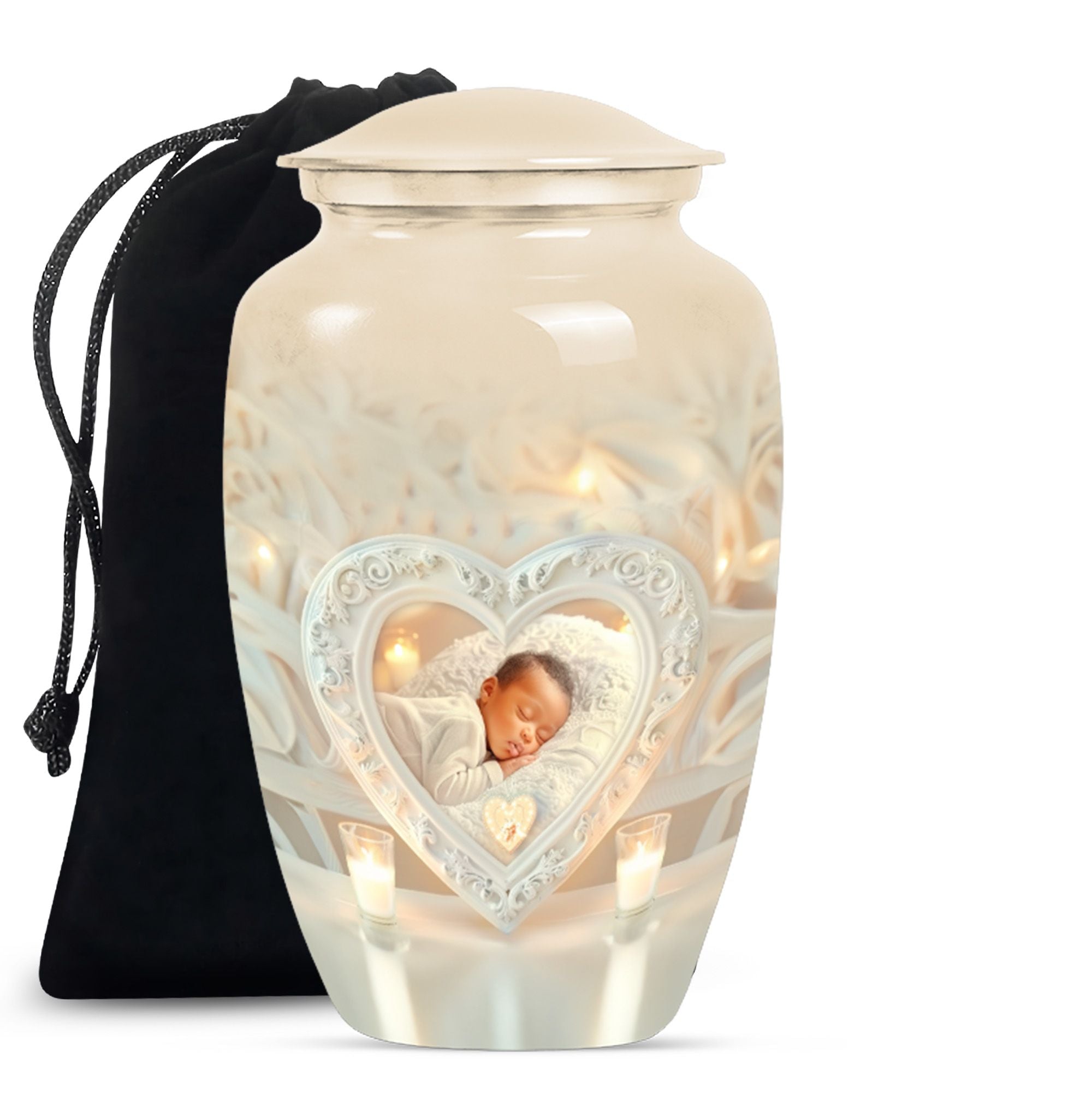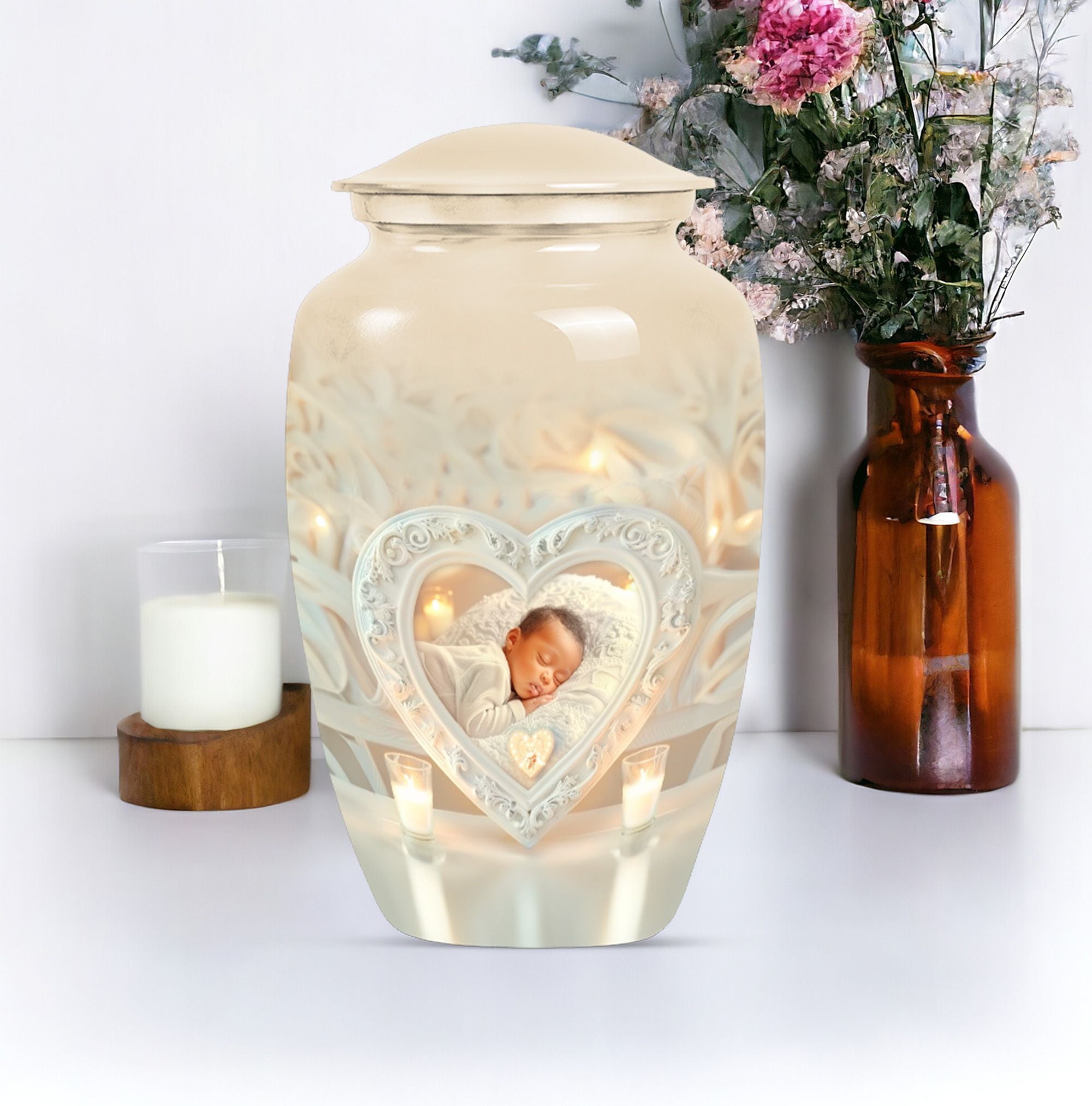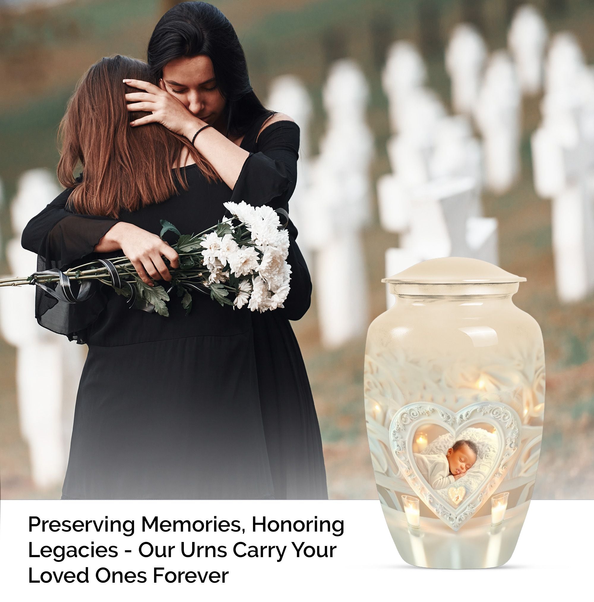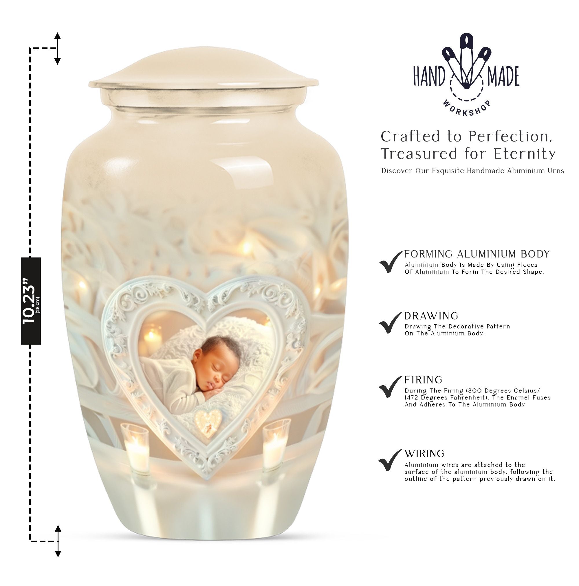 Immerse in the profound connection of motherly love with our 10 Inch, large Urn. Infused with an abstract theme, this funeral unique urn encapsulates your precious memories in a tangible yet profound manner. Crafted with dedication, this human ashes urn is composed of resilient aluminium, showcasing a powerful amalgamation of strength and grace. Added to it, the urn weighs a mere 3.3 pounds, making it easy to handle, yet sturdy in construct. Ensuring a capacity of 200 cubic inches, it is designed to securely embody the essence of your beloved. It comes with the added benefit of customization, enabling you to personalize it with engraved names, adding an intimate touch. Included in the package is a velvet pouch, providing a safe haven for the ashes. With this urn, we aspire to provide solace in a time of sorrow. Ideal for the words 'memorial urns', 'cremation urn burial', and 'funeral cremation urn' in mind, they truly resonate with what our mother love Urn signifies.