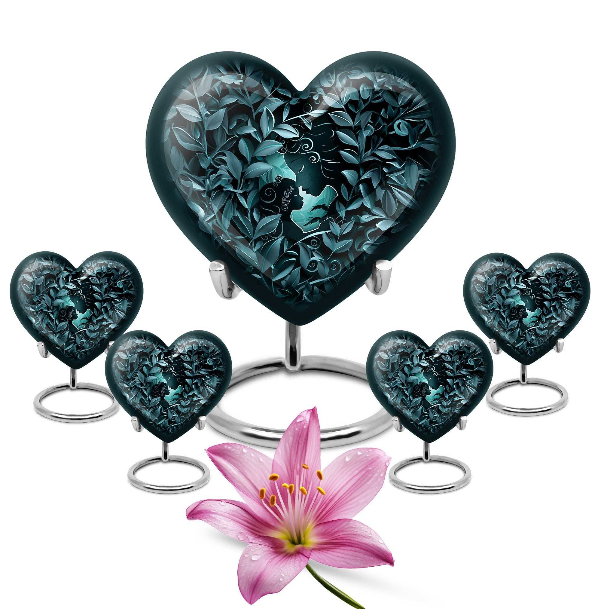 Affectionately preserve the revered memory of a cherished mother with this one of a kind, 10-inch Love Heart Urn. Masterfully crafted from enduring aluminum, this memorial funeral urn promises longevity and sanctity, fostering an unbreakable connection with the departed. Weighing 3.3 pounds, with a considerable capacity of 200 cubic inches, it is designed adeptly as a large urn to securely contain ashes. This product comes encapsulated in a delicate velvet pouch, adding a dignified touch to its entirety. With the added provision for personalization, pay an intimate tribute by engraving names on this abstract-themed supernatural marker. As a sui generis piece among memorial urns, it bestows the ultimate honor and love to the deity known as 'Mother'. This extraordinary urn splendidly fits funeral ceremonies, and adapts to various locales, recognizing the universal scenario of 'Loss'. Make your act of reverence truly unique with this expressive piece.