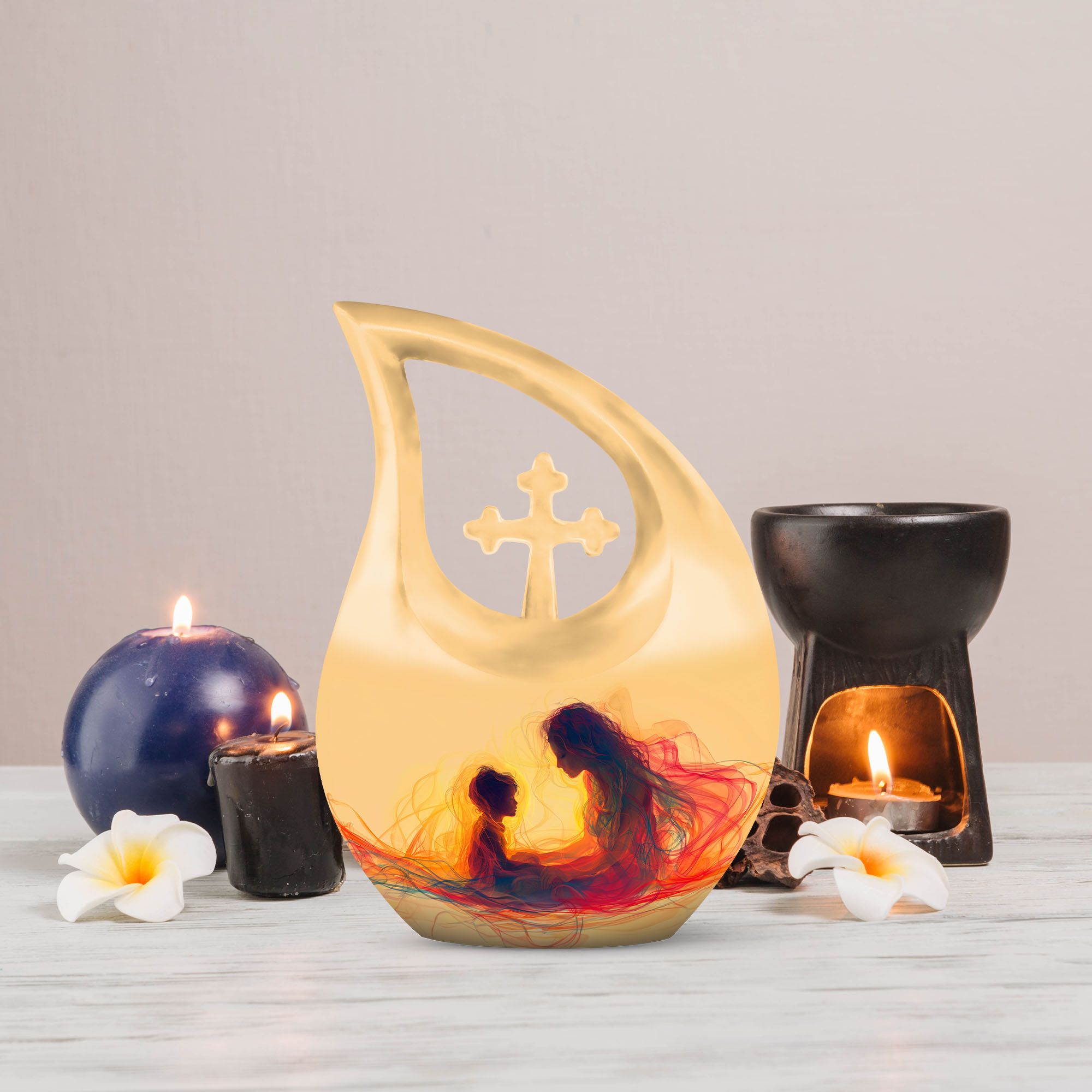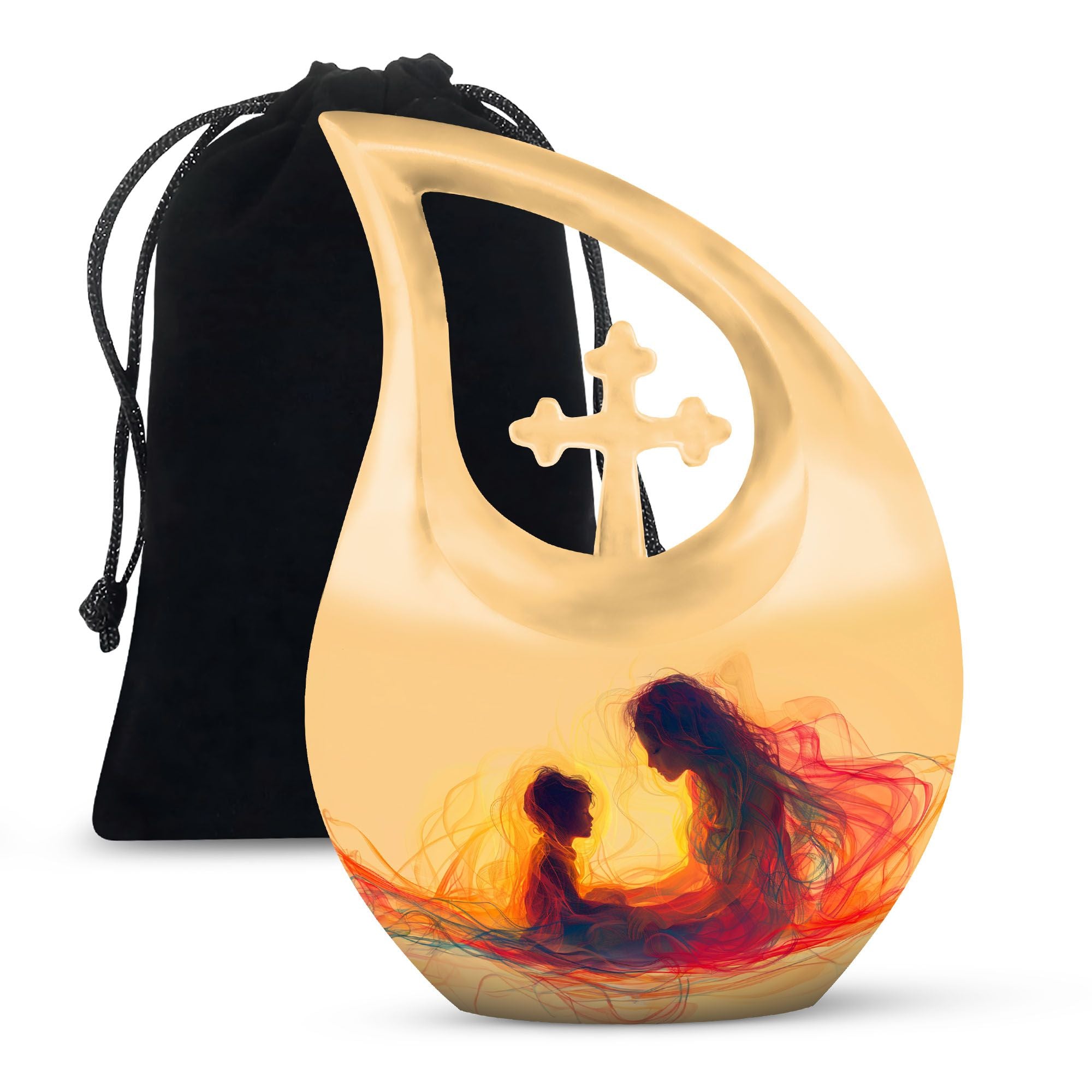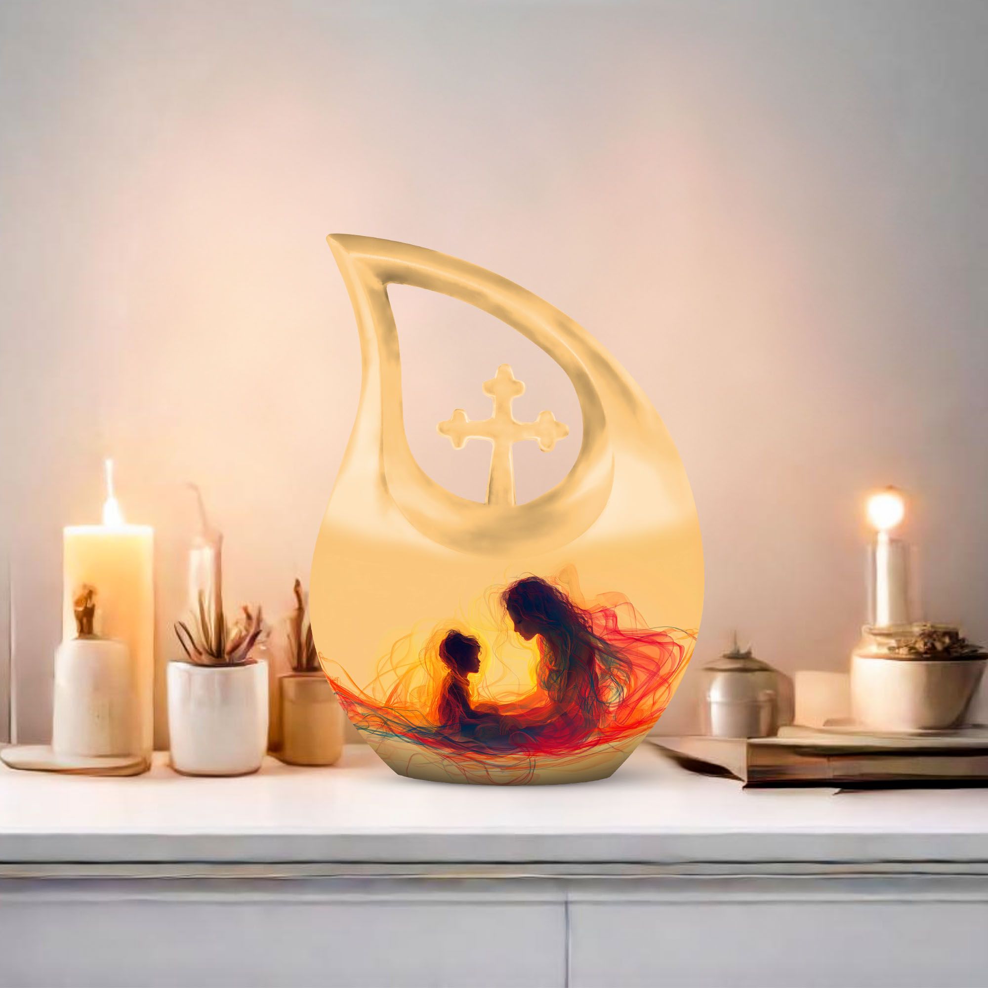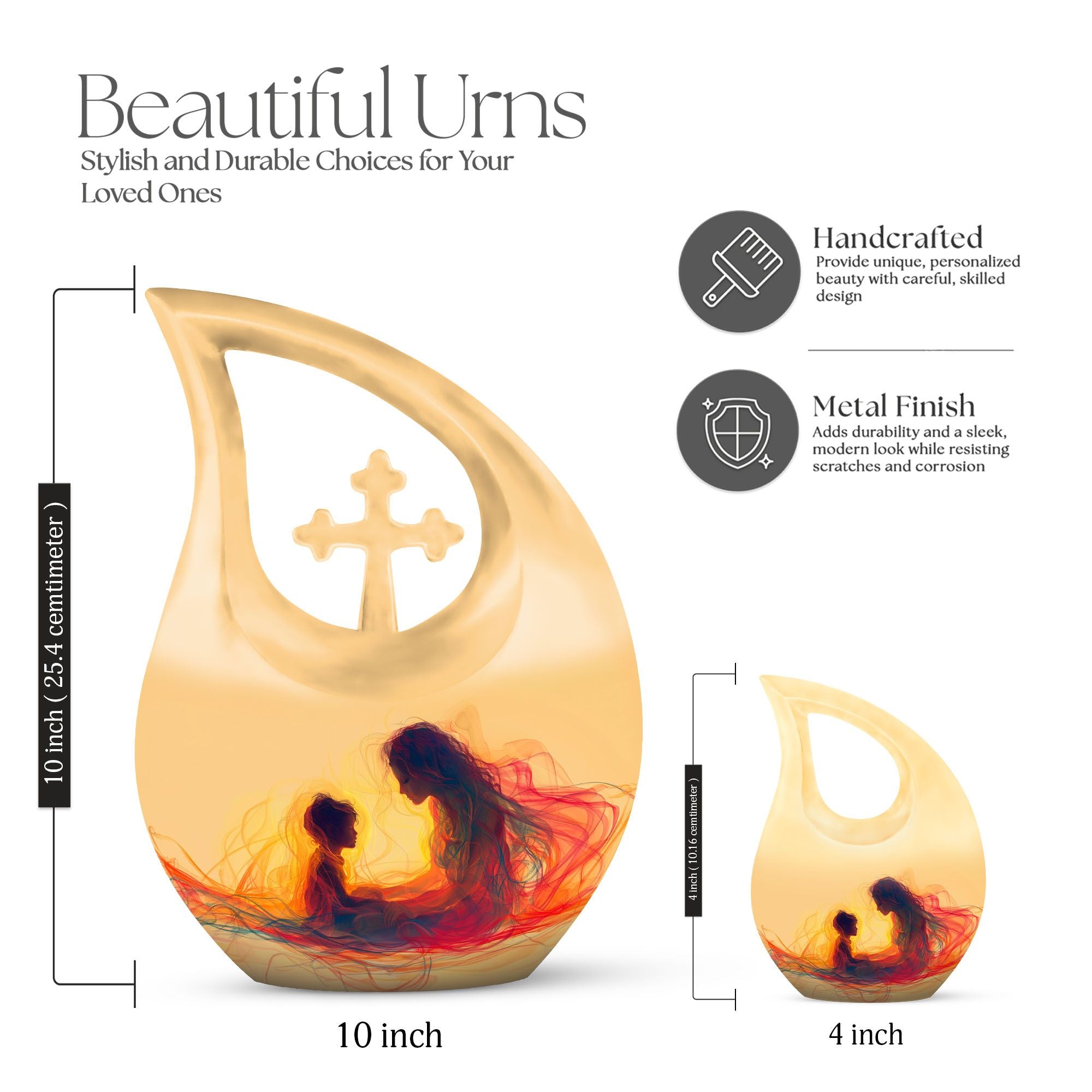 Pay a respectful tribute to your beloved mother with our meticulously crafted Mother Urn. Measuring a generous 10 inches in height, this Large Urn can effortlessly contain up to 200 cubic inches of ashes. The overall construction is quite substantial with the urn weighing in at 3.3 pounds and made from high-grade aluminium for enhanced durability and longevity. Decorated with an intricate Cross Drop, the urn's thematics are geared towards honoring the eternal love and care of a 'Mother'. Accompanying the urn is a velvet pouch providing a dignified containment for ashes. We also offer the opportunity for personalization with engraved names, transforming this urn into a unique remembrance. Our Funeral Urns for Ashes impart a substantial presence and profound sentiment. Add our 'Memorial Urns' to your list of 'Funeral Options.' This decorative urn makes a thoughtful gesture, especially for those in search of a 'Double Urn' or specific 'Urn for Mom'. Note: Design is Cross Drop with Mother Theme.