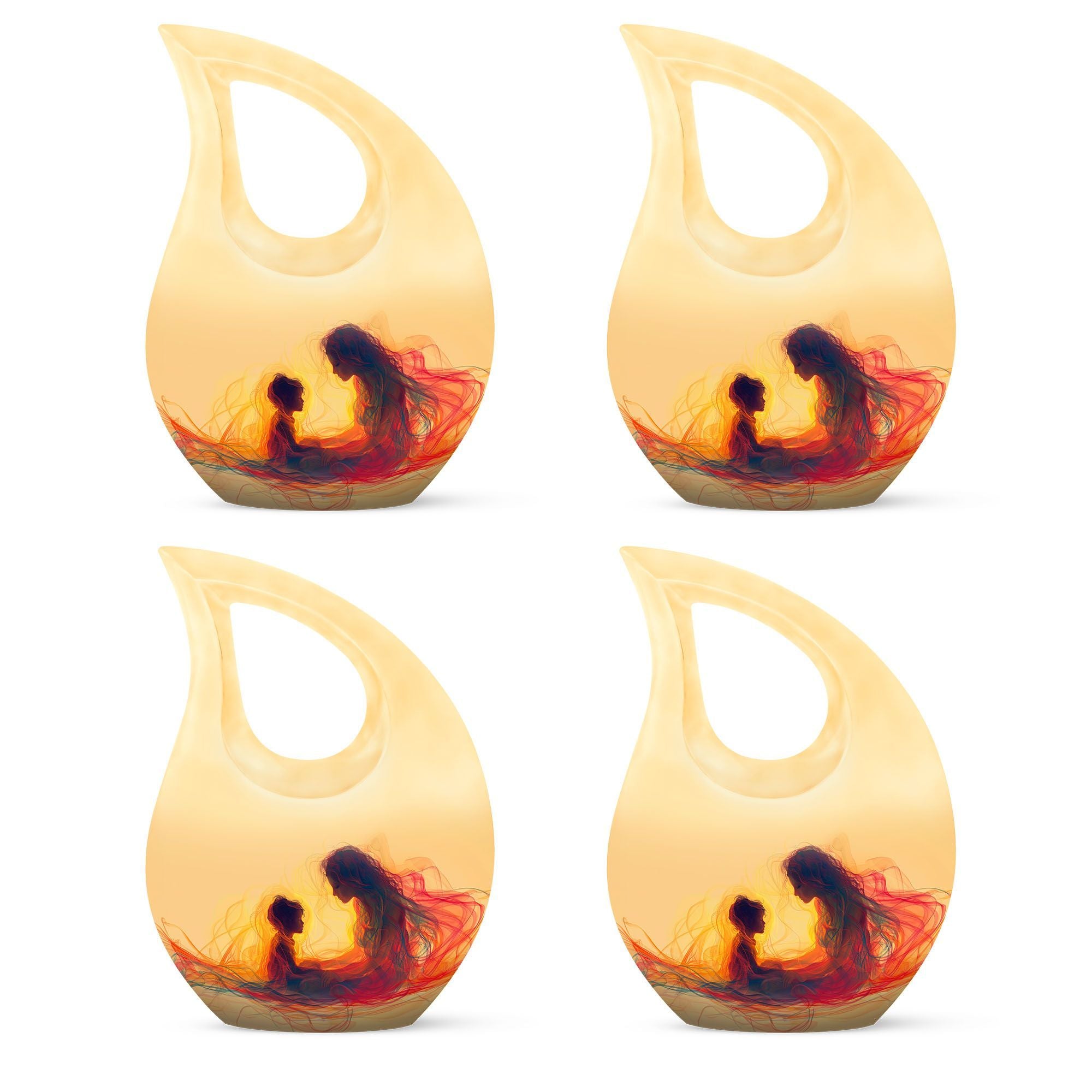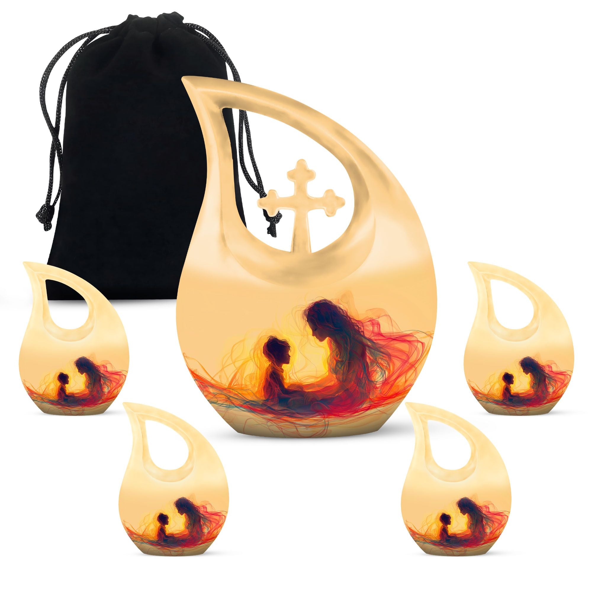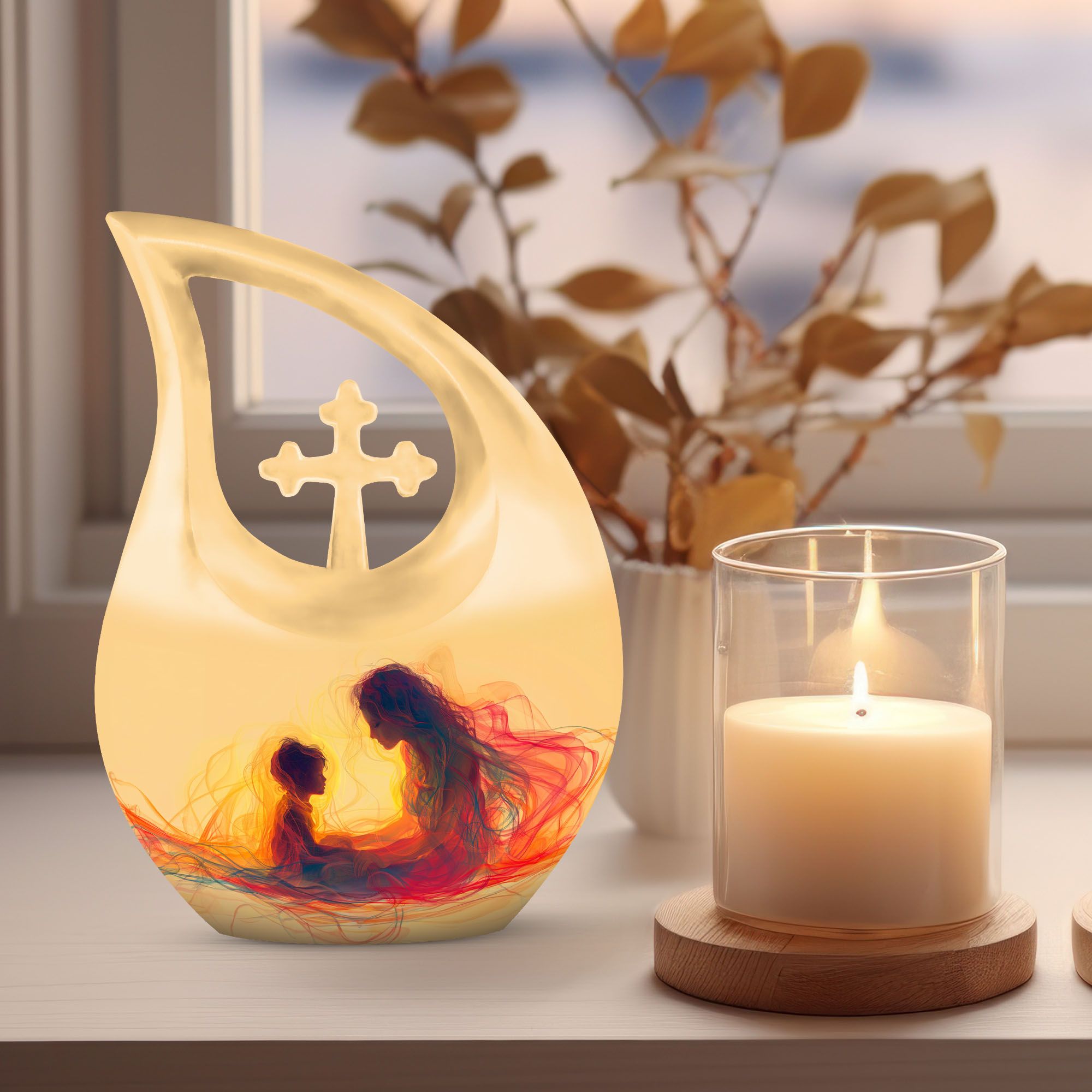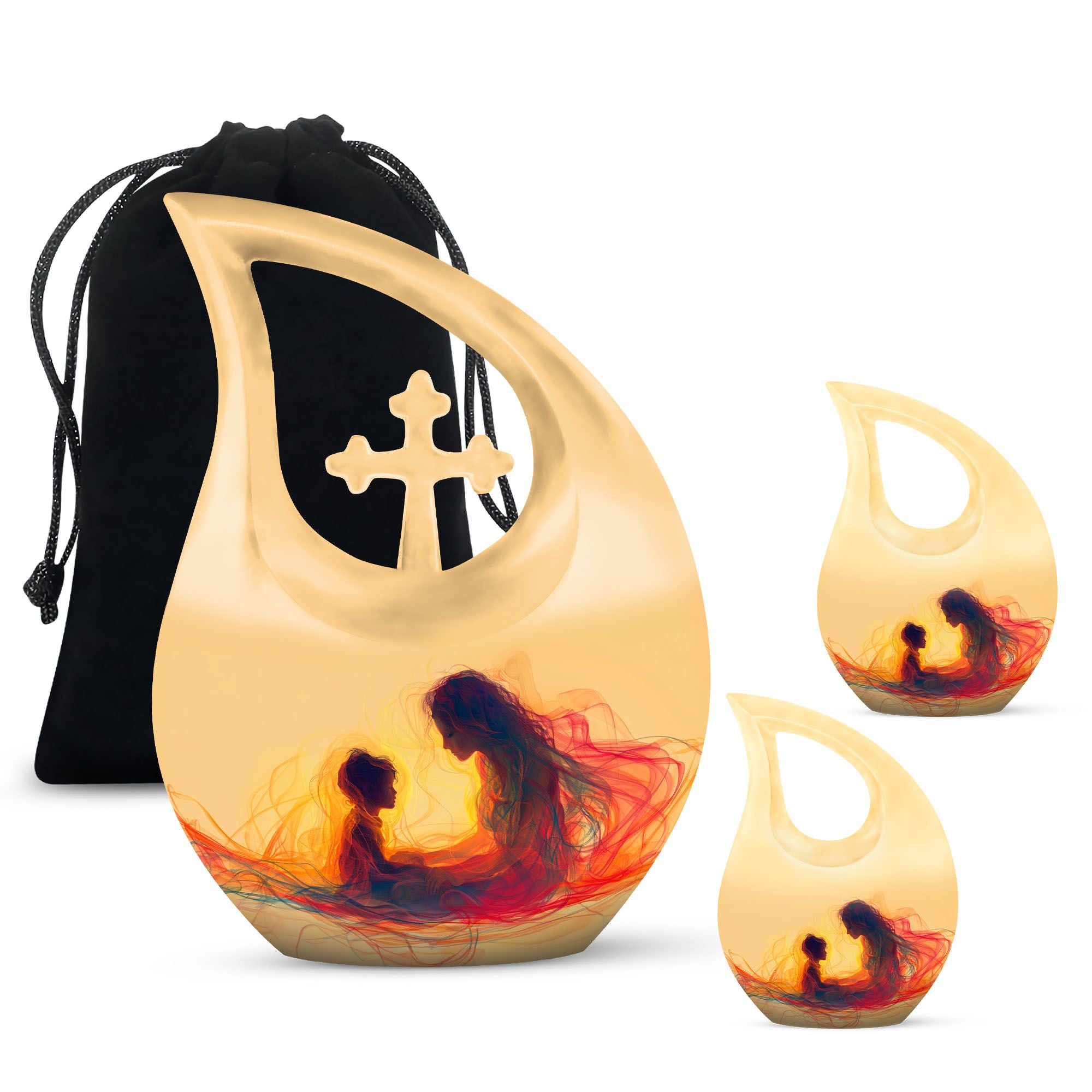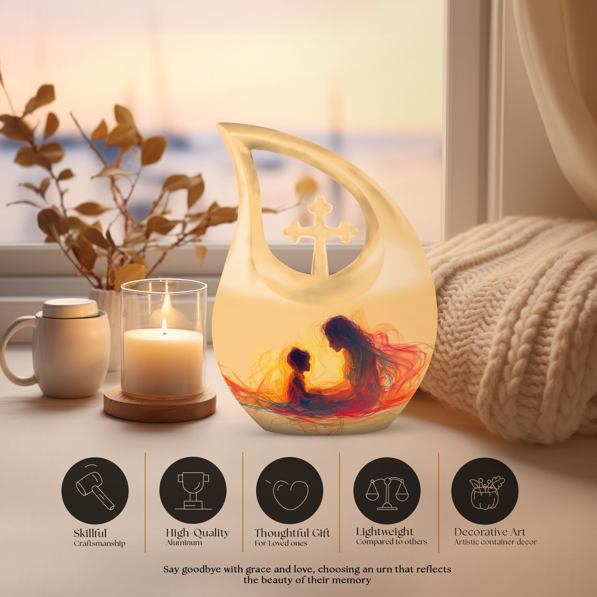 Pay a respectful tribute to your beloved mother with our meticulously crafted Mother Urn. Measuring a generous 10 inches in height, this Large Urn can effortlessly contain up to 200 cubic inches of ashes. The overall construction is quite substantial with the urn weighing in at 3.3 pounds and made from high-grade aluminium for enhanced durability and longevity. Decorated with an intricate Cross Drop, the urn's thematics are geared towards honoring the eternal love and care of a 'Mother'. Accompanying the urn is a velvet pouch providing a dignified containment for ashes. We also offer the opportunity for personalization with engraved names, transforming this urn into a unique remembrance. Our Funeral Urns for Ashes impart a substantial presence and profound sentiment. Add our 'Memorial Urns' to your list of 'Funeral Options.' This decorative urn makes a thoughtful gesture, especially for those in search of a 'Double Urn' or specific 'Urn for Mom'. Note: Design is Cross Drop with Mother Theme.