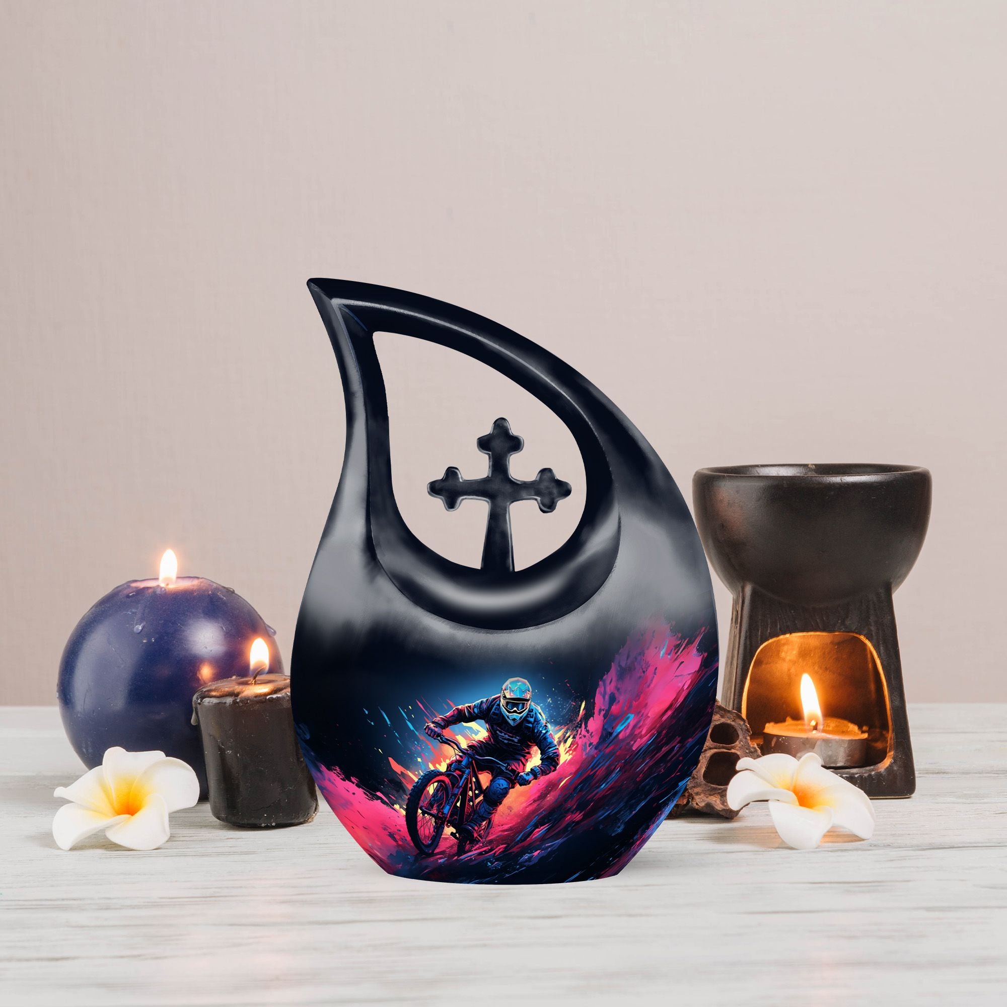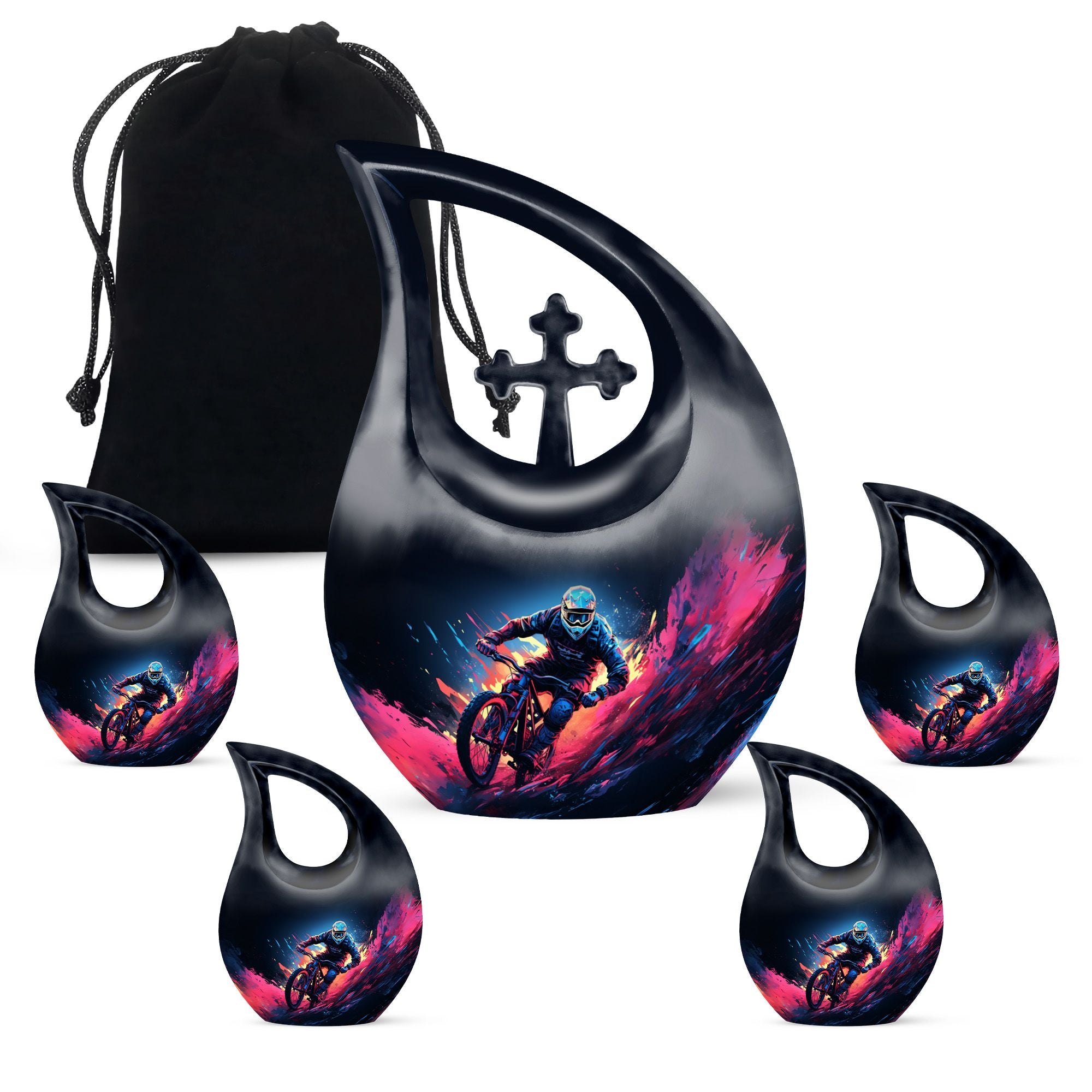 Crafted from durable aluminum, the urn features detailed mountain bike–themed artwork symbolizing strength, exploration, and the joy of the trail. Its secure screw-top lid ensures long-term protection, while the full-size design provides ample capacity for adult remains. This urn pairs beautifully with mini urns for ashes, miniature urns for human ashes, mini urns for human ashes mom, mini urns for human ashes dad, or mini keepsake urns for human ashes to create a coordinated memorial set. Whether used for display, ceremonies, or shared remembrance, this MTB urn offers both beauty and functionality.