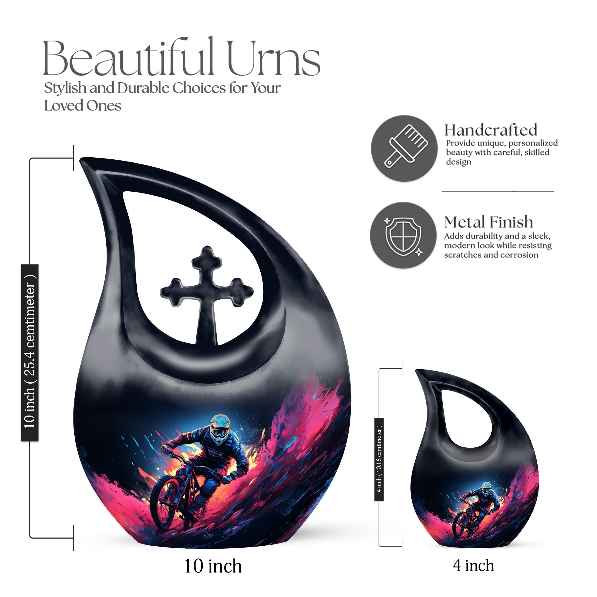 Features:• Material: Aluminium• Dimensions: Height 10 inches• Capacity: 200 cubic inches• Lid: Secure screw-top lid• Design: Mountain bike / MTB-themed artwork• Use: Adult Male/Female Cremation