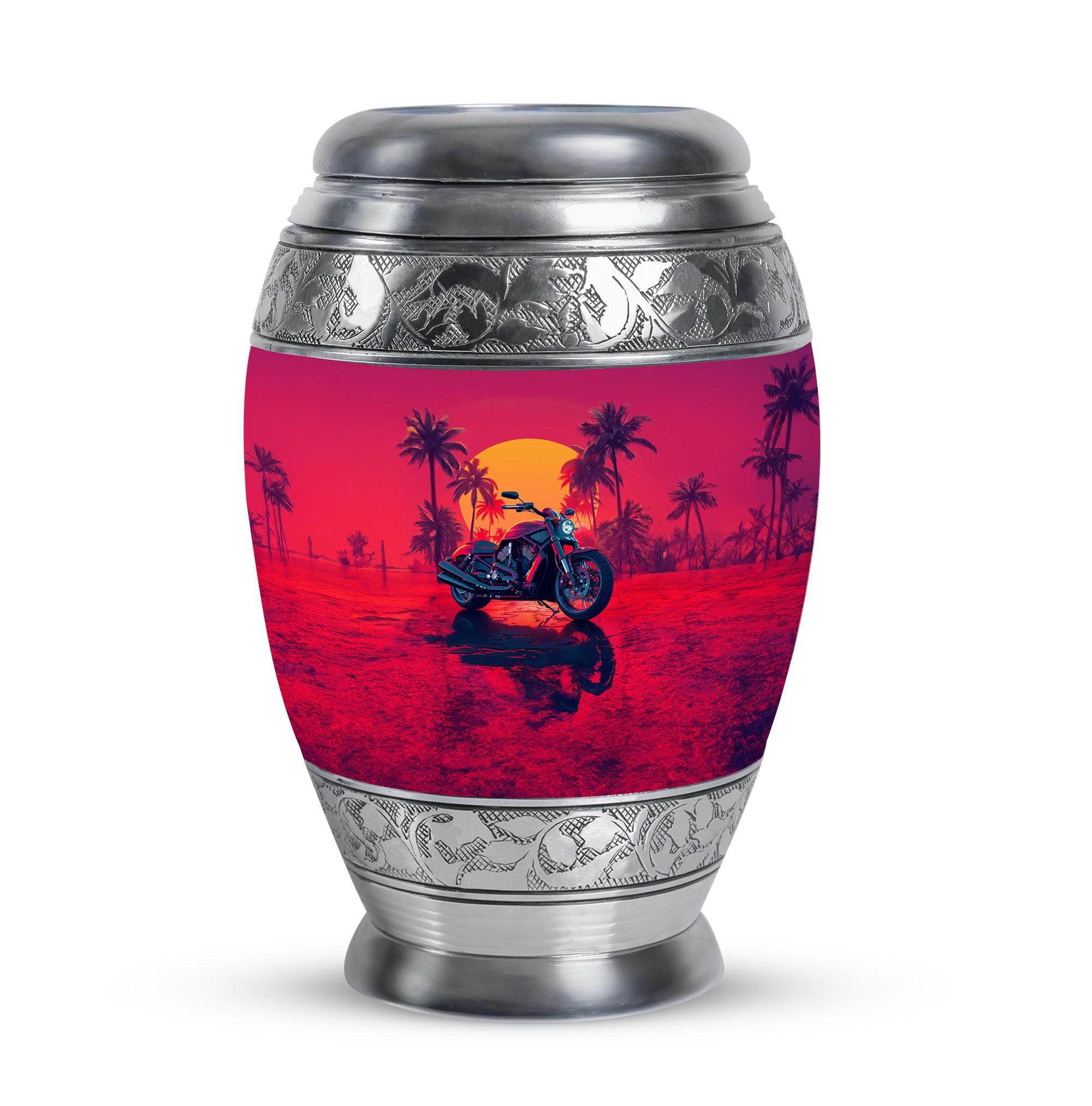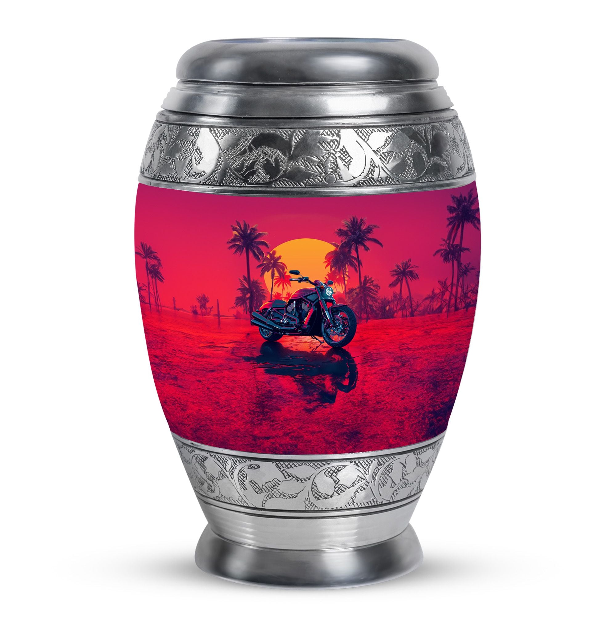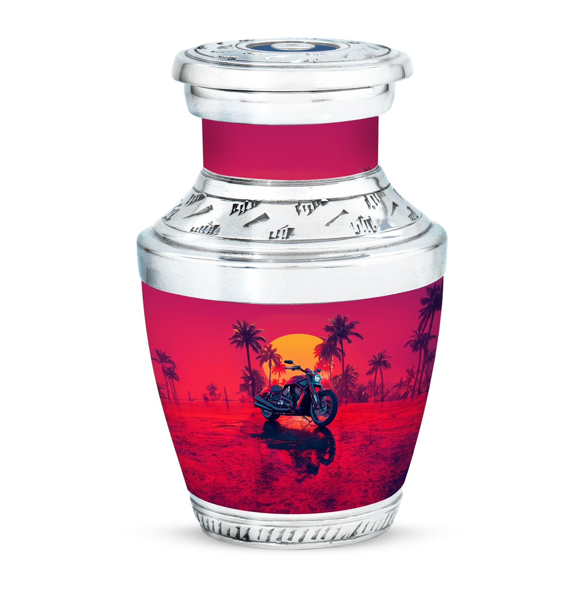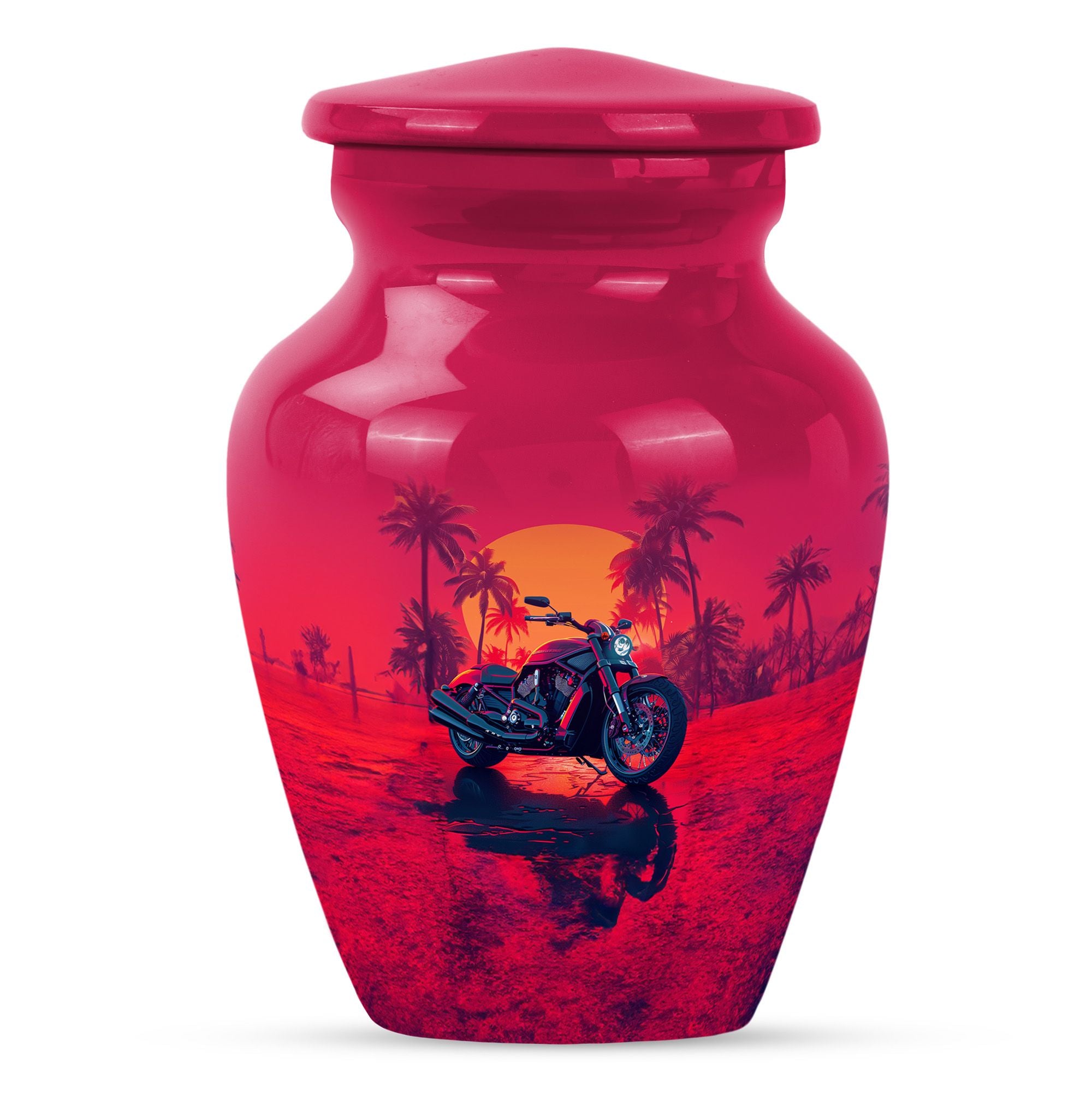 Crafted from premium aluminium, this urn features a radiant sunset finish with a detailed motorcycle motif, representing both strength and serenity. With a secure screw-top lid, it ensures safe storage while serving as a versatile option for funeral urns for adult ashes men, mini small urns for men, or adult urns for women.