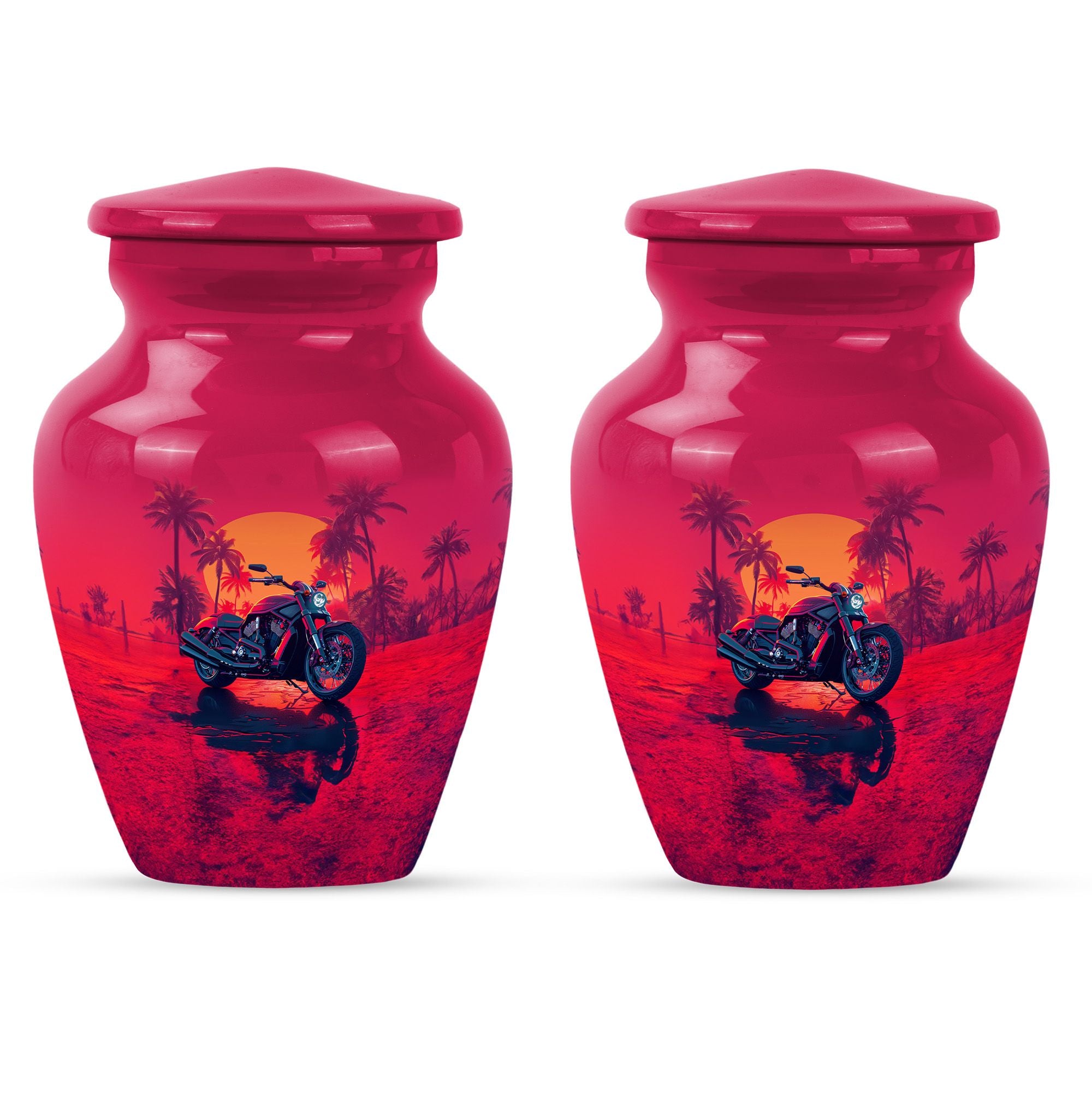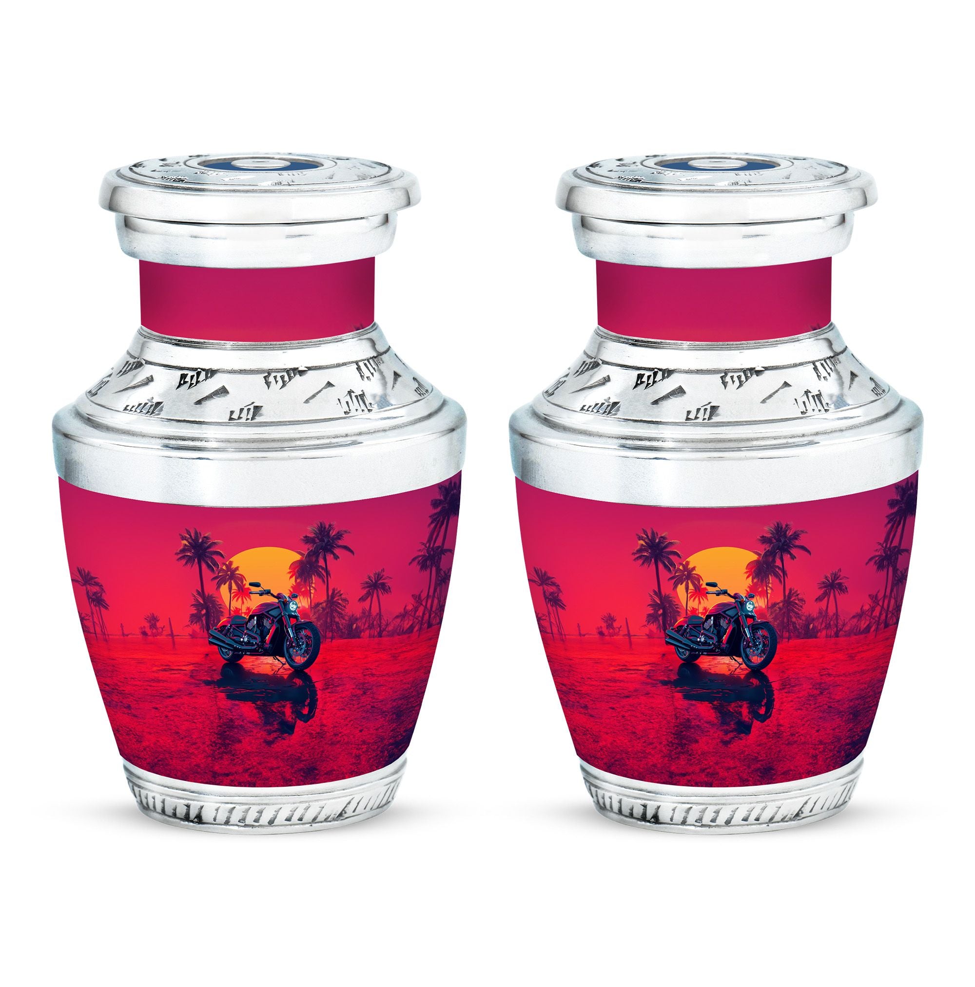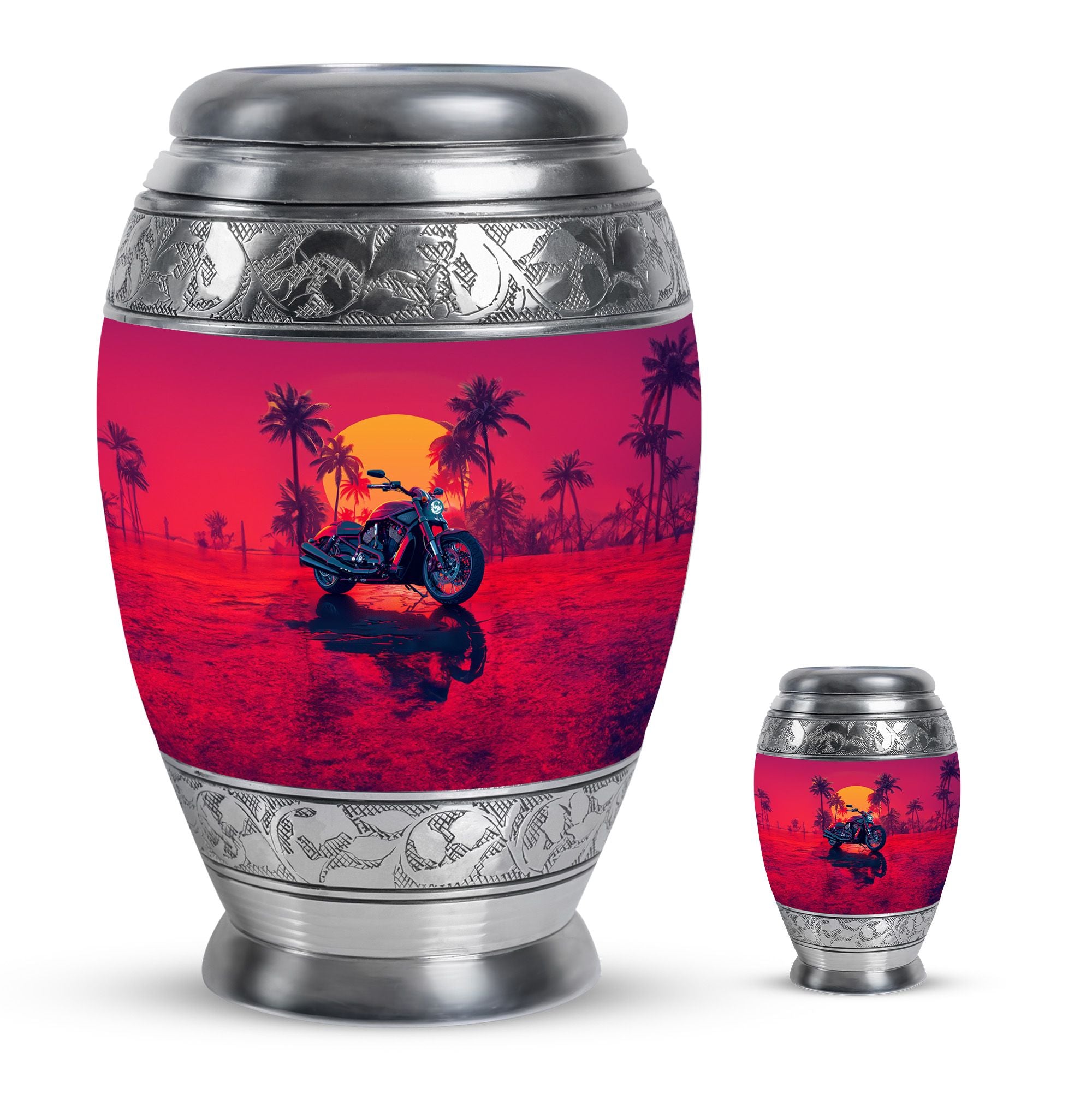 Crafted from premium aluminium, this urn features a radiant sunset finish with a detailed motorcycle motif, representing both strength and serenity. With a secure screw-top lid, it ensures safe storage while serving as a versatile option for funeral urns for adult ashes men, mini small urns for men, or adult urns for women.