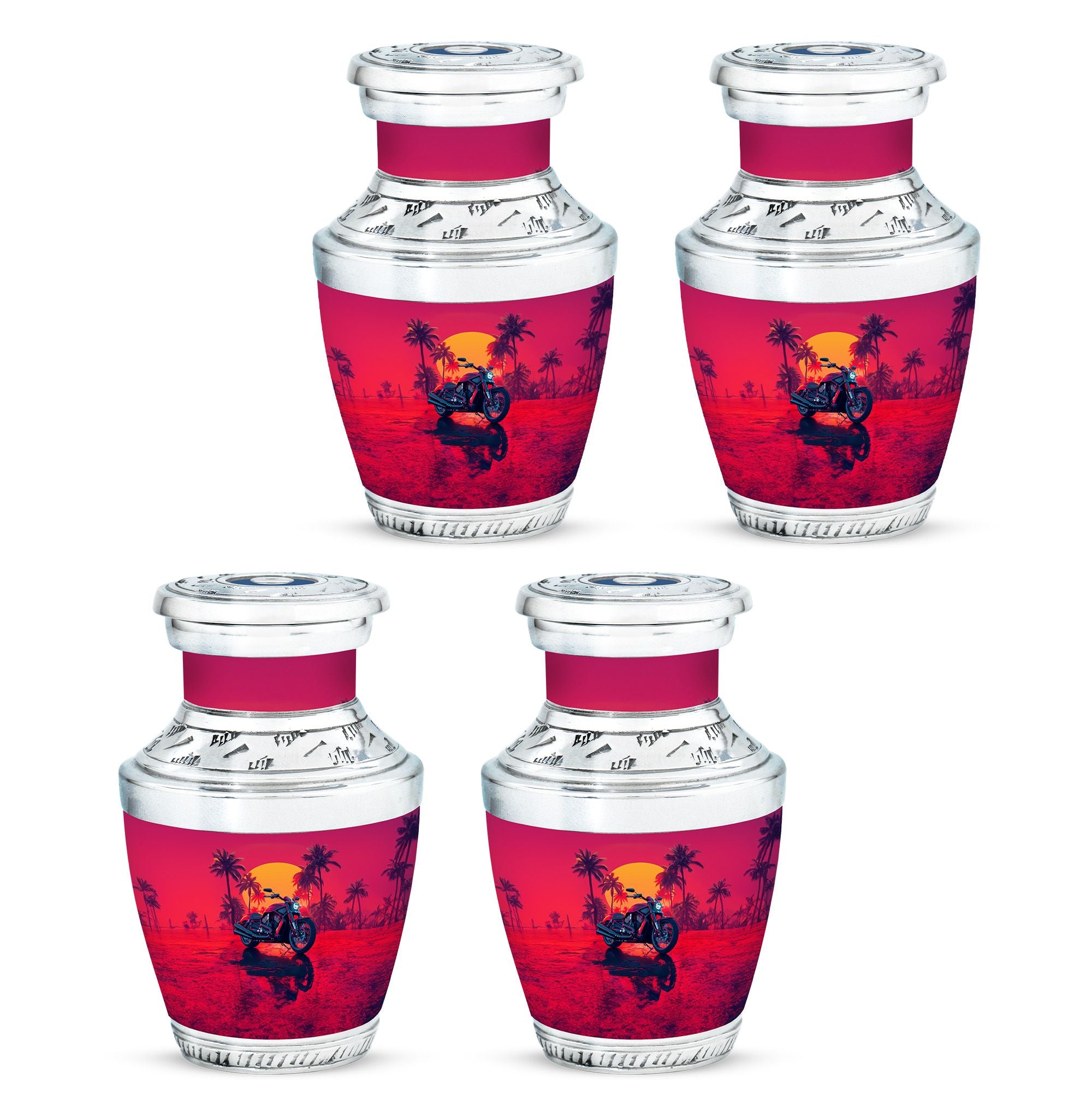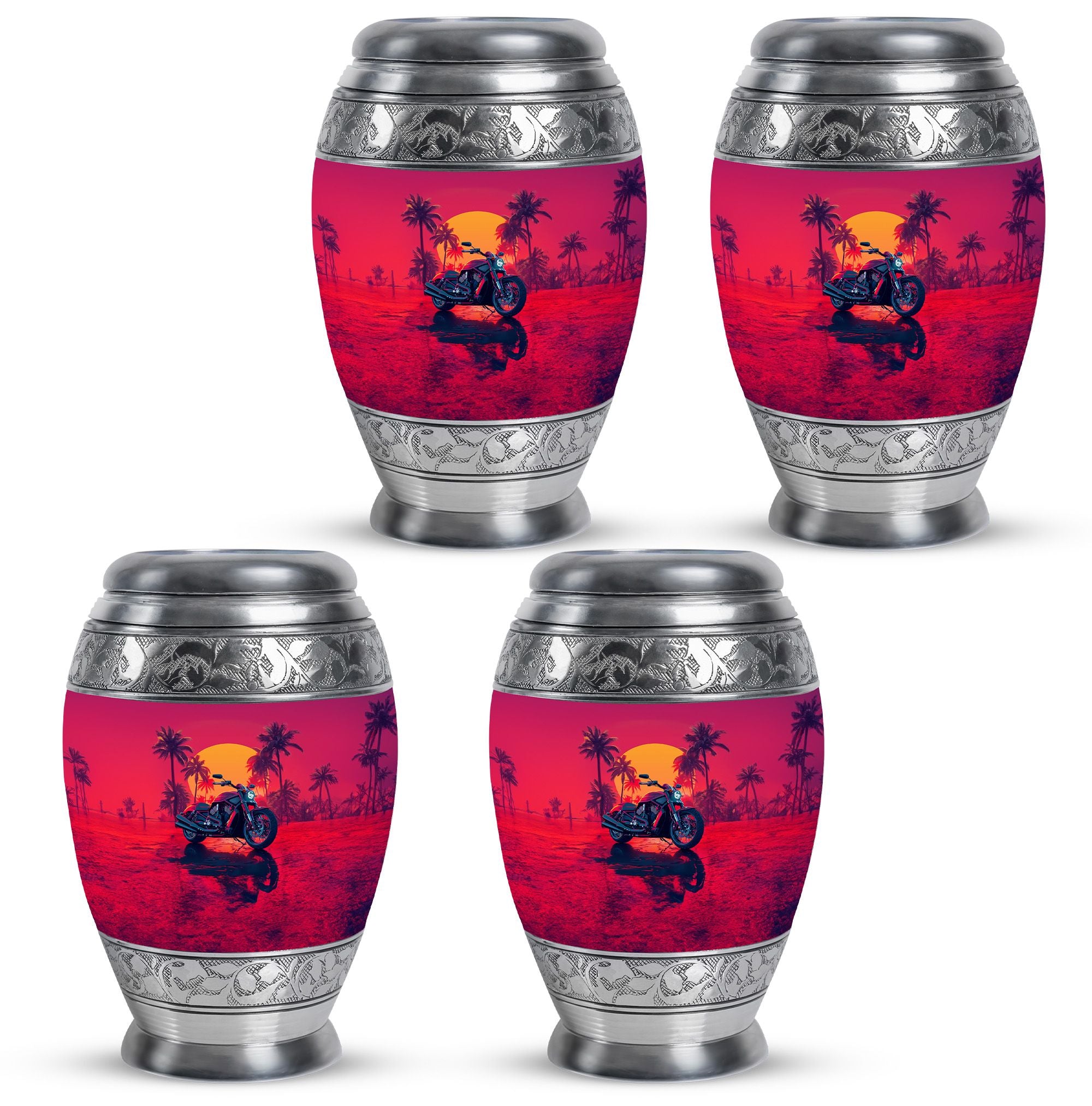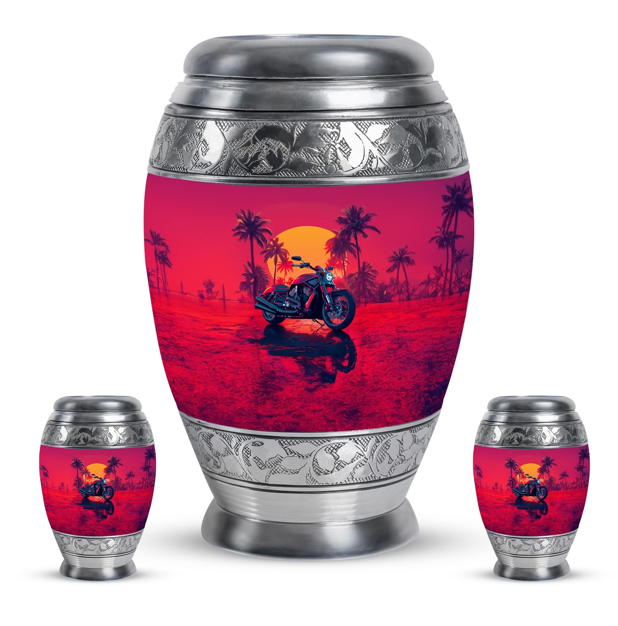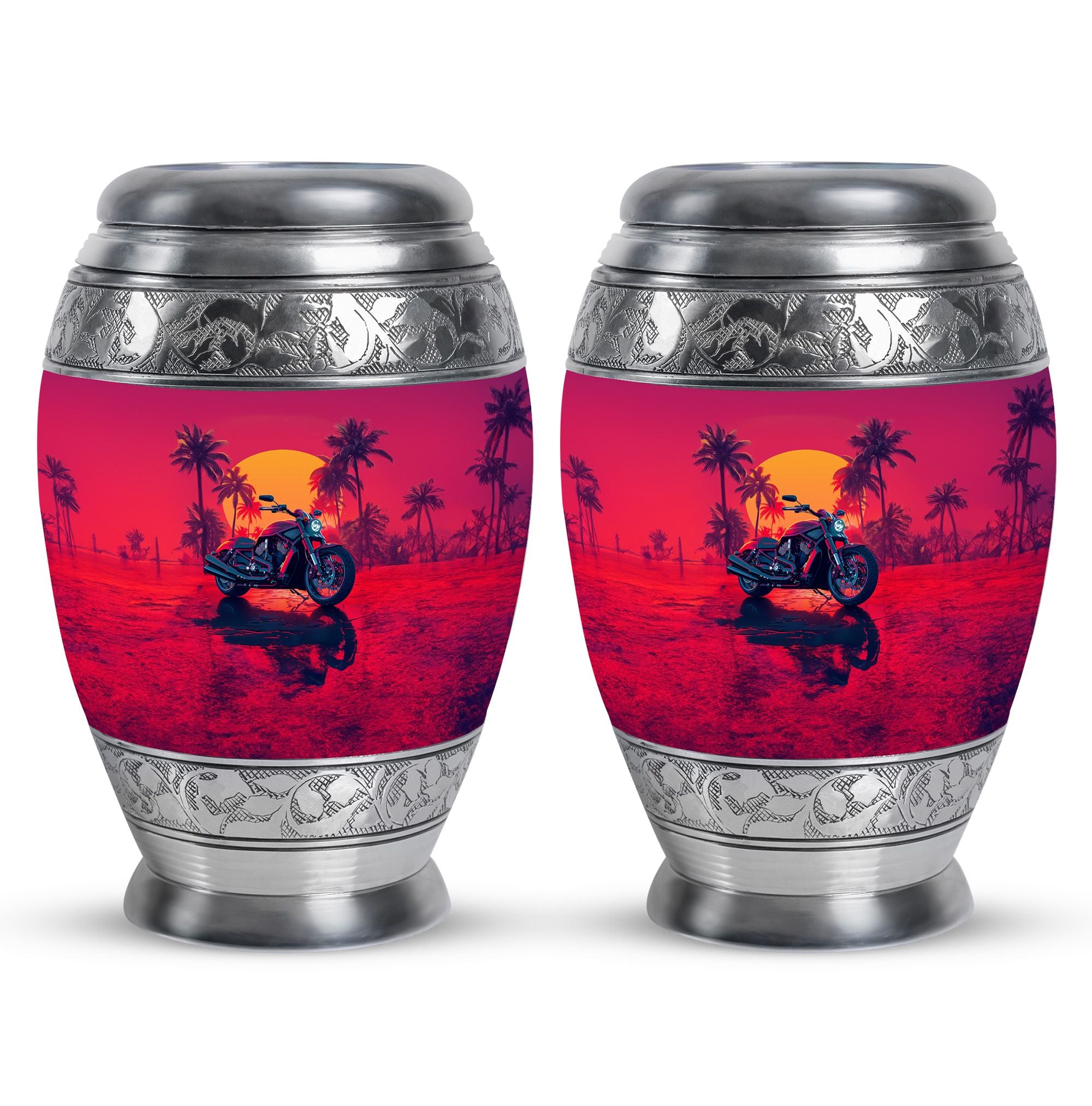 Crafted from premium aluminium, this urn features a radiant sunset finish with a detailed motorcycle motif, representing both strength and serenity. With a secure screw-top lid, it ensures safe storage while serving as a versatile option for funeral urns for adult ashes men, mini small urns for men, or adult urns for women.