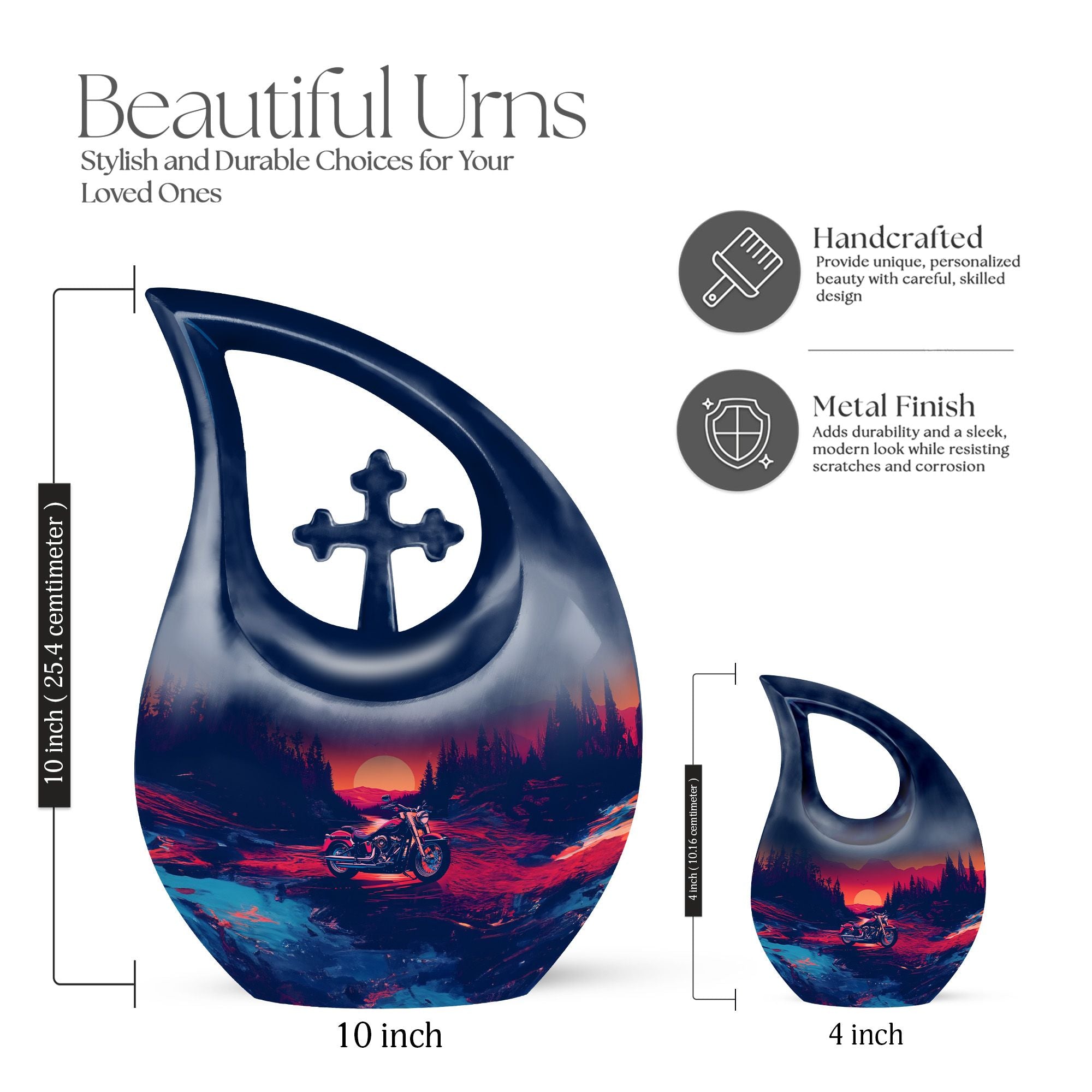 Crafted from durable aluminum and highlighted with a radiant sunset motorcycle design, this urn reflects both grace and independence. Its elegant finish makes it a perfect match for those searching for cremation urns for ashes for women, adult urns for women, or an urn for human ashes adult women. The secure screw-top lid, 10-inch height, and professional craftsmanship ensure both safety and lasting tribute. This piece is suitable for families wanting adult urns for men & women, urn for women ashes, or even symbolic display alongside funeral urns for men.