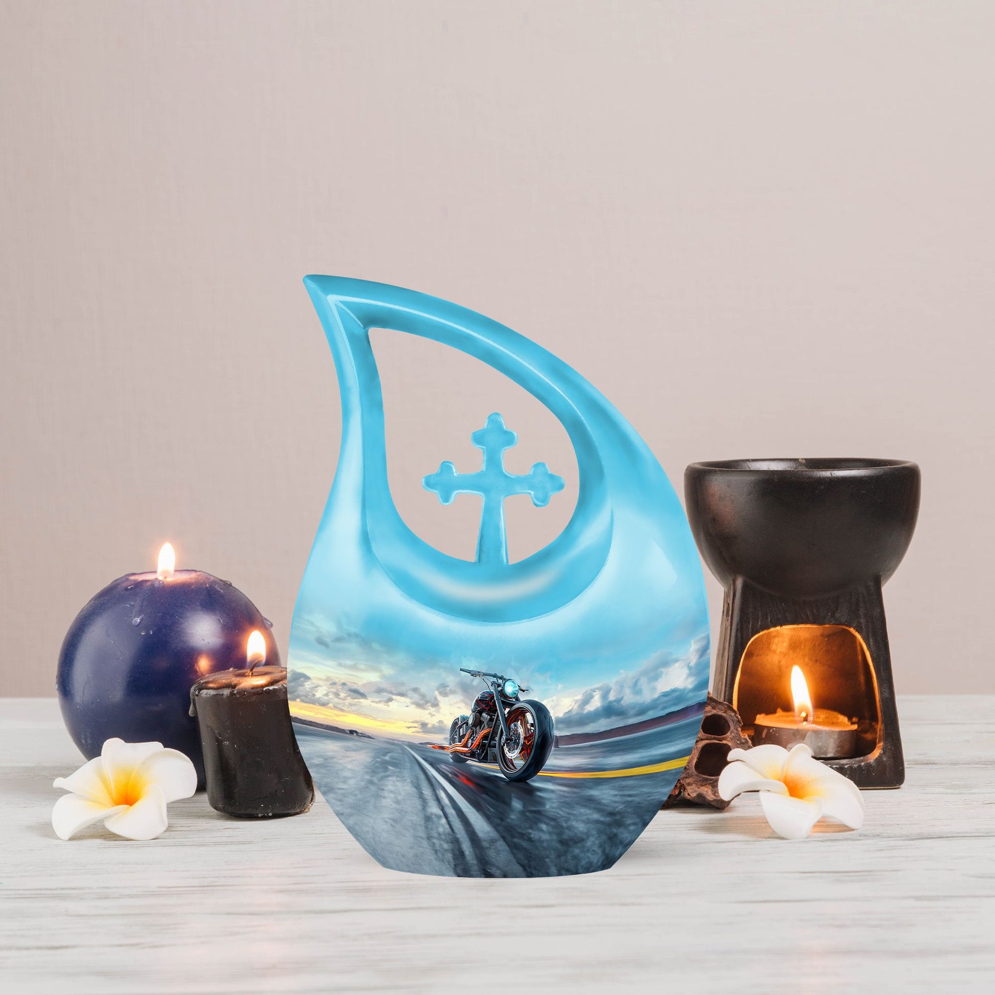 Crafted from durable aluminium and finished with a bold blue motorcycle design, this urn blends beauty with long-lasting strength. Its 10-inch height and 200 cubic inch capacity make it ideal for those searching for cremation urns large, urns for human ashes large, or a reliable large funeral urn designed to protect and preserve ashes with care. The polished surface and secure screw-top lid ensure safety and elegance, providing peace of mind for families needing a cremation urn large, cremation urn adult large, or large cremation urns for human ashes. This design also supports families seeking cremation urns for large human ashes adult, a classic large cremation urn, or memorials suitable for an urn large adult male or a large urn for adult ashes.