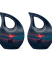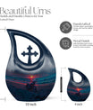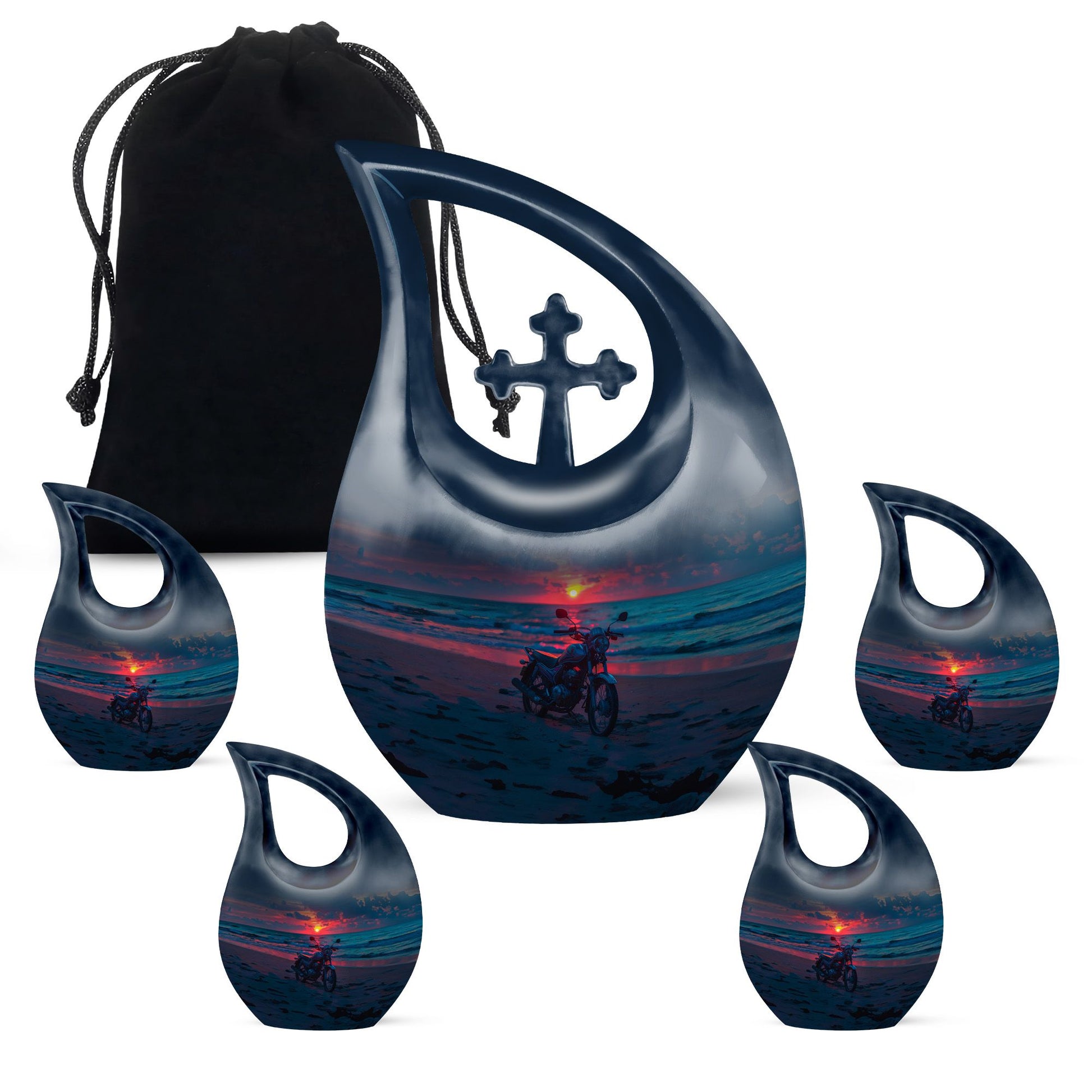 Crafted from durable aluminum, this navy blue urn features a stunning sunset motorcycle scene symbolizing freedom, reflection, and a journey that continues beyond the horizon. Its secure screw-top lid ensures ashes remain safe, making it an excellent choice for those needing adult size cremation urns, urn for cremation, or pairing with urn cremation keepsake options. This design works beautifully with cremation keepsake urns for human ashes adult, small urns for cremation ashes, mini cremation urns, or small cremation urns for human ashes adult for shared remembrance.