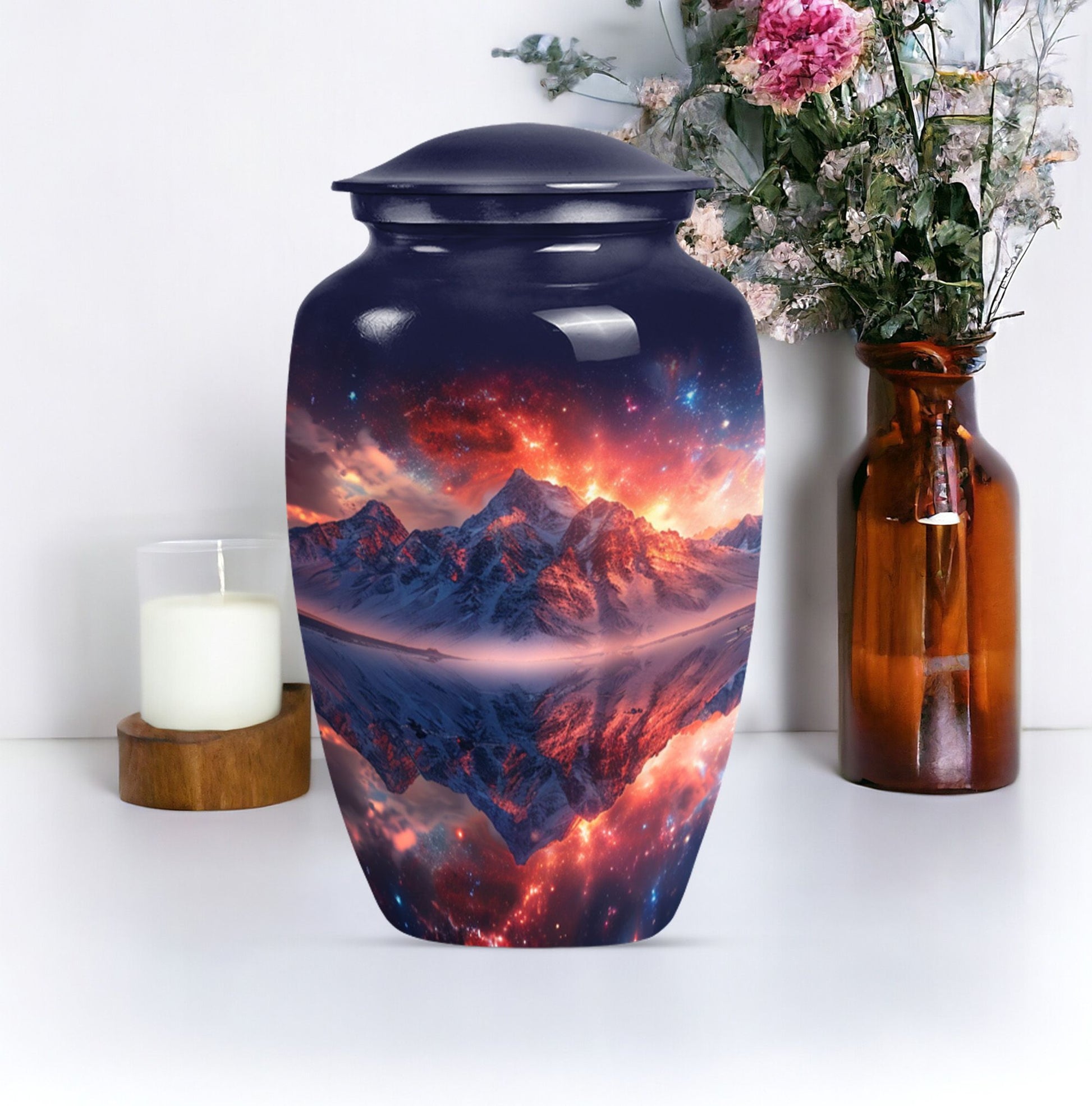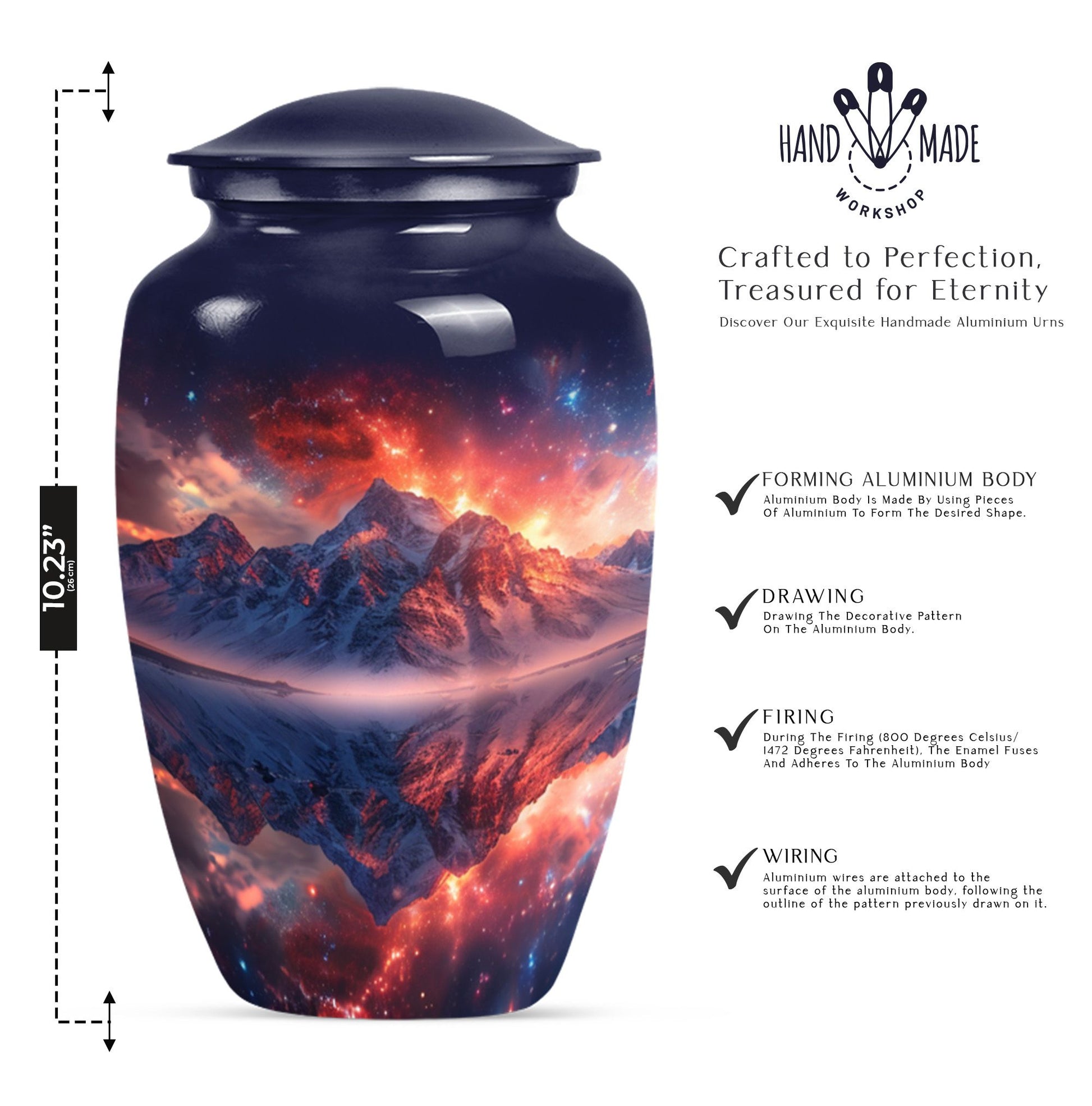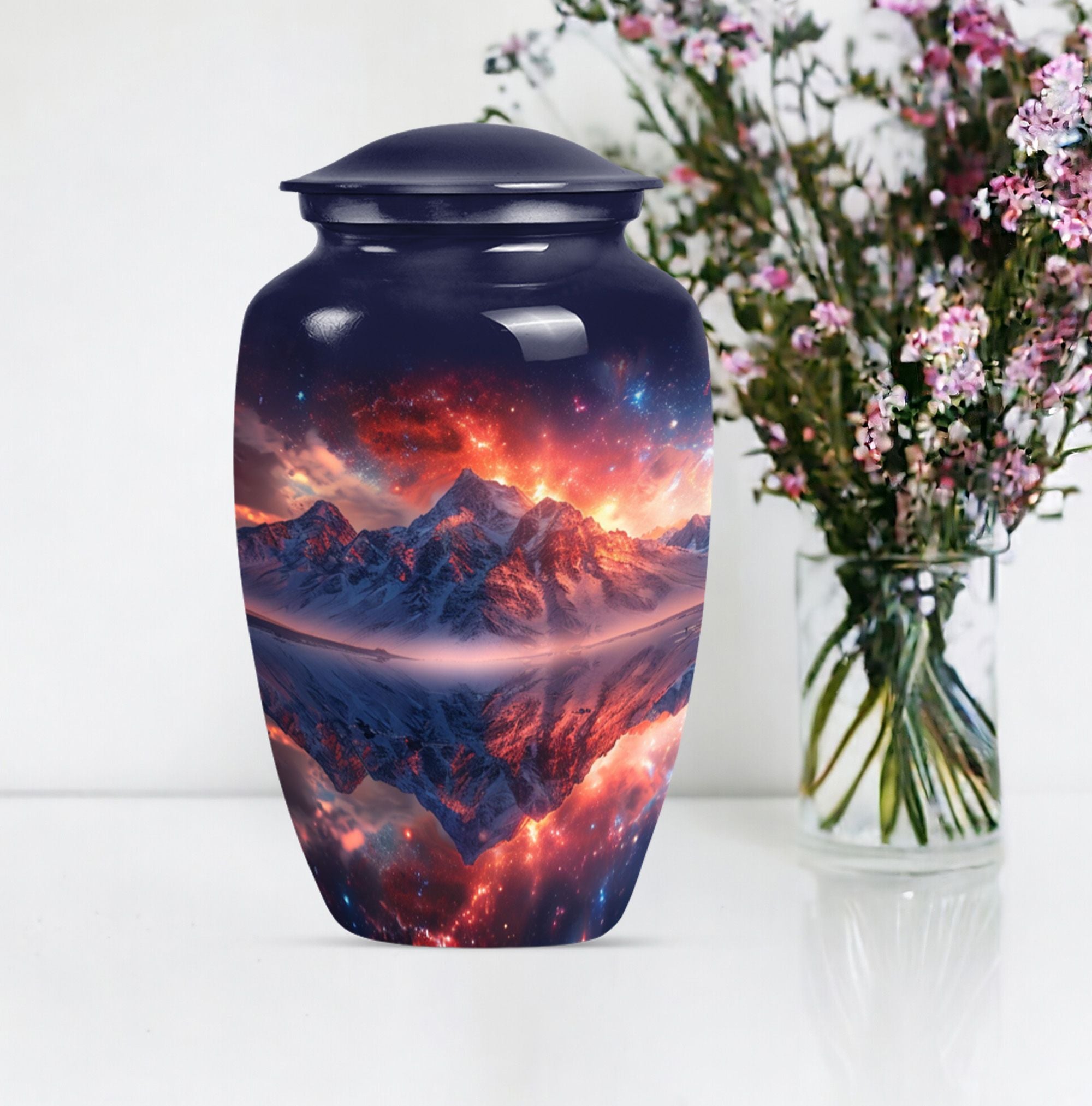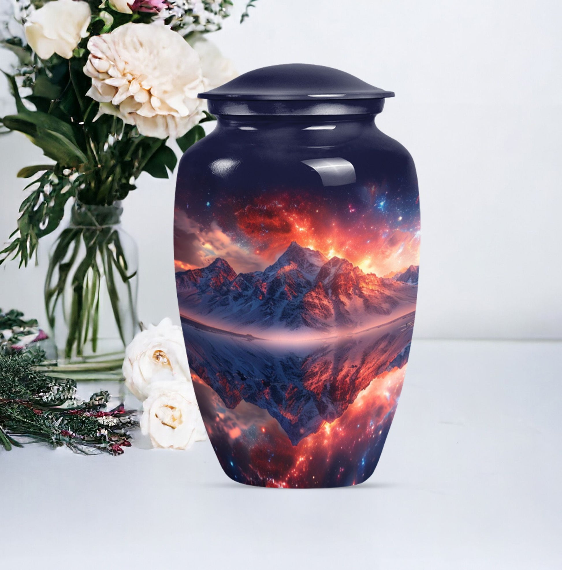 Experience serene remembrance with our durable mountaintop large urns. A perfect memento for your treasured ones embodied in a 10-Inch size, classic abstract themed burial ash urns for humans. Made with quality Aluminium, this memorial urn weighs 3.3 pounds and has the spacious capacity of 200 cubic inches, to securely hold the ashes of an adult. Personalize your urn with engraved names, to keep your beloved closer. These urns for adult cremation ashes are perfect for both men and women, offering a thoughtful way to honor the memory of your dear one. This urn comes with a soft, velvet pouch providing an elegant containment solution for the ashes. Uniquely handcrafted, our urns combine sophistication and simplicity in design. The quintessential choice for those looking for a dignified resting place for their loved ones.
