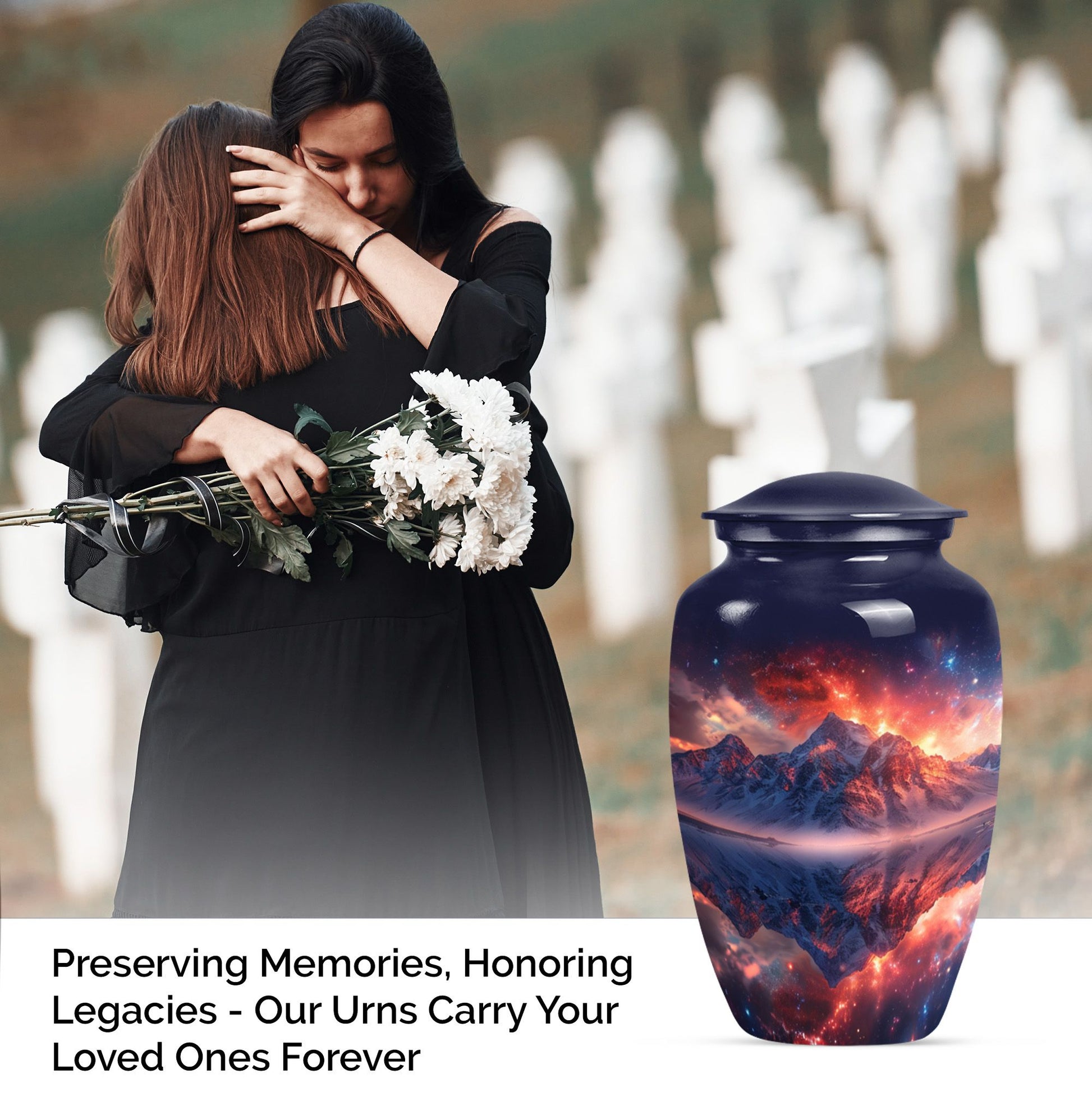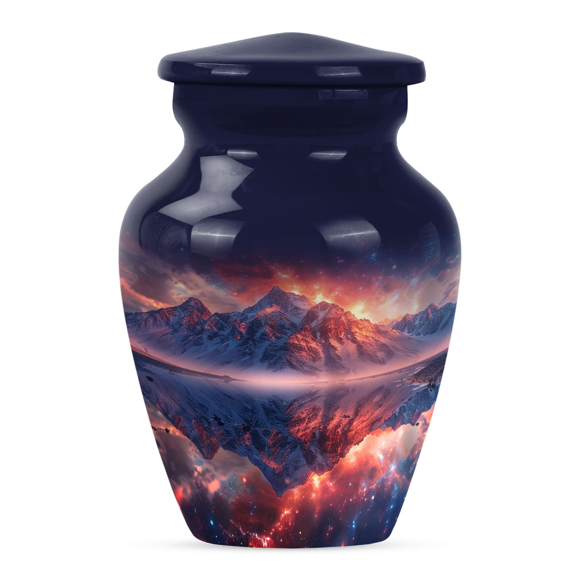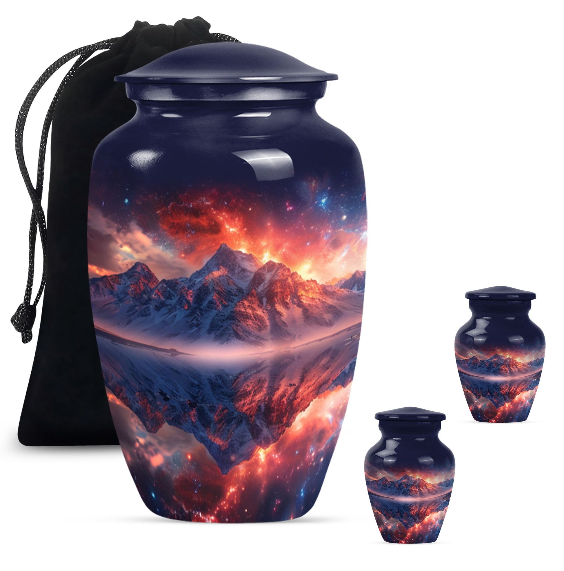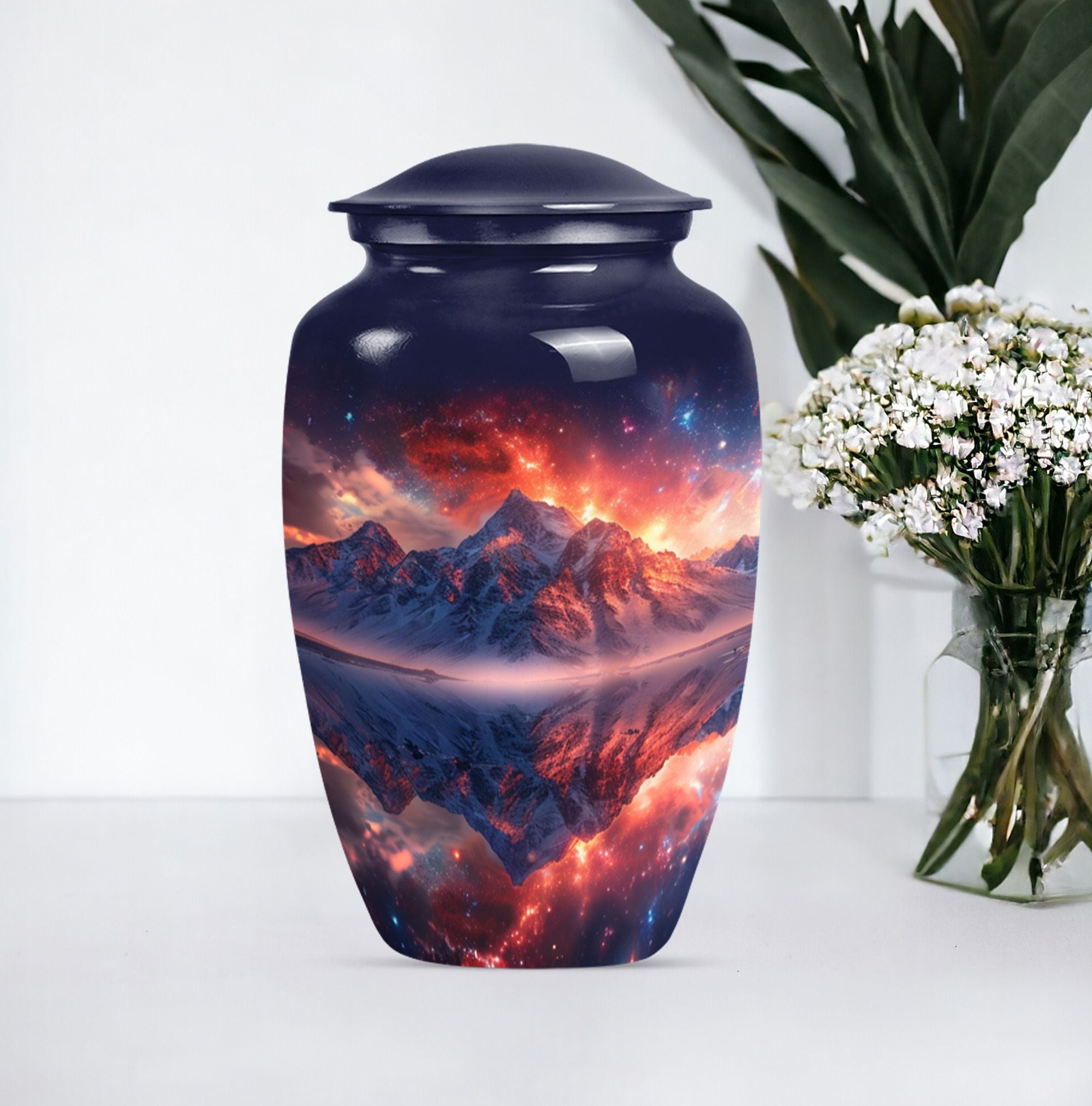 Experience serene remembrance with our durable mountaintop large urns. A perfect memento for your treasured ones embodied in a 10-Inch size, classic abstract themed burial ash urns for humans. Made with quality Aluminium, this memorial urn weighs 3.3 pounds and has the spacious capacity of 200 cubic inches, to securely hold the ashes of an adult. Personalize your urn with engraved names, to keep your beloved closer. These urns for adult cremation ashes are perfect for both men and women, offering a thoughtful way to honor the memory of your dear one. This urn comes with a soft, velvet pouch providing an elegant containment solution for the ashes. Uniquely handcrafted, our urns combine sophistication and simplicity in design. The quintessential choice for those looking for a dignified resting place for their loved ones.