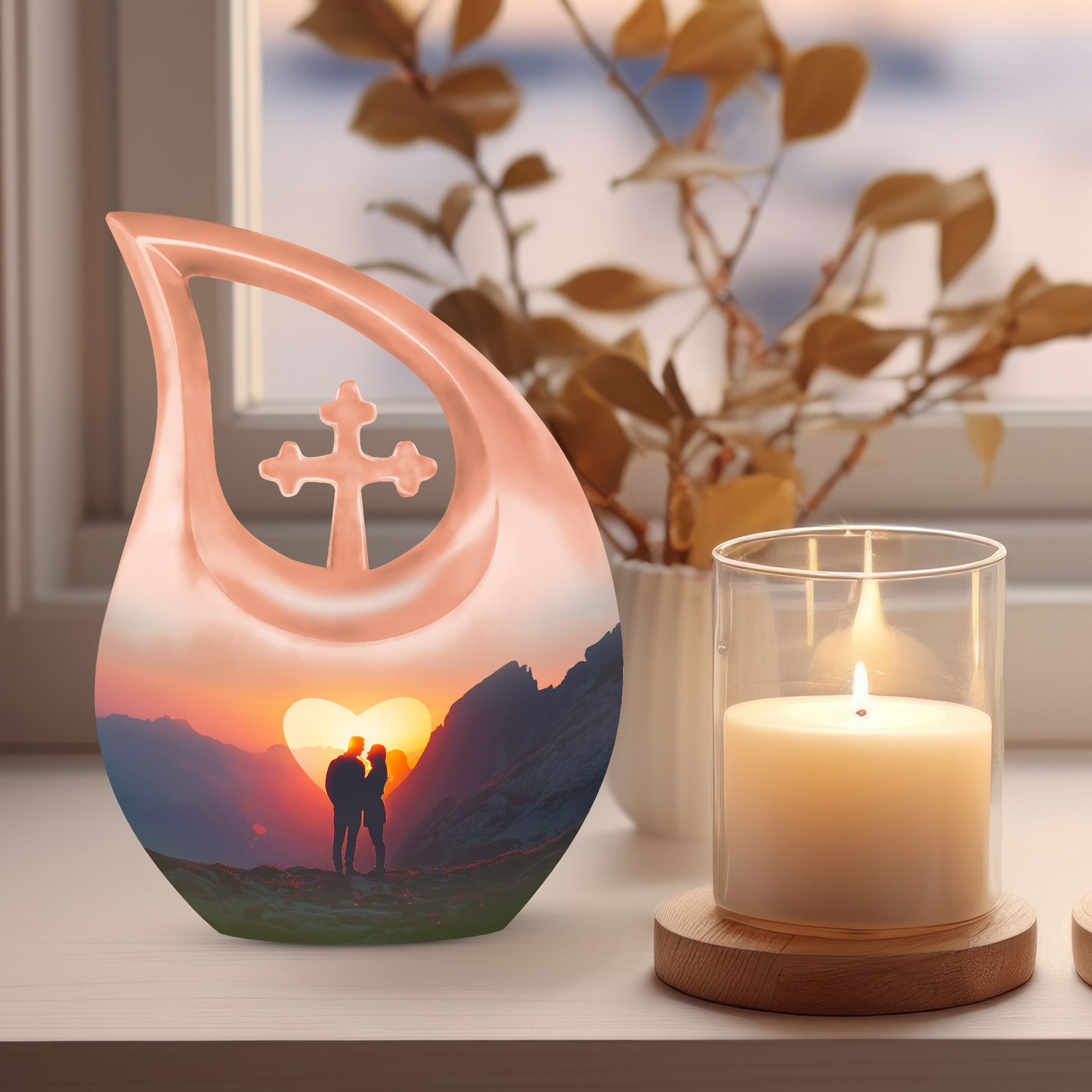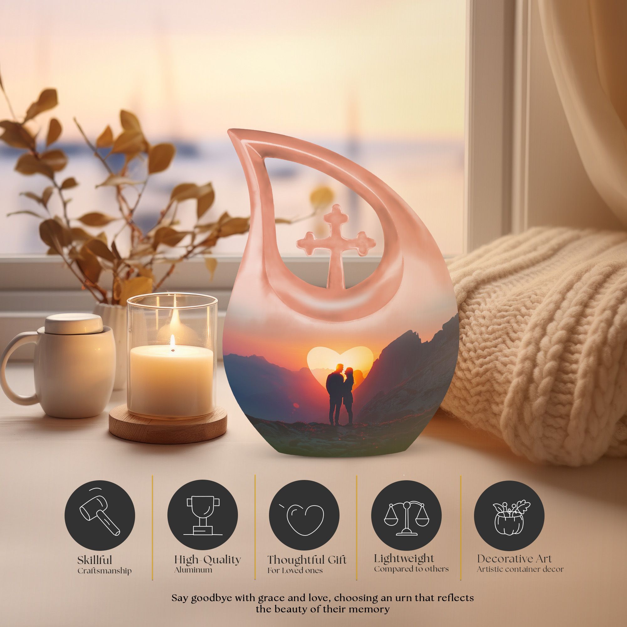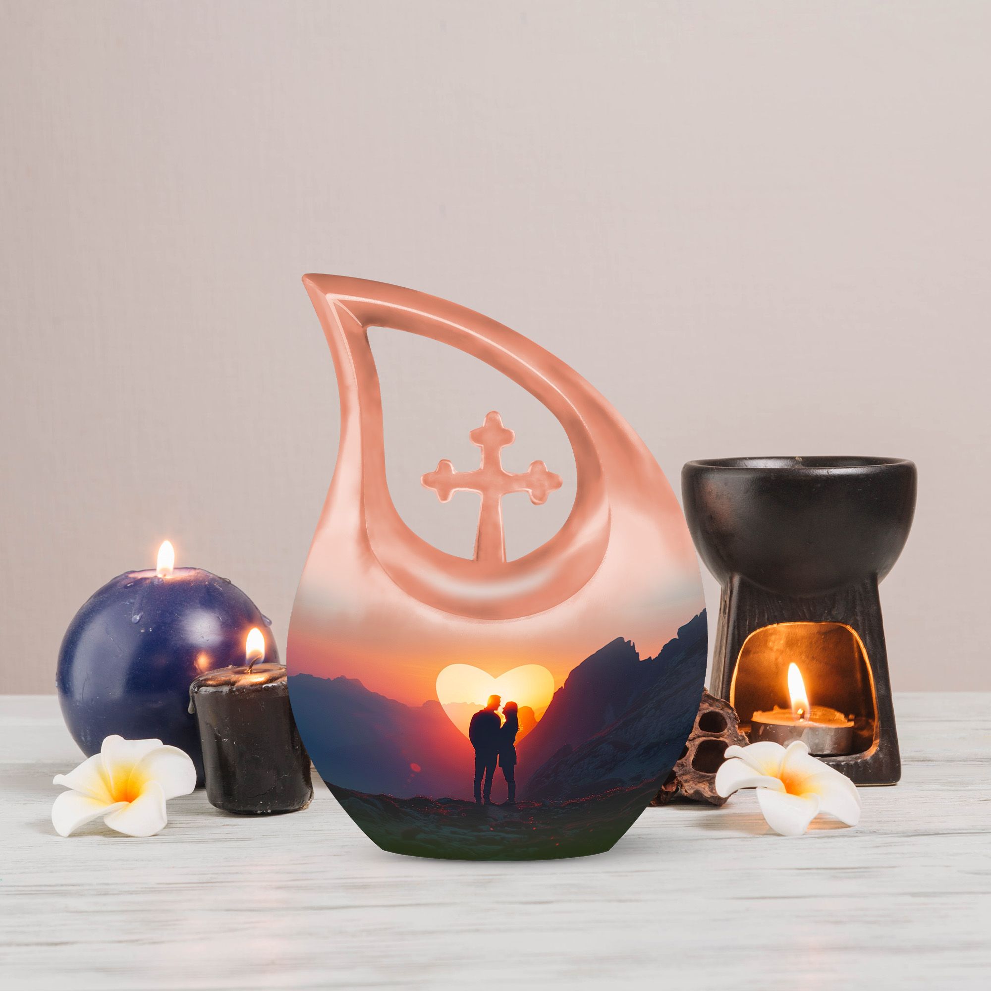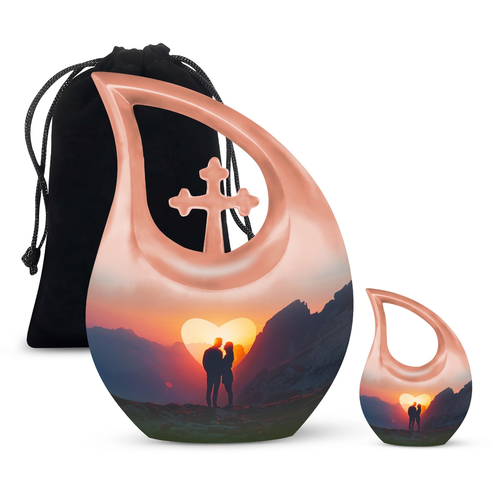 Experience the serenity and peace of the Mountain Silhouette Love Urn, a fitting tribute for your loved one. This elegant cremation monument stands 10 inches, capable of holding up to 200 cubic inches of ashes, offering ample space for adults and seniors. Weighing only 3.3 pounds and made from premium quality aluminium, this durable piece is made to last. Its unique cross-drop motif, added to the mesmerizing mountain silhouette theme, embodies a sense of tranquility and perpetuity. Along with the urn, you will also receive a charming velvet pouch, ensuring discreet and respectful containment of your cherished one’s ashes. An added touch of personalization allows for names to be delicately engraved, creating a truly unique memento. Besides meeting your individual needs, this selection can also become a tasteful addition to your home decor, subtly symbolizing the eternal presence of your beloved. Uncommon terminology often sought in search queries include 'Urns that don't look like urns', 'Urns for ashes for adults male', 'Remembrance urns for ashes', 'Cremation urn liners'.