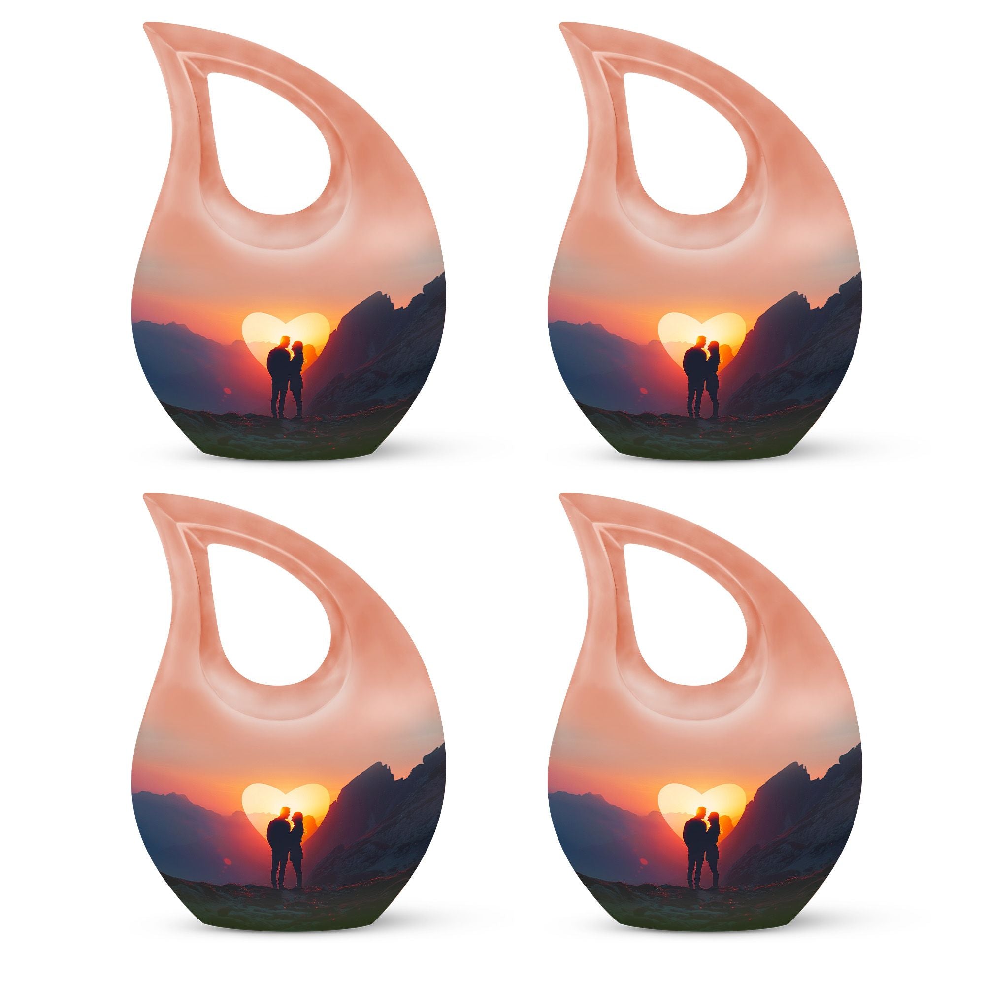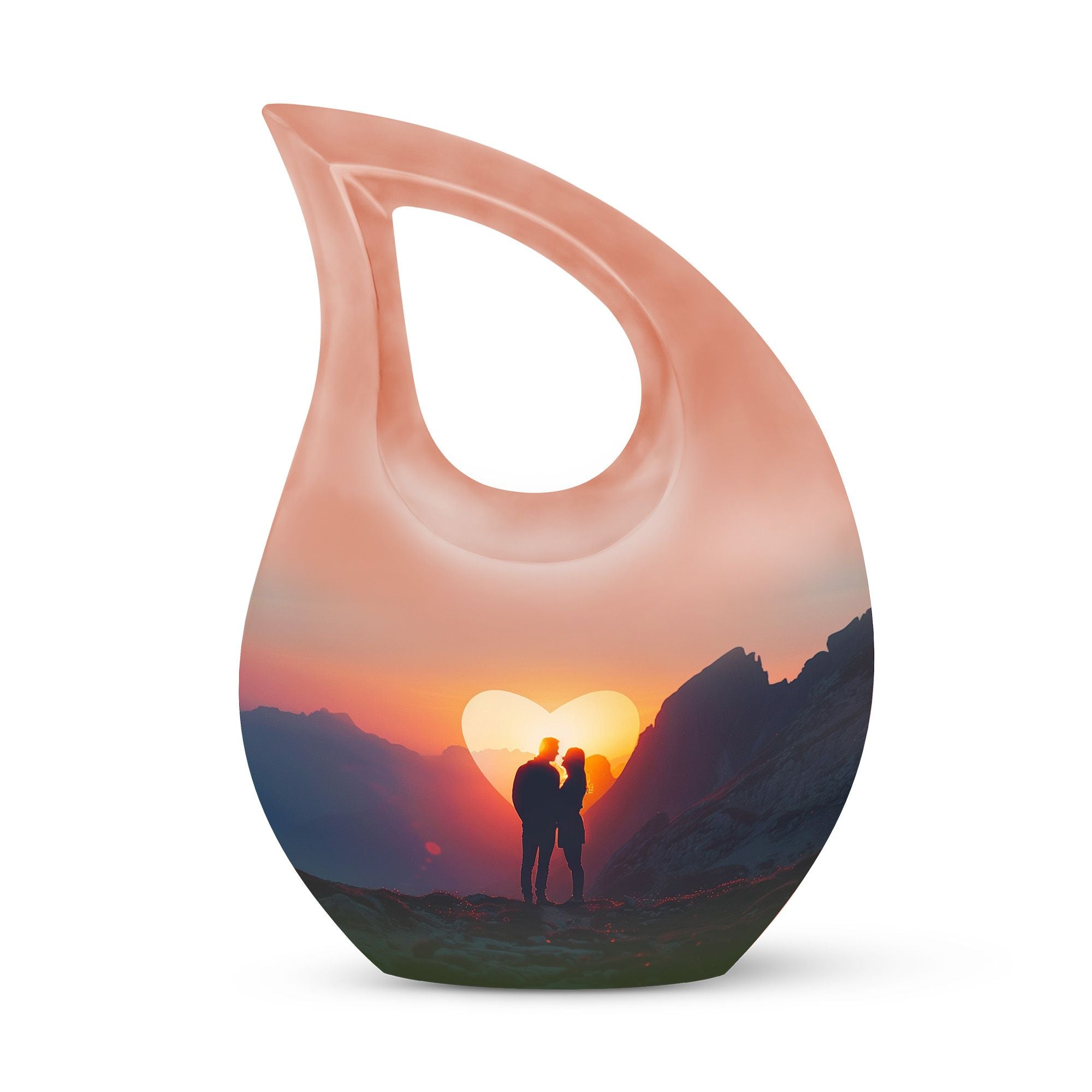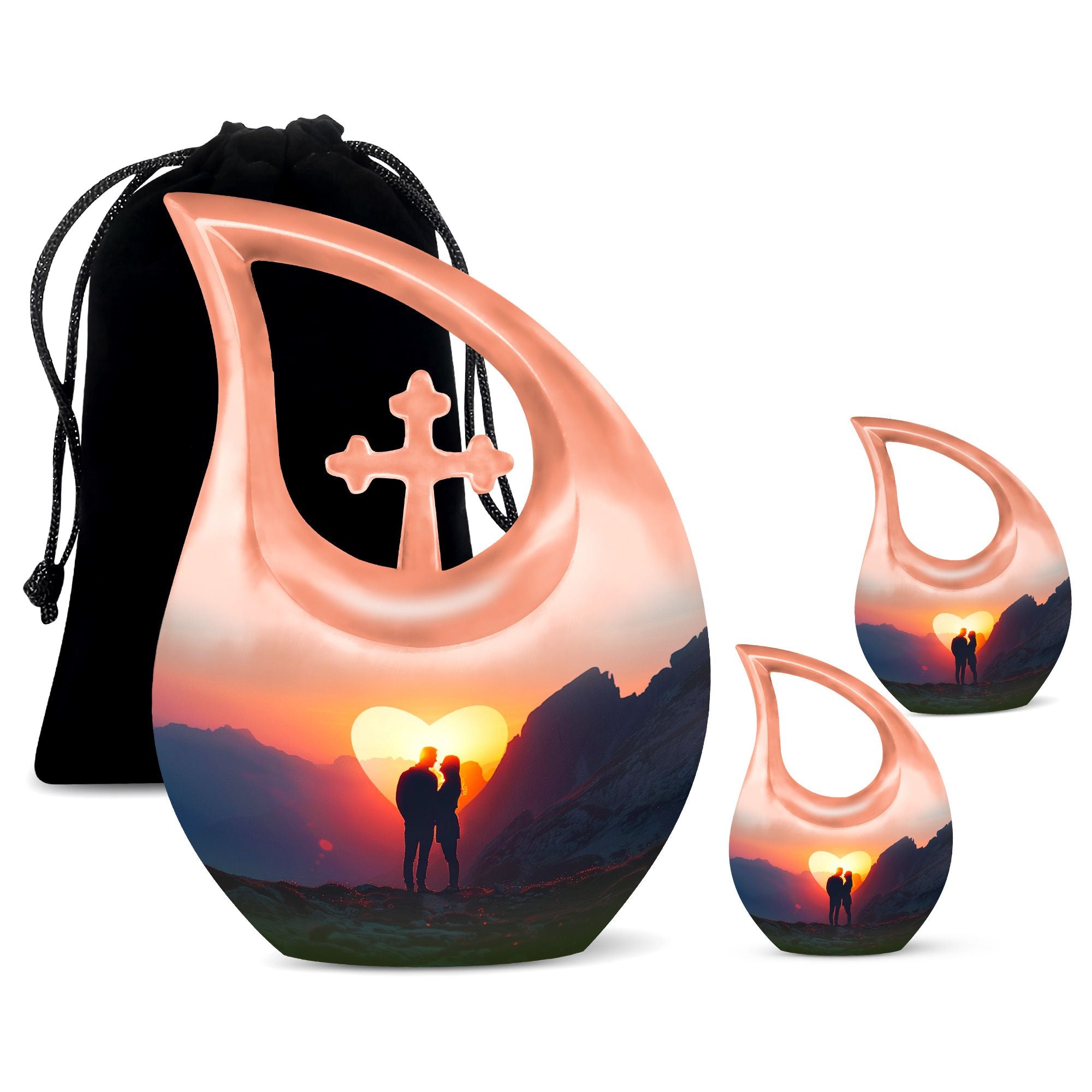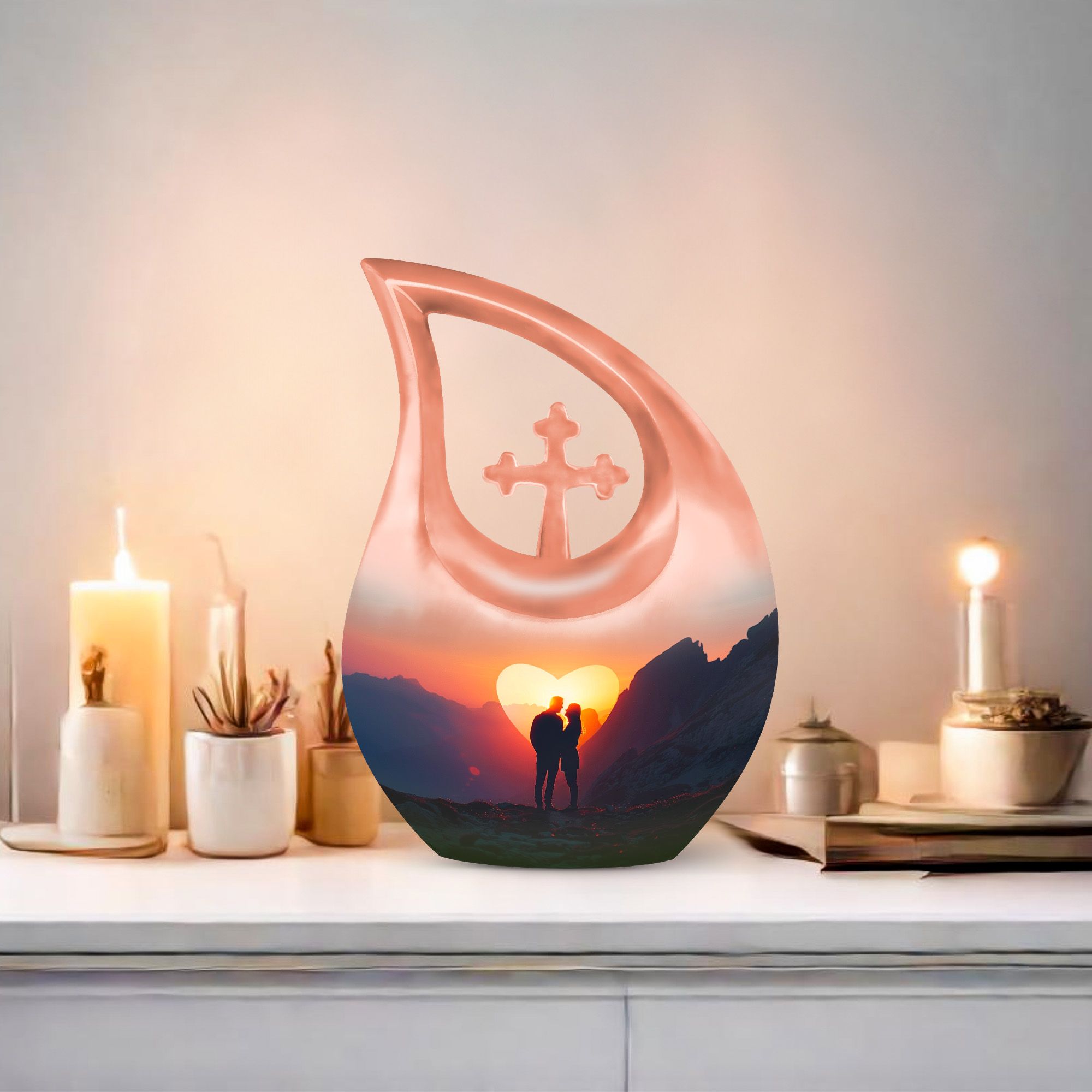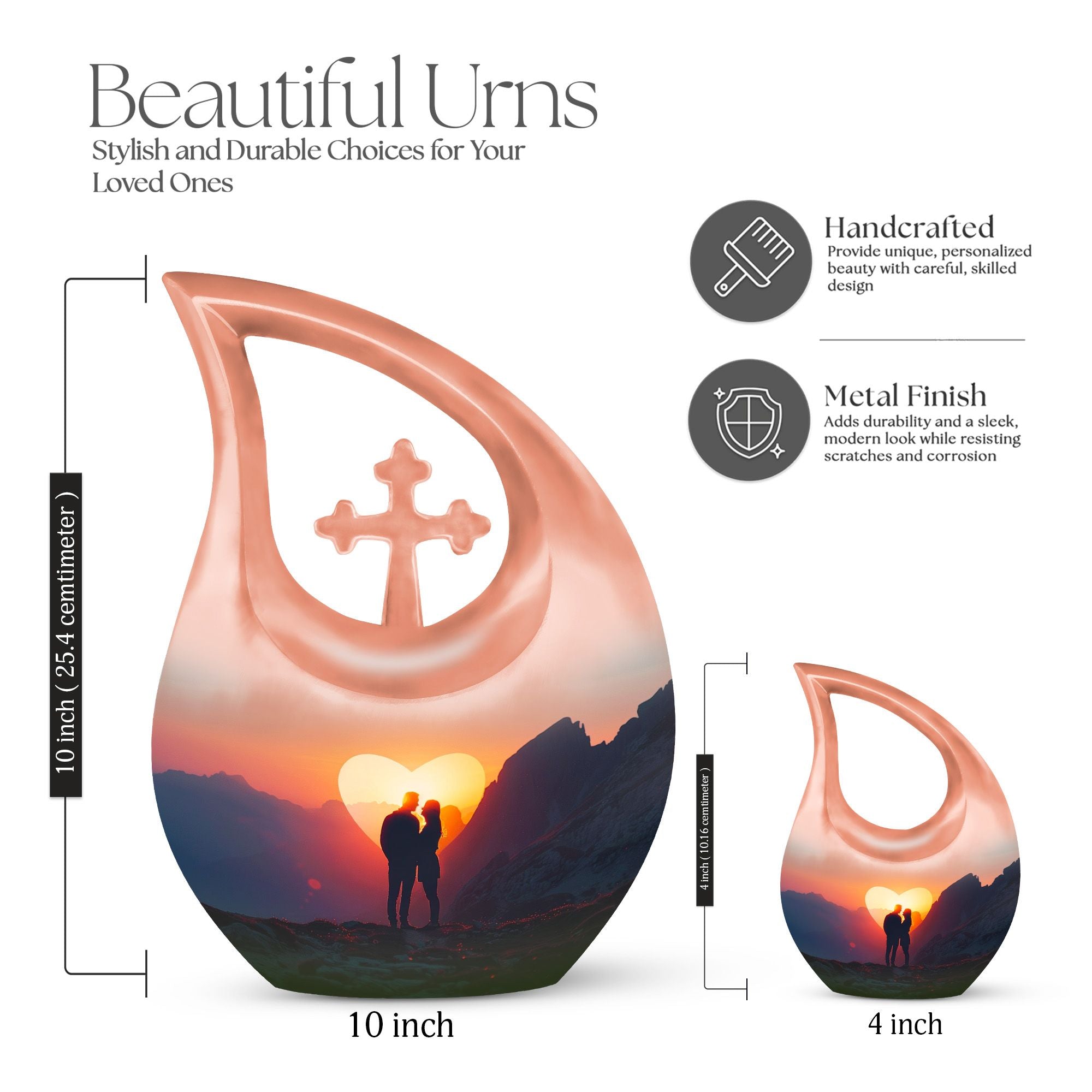 Experience the serenity and peace of the Mountain Silhouette Love Urn, a fitting tribute for your loved one. This elegant cremation monument stands 10 inches, capable of holding up to 200 cubic inches of ashes, offering ample space for adults and seniors. Weighing only 3.3 pounds and made from premium quality aluminium, this durable piece is made to last. Its unique cross-drop motif, added to the mesmerizing mountain silhouette theme, embodies a sense of tranquility and perpetuity. Along with the urn, you will also receive a charming velvet pouch, ensuring discreet and respectful containment of your cherished one’s ashes. An added touch of personalization allows for names to be delicately engraved, creating a truly unique memento. Besides meeting your individual needs, this selection can also become a tasteful addition to your home decor, subtly symbolizing the eternal presence of your beloved. Uncommon terminology often sought in search queries include 'Urns that don't look like urns', 'Urns for ashes for adults male', 'Remembrance urns for ashes', 'Cremation urn liners'.