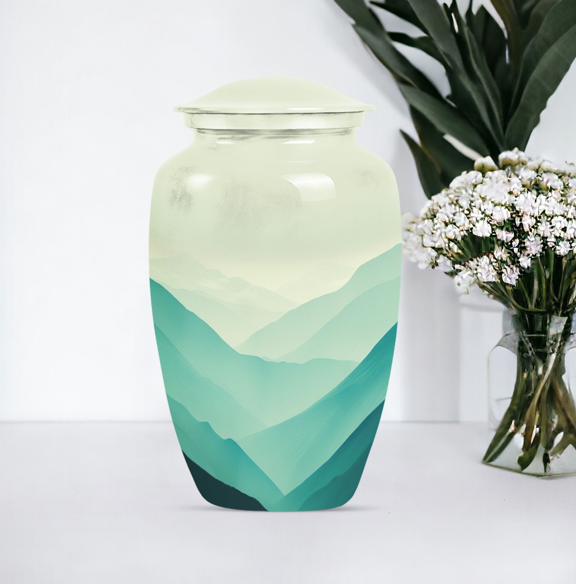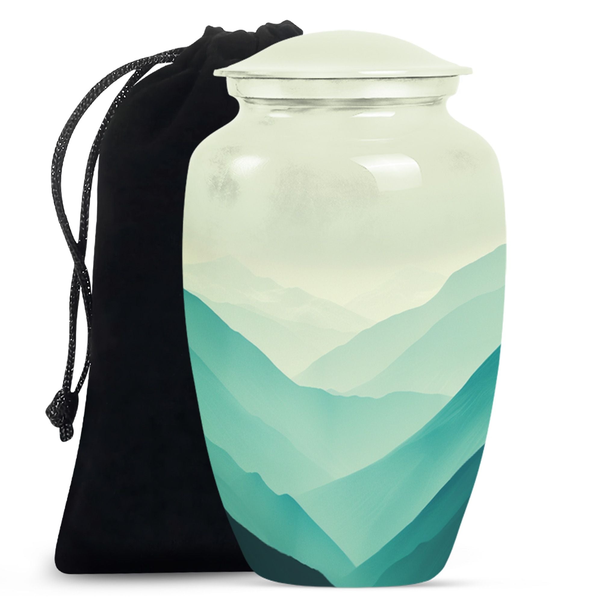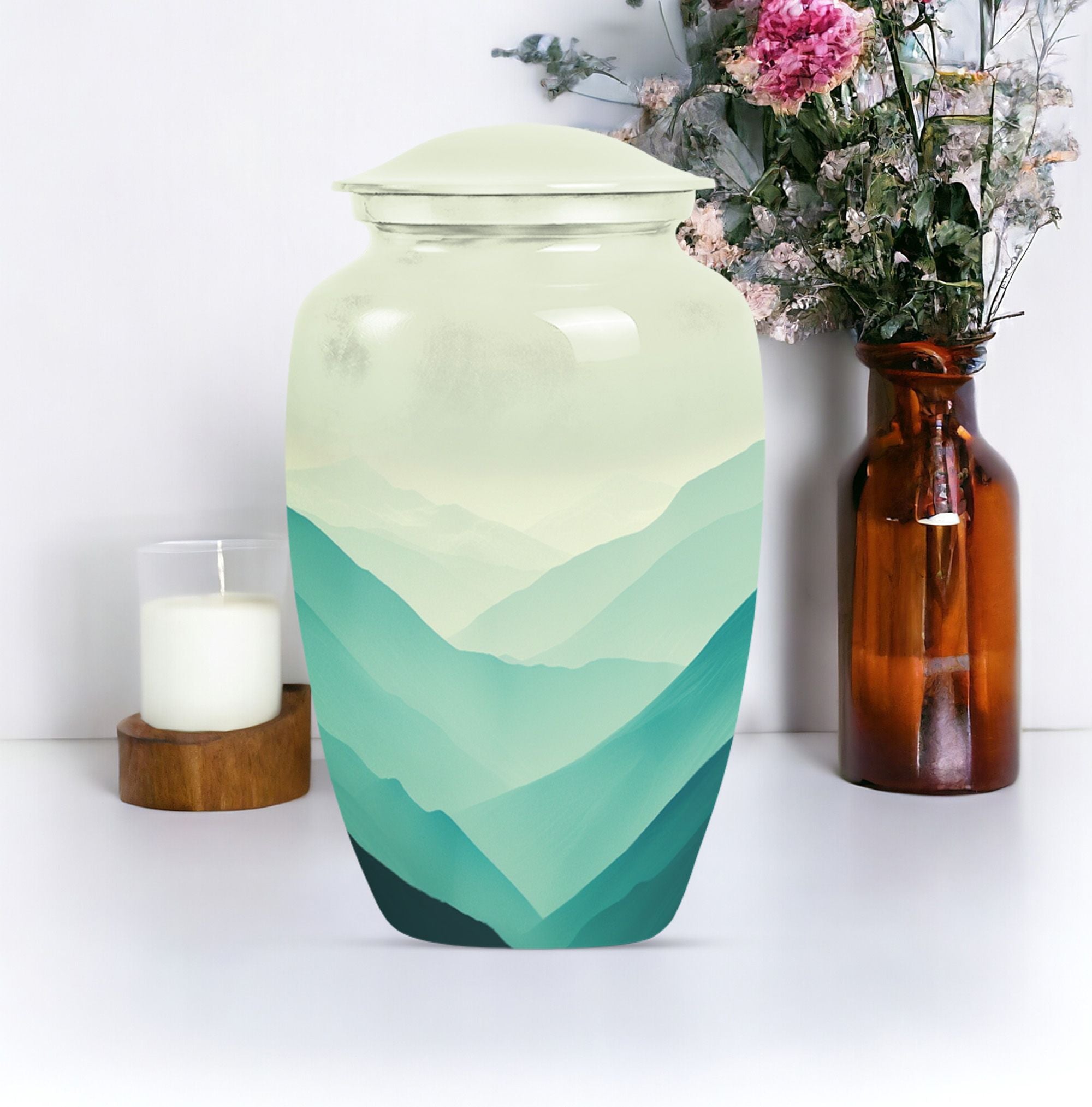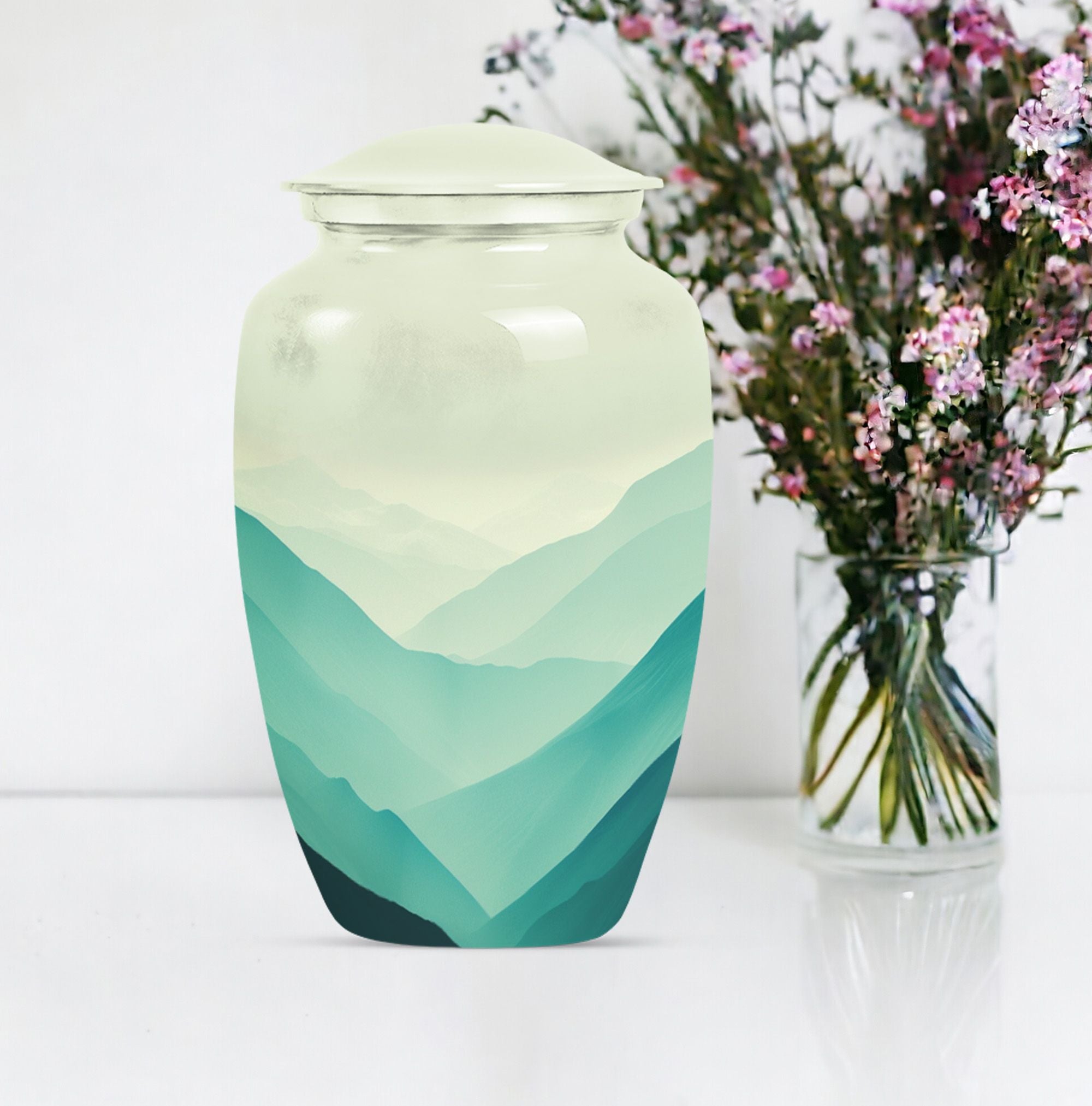 Find solace and comfort in memories with our endlessly protective 'Abstract mountains Urn'. Dedicatedly hand-picked for the ultimate memorial honour, this 10-inch classic urn artfully weaves class and resilience in its make. Its robust weight of 3.3 pounds and aluminium material were specifically selected for their timelessness and strength, providing an everlasting homage to your loved ones. This large urn boasts a generous capacity of 200 cubic inches, ensuring your cherished remains are well housed. Our packaging ensures the preservation of your treasured memories, as the urn comes with a luxuriously soft velvet pouch for secure containment of ashes. A humble yet heart-touching personal touch can be added with engraved names, making it not just an urn, but a carrier of immense love and remembrance. Encompassing keyword phrases such as 'memorial urns', 'urns for human ashes adult', and 'Funeral medium size urns for human ashes', our product is a gentleserene reminder of everlasting bonds and eternal memories.