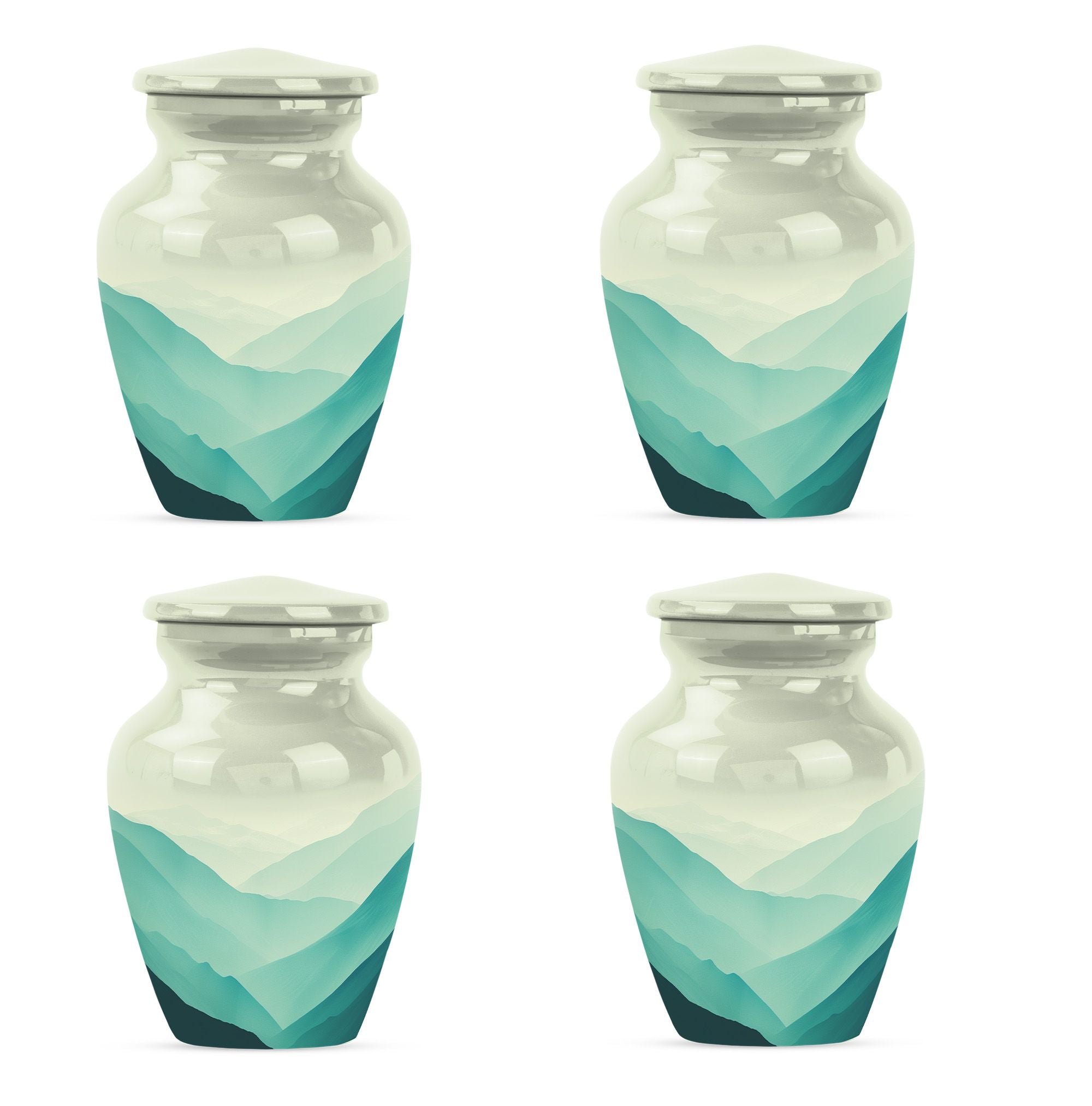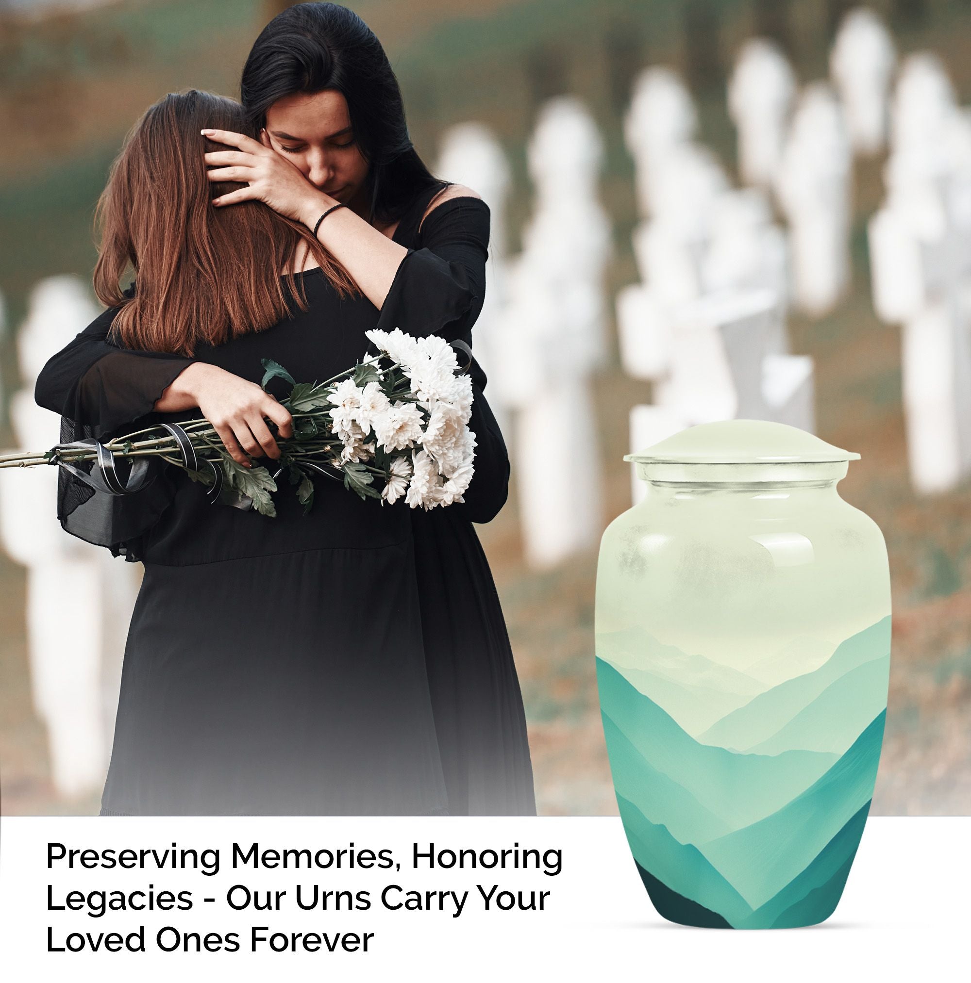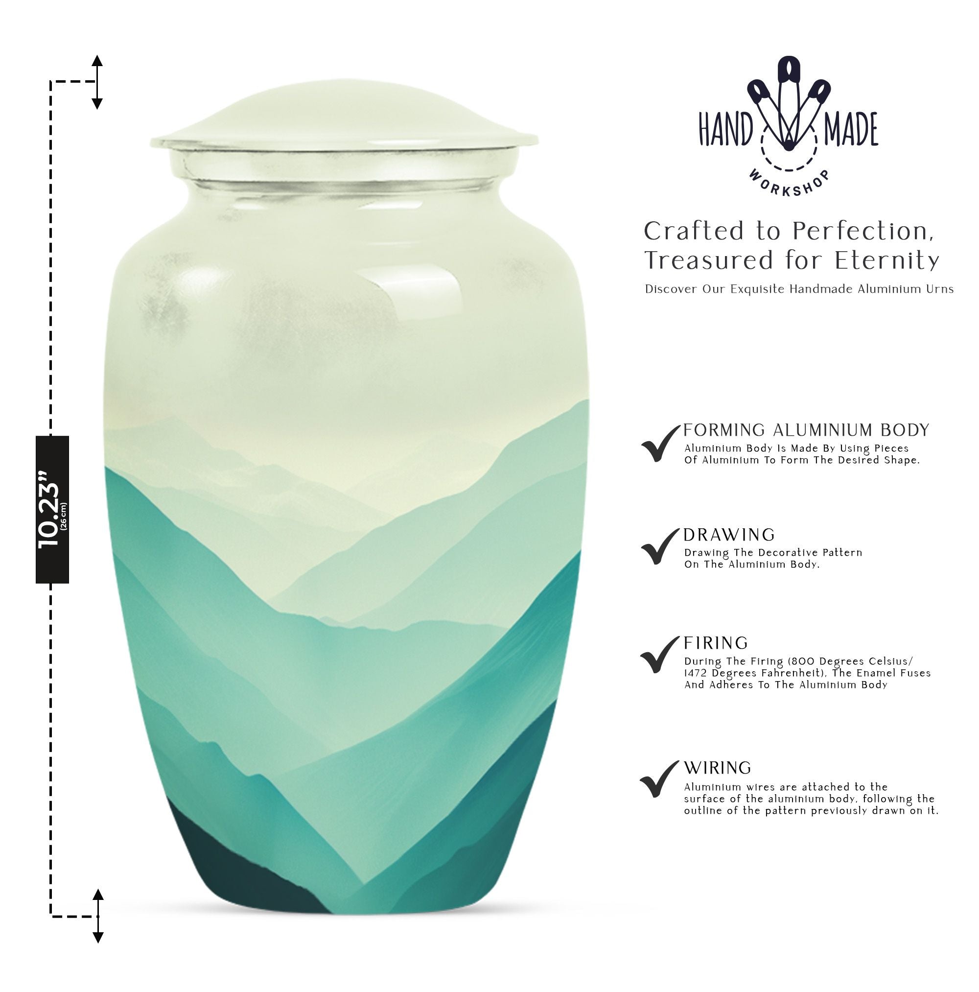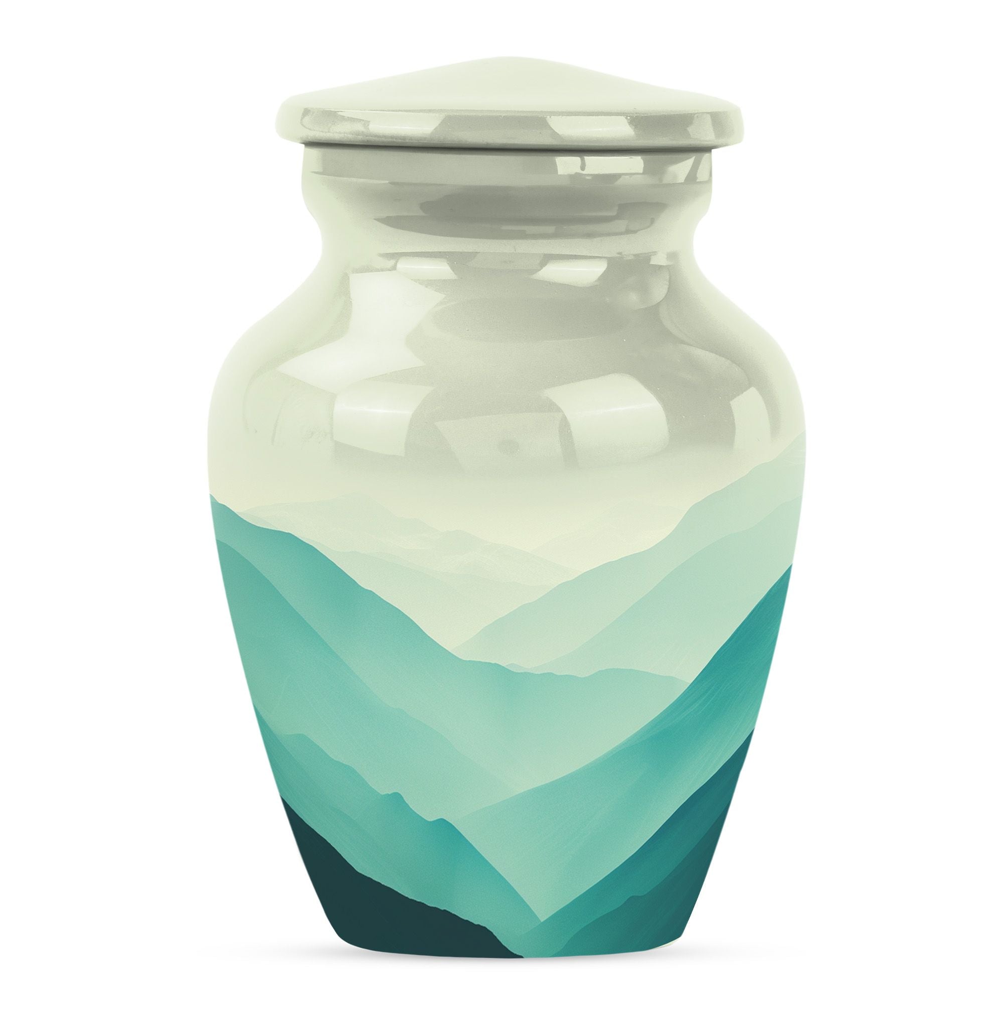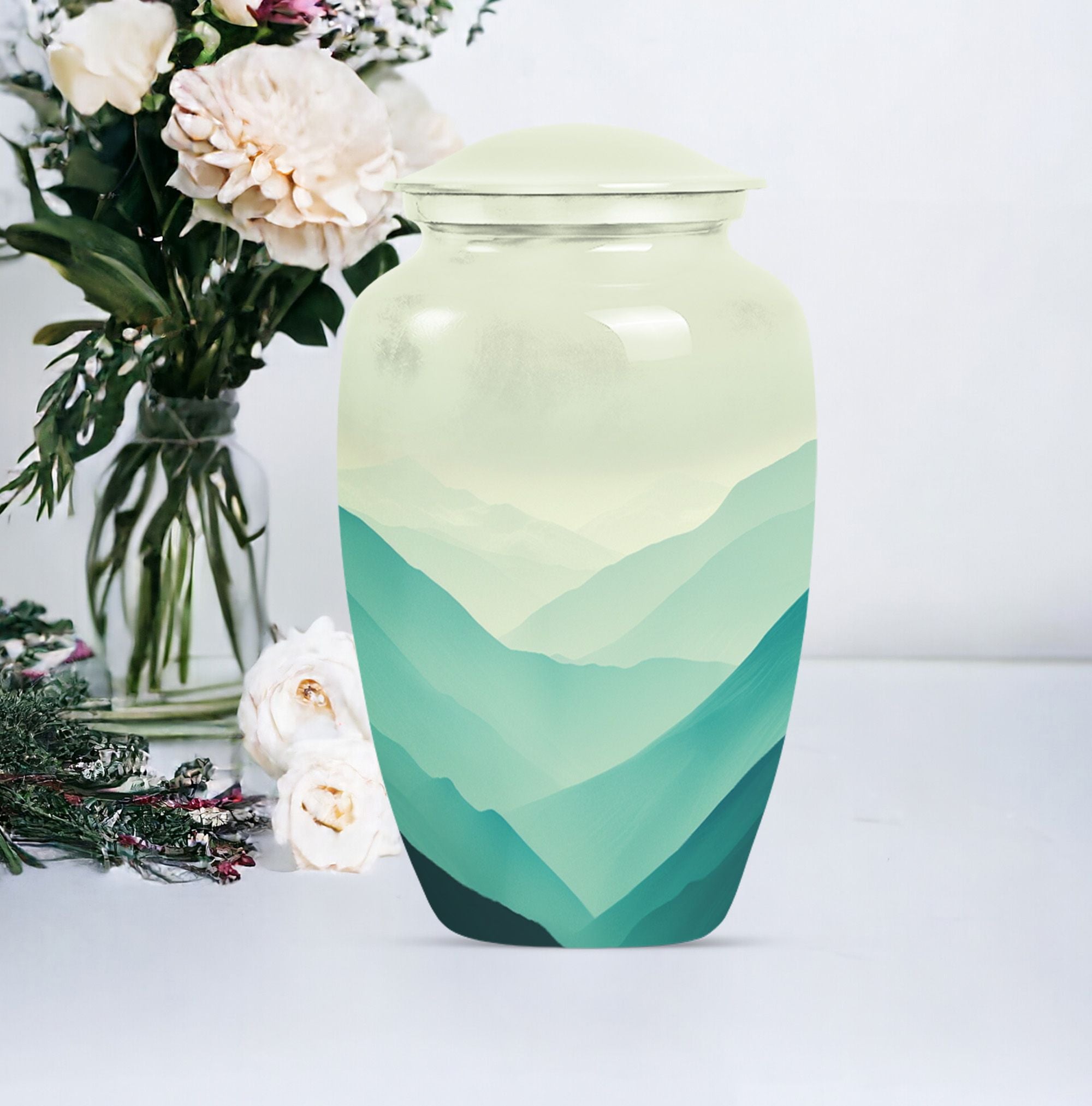 Find solace and comfort in memories with our endlessly protective 'Abstract mountains Urn'. Dedicatedly hand-picked for the ultimate memorial honour, this 10-inch classic urn artfully weaves class and resilience in its make. Its robust weight of 3.3 pounds and aluminium material were specifically selected for their timelessness and strength, providing an everlasting homage to your loved ones. This large urn boasts a generous capacity of 200 cubic inches, ensuring your cherished remains are well housed. Our packaging ensures the preservation of your treasured memories, as the urn comes with a luxuriously soft velvet pouch for secure containment of ashes. A humble yet heart-touching personal touch can be added with engraved names, making it not just an urn, but a carrier of immense love and remembrance. Encompassing keyword phrases such as 'memorial urns', 'urns for human ashes adult', and 'Funeral medium size urns for human ashes', our product is a gentleserene reminder of everlasting bonds and eternal memories.