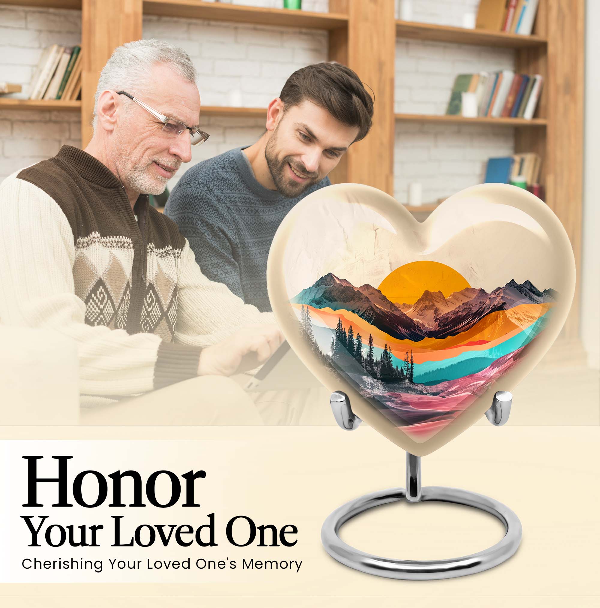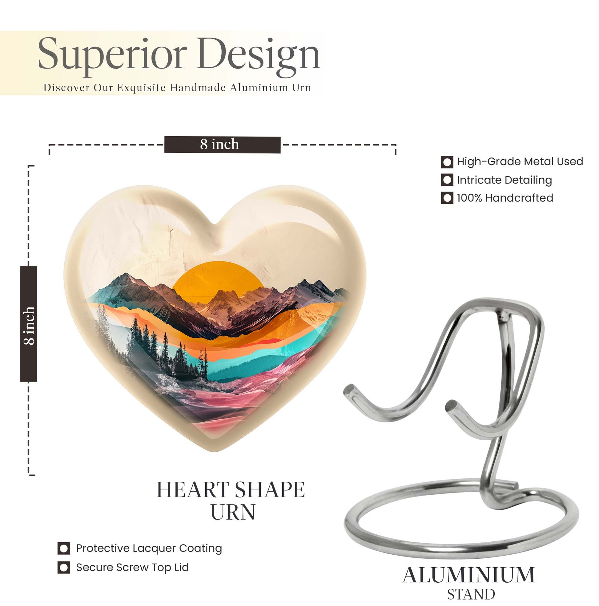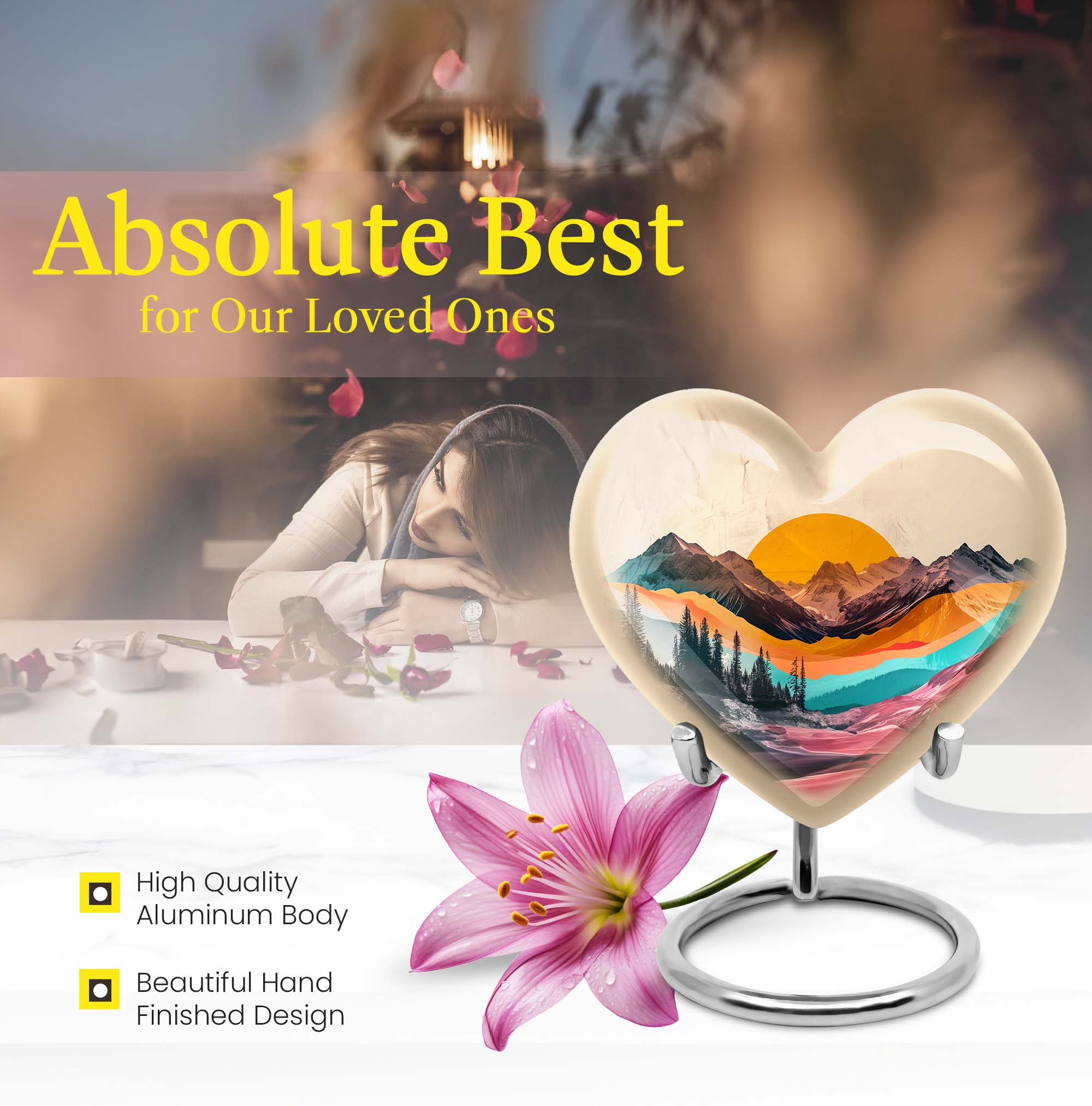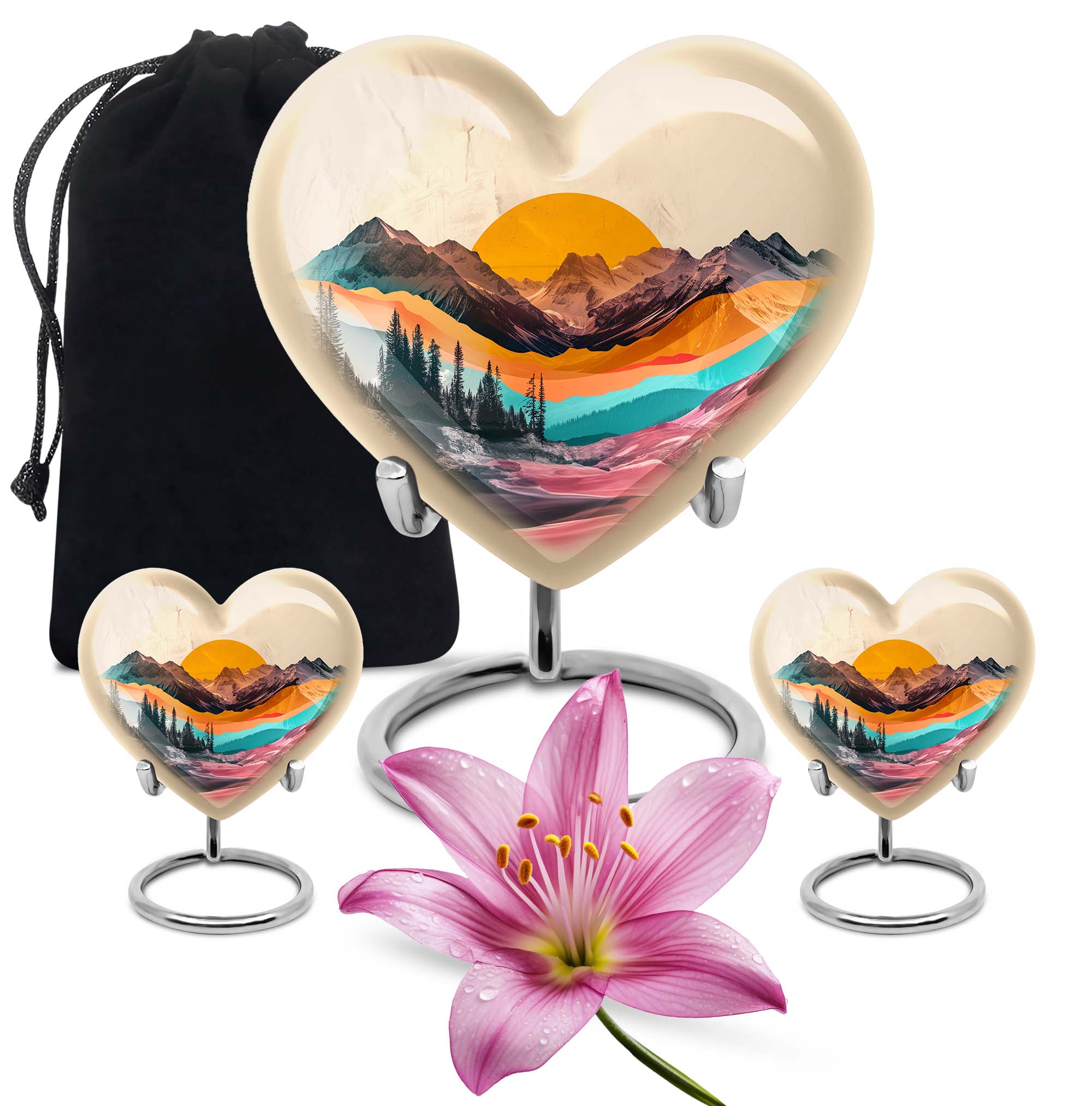 Our exquisite MOUNTAINS Urn offers an elegant and unique way to remember your loved ones. Beautifully crafted from durable Aluminium, this large-sized urn, measuring 10 inches in height, has been carefully designed to withstand the test of time. Weighing in at just 3.3 pounds, it has a capacity of 200 cubic inches, making it ideal for a variety of ceremonial uses. Each urn comes with a comfortable velvet pouch to elegantly contain the ashes. This cremation funeral urn embodies the serene tranquillity of a 'Purple Meadow', blending the reverence of the occasion with the soothing serenity of nature. For a more personal touch, this cremation urn allows for customization; engraved names can be added on request. This MOUNTAINS Urn is much more than a resting place; it's a heartfelt tribute to a loved one's memory.