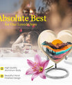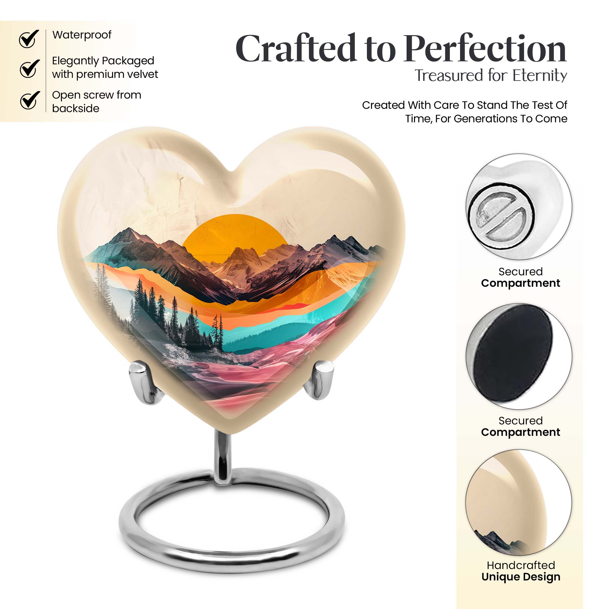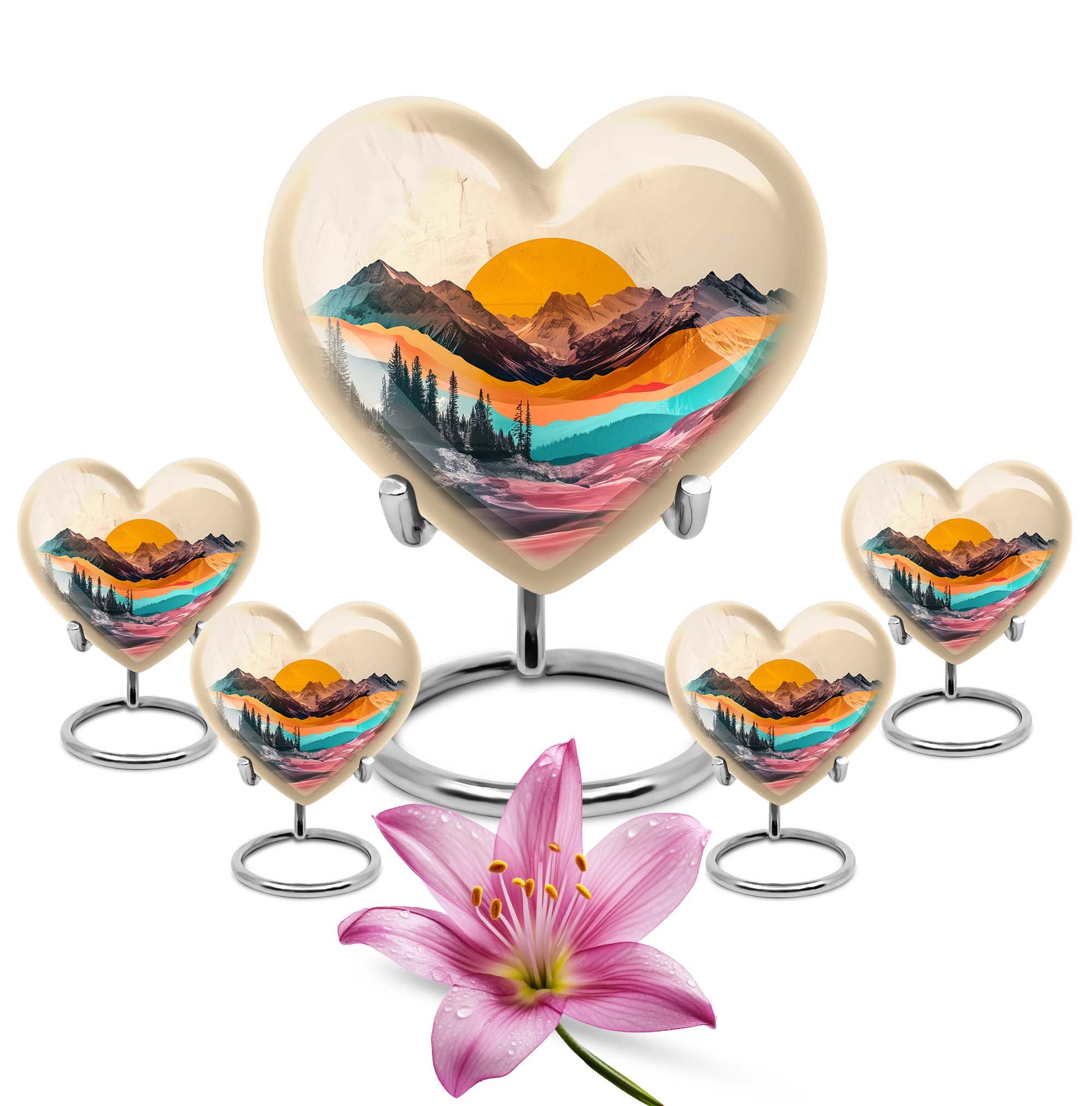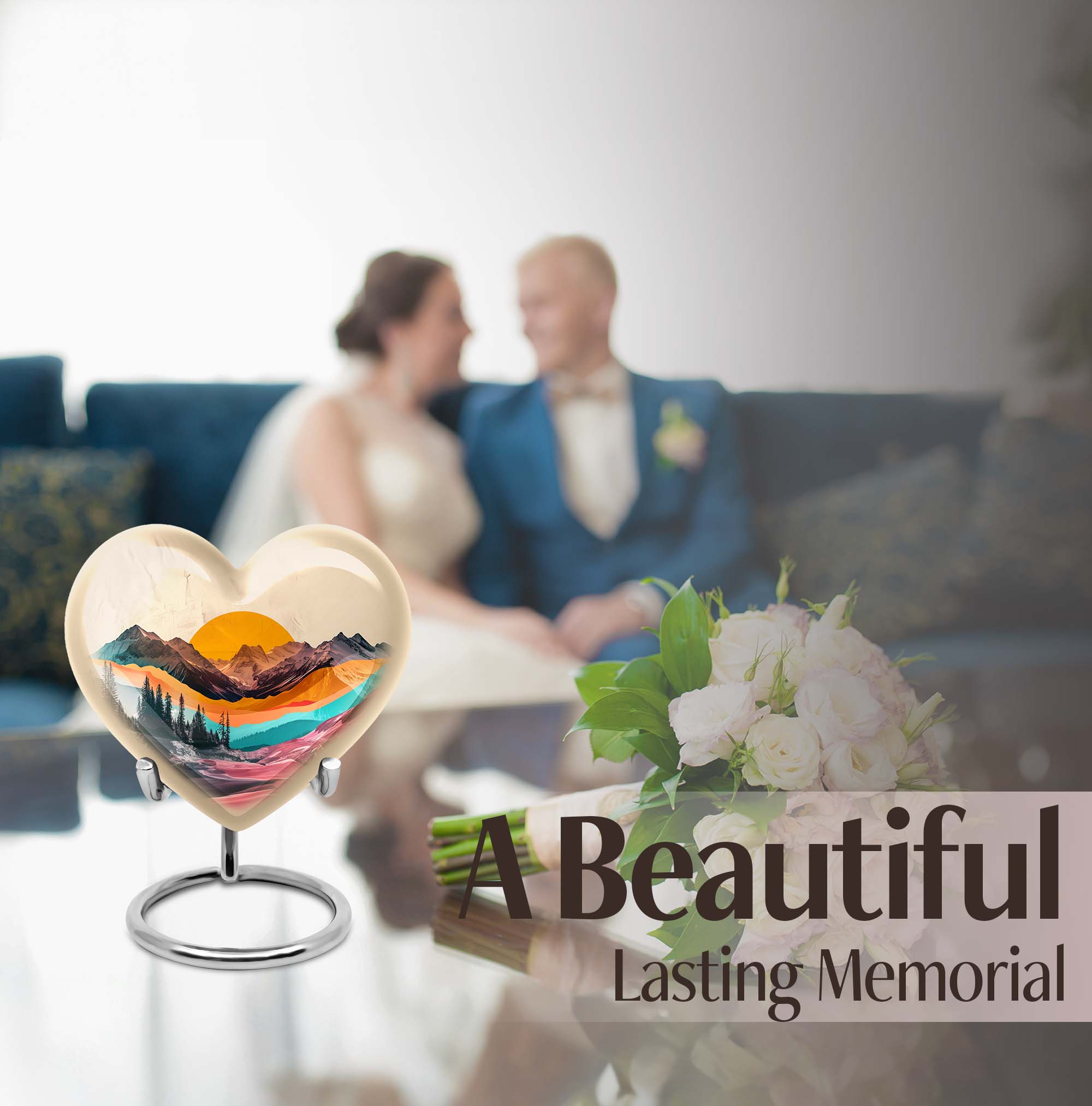 Our exquisite MOUNTAINS Urn offers an elegant and unique way to remember your loved ones. Beautifully crafted from durable Aluminium, this large-sized urn, measuring 10 inches in height, has been carefully designed to withstand the test of time. Weighing in at just 3.3 pounds, it has a capacity of 200 cubic inches, making it ideal for a variety of ceremonial uses. Each urn comes with a comfortable velvet pouch to elegantly contain the ashes. This cremation funeral urn embodies the serene tranquillity of a 'Purple Meadow', blending the reverence of the occasion with the soothing serenity of nature. For a more personal touch, this cremation urn allows for customization; engraved names can be added on request. This MOUNTAINS Urn is much more than a resting place; it's a heartfelt tribute to a loved one's memory.
