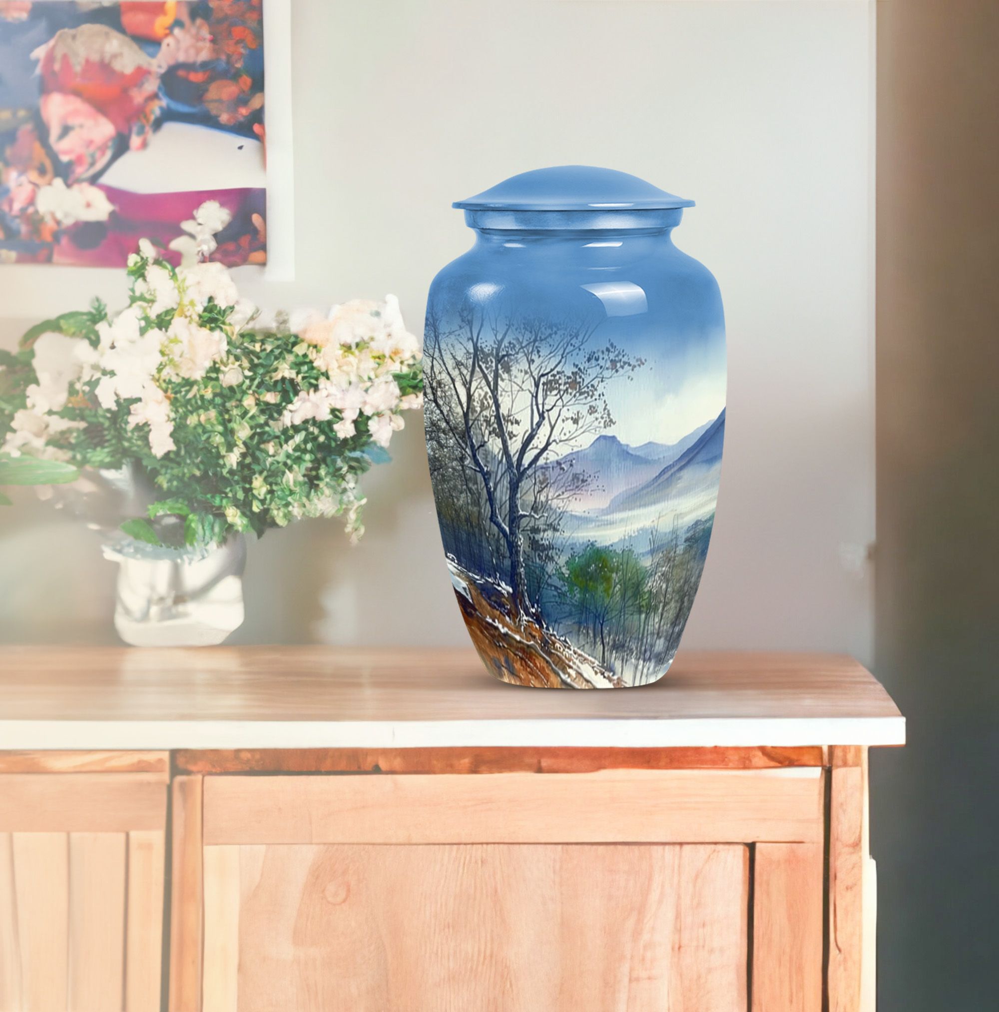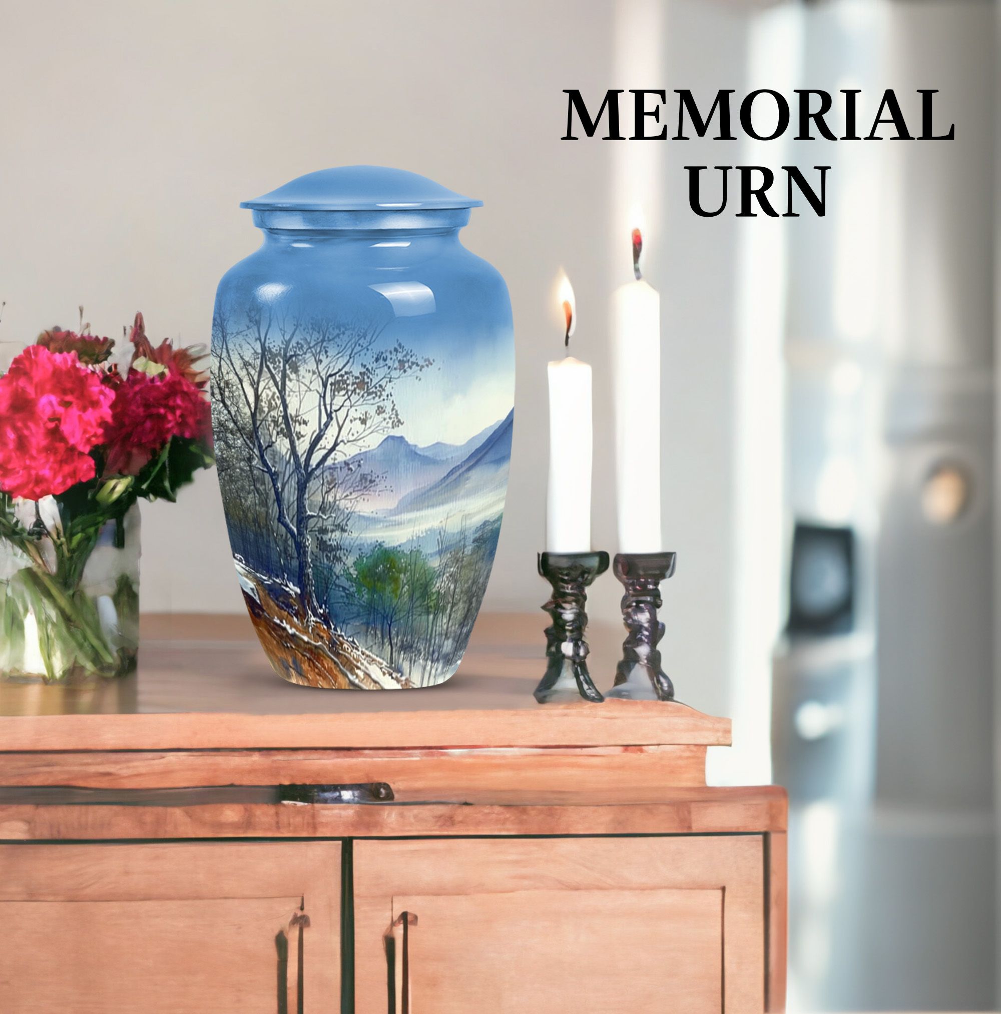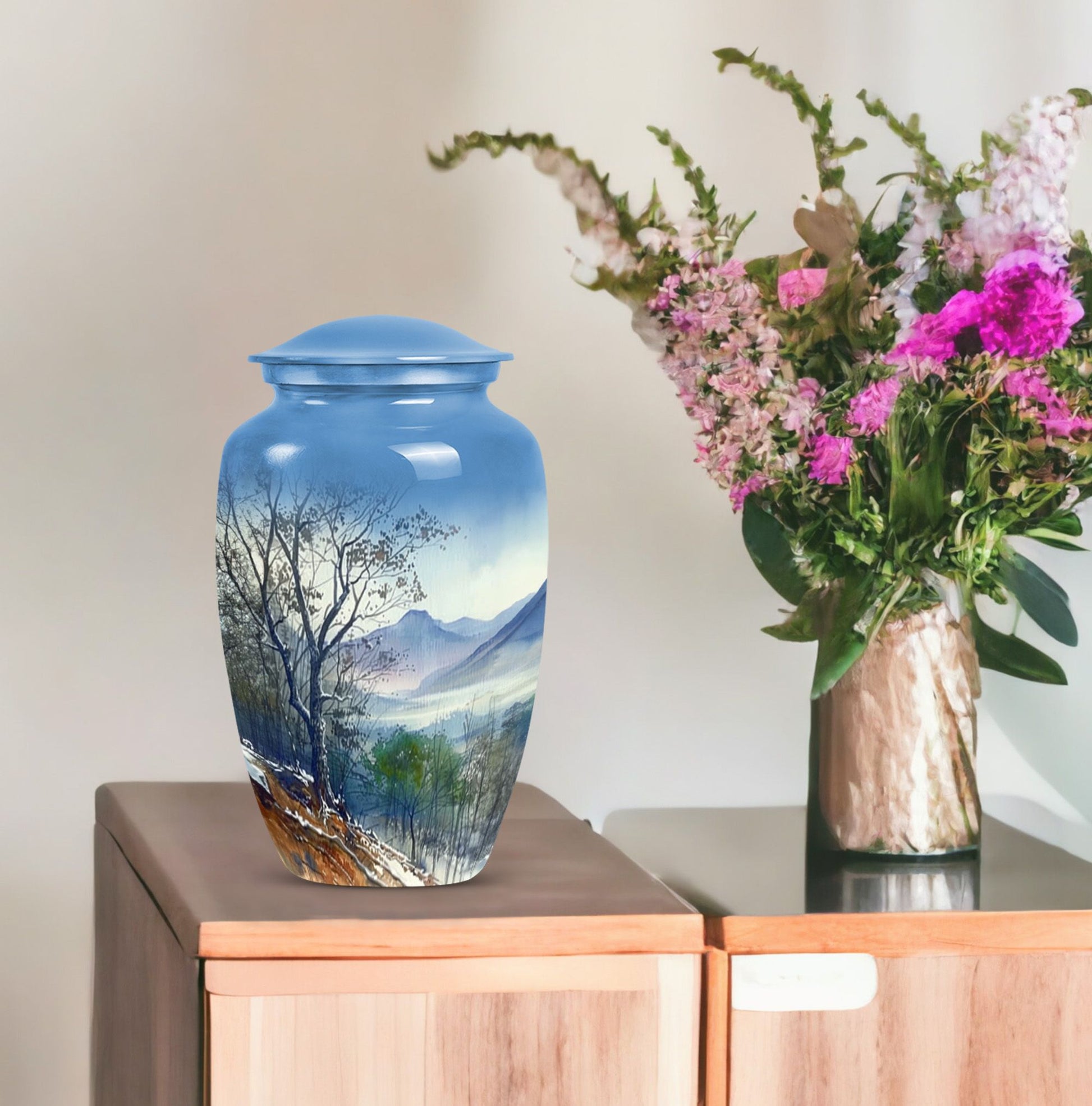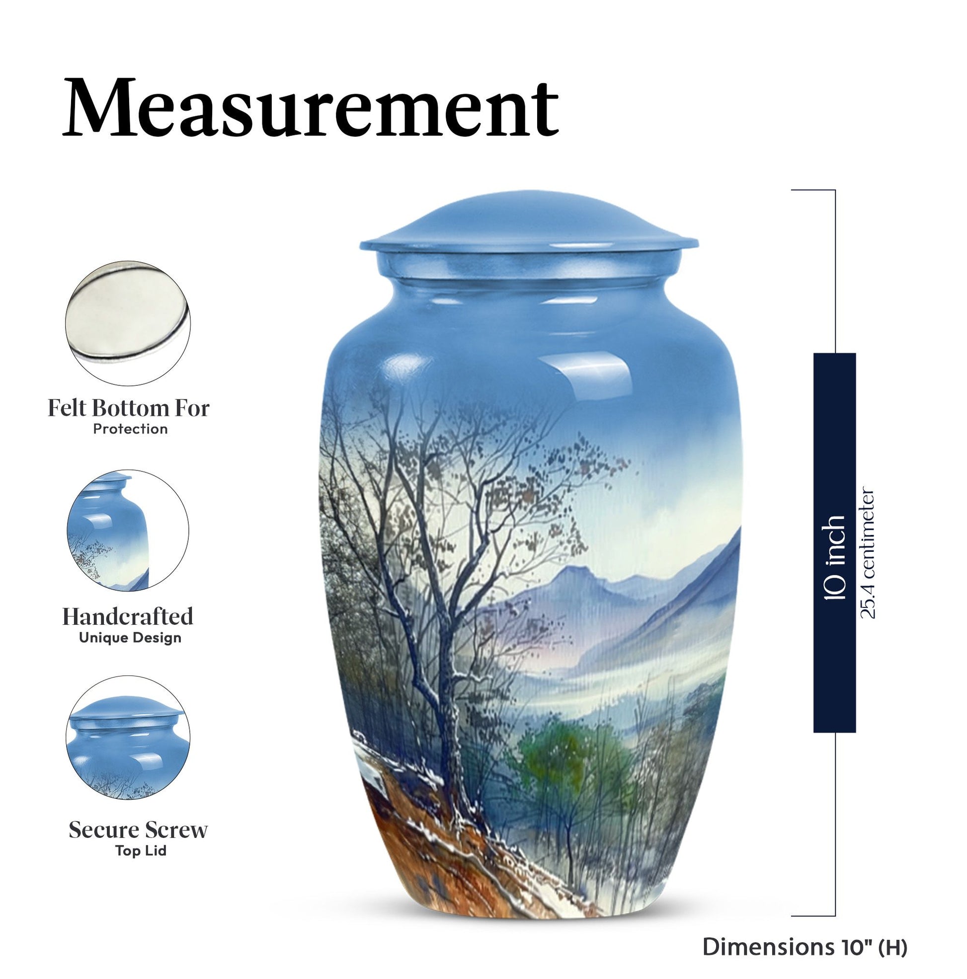 Our 'Mountain Urn' captures the majesty of nature, offering a unique way to honor your loved one's passage with an abstract, revering memory encapsulated in funeral ash urns. Standing 10 inches tall and capable of holding up to 200 cubic inches of ashes, this Large Urn is diligently crafted from high-quality Aluminium bestowing upon it a weight of just 3.3 pounds. This serves to reflect its enduring strength and the profound significance it serves. Personalized to embody their unique spirit, this memorial urn allows for engraving names making it a truly bespoke monument in their honor. The package also includes a tastefully designed velvet pouch for secure containment of the ashes. Ideal for those seeking unique urns or metal urns for adult human ashes, it seamlessly combines artistry with purpose. Reflecting solemn tribute, the Mountains Urn is a resplendent memorial urn for mom ashes or any loved one, inside your home.