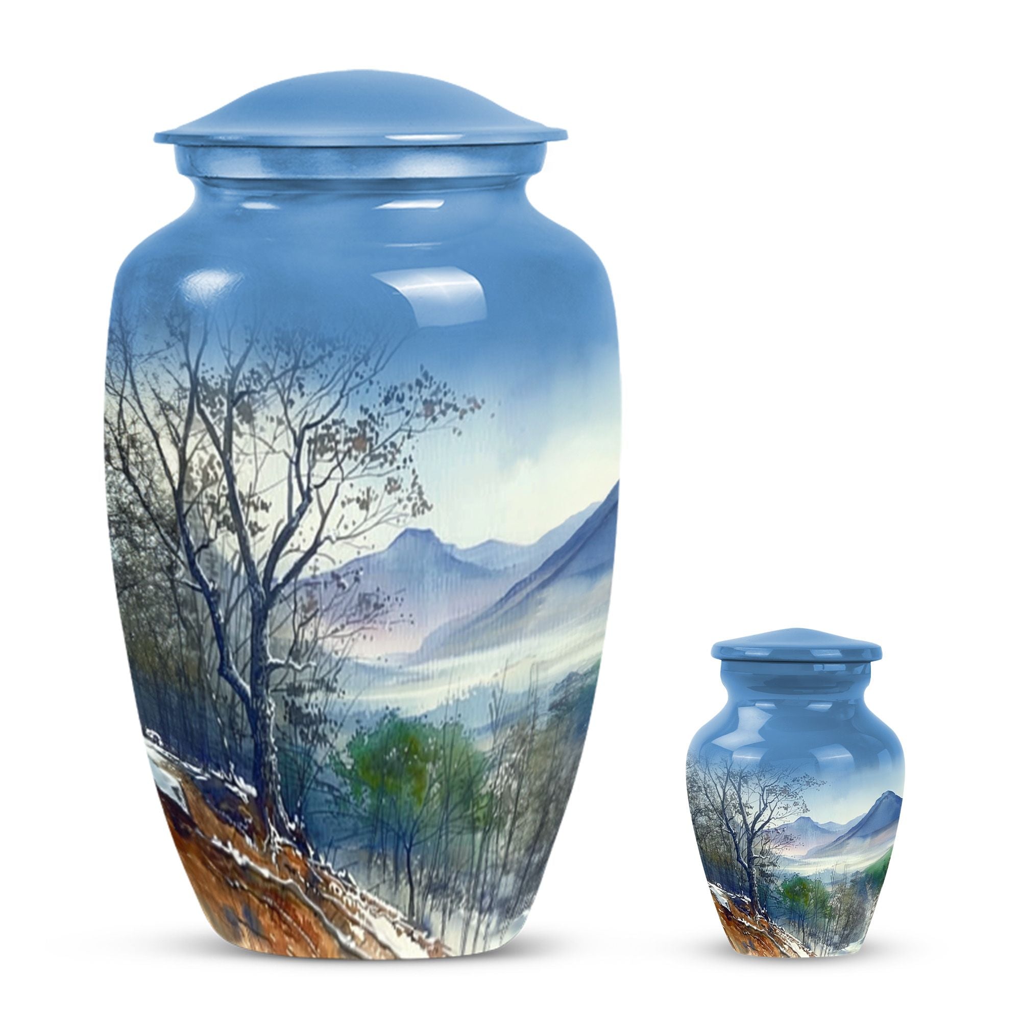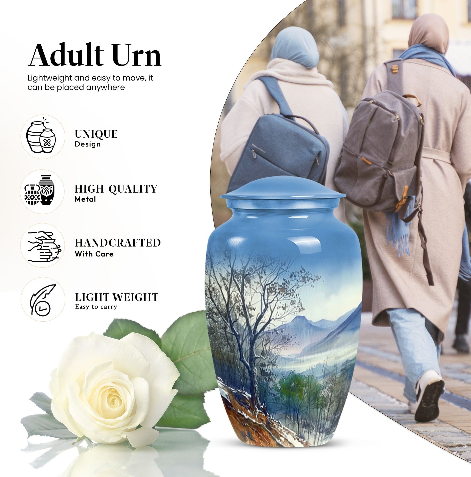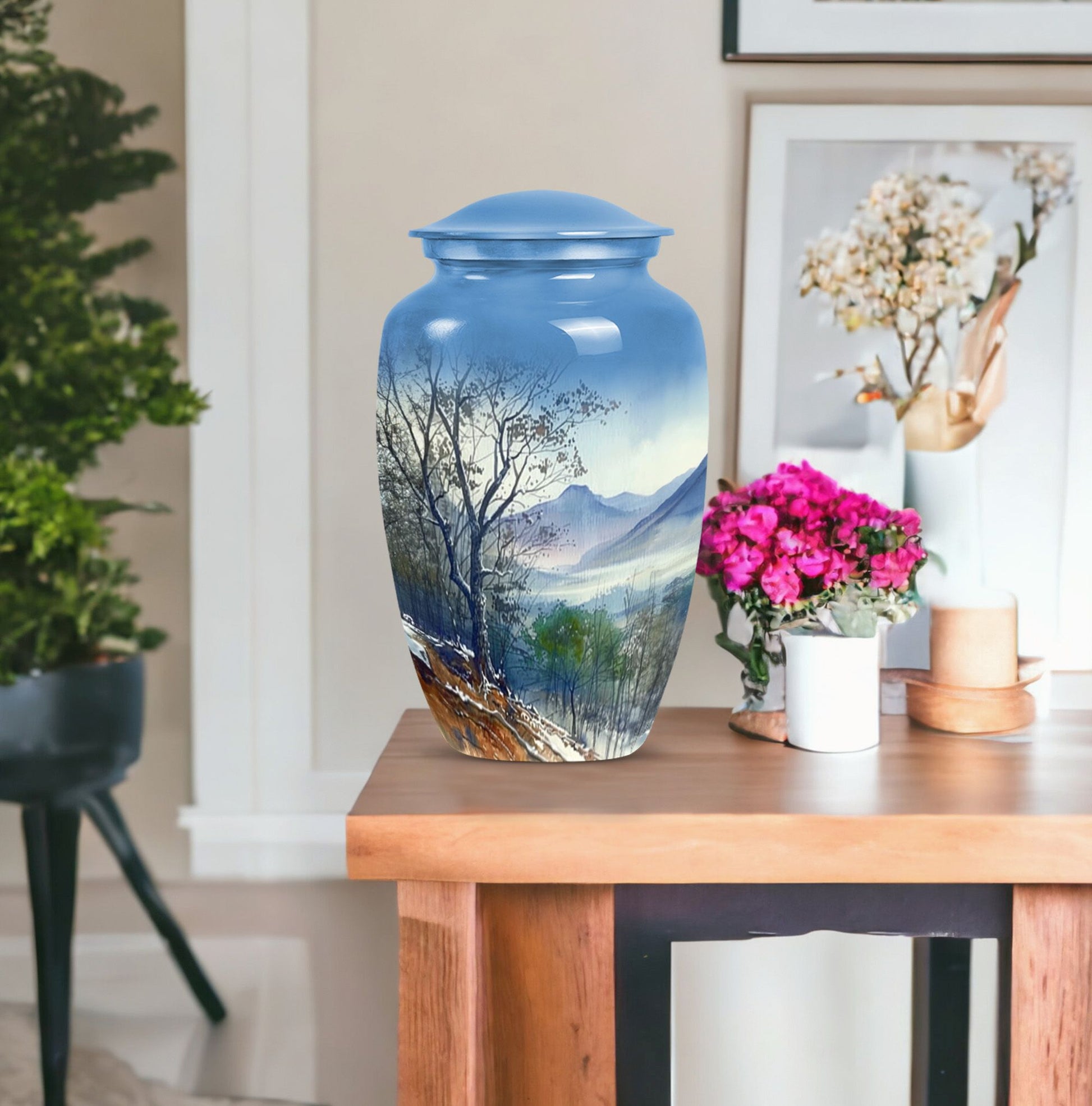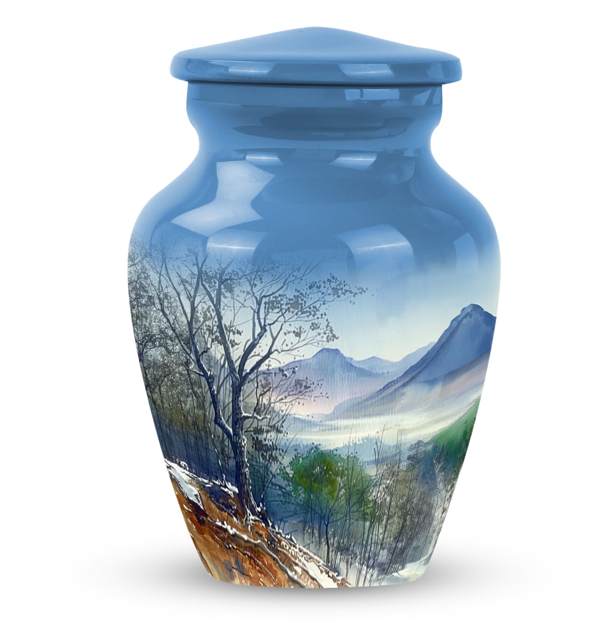 Our 'Mountain Urn' captures the majesty of nature, offering a unique way to honor your loved one's passage with an abstract, revering memory encapsulated in funeral ash urns. Standing 10 inches tall and capable of holding up to 200 cubic inches of ashes, this Large Urn is diligently crafted from high-quality Aluminium bestowing upon it a weight of just 3.3 pounds. This serves to reflect its enduring strength and the profound significance it serves. Personalized to embody their unique spirit, this memorial urn allows for engraving names making it a truly bespoke monument in their honor. The package also includes a tastefully designed velvet pouch for secure containment of the ashes. Ideal for those seeking unique urns or metal urns for adult human ashes, it seamlessly combines artistry with purpose. Reflecting solemn tribute, the Mountains Urn is a resplendent memorial urn for mom ashes or any loved one, inside your home.