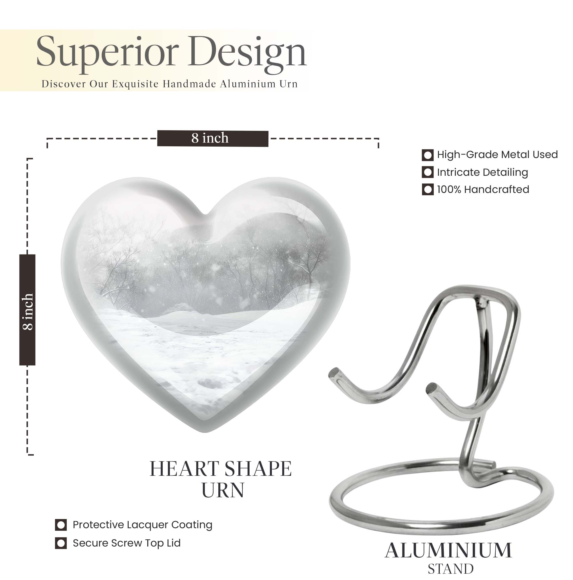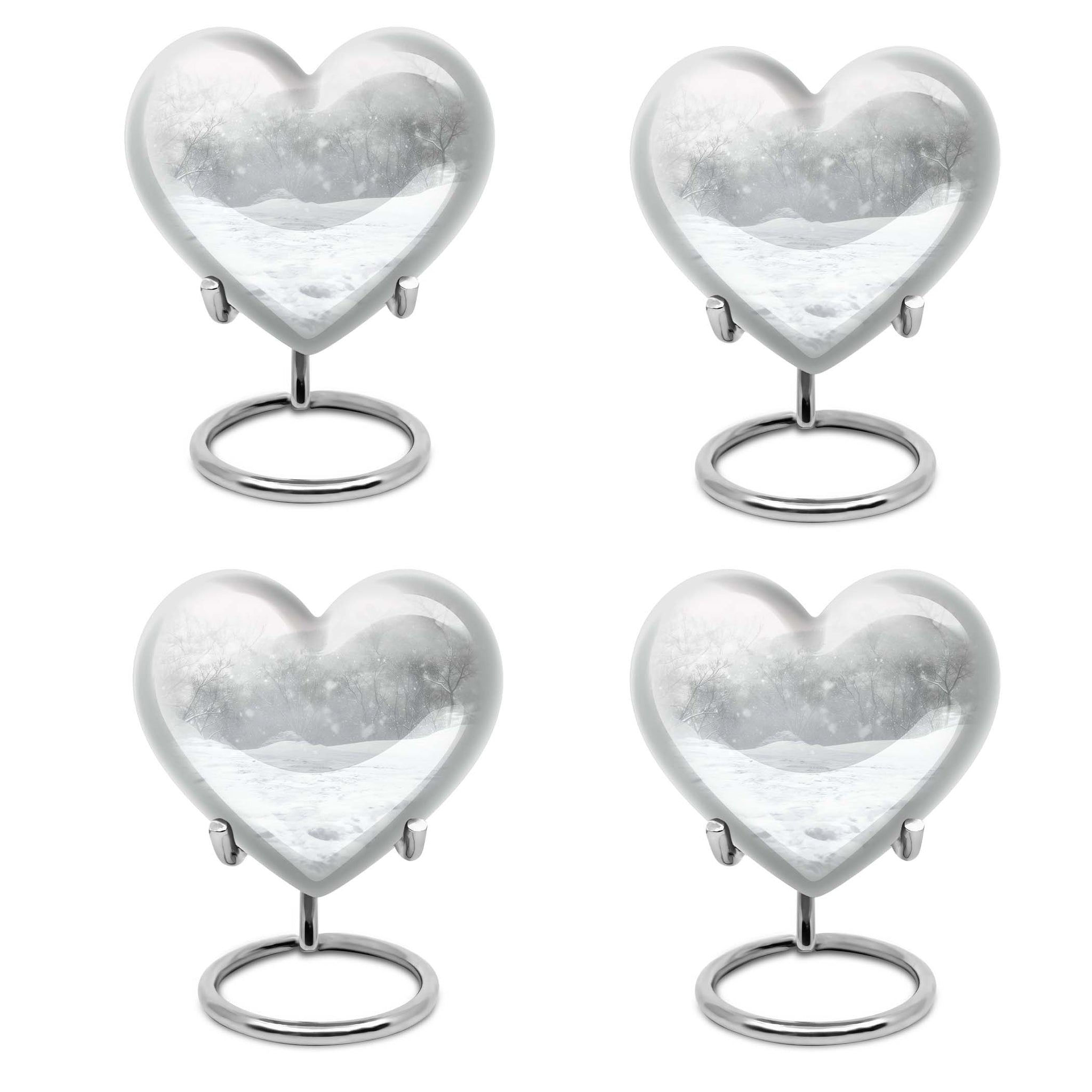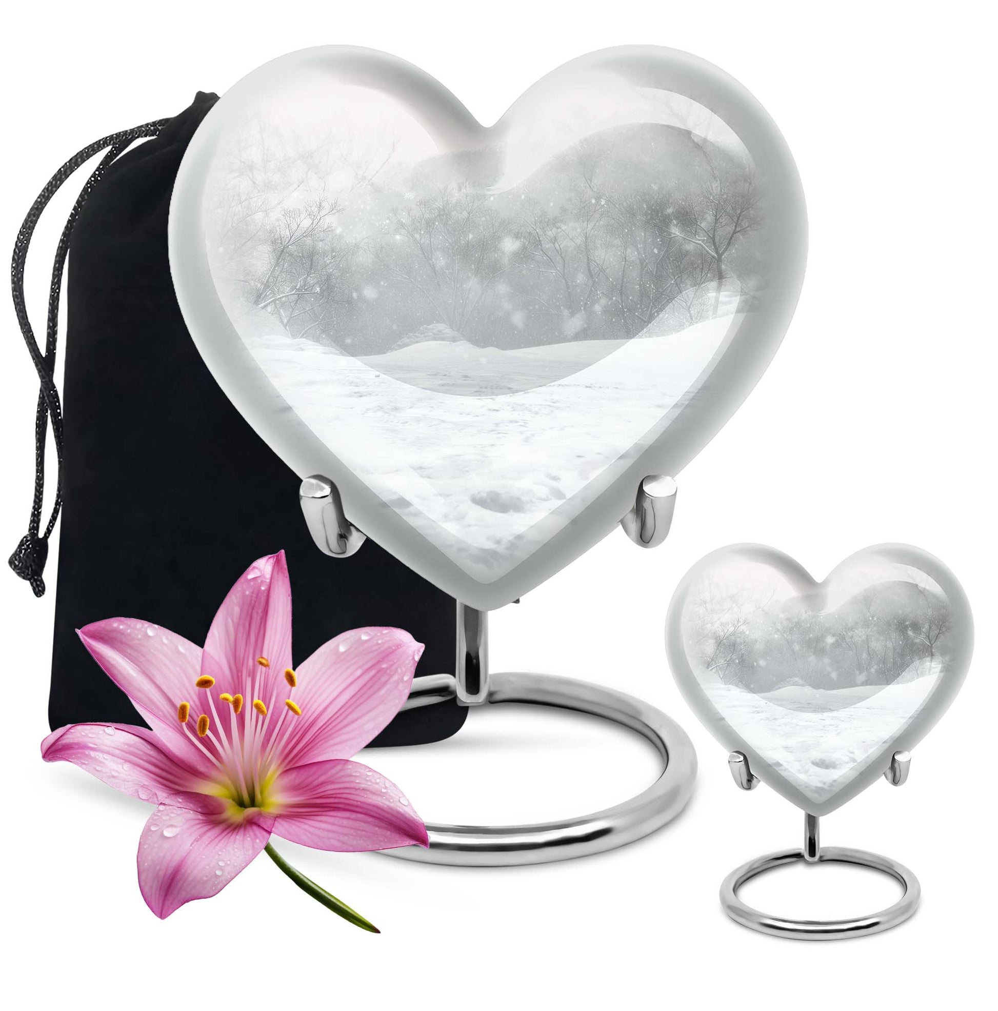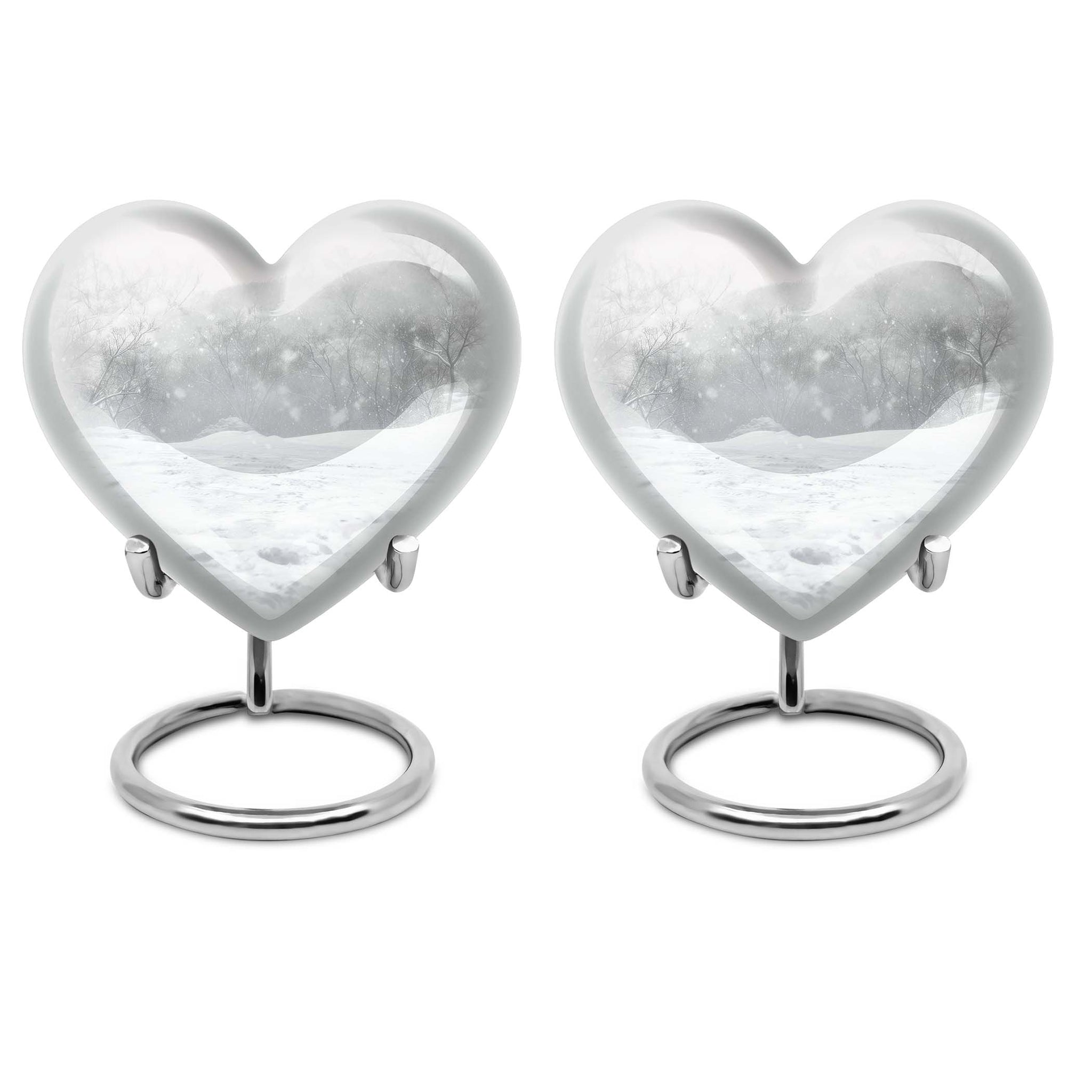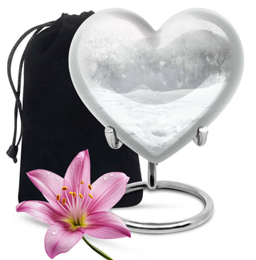 Introducing a piece of remembrance to cherish your loved ones, our Mountain Winter Urn. This large-sized, abstract-themed cremation urn signifies eternal love. Measuring at a height of 10 inches and weighing 3.3 pounds, it is a perfectly-sized funeral urn for adult ashes. Intricately crafted in a heart-shaped design, this memorial urn for ashes has a capacity of 200 cubic inches, ideal for keeping your departed one close. The urn's body is made from high quality, durable aluminium which represents a lasting tribute to your loved one. With options to personalize with engraved names, our urn adds a personal touch to your cherished memories. The package includes a velvet pouch for containment of ashes which makes it a respectful tribute for both indoor and outdoor use. Let this burial urn be a beautiful and durable creation for your loved one, standing as a symbol of love and respect. Uncover our 'Mountain Winter Urn', a testament to the undying flame of love you hold for your departed.