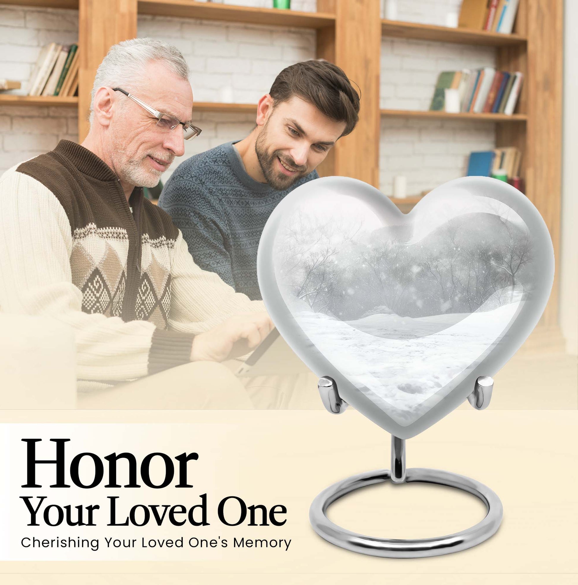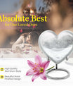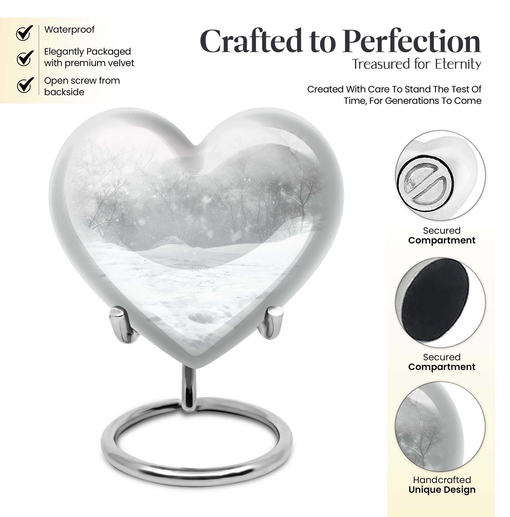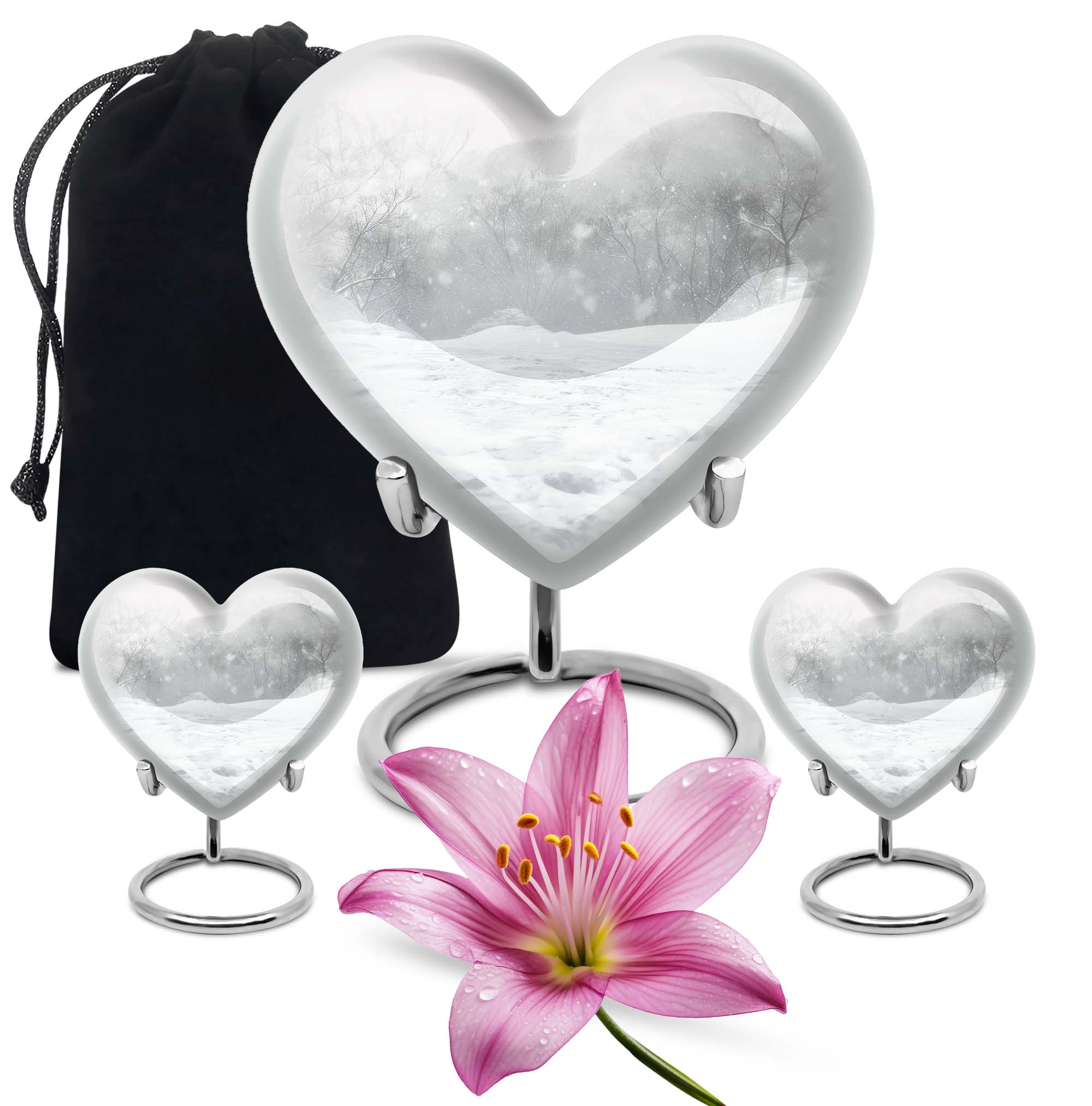Introducing a piece of remembrance to cherish your loved ones, our Mountain Winter Urn. This large-sized, abstract-themed cremation urn signifies eternal love. Measuring at a height of 10 inches and weighing 3.3 pounds, it is a perfectly-sized funeral urn for adult ashes. Intricately crafted in a heart-shaped design, this memorial urn for ashes has a capacity of 200 cubic inches, ideal for keeping your departed one close. The urn's body is made from high quality, durable aluminium which represents a lasting tribute to your loved one. With options to personalize with engraved names, our urn adds a personal touch to your cherished memories. The package includes a velvet pouch for containment of ashes which makes it a respectful tribute for both indoor and outdoor use. Let this burial urn be a beautiful and durable creation for your loved one, standing as a symbol of love and respect. Uncover our 'Mountain Winter Urn', a testament to the undying flame of love you hold for your departed.