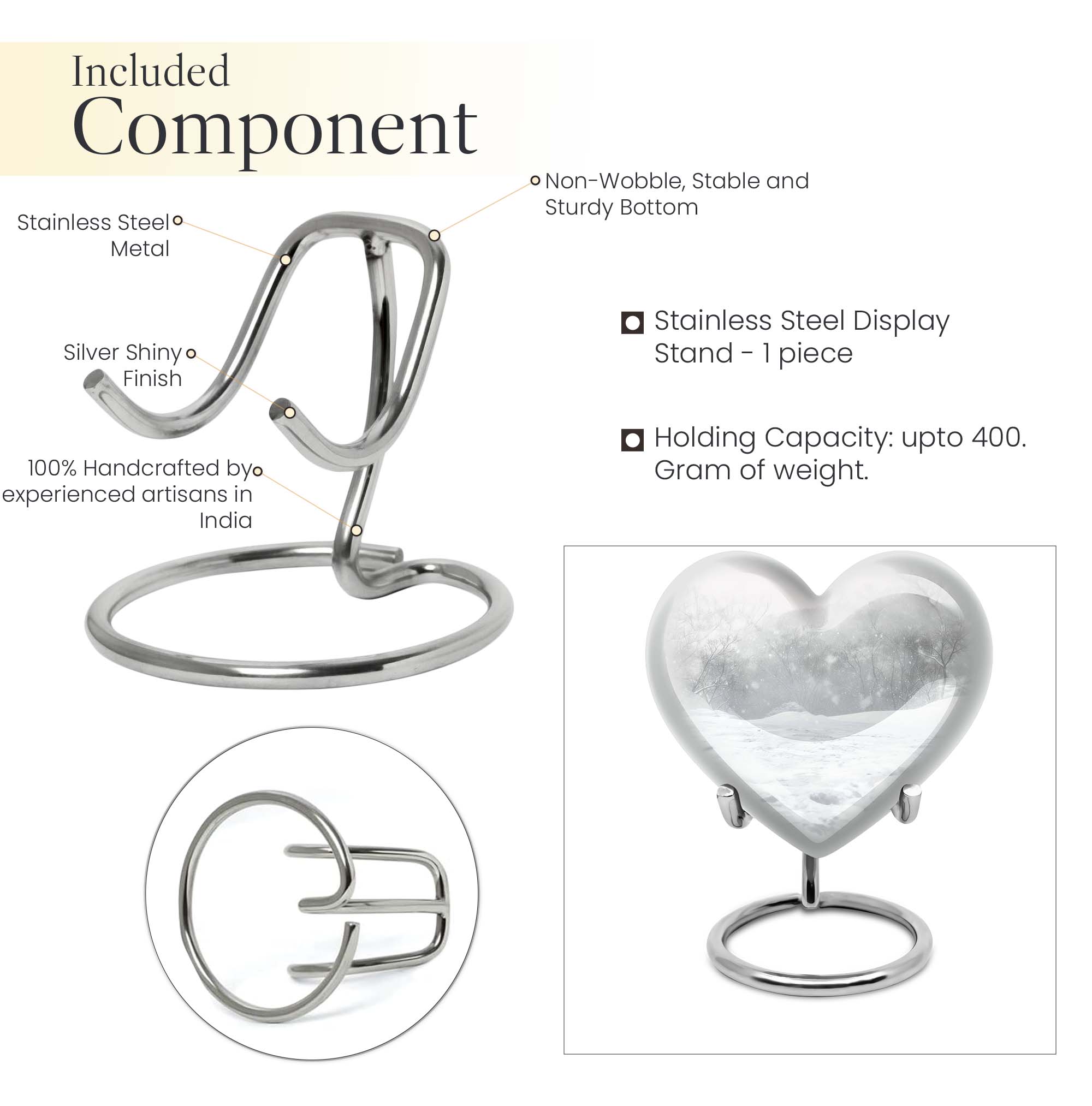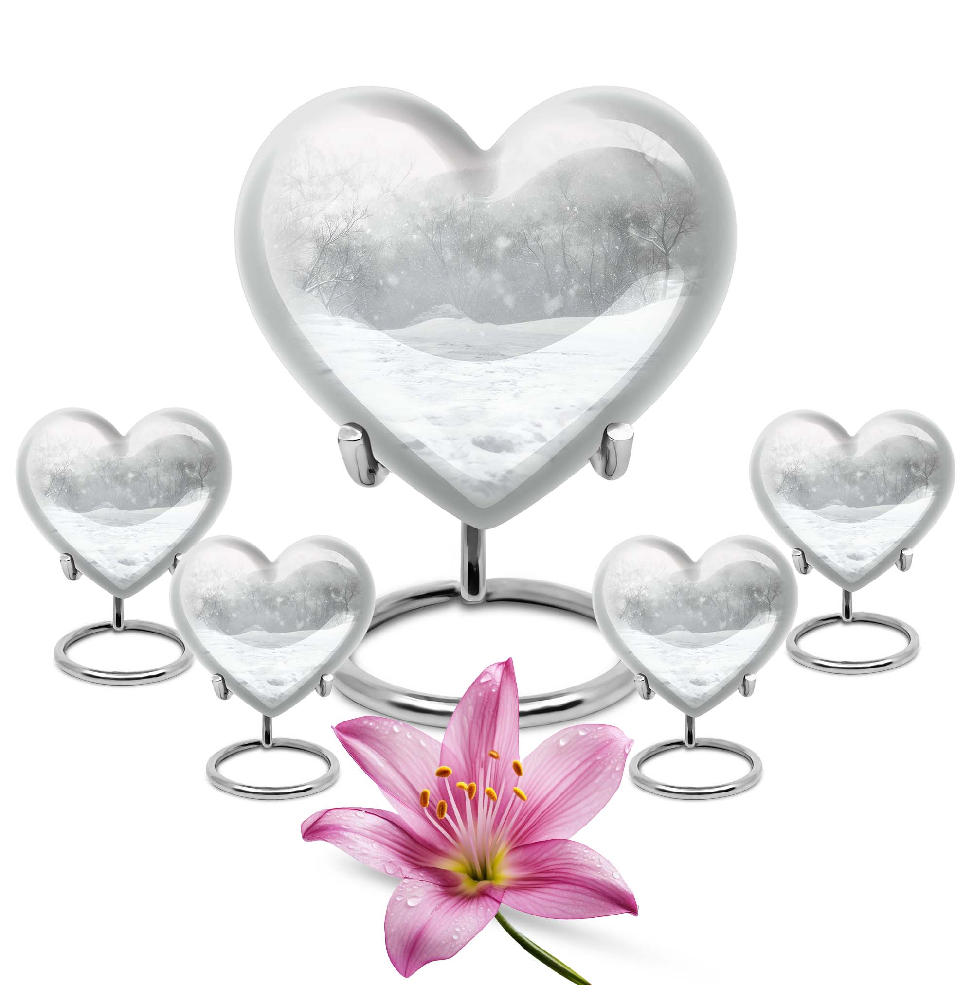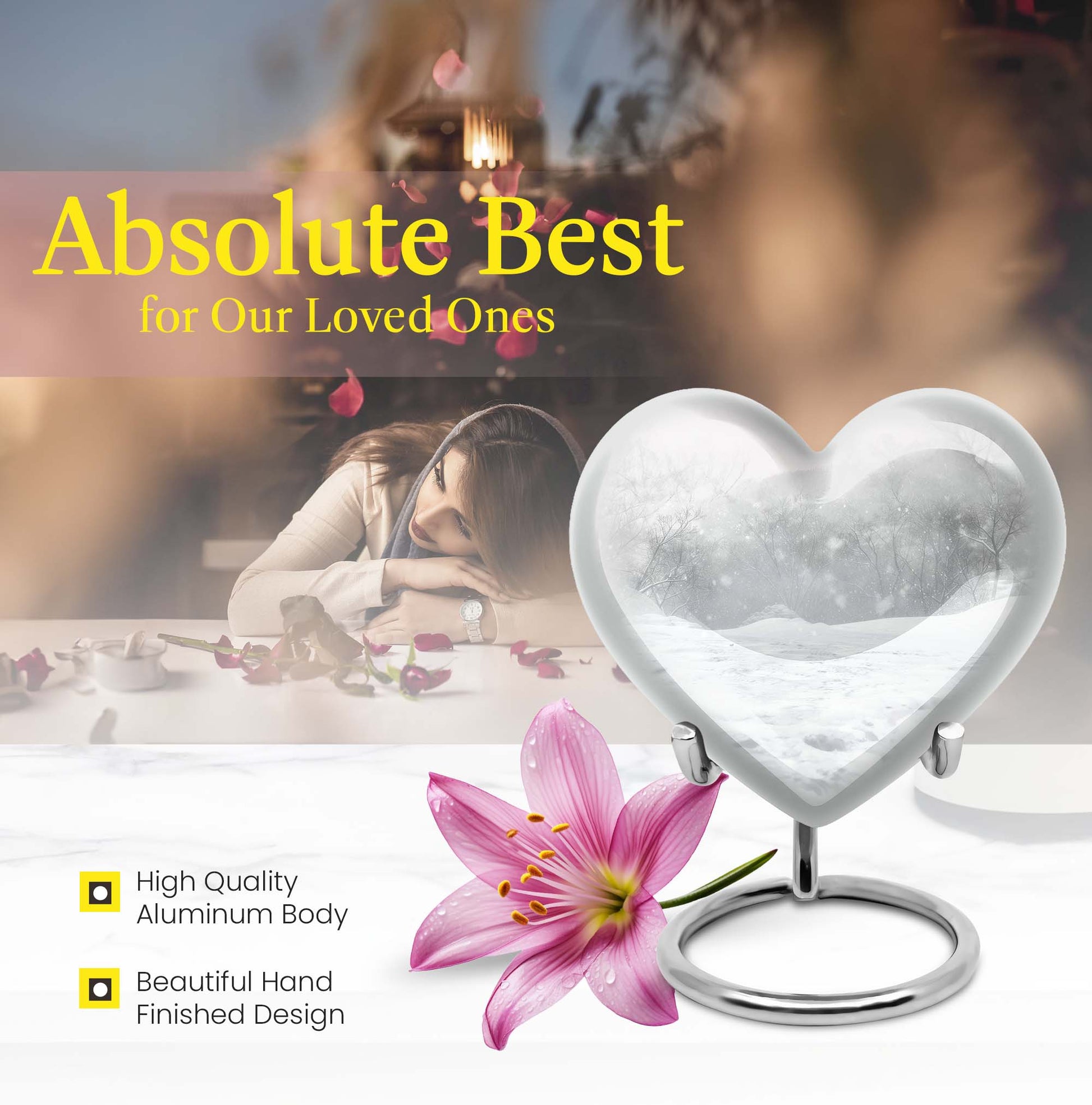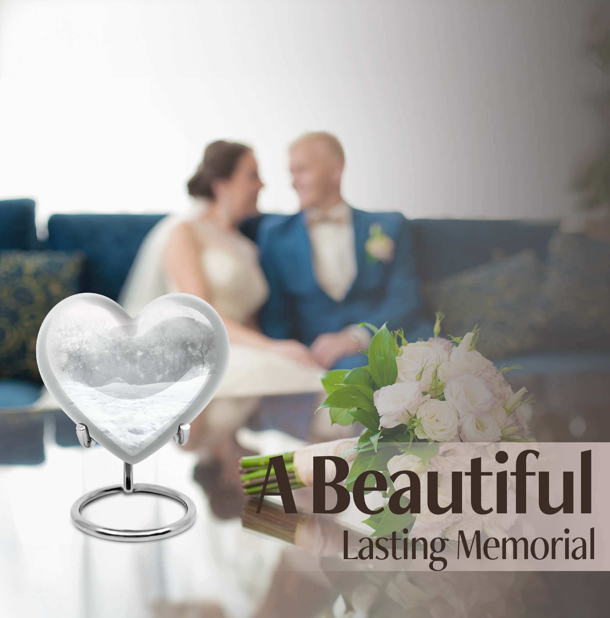 Introducing a piece of remembrance to cherish your loved ones, our Mountain Winter Urn. This large-sized, abstract-themed cremation urn signifies eternal love. Measuring at a height of 10 inches and weighing 3.3 pounds, it is a perfectly-sized funeral urn for adult ashes. Intricately crafted in a heart-shaped design, this memorial urn for ashes has a capacity of 200 cubic inches, ideal for keeping your departed one close. The urn's body is made from high quality, durable aluminium which represents a lasting tribute to your loved one. With options to personalize with engraved names, our urn adds a personal touch to your cherished memories. The package includes a velvet pouch for containment of ashes which makes it a respectful tribute for both indoor and outdoor use. Let this burial urn be a beautiful and durable creation for your loved one, standing as a symbol of love and respect. Uncover our 'Mountain Winter Urn', a testament to the undying flame of love you hold for your departed.