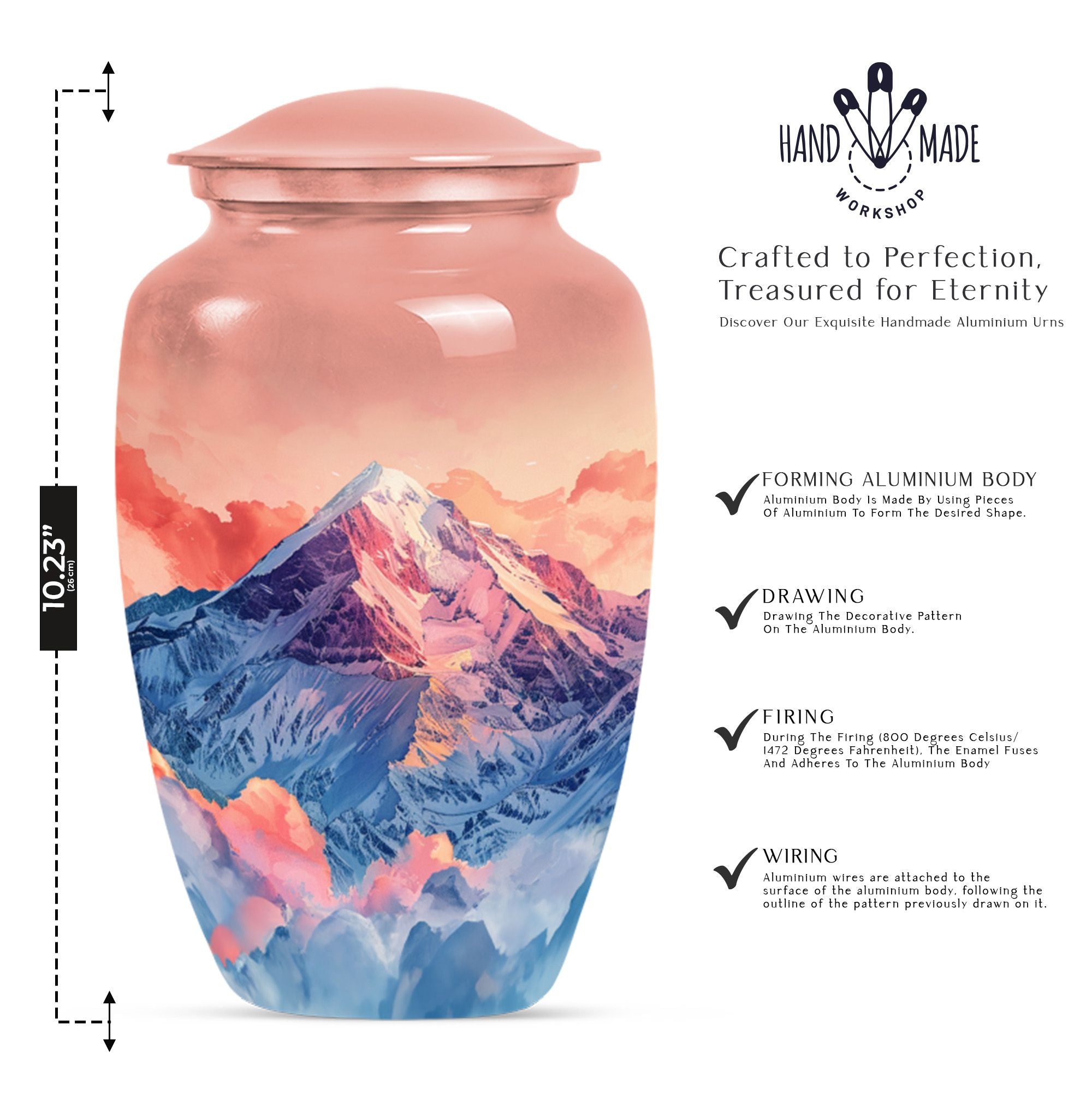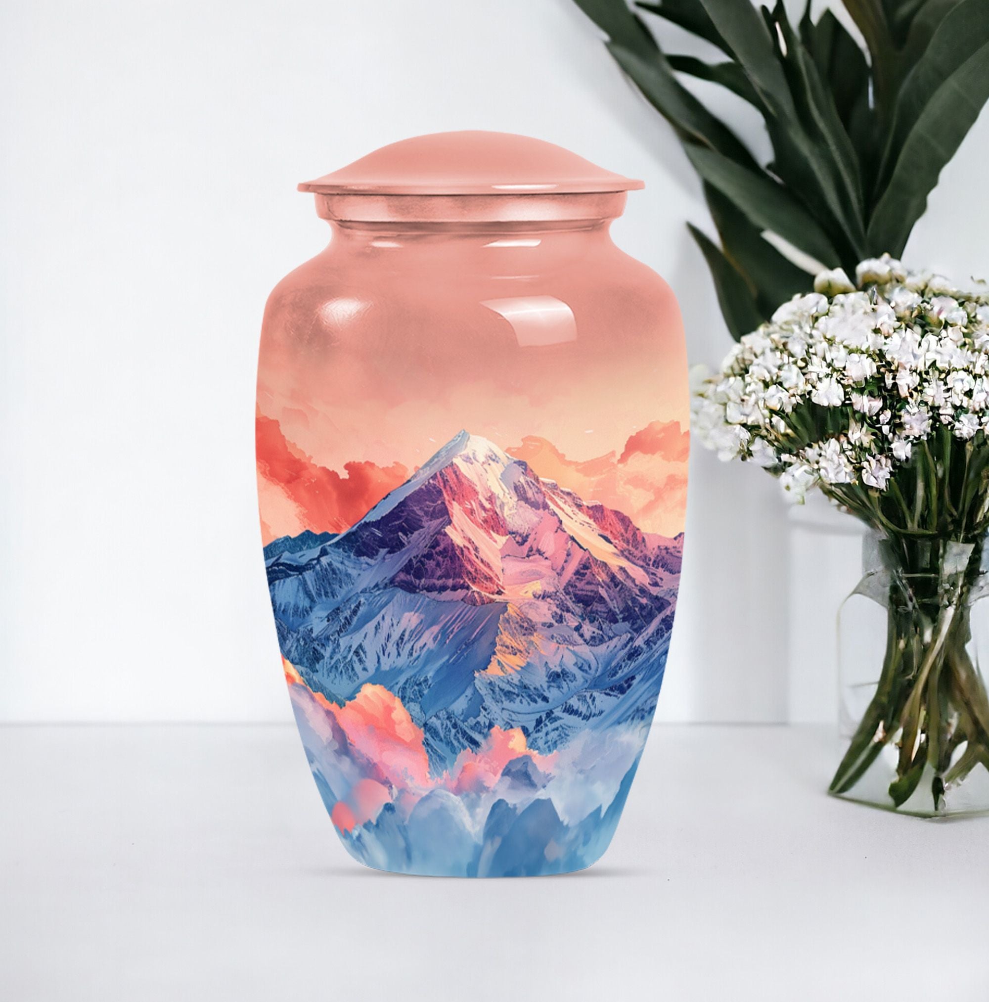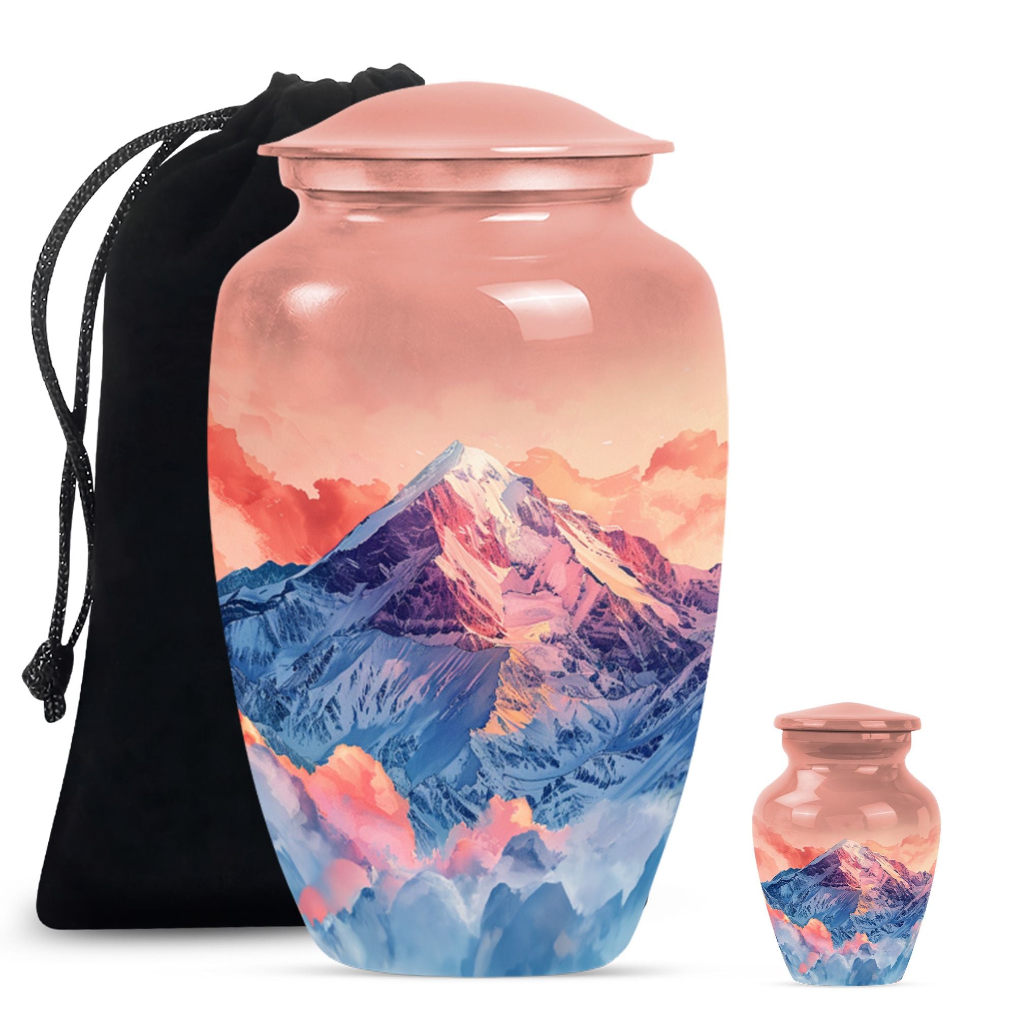 Honor your loved one's memory with this meticulously crafted 'mountains Urn', a symbol of everlasting tranquility. This remarkable cremation large urn, with an abstract theme, stands an impressive 10 inches tall, perfect for seniors and adults seeking funeral urns for memorial ceremonies. Crafted with the longevity of aluminium, it weighs a sturdy 3.3 pounds to ensure stability. The urn offers a generous 200 cubic inches capacity, apt for containing human ashes. It arrives with a velvet pouch for secure containment of ashes, emphasizing its dignified purpose. What sets this large urn apart is the capability to personalize it with engraved names, creating a bespoke testimonial. This Burial ashes urn, combining practicality with sentimentality, is a beautiful tribute to your loved one's life. Boost your spiritual sanctuary by integrating this human ash urn into your space, and ensure a devoted commemoration of the departed.